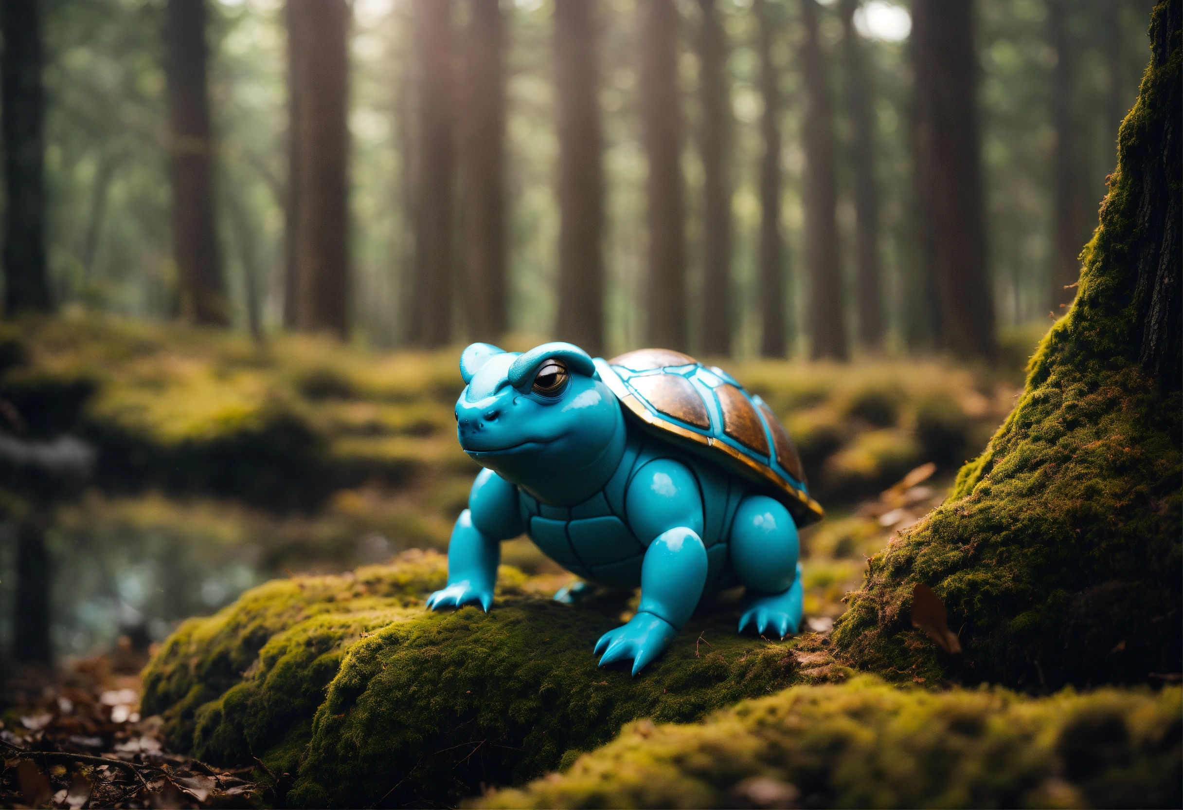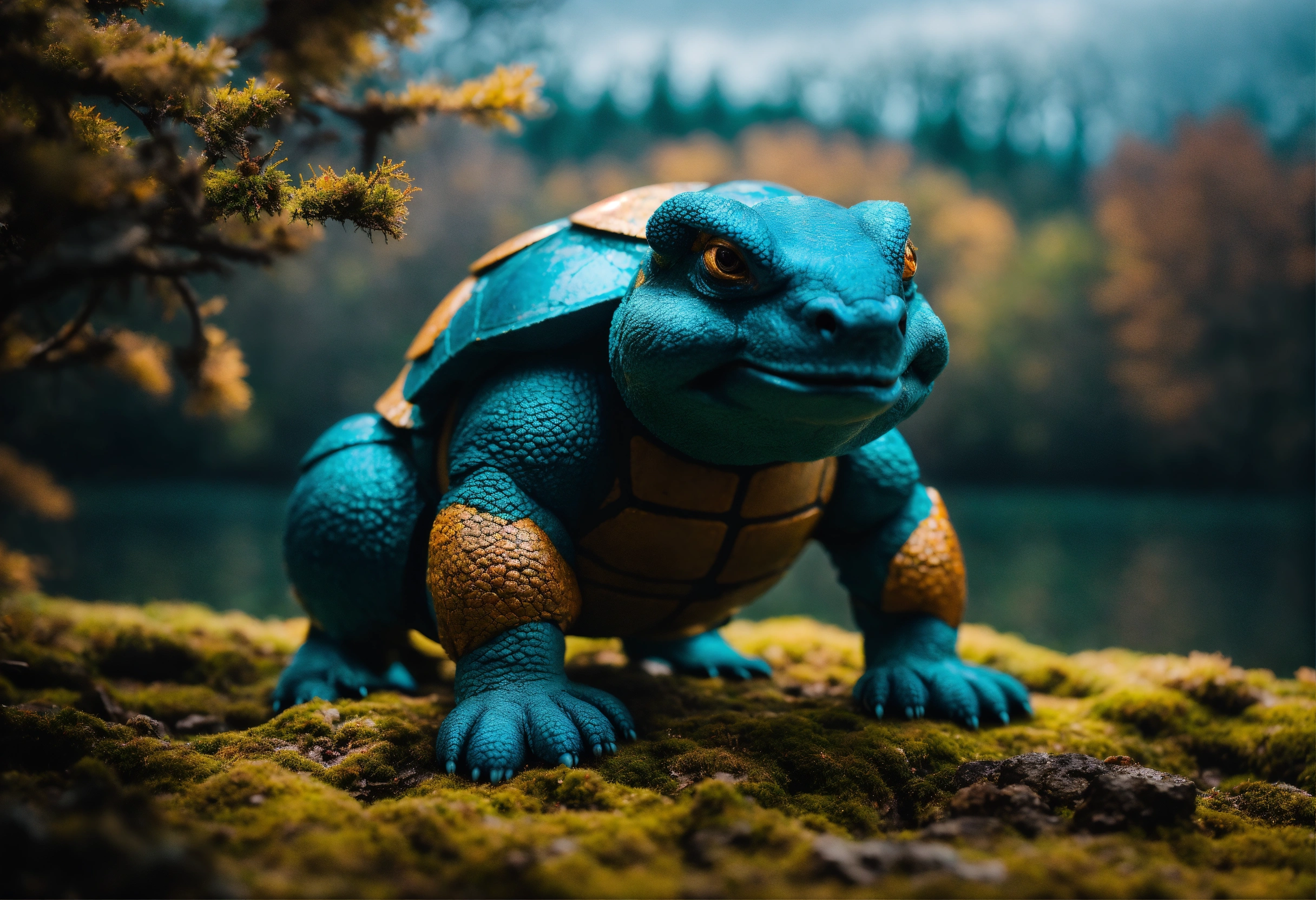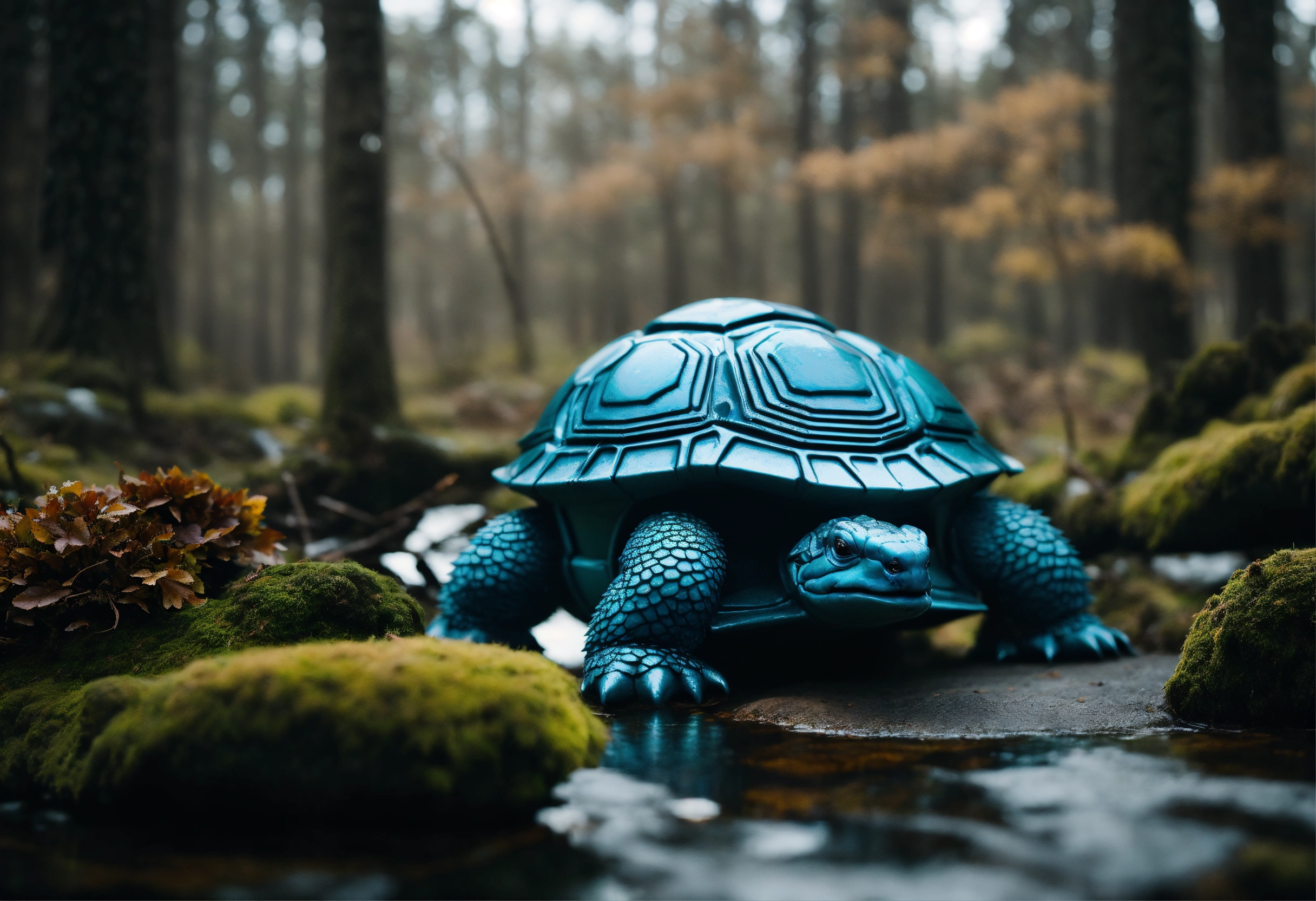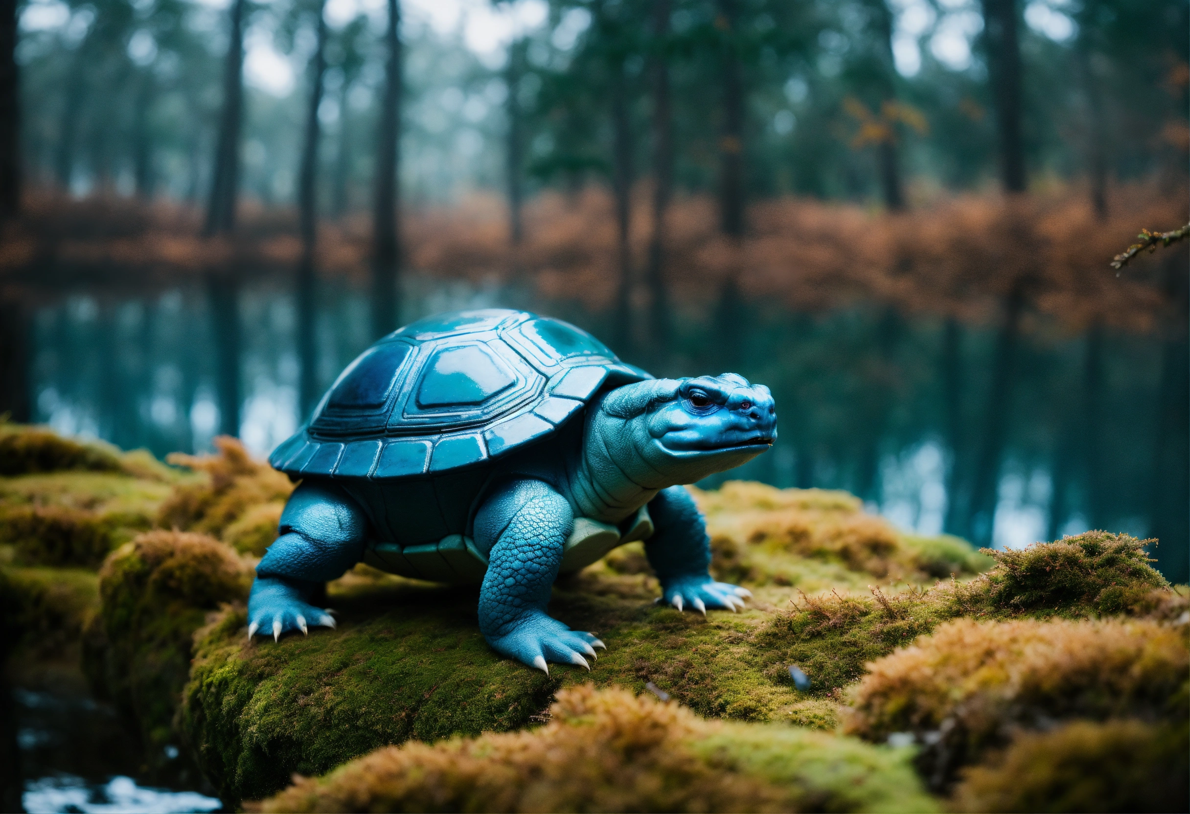Minimal, cinematic, a realistic blastoise animal among the trees, forest lake, moss, cold weather, dark teal and amber, sony a7 iv