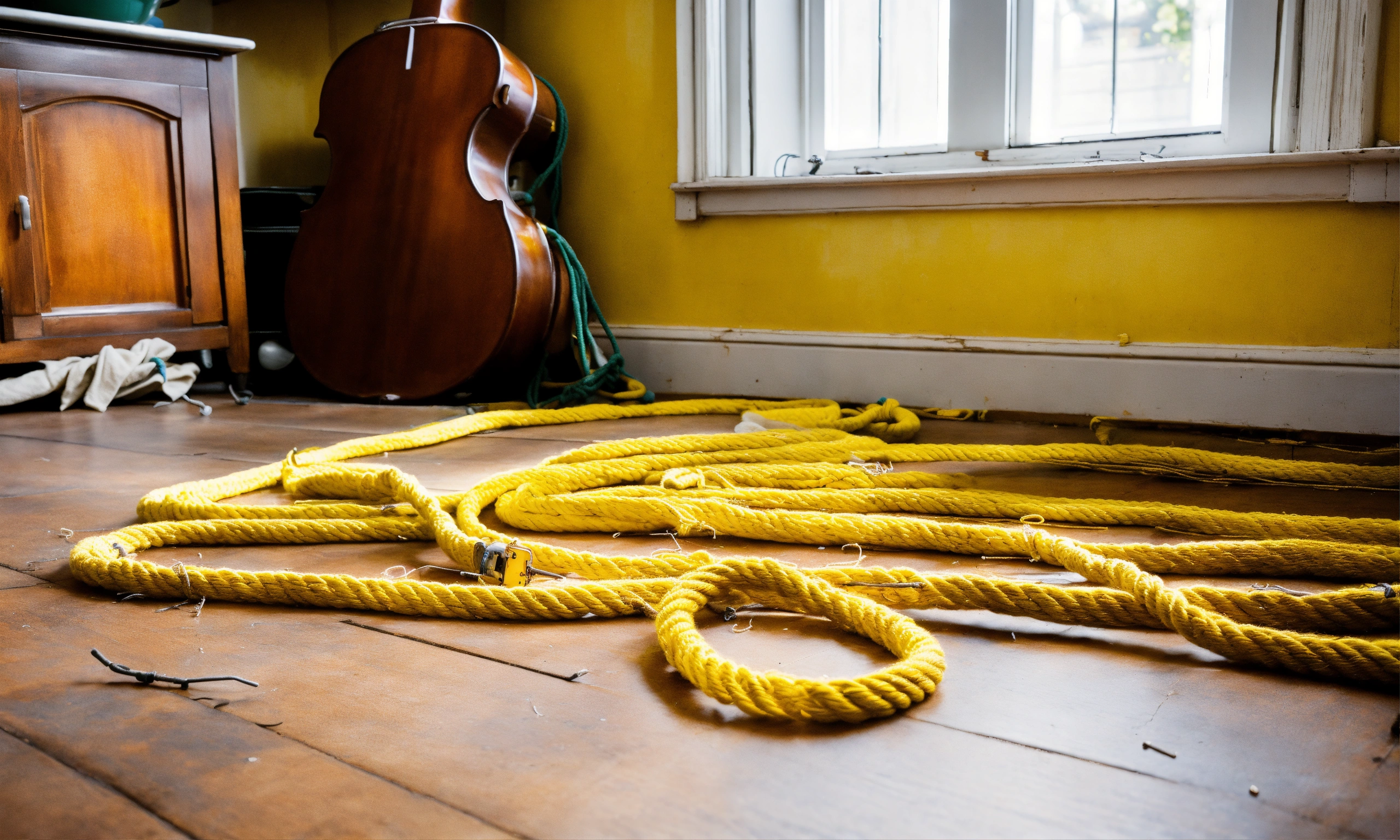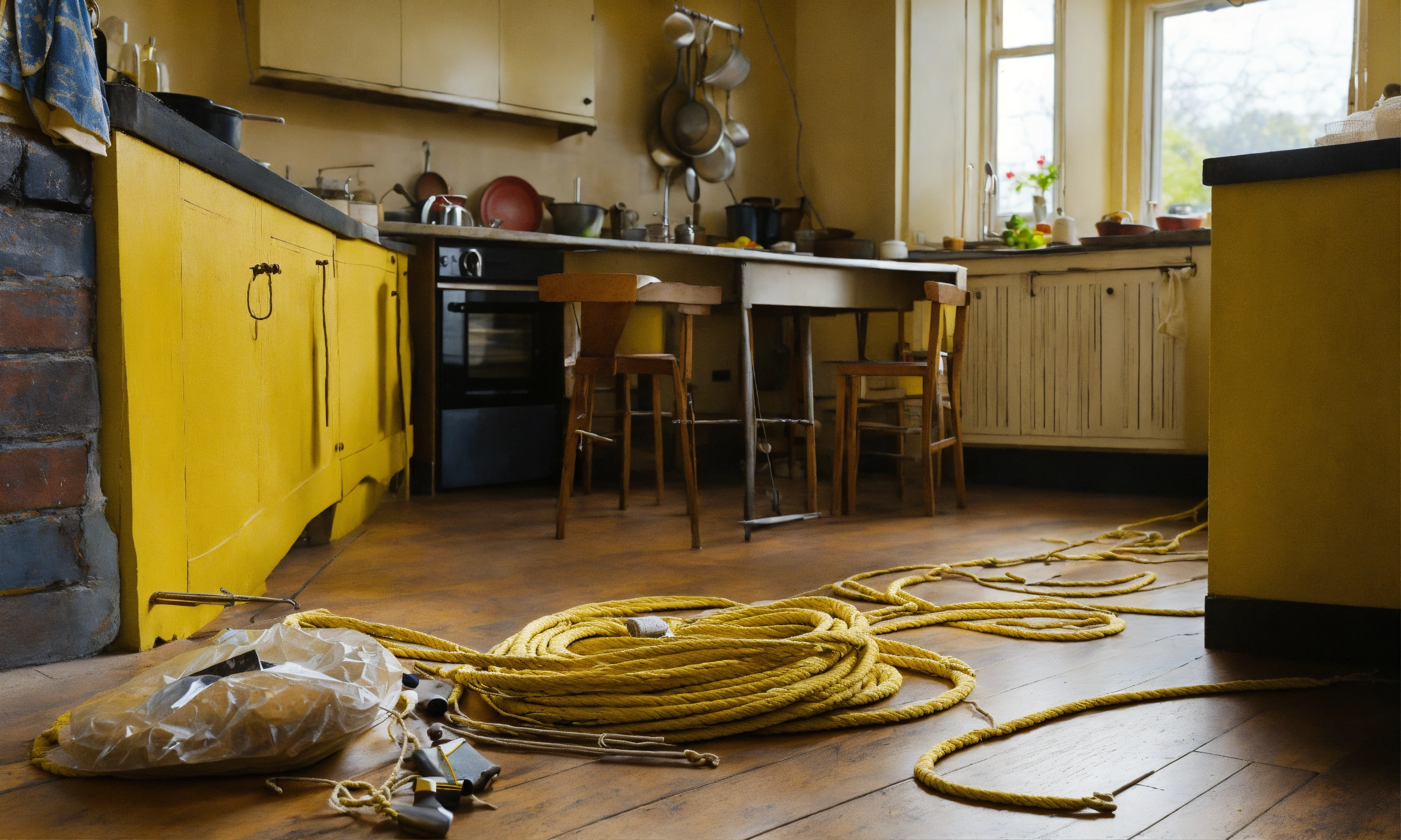 Parts of a musical broken yellow drum kit lying on the floor. loose clothesline ropes in the kitchen of a typical old british middle-class home, show the lines of the hanging clothesline ropes, floor of a typical middle-class british kitchen in manchester.