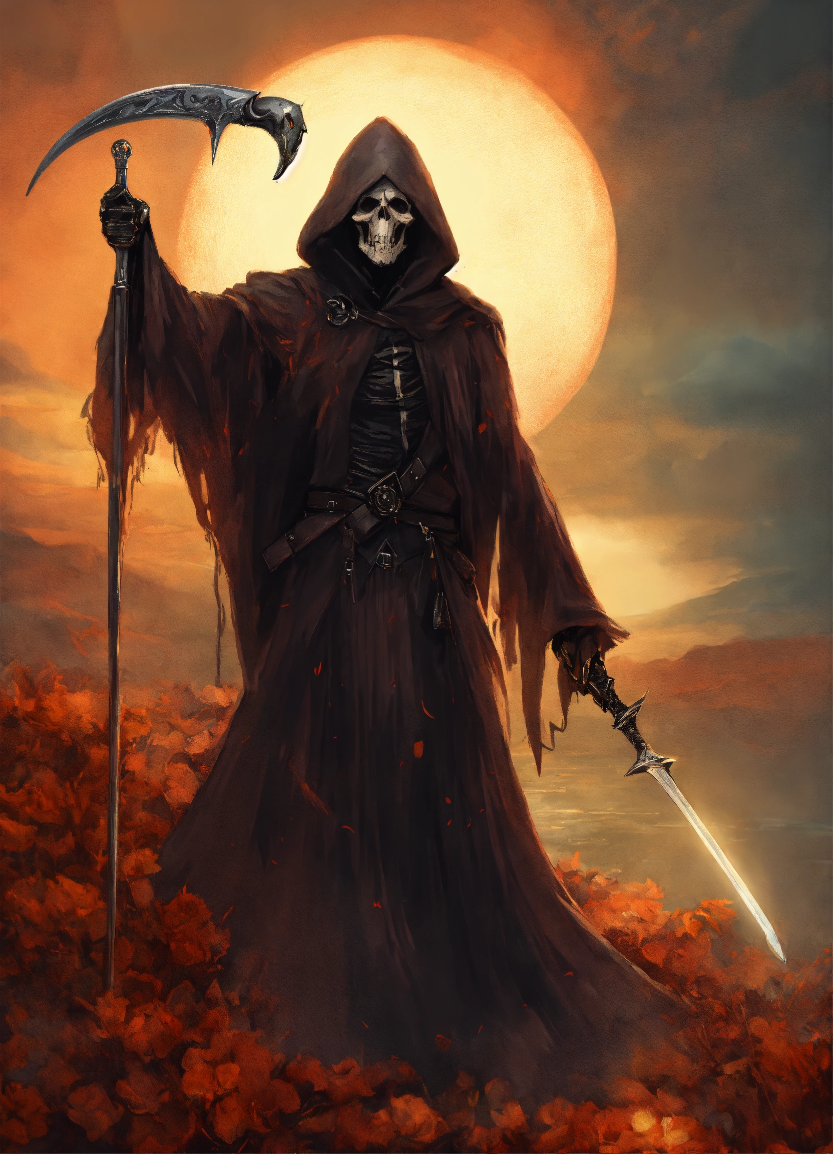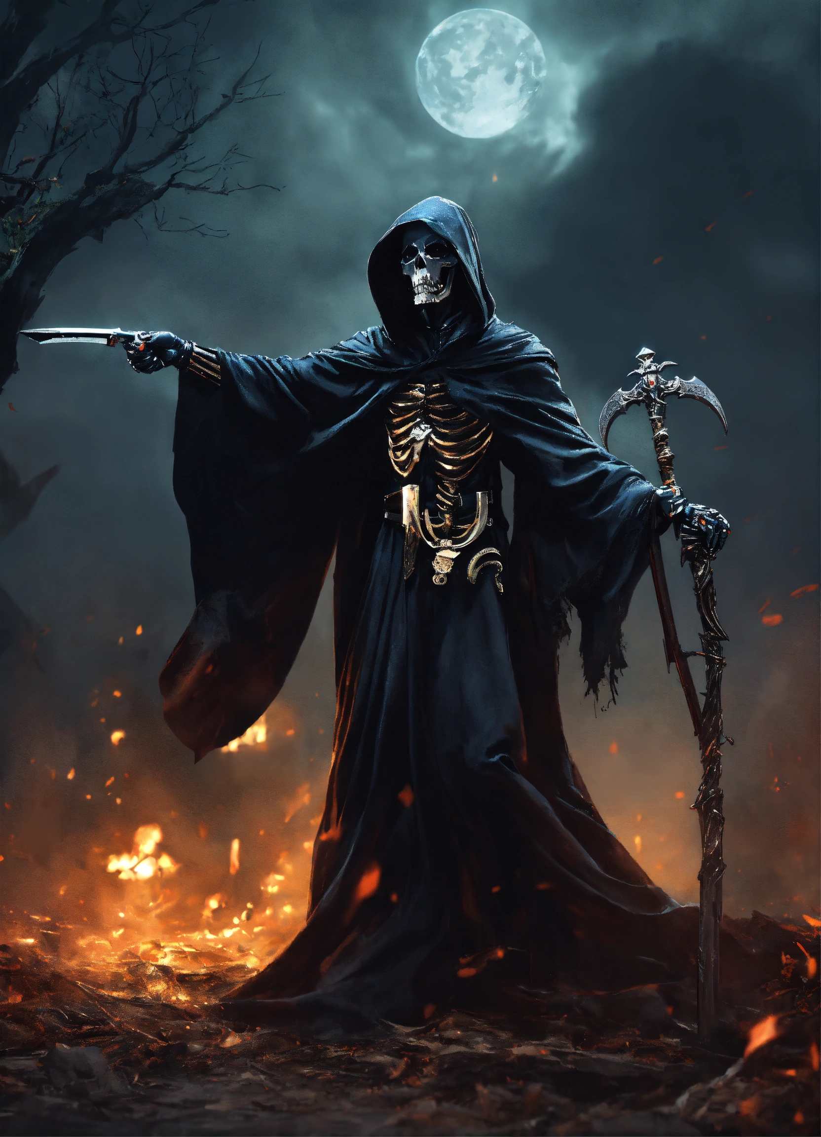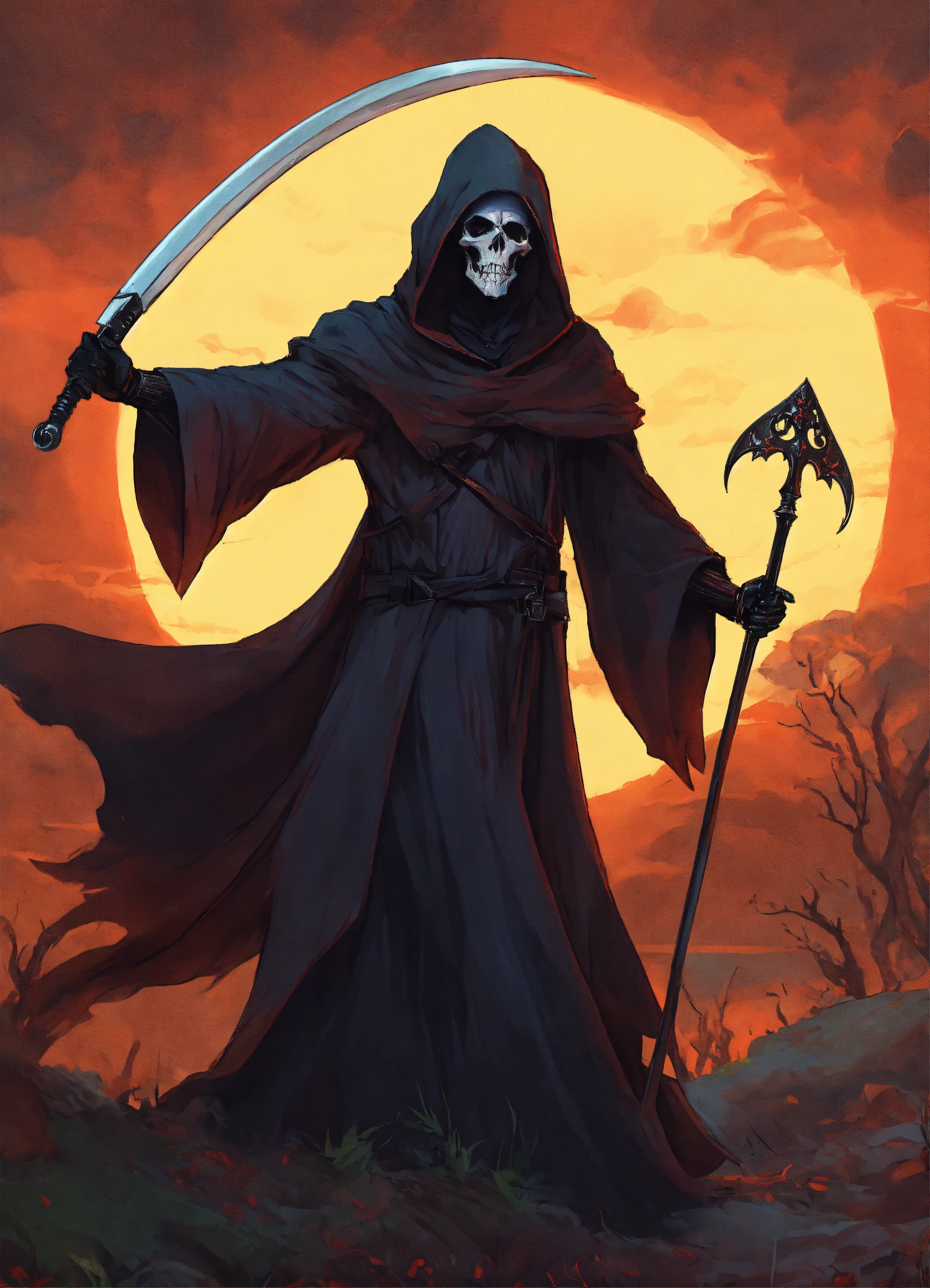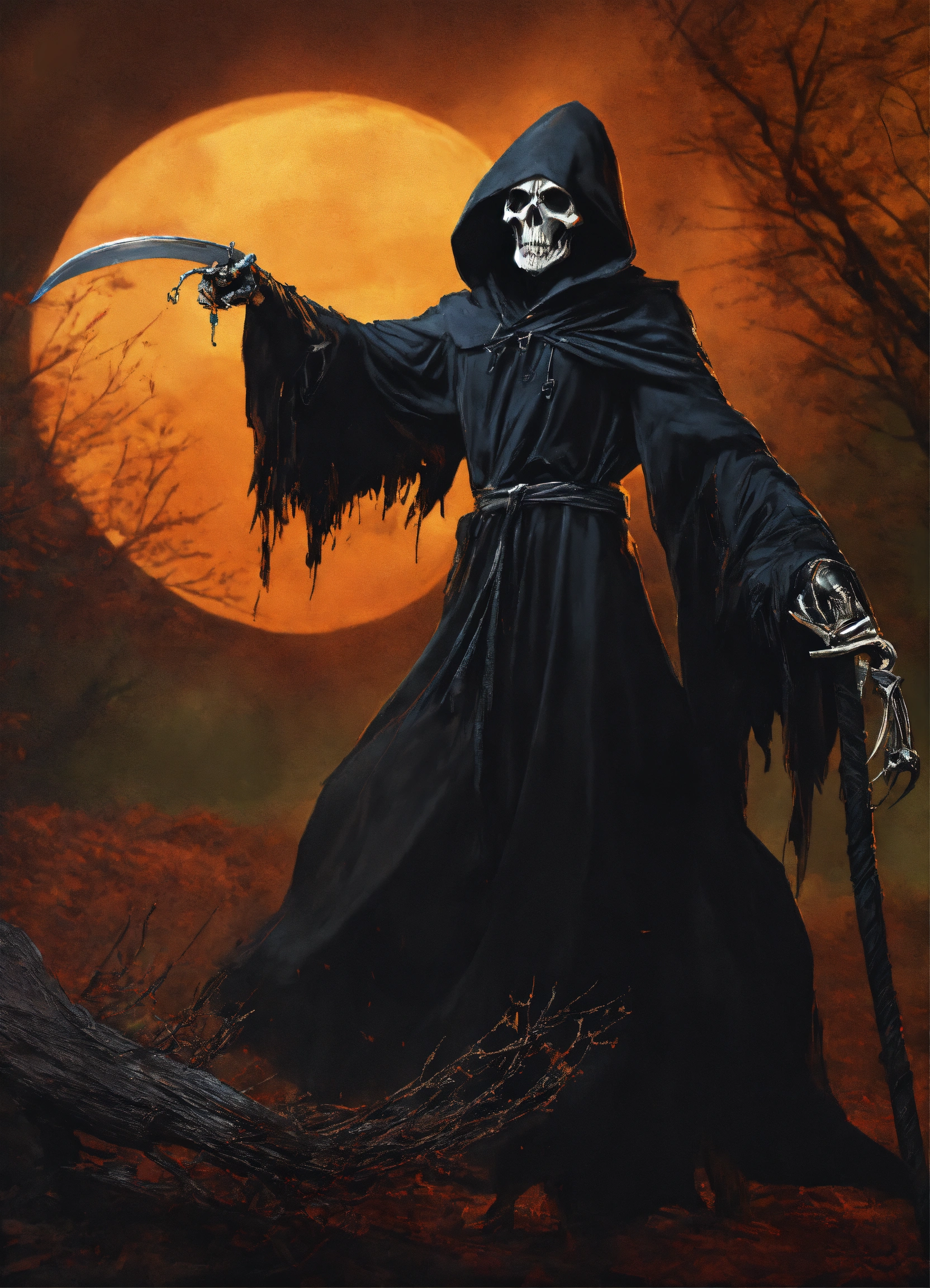A grim reaper with his arm outstretched and pointing to the right