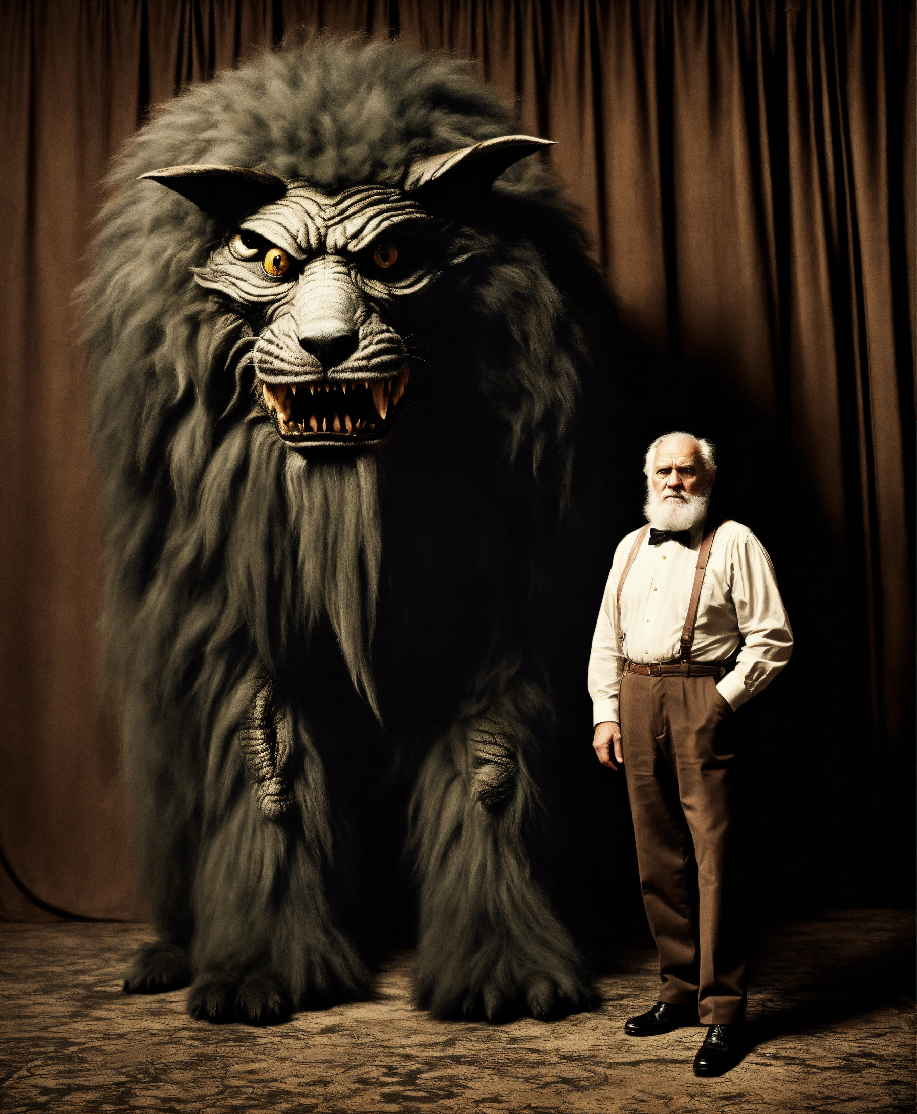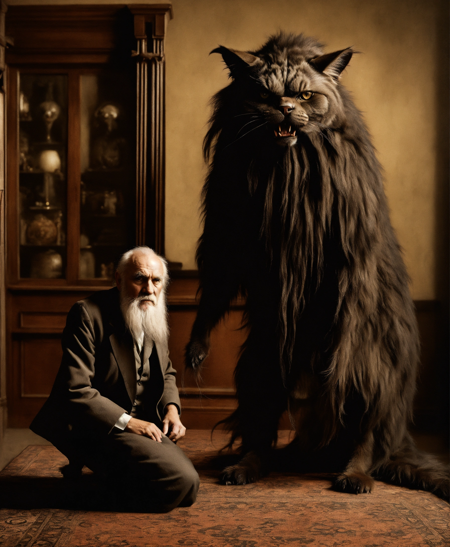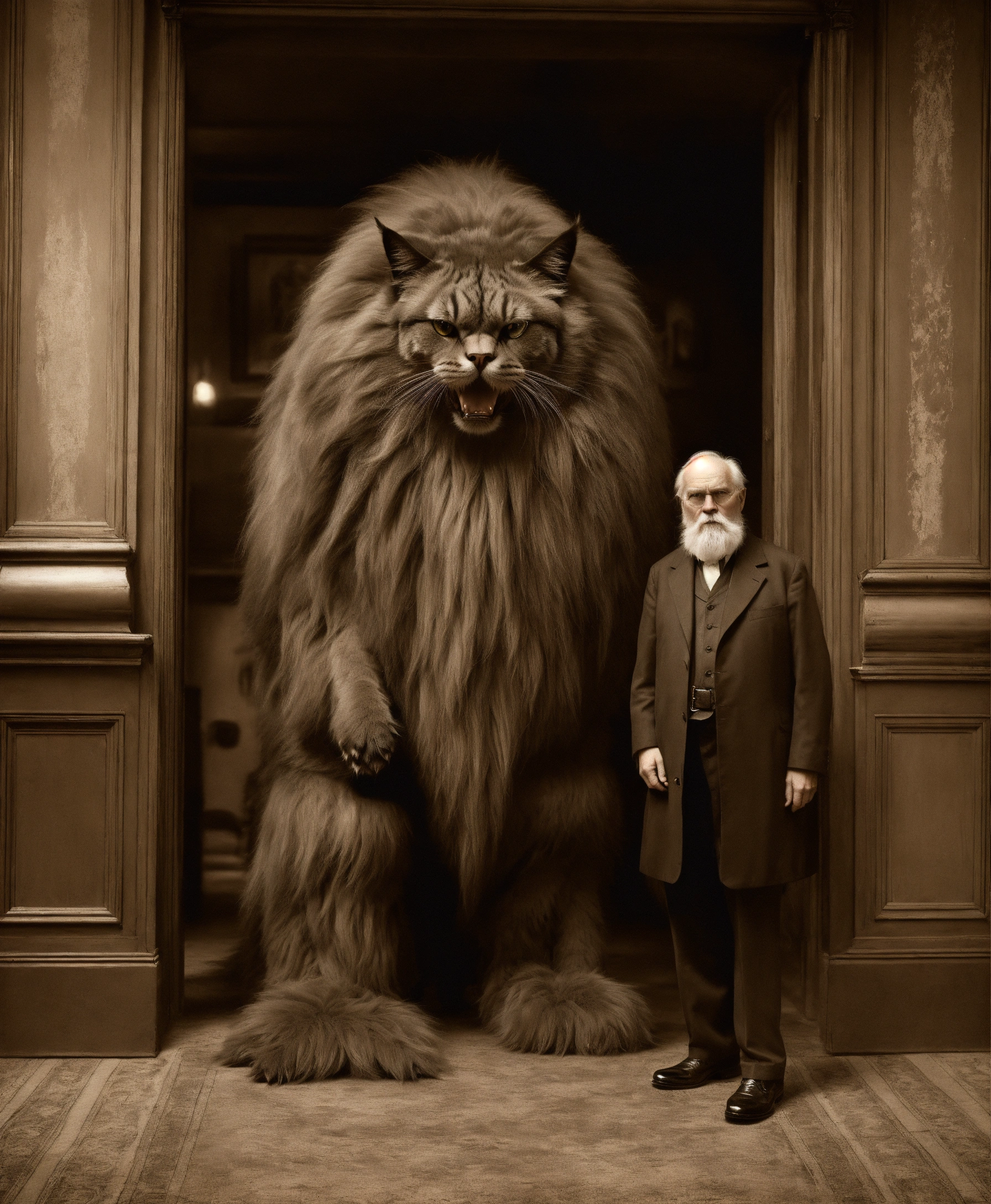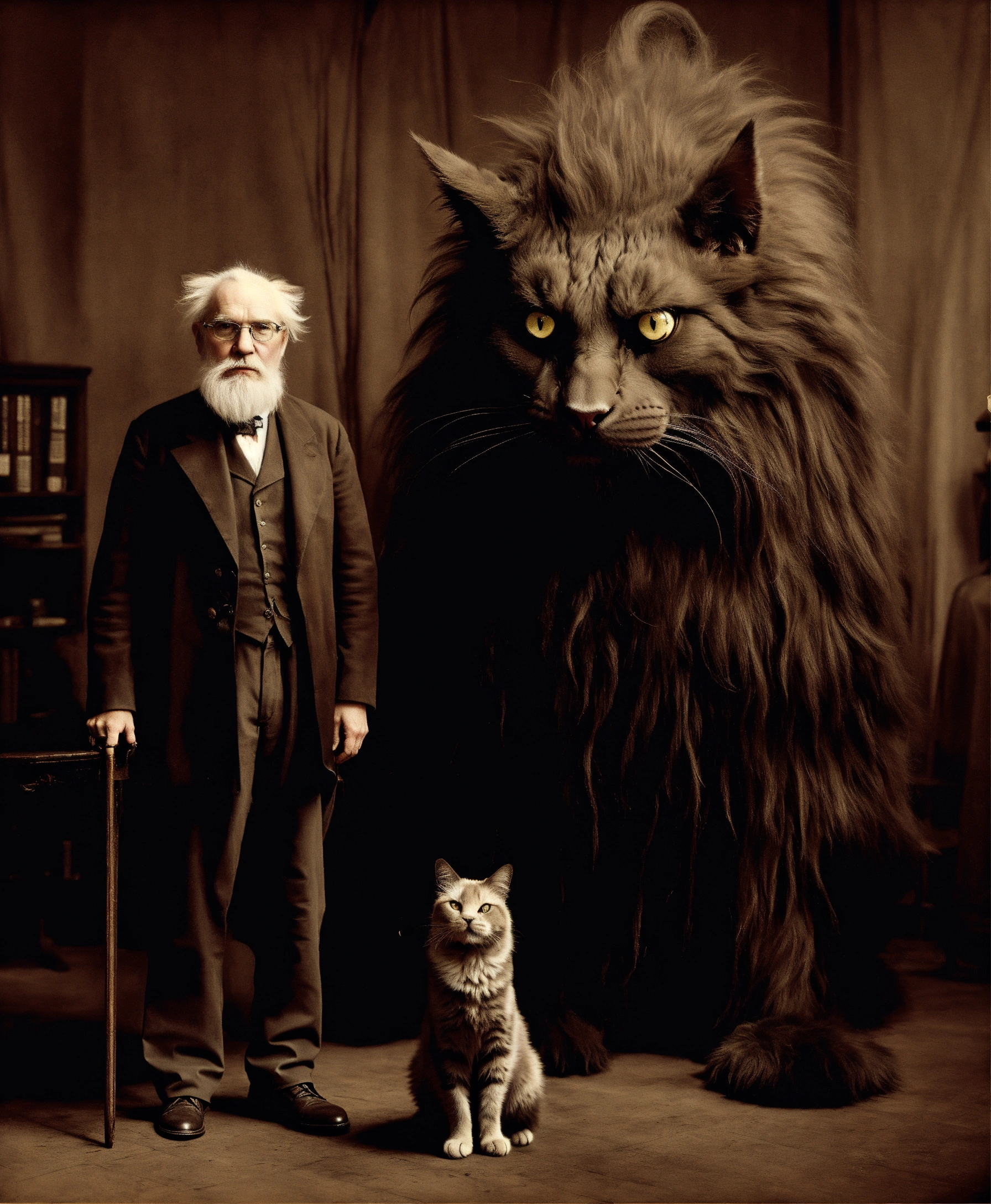 Old man standing next to a giant hairy evil cat monster, in the style of contemporary vintage photography, necronomicon illustrations, tabletop photography, 1890, hyperrealistic animal portraits, ghostly presence, dark and gloomy, whirring contrivances