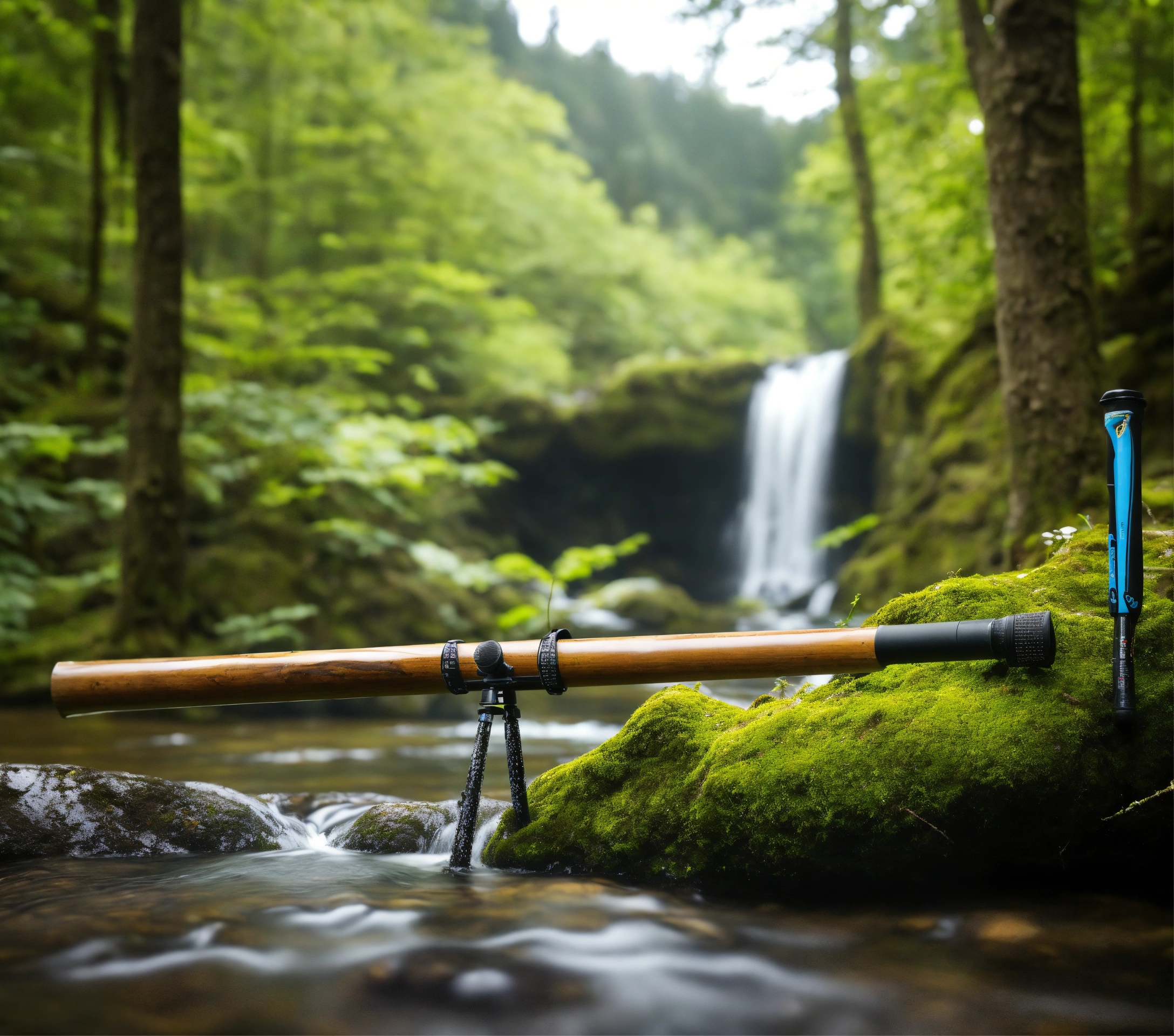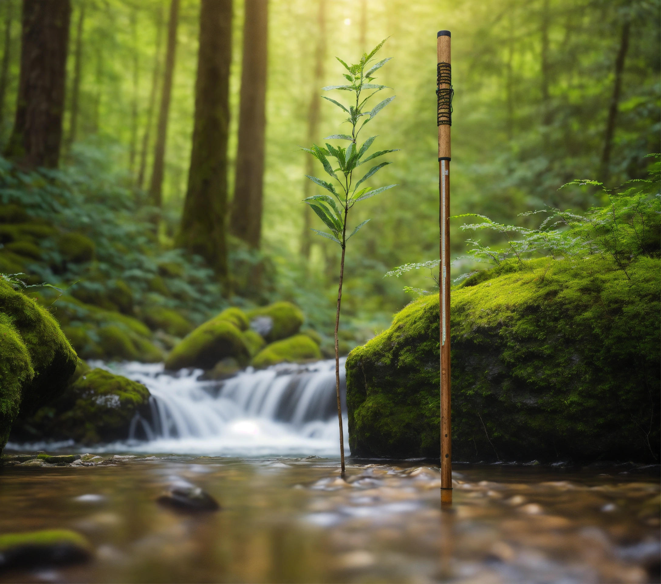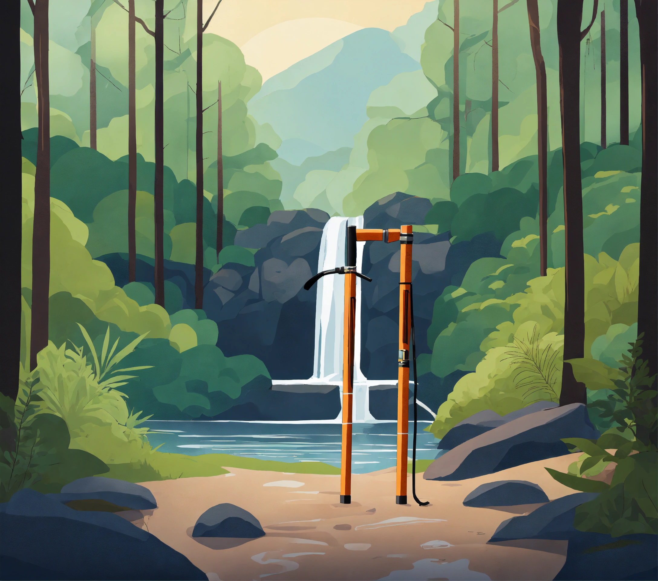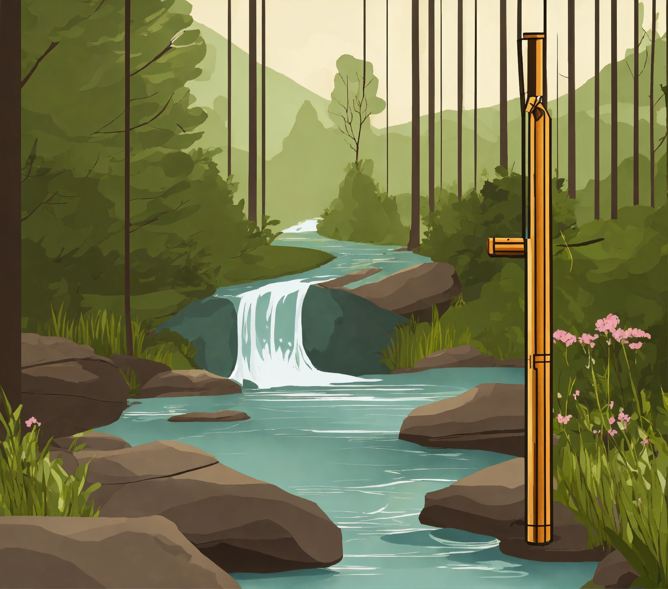 Two diagonal intersecting hiking stick in front of a forrest scene, creek with small waterfall line minimalist style