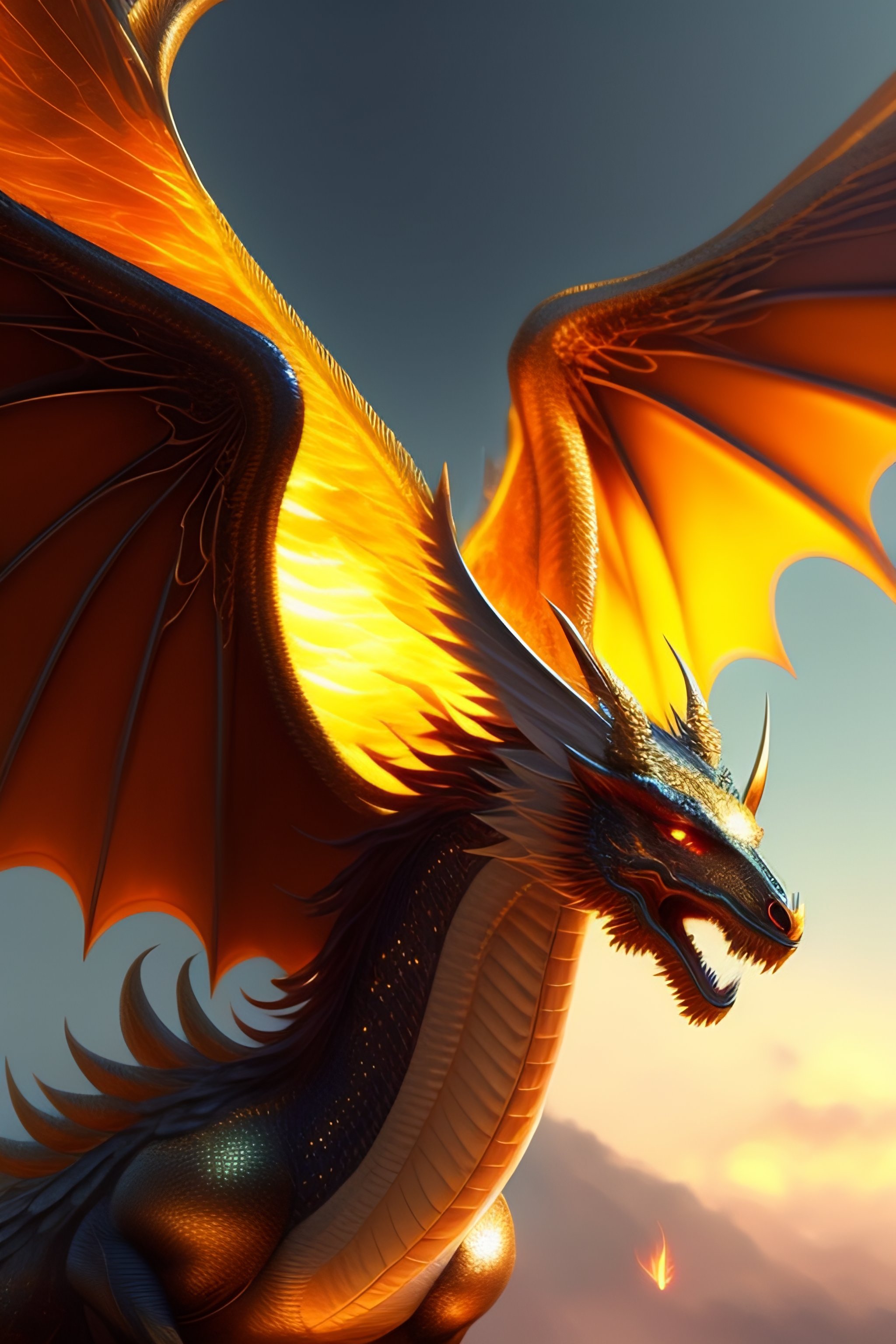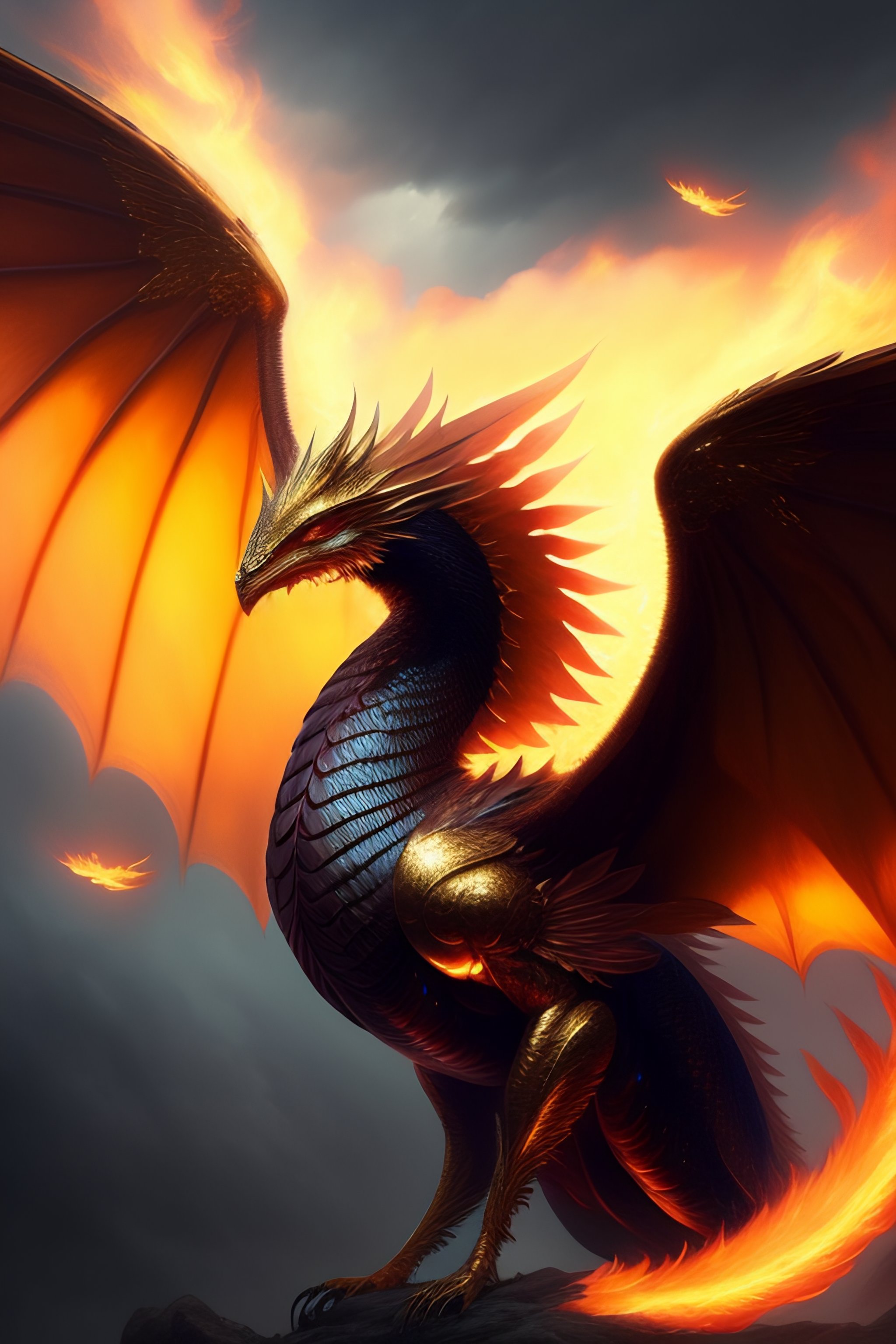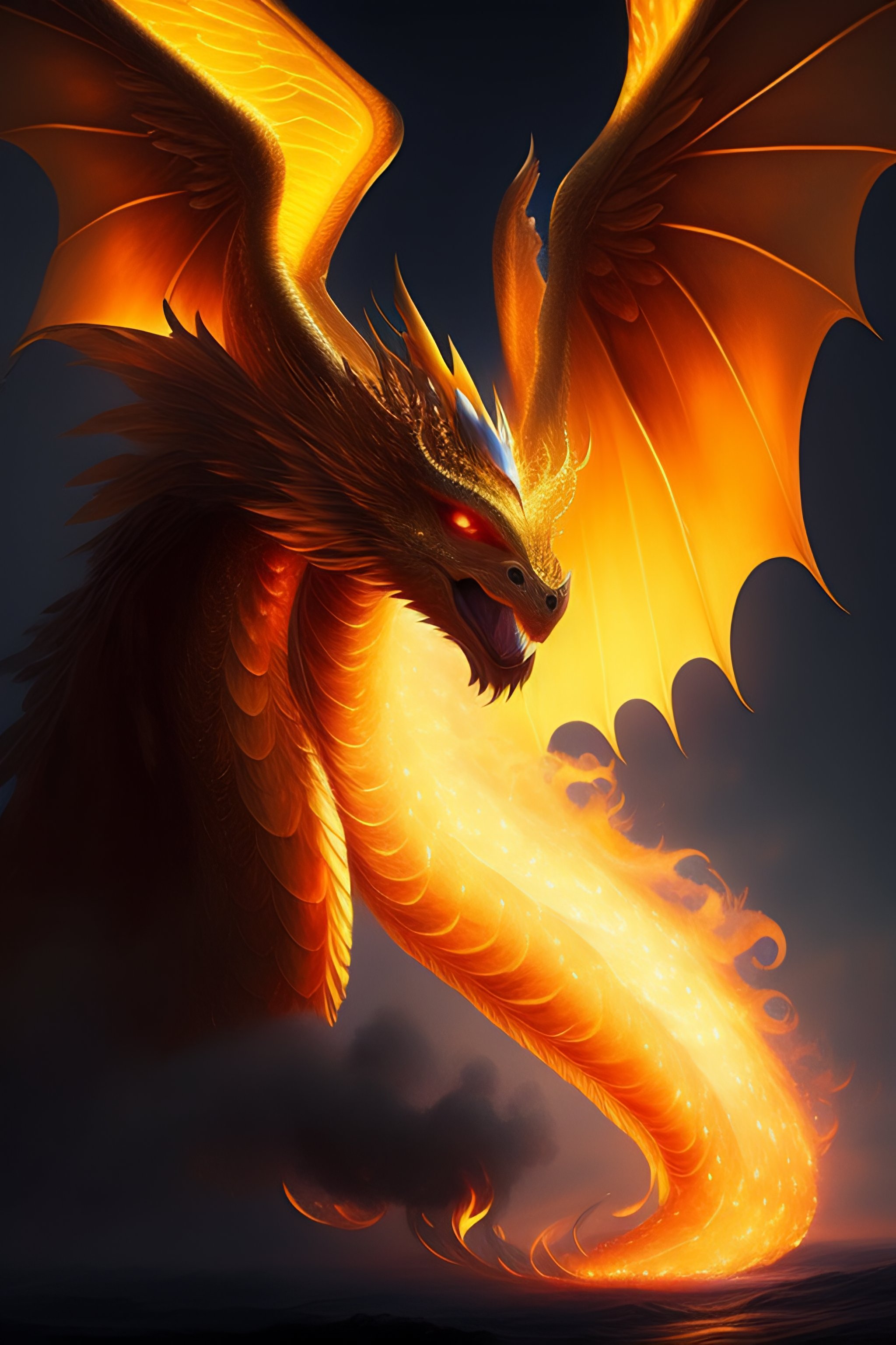Fine art, delicate detail, beauty, i imagine a human winged dragon that can fly and breathe fire. his skin is smooth and luminous, like shining. his wings are long and elegant, with feathers that provide impressive strength in the air. the dragon is very agile and fast, and can navigate the sky with grace and elegance. whenever he wants, he can breathe fire through his mouth, creating a shower of golden flames that he can use to defend himself or attack. he is a magical and powerful being, and the sight of him in the sky is impressive., trending on artstation, sharp focus, studio photo, intricate details, highly detailed, by greg rutkowski