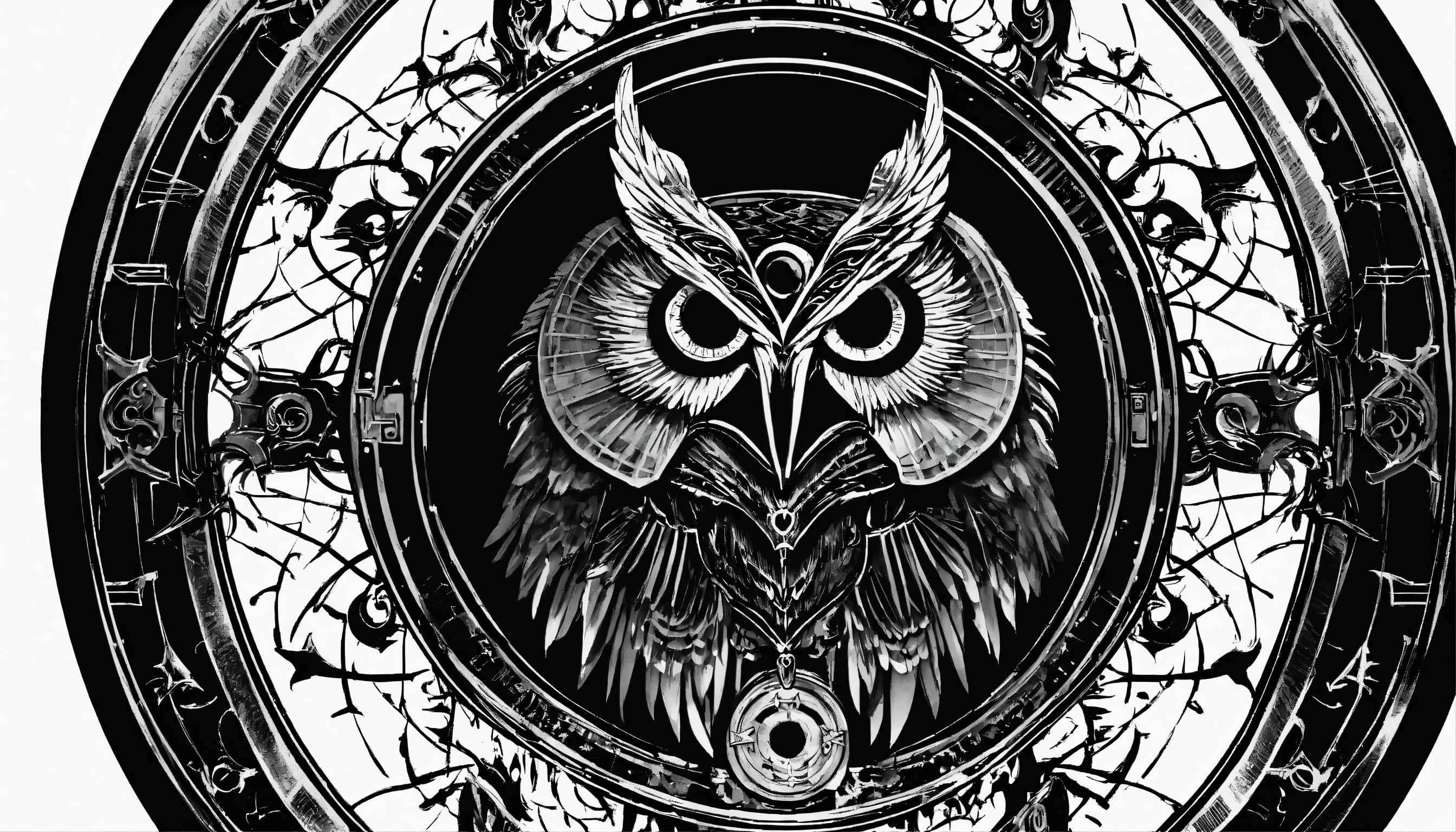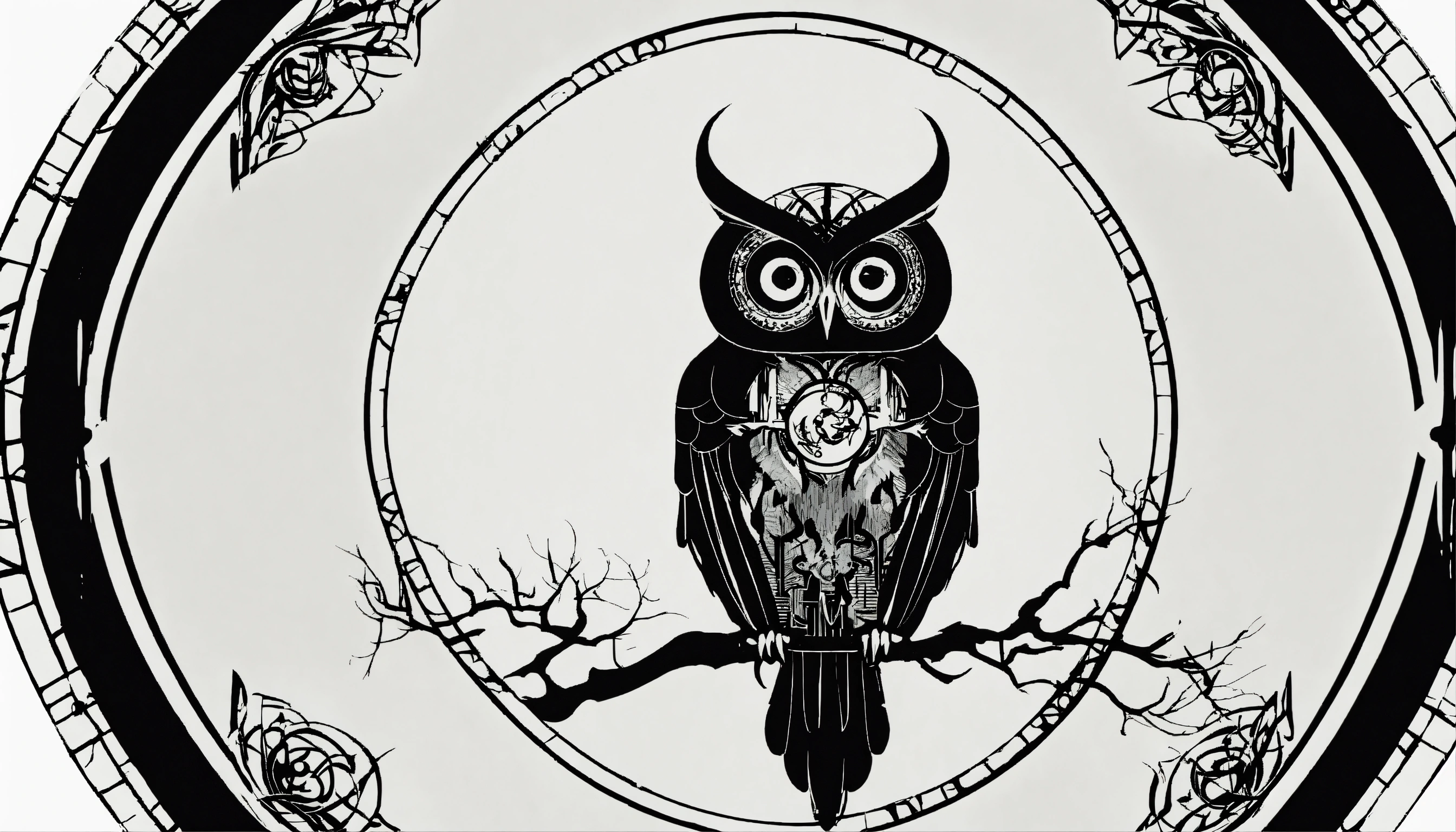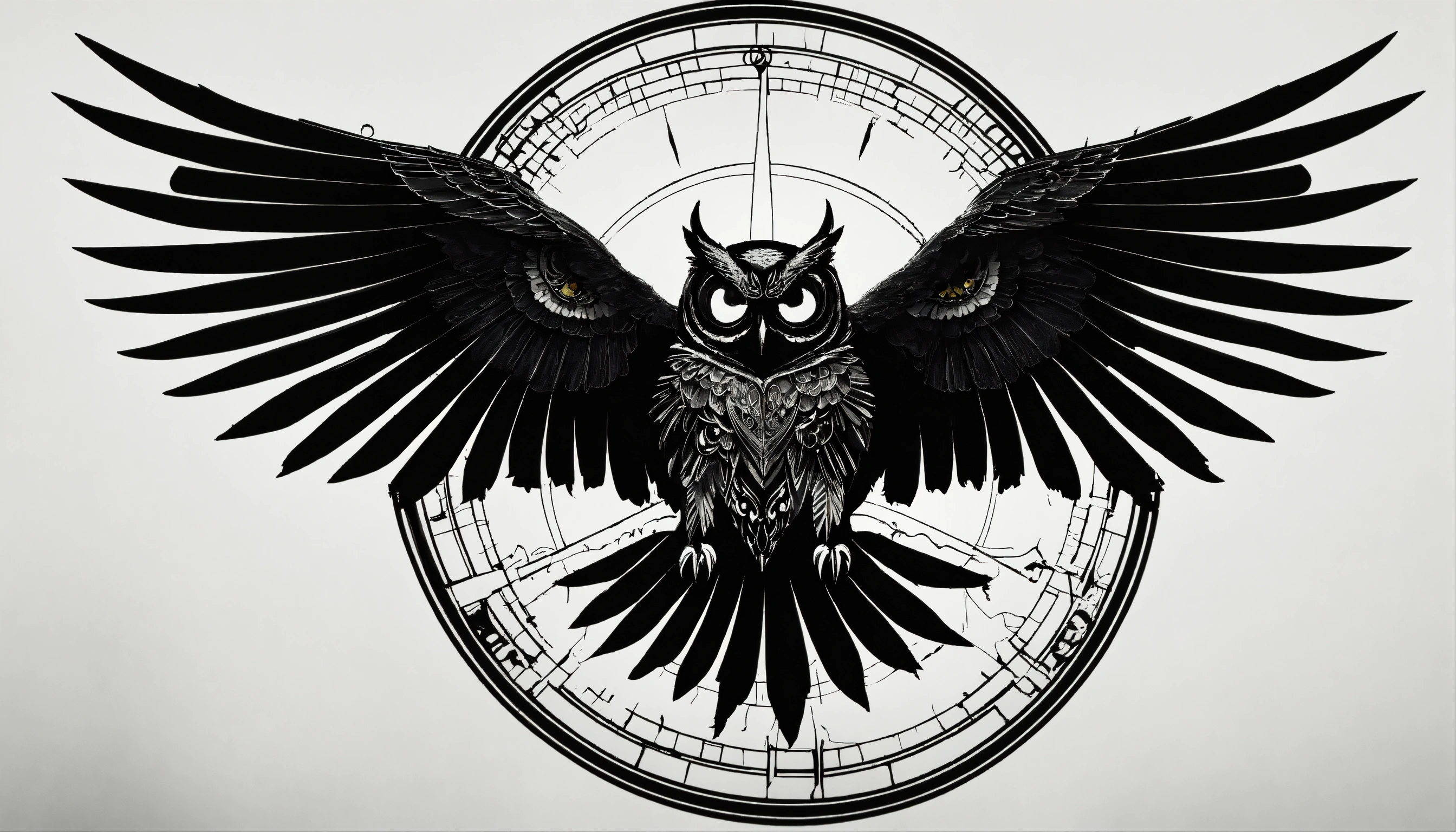 Evil demonic black owl divine circular symbol, occultic symbolism, inspired by apollyon, emblem, insidiously symbolic and prophetic, black owl silhouette on white background, created by the son of perdition, futuristic and hyper digital