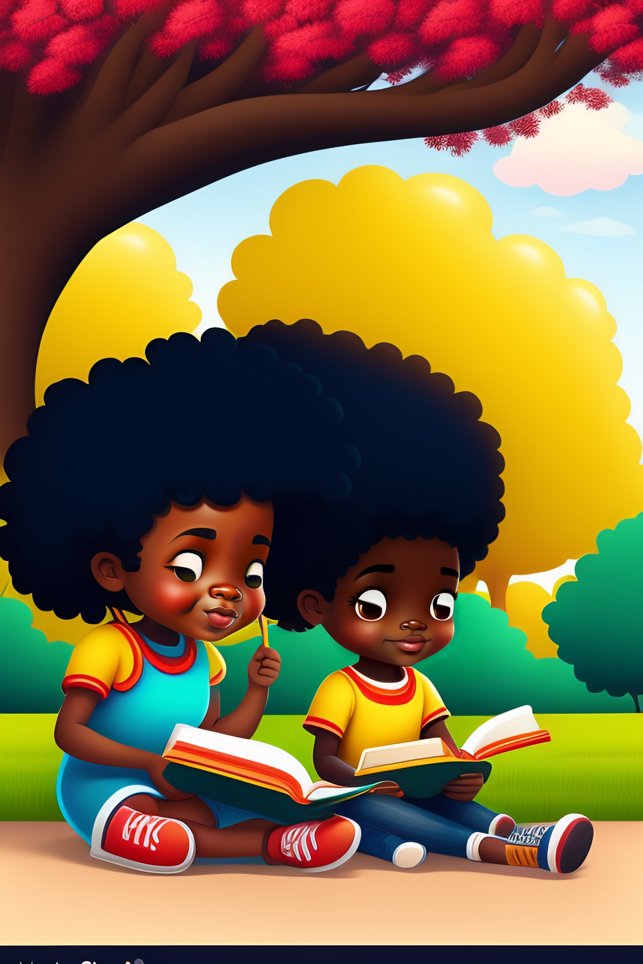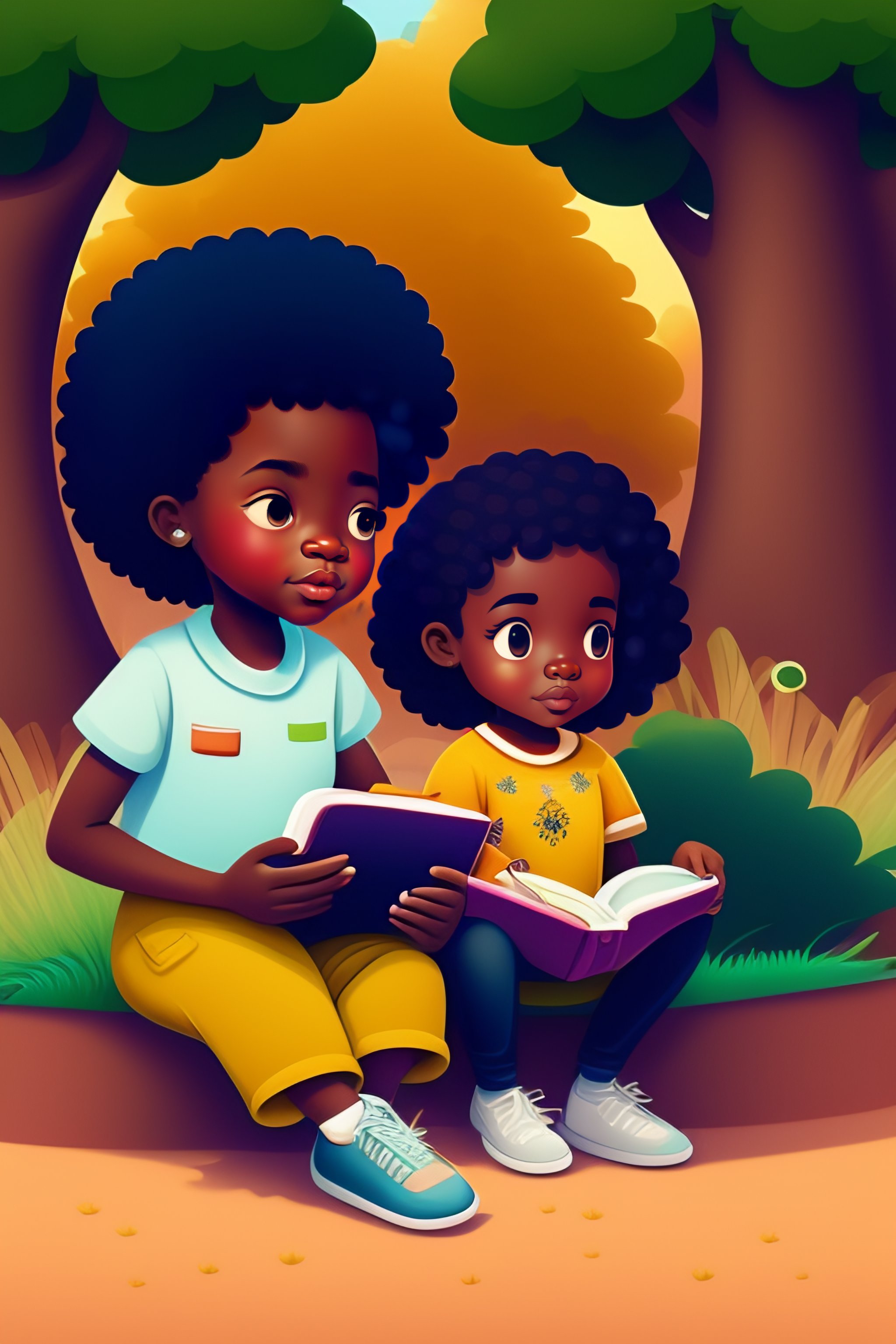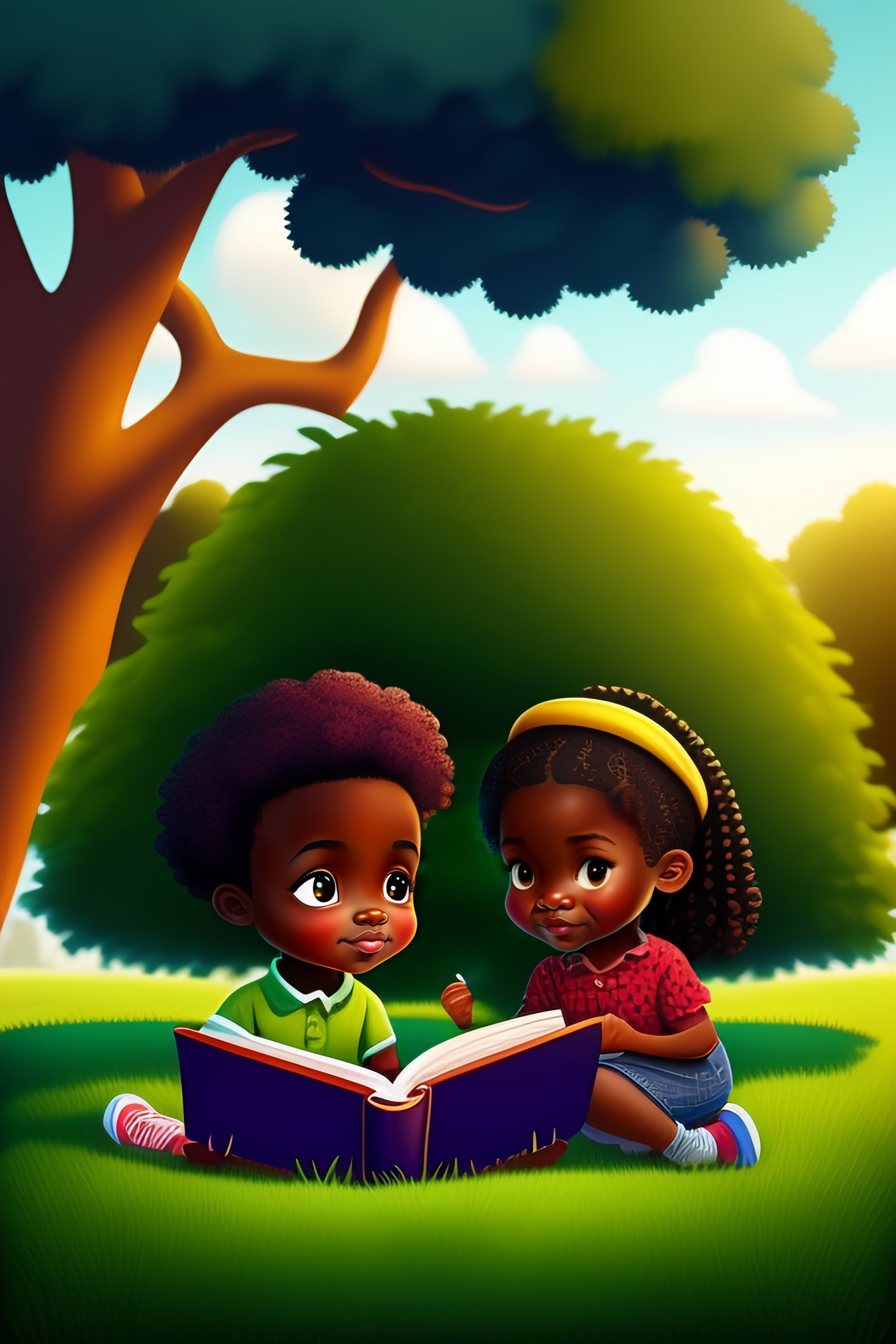 African american boy and girls reading a book outside under tree 4 cartoon