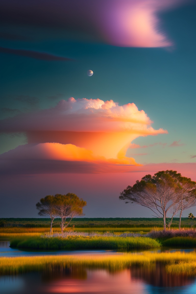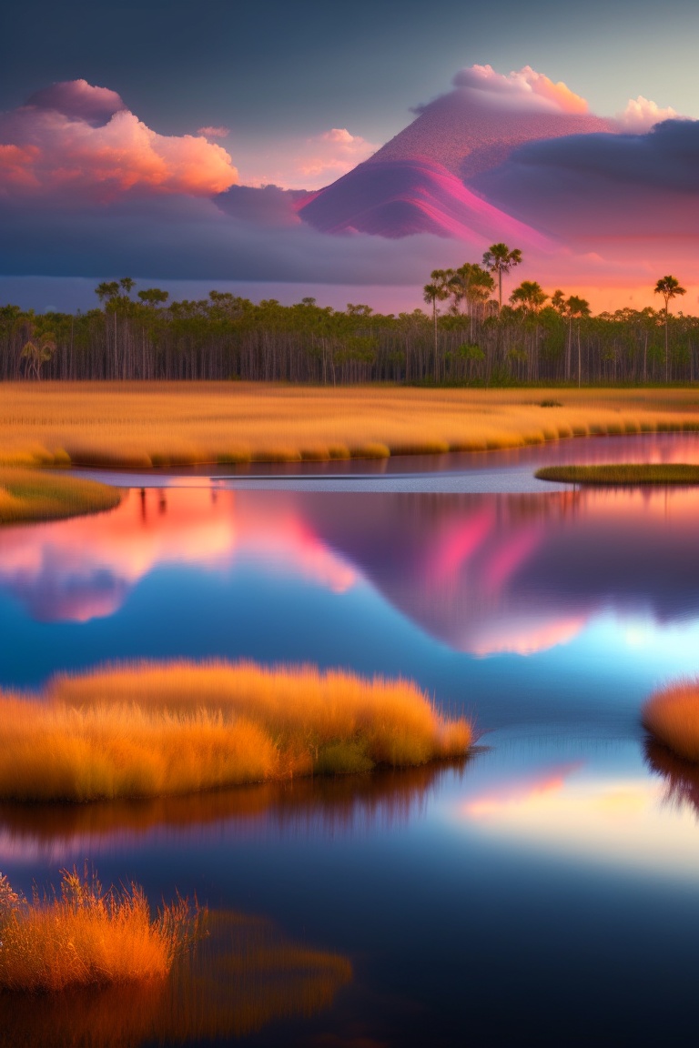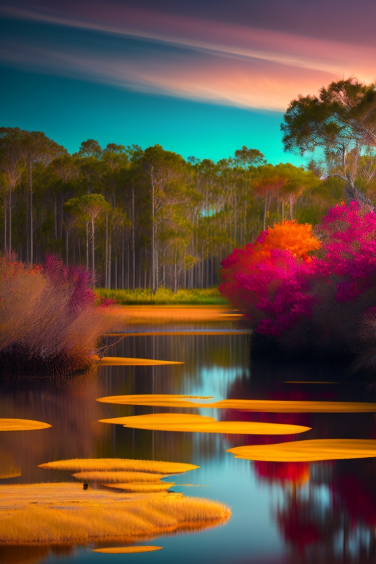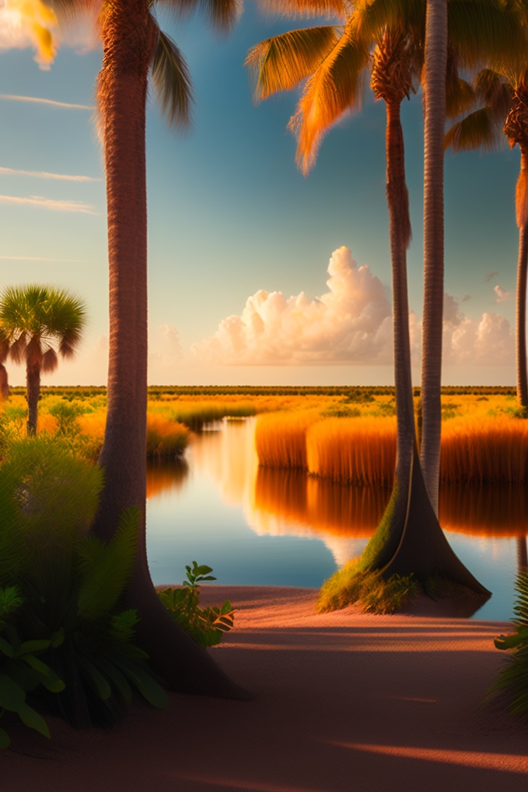 Florida everglades, usa landscape. color scheme 2c3e50, 9ac0c6, c98f91, 1b2e3a, f2c57c, a05c6b, d6c3b6