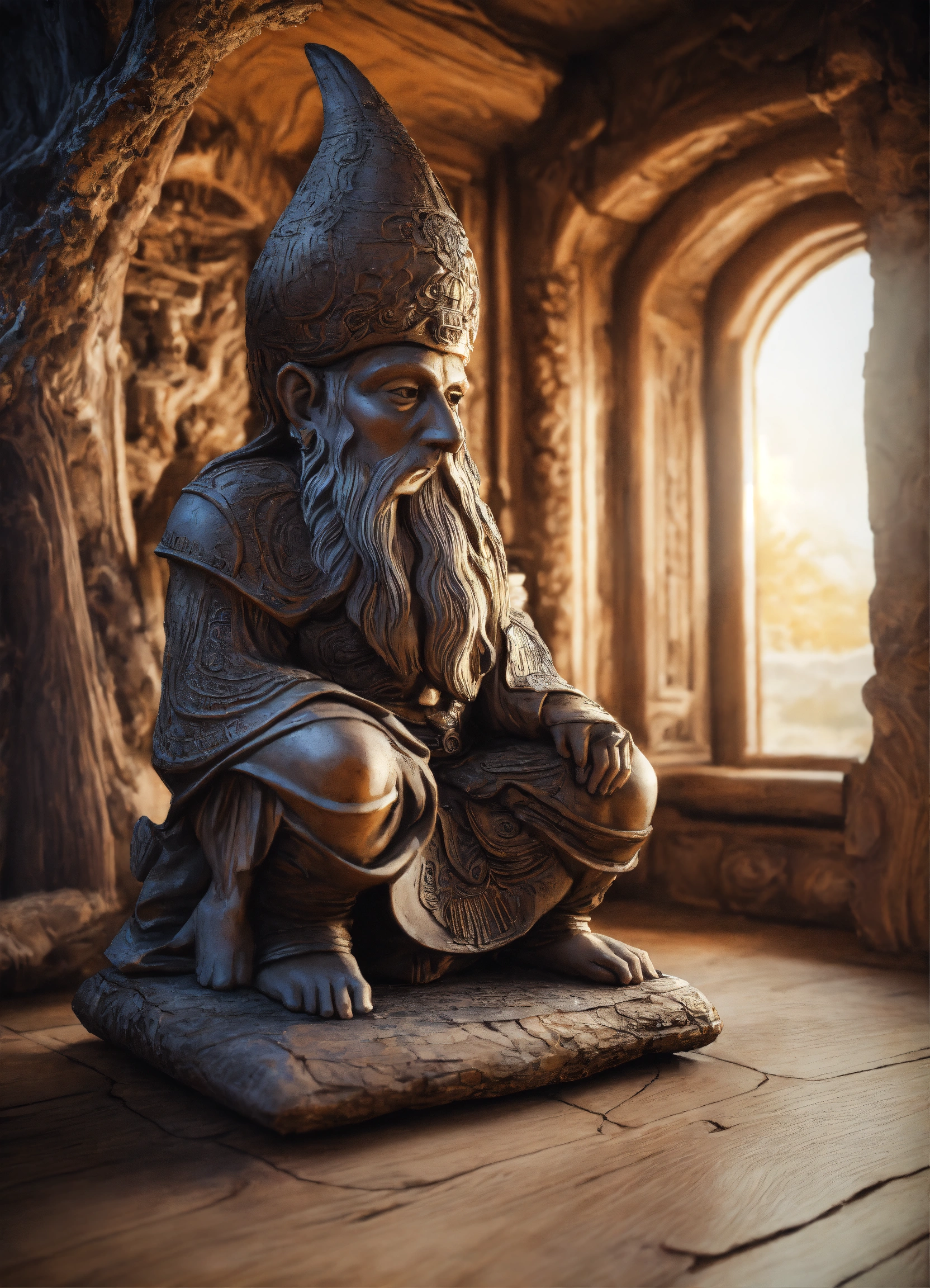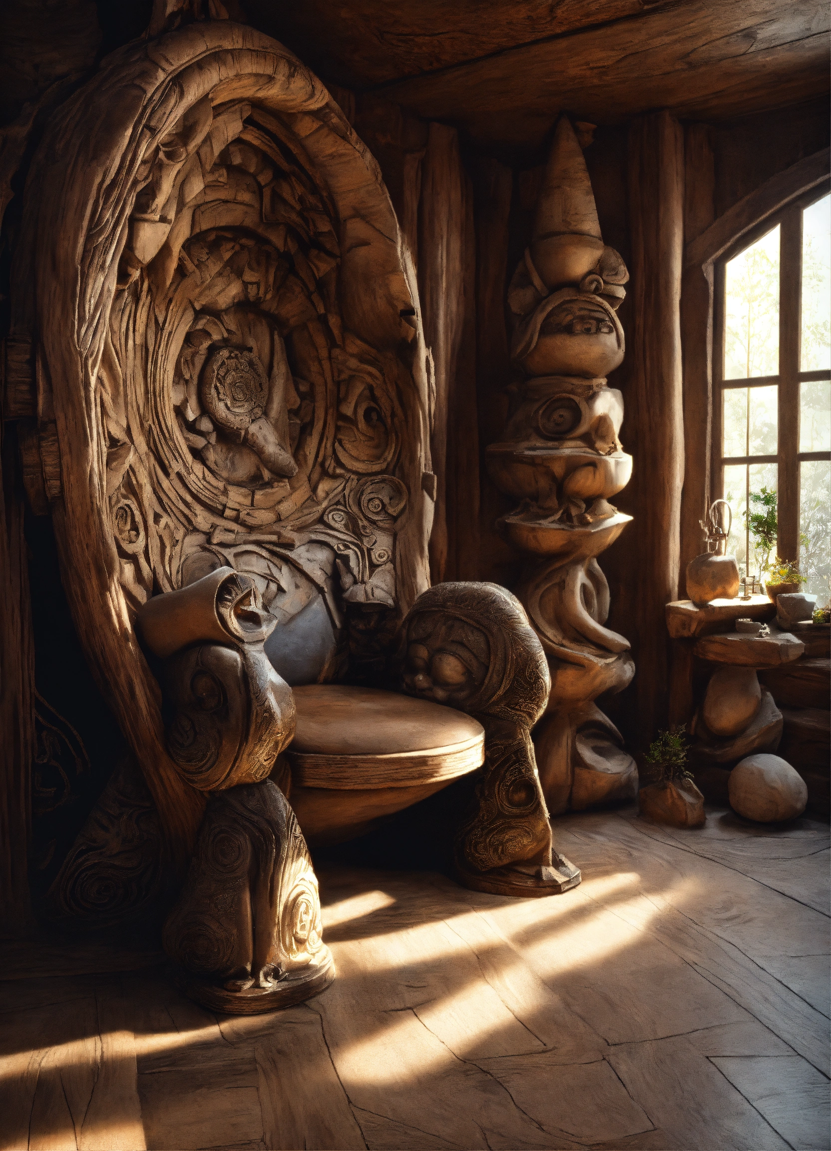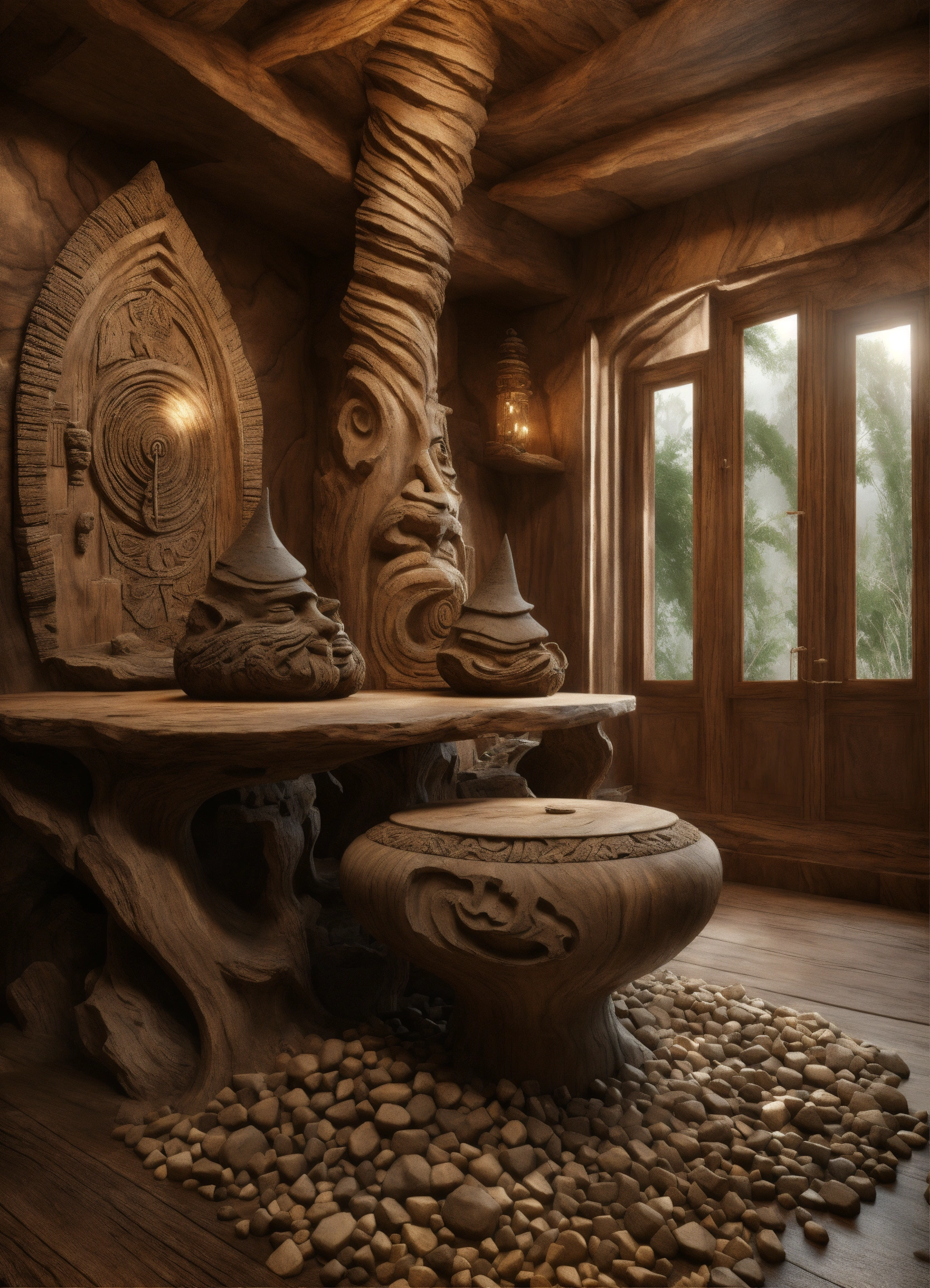 An ancient style spiritual gnome inspired home interior .sculptured . style of alex grey, giger.unreal engine.wood.stone. artistic sculpture.wood/stone/driftwwod