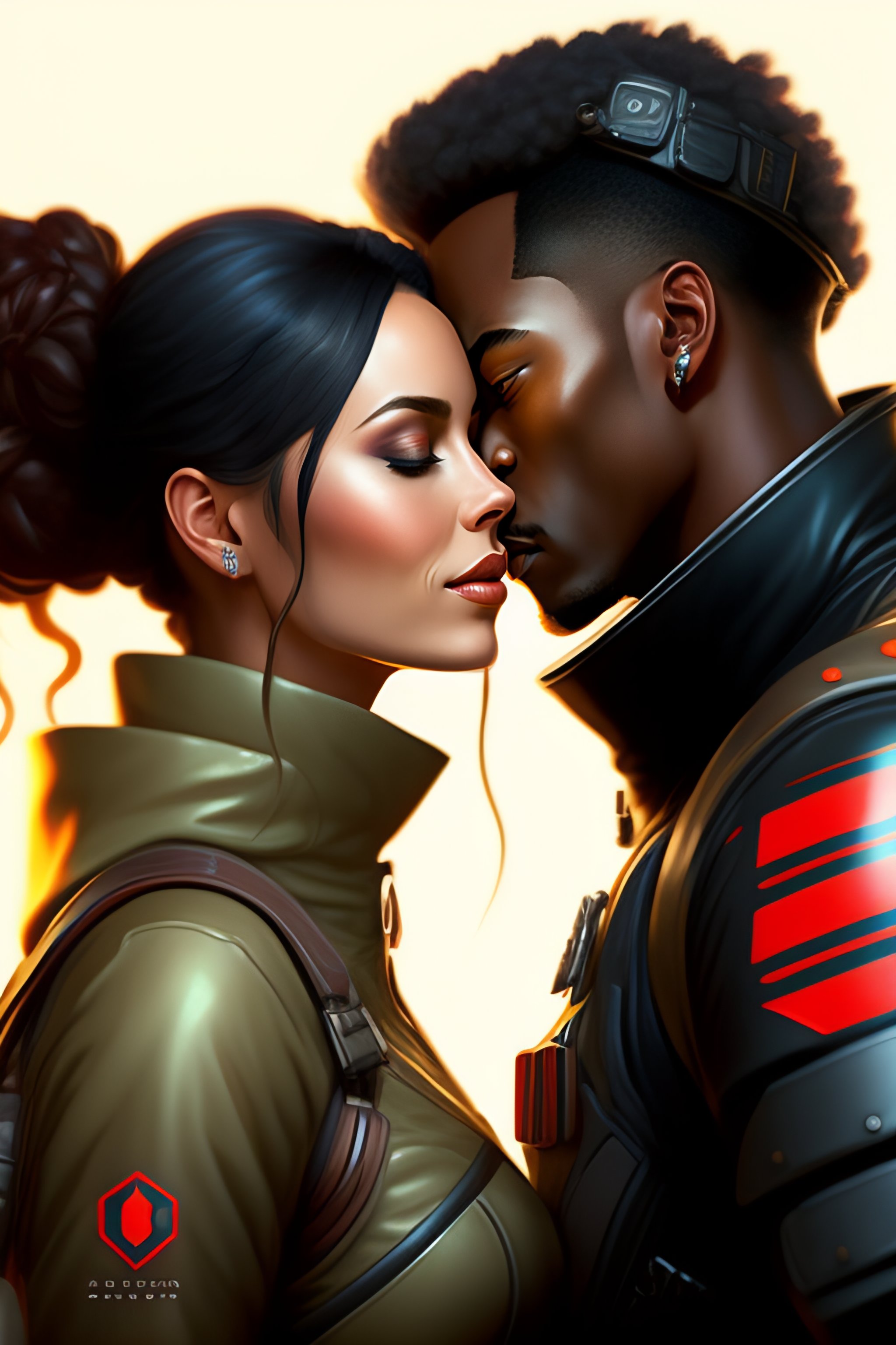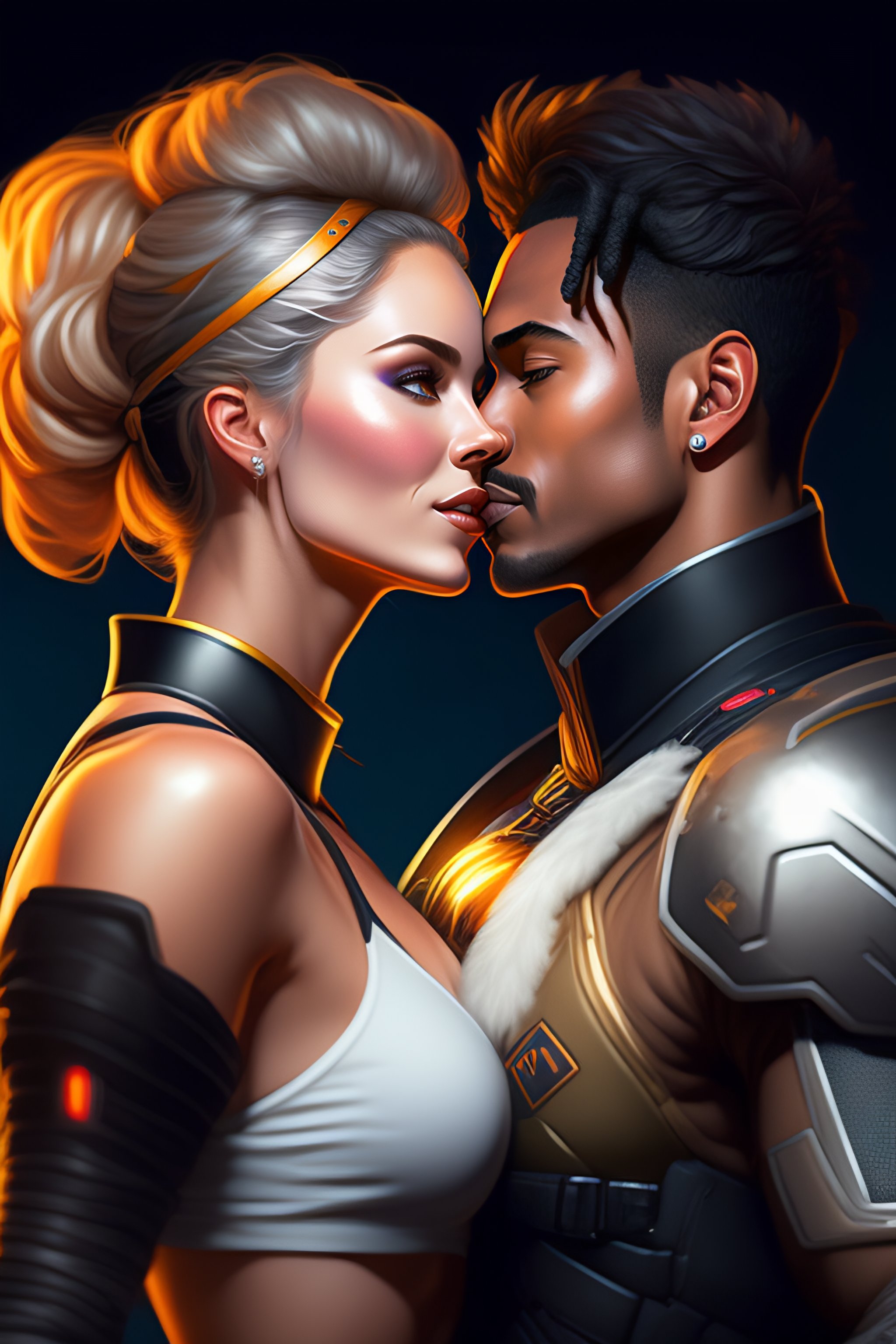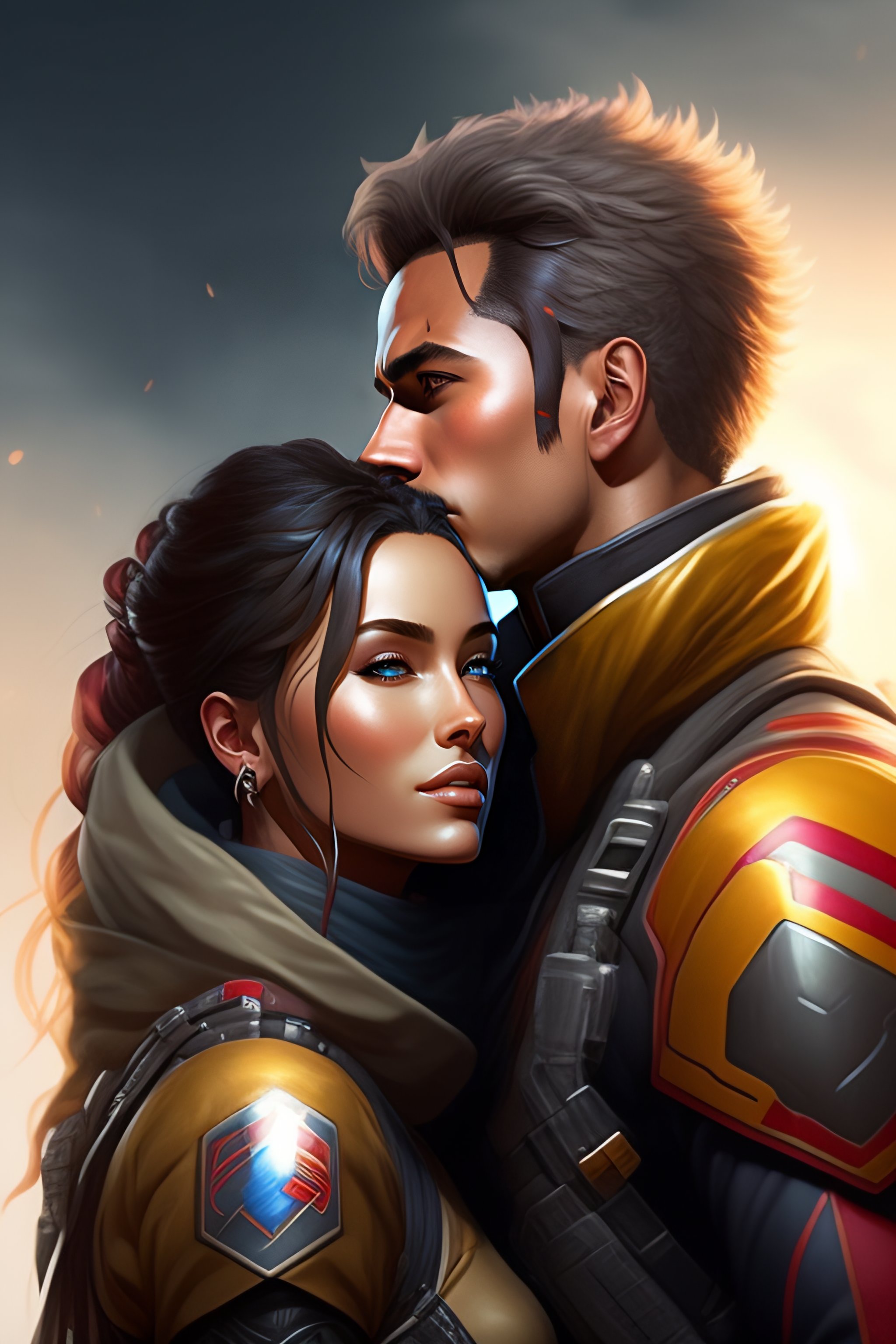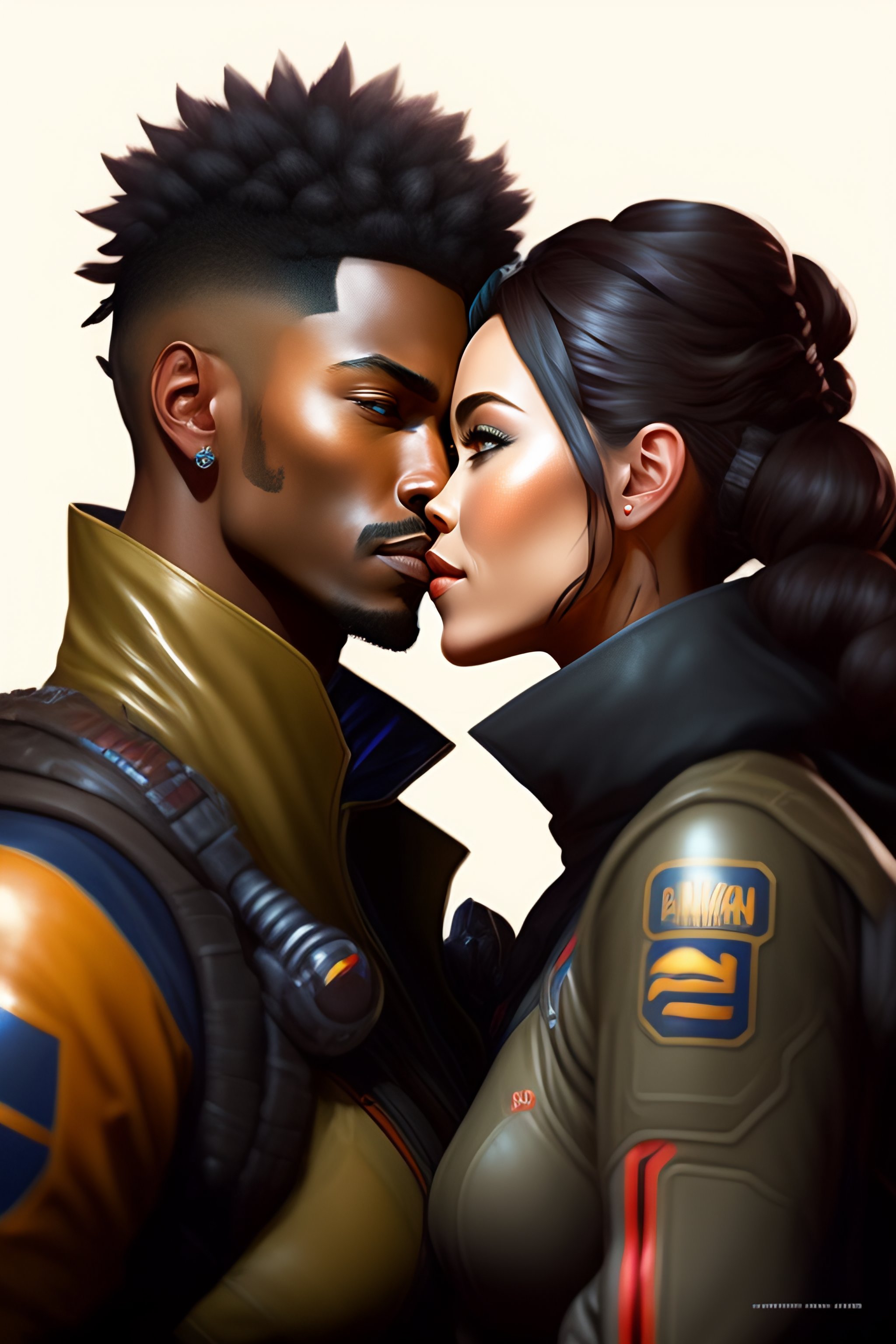 The two lovers female and male kissing, as an apex legends character digital illustration portrait design by, mark brooks detailed, soft lighting