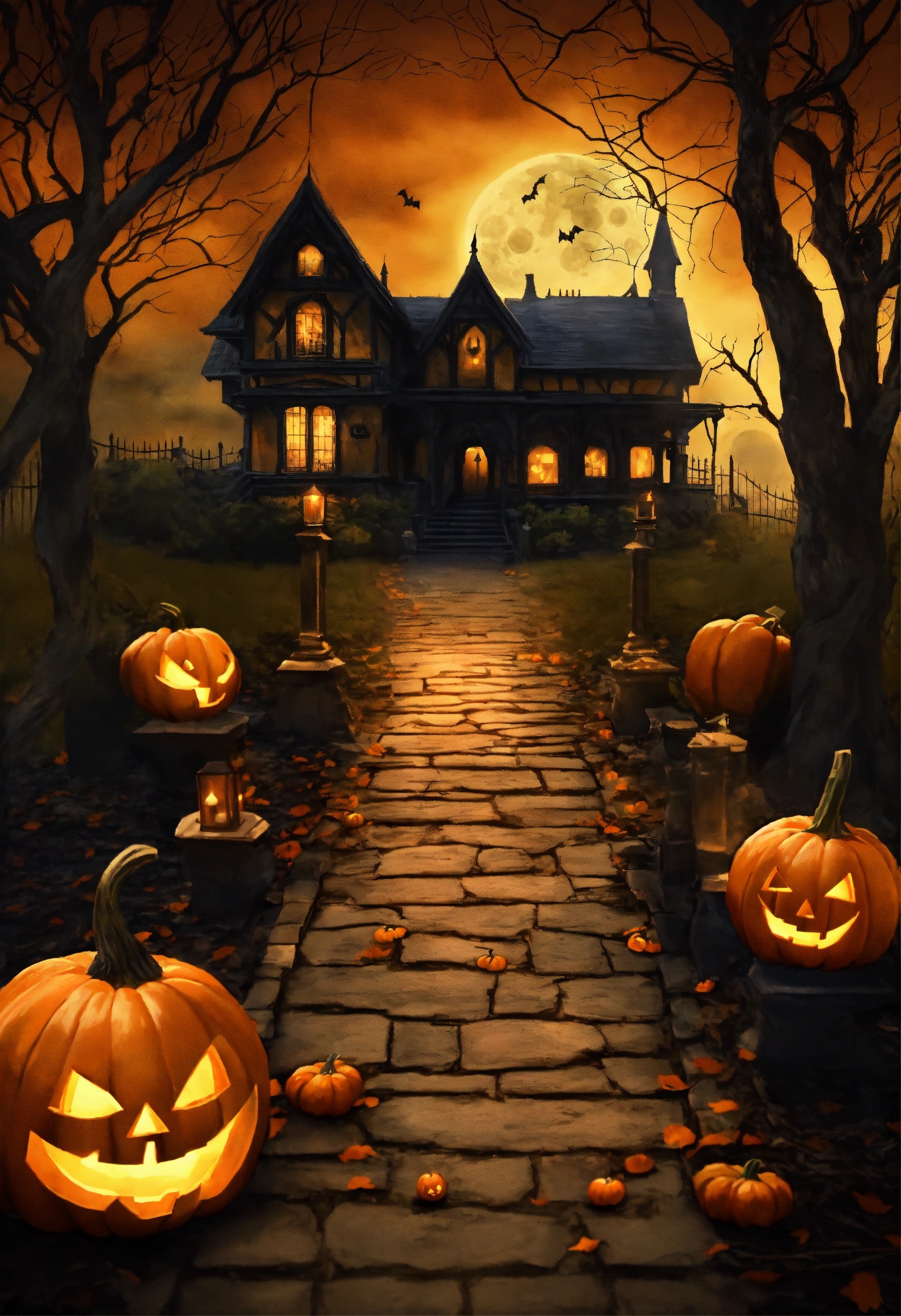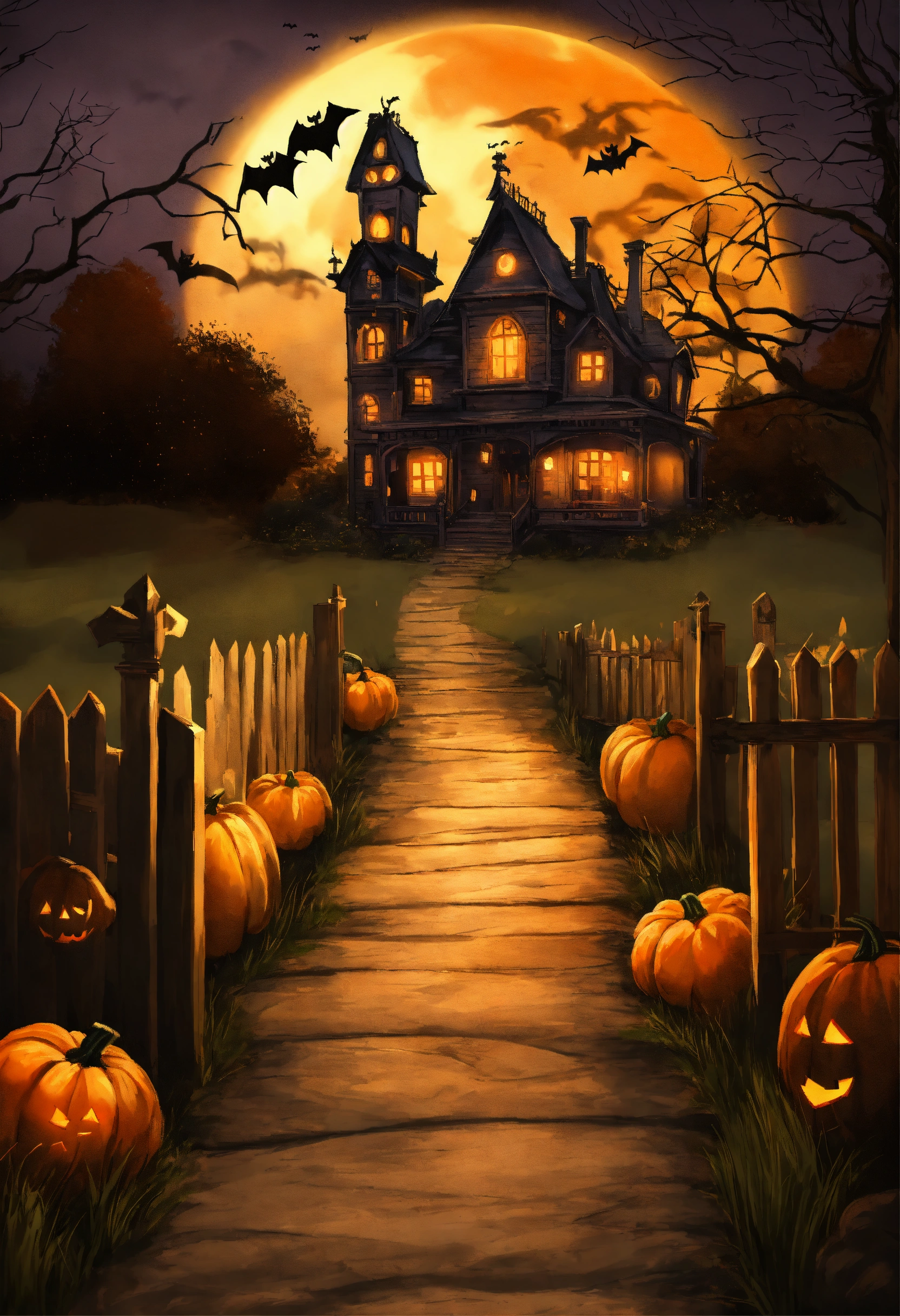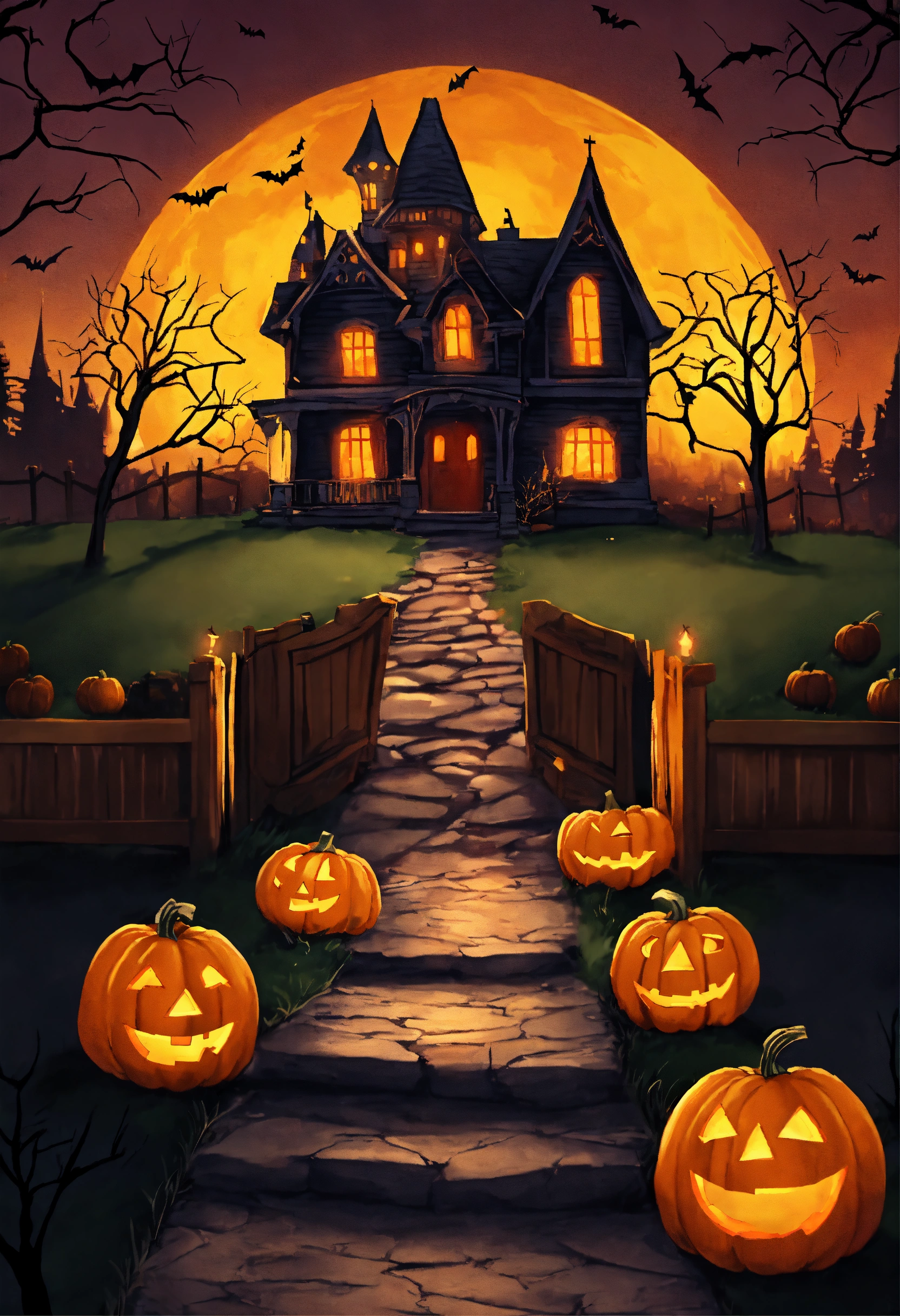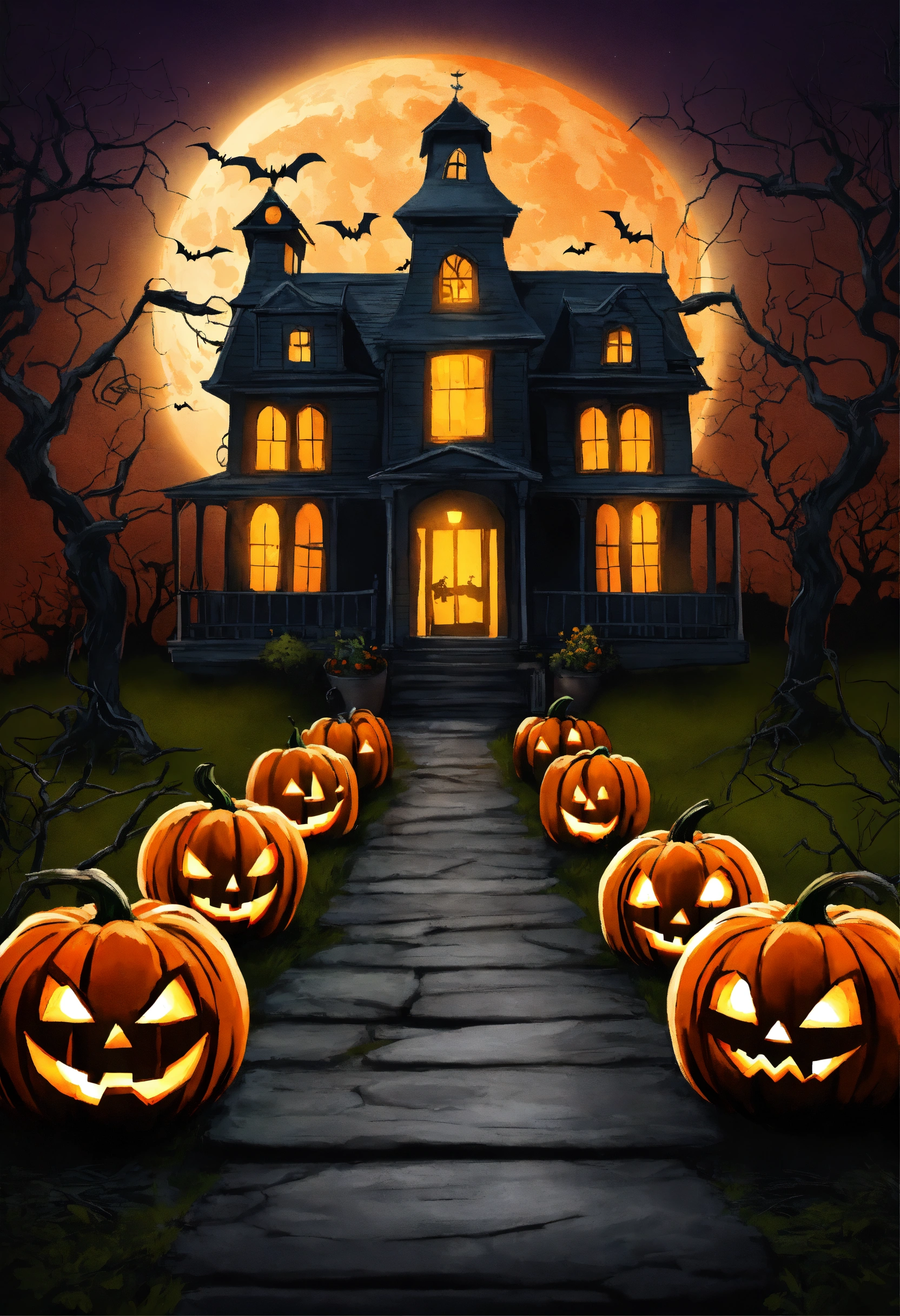 Create a spooky halloween scene with a path leading to a haunted house. the path is lined with pumpkins and lit jack-o-lanterns, creating a dark and eerie atmosphere. the scene should include a full moon in the background, adding to the mysterious ambiance. the haunted house should have a gothic or spooky architectural style, with a large archway or entrance. the overall image should evoke a sense of fear and excitement, capturing the essence of halloween.