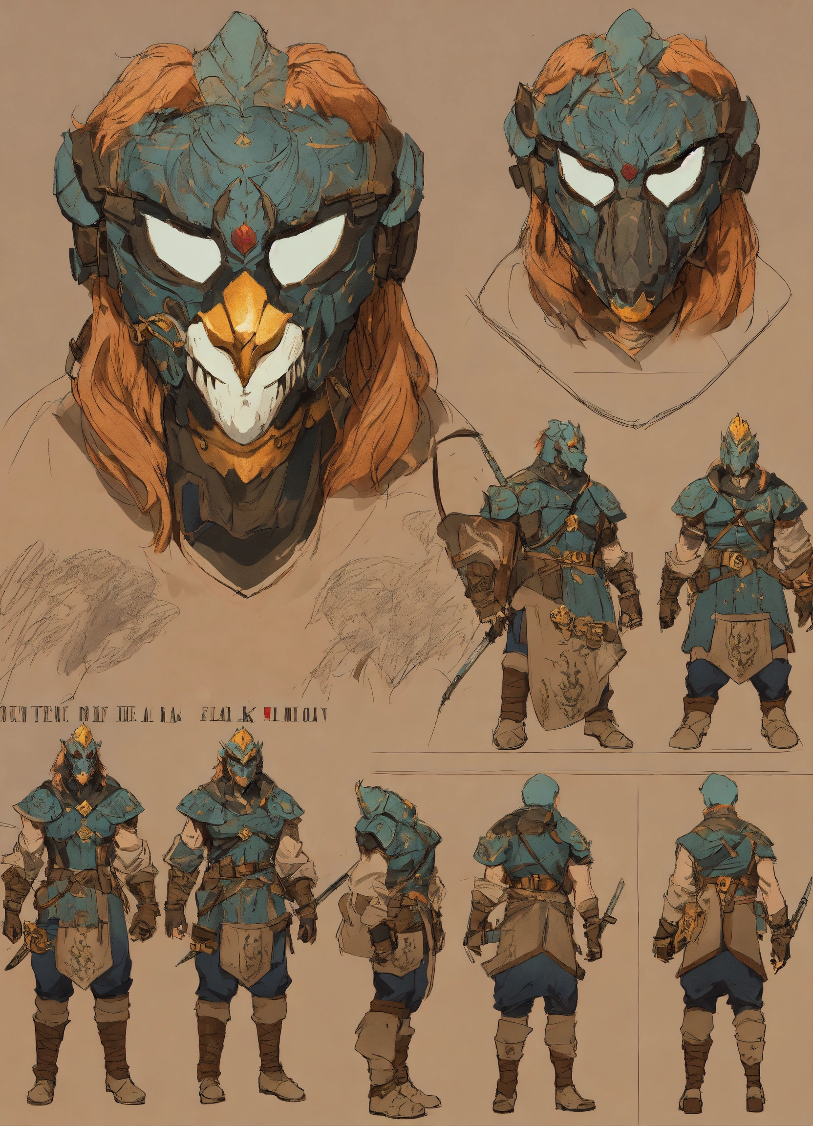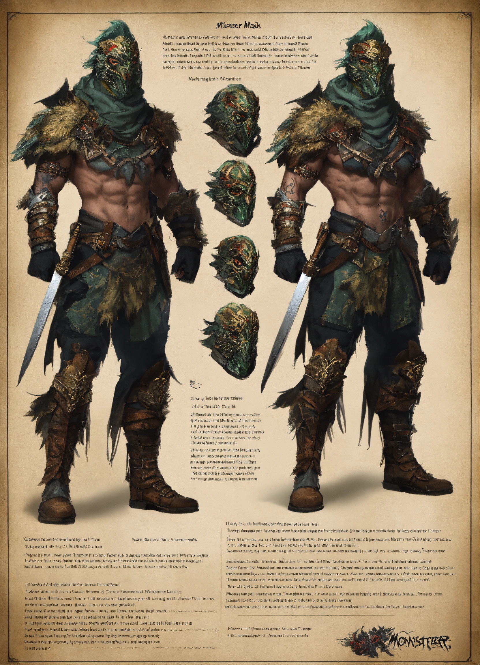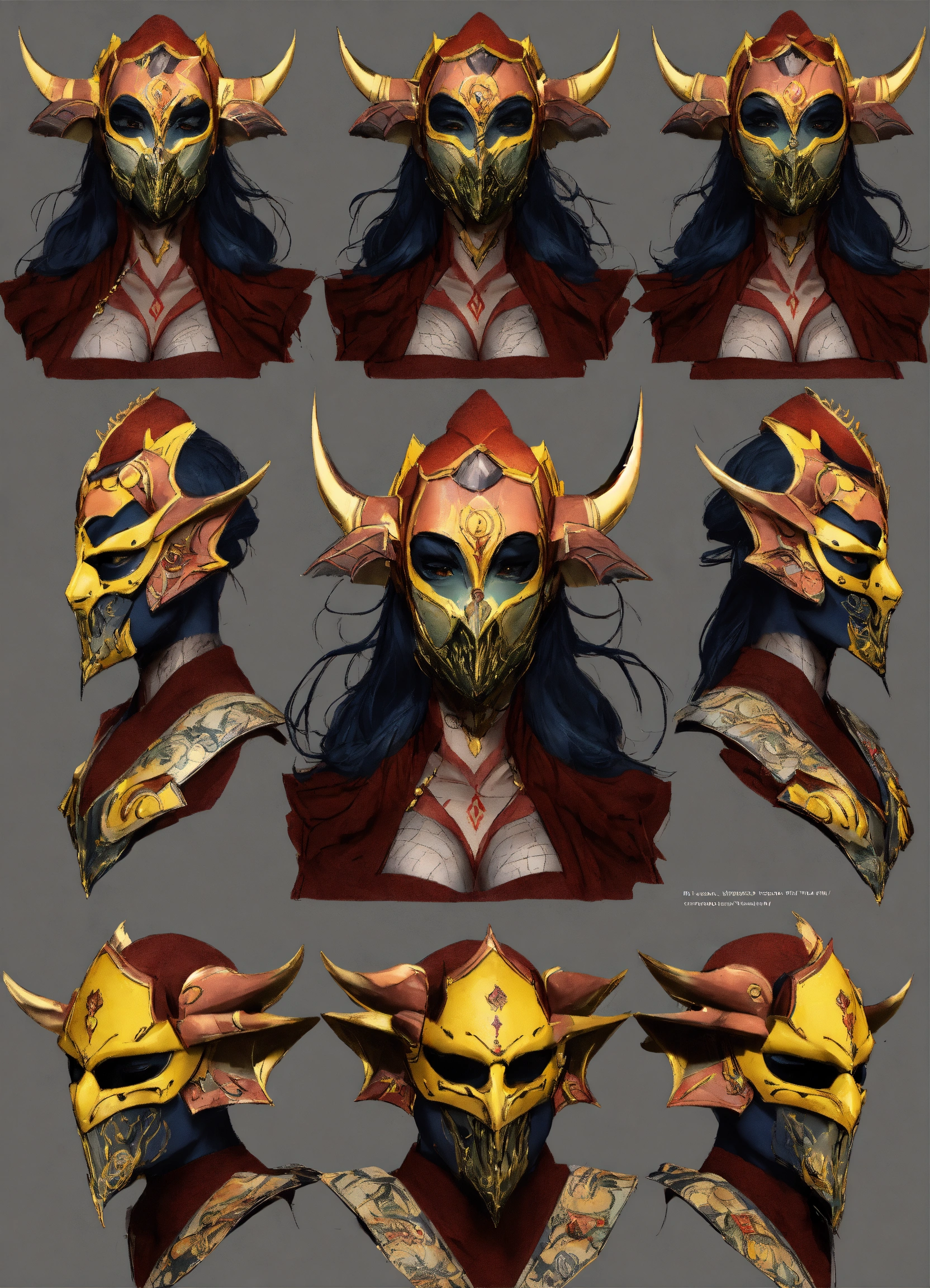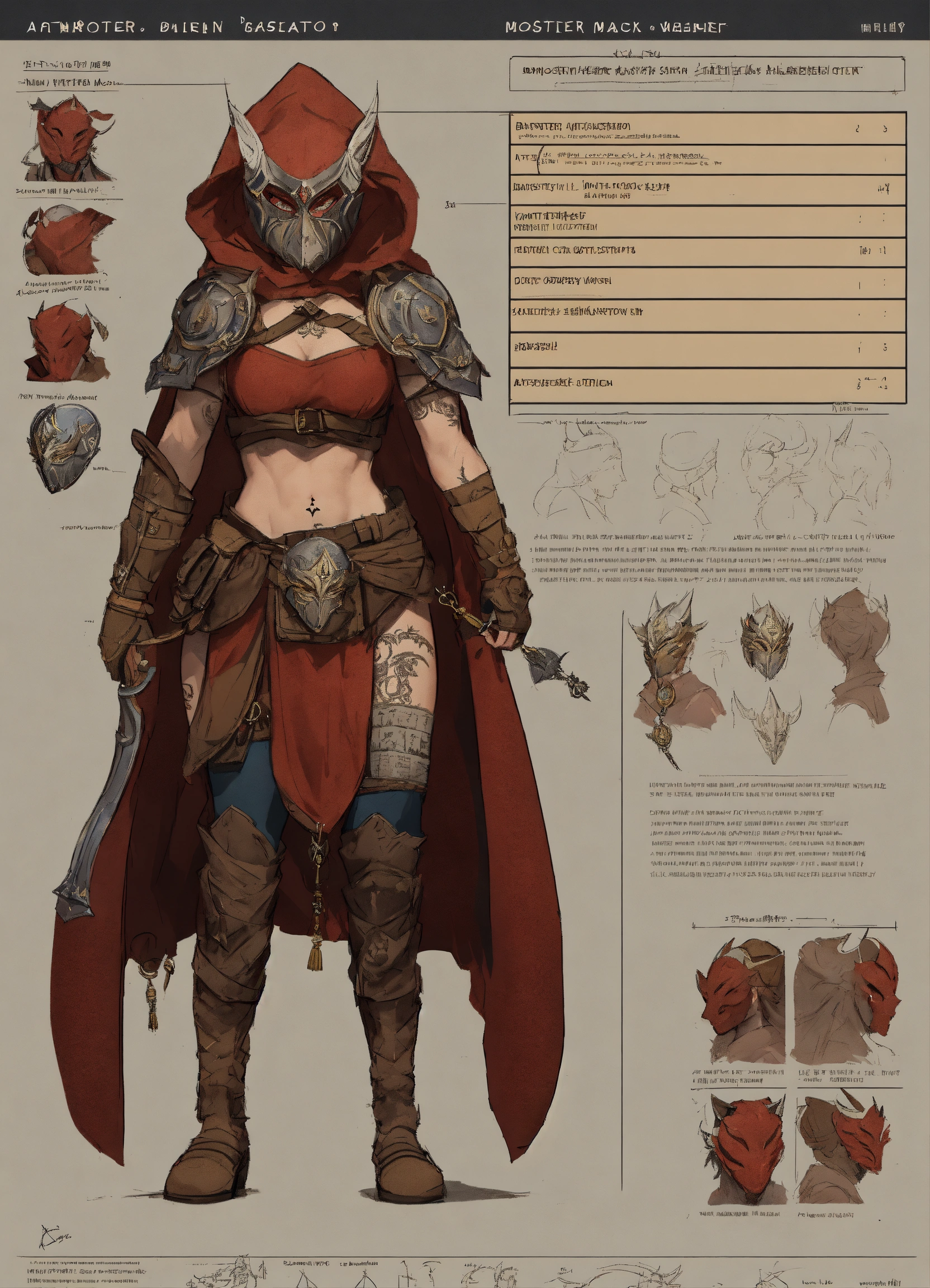 Monster mask, tattoo woman warrior, character sheet, character design, chart, reference sheet, multiple views, high detail, fine details, concept art
