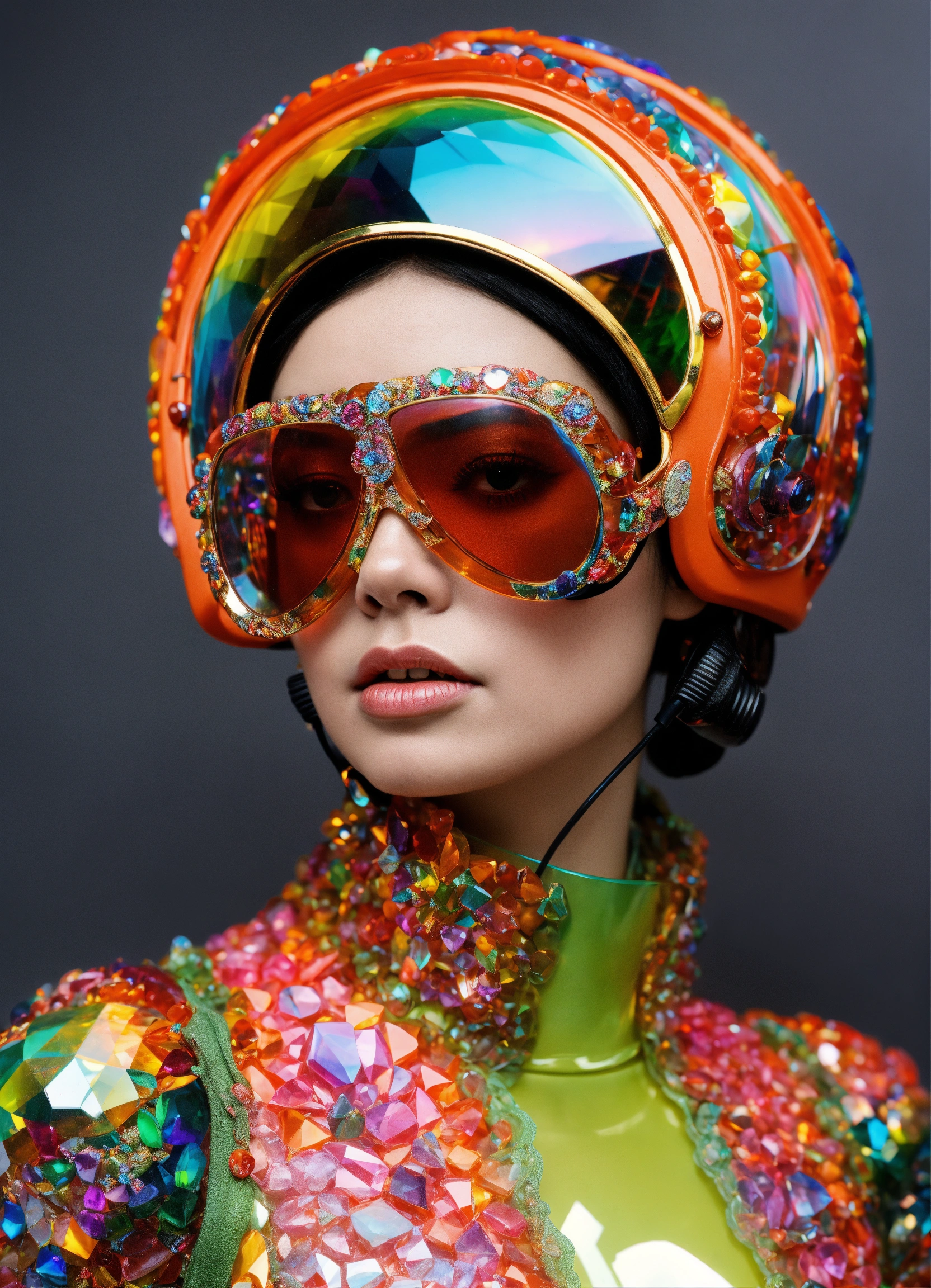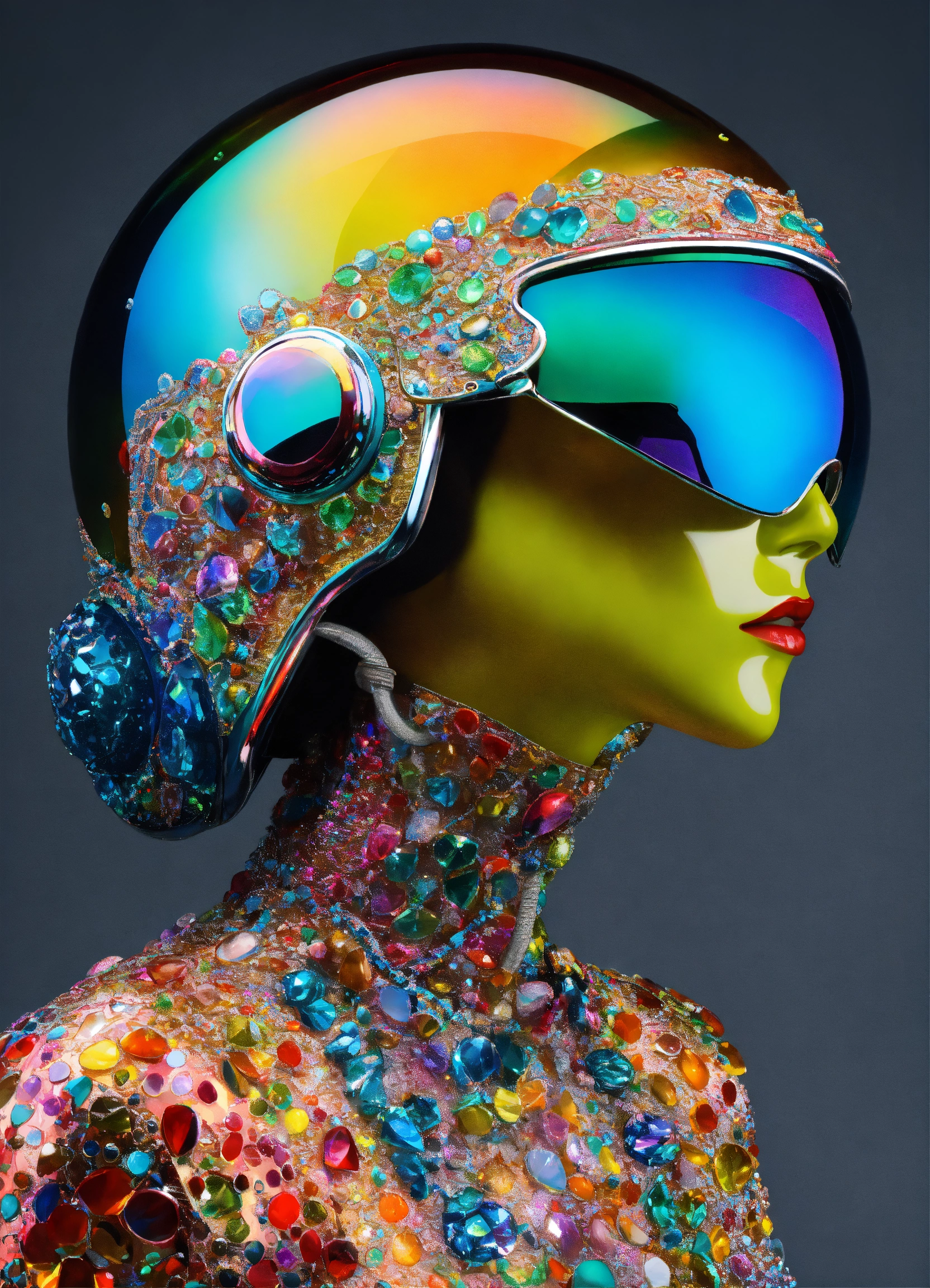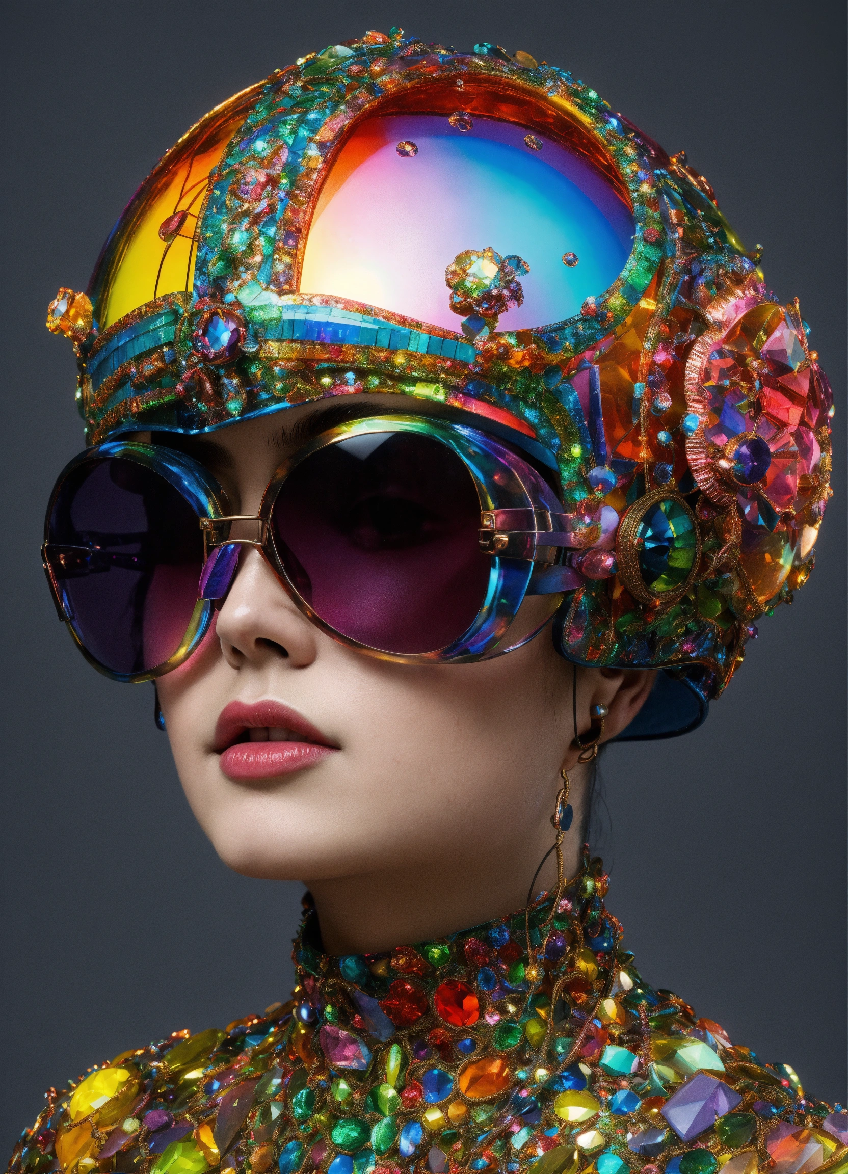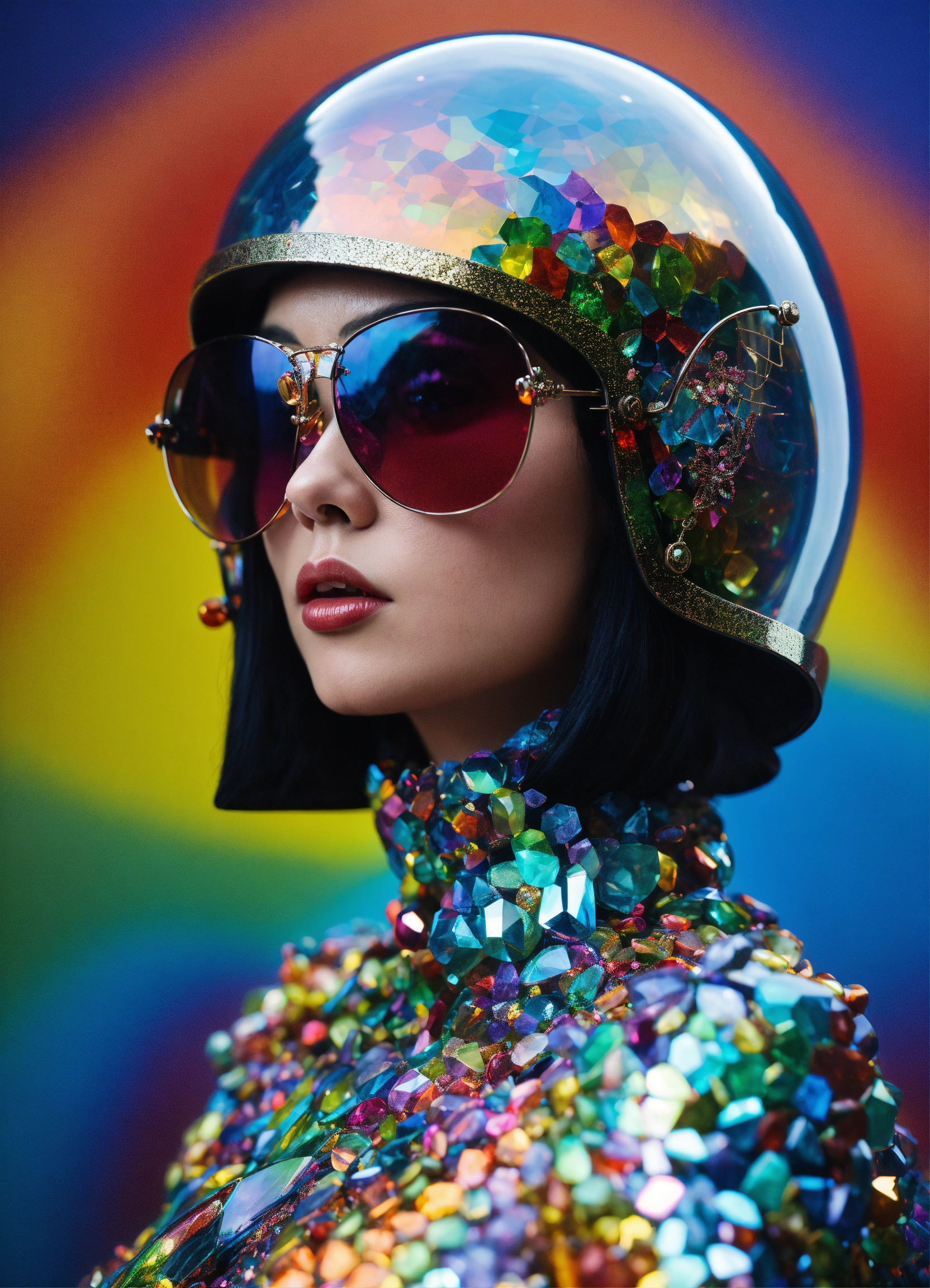 Sergio lopez, natalie shau, pop art, intricate crystal-clear helmet with holographic patterns profile of an eccentric individualenvironment map with large multicolor gemstones and, in a vibrant rainbow colors with metallic accents rounded cables and wires, transparent color shells and wires shape a full 16k wearing a big full highly detailed colorful sunglasses, volumetric lighting, art by yayoi kusama, phuoc quan