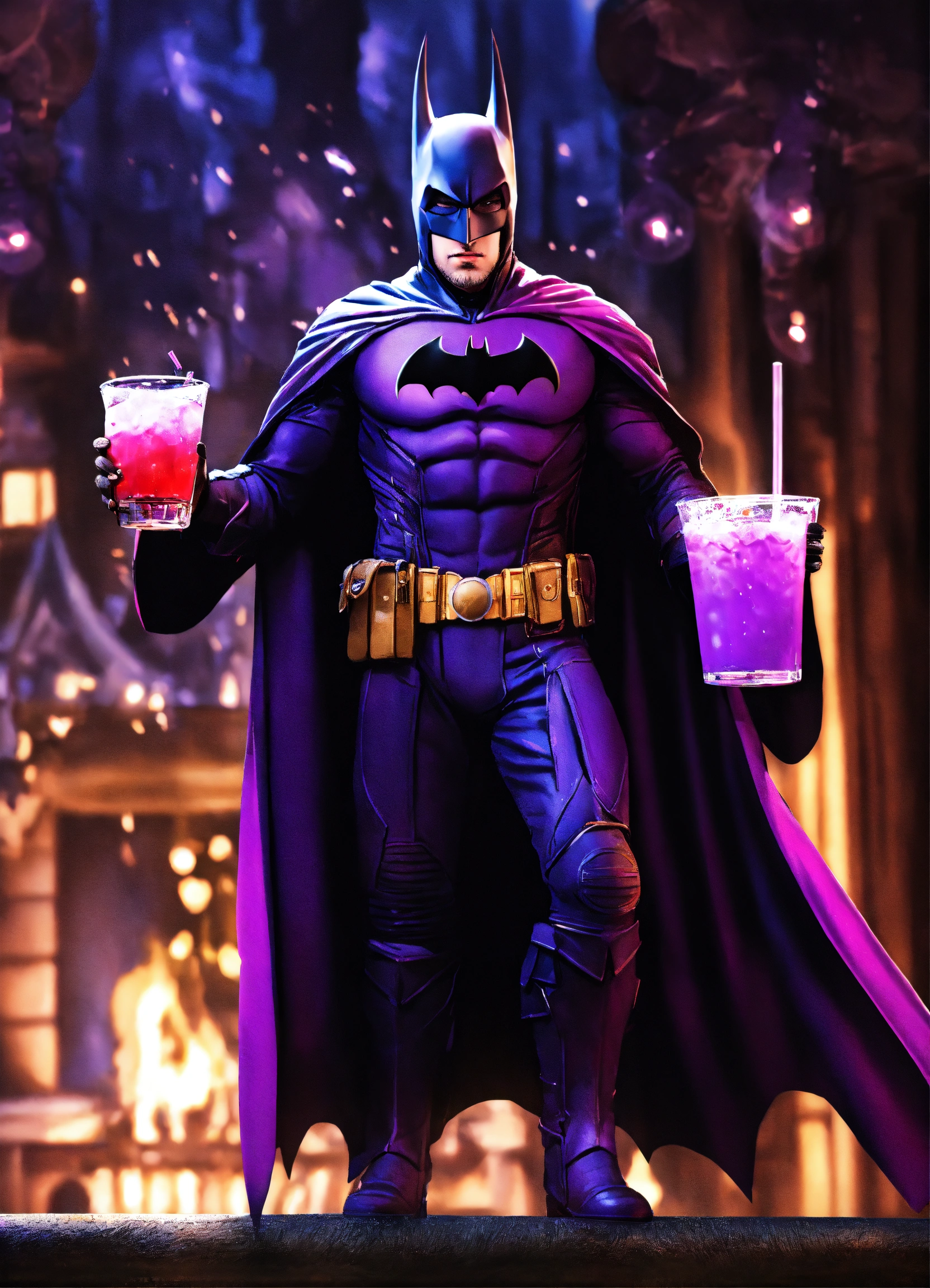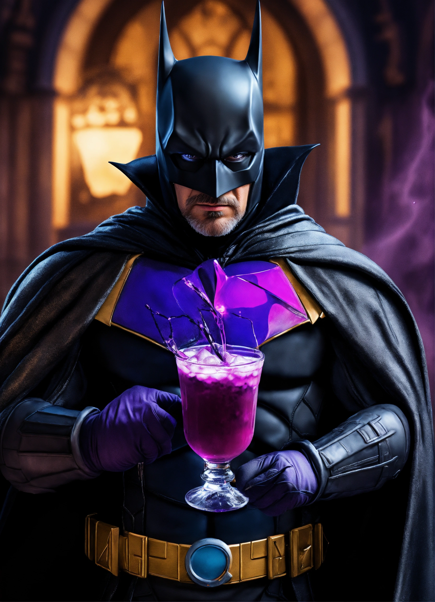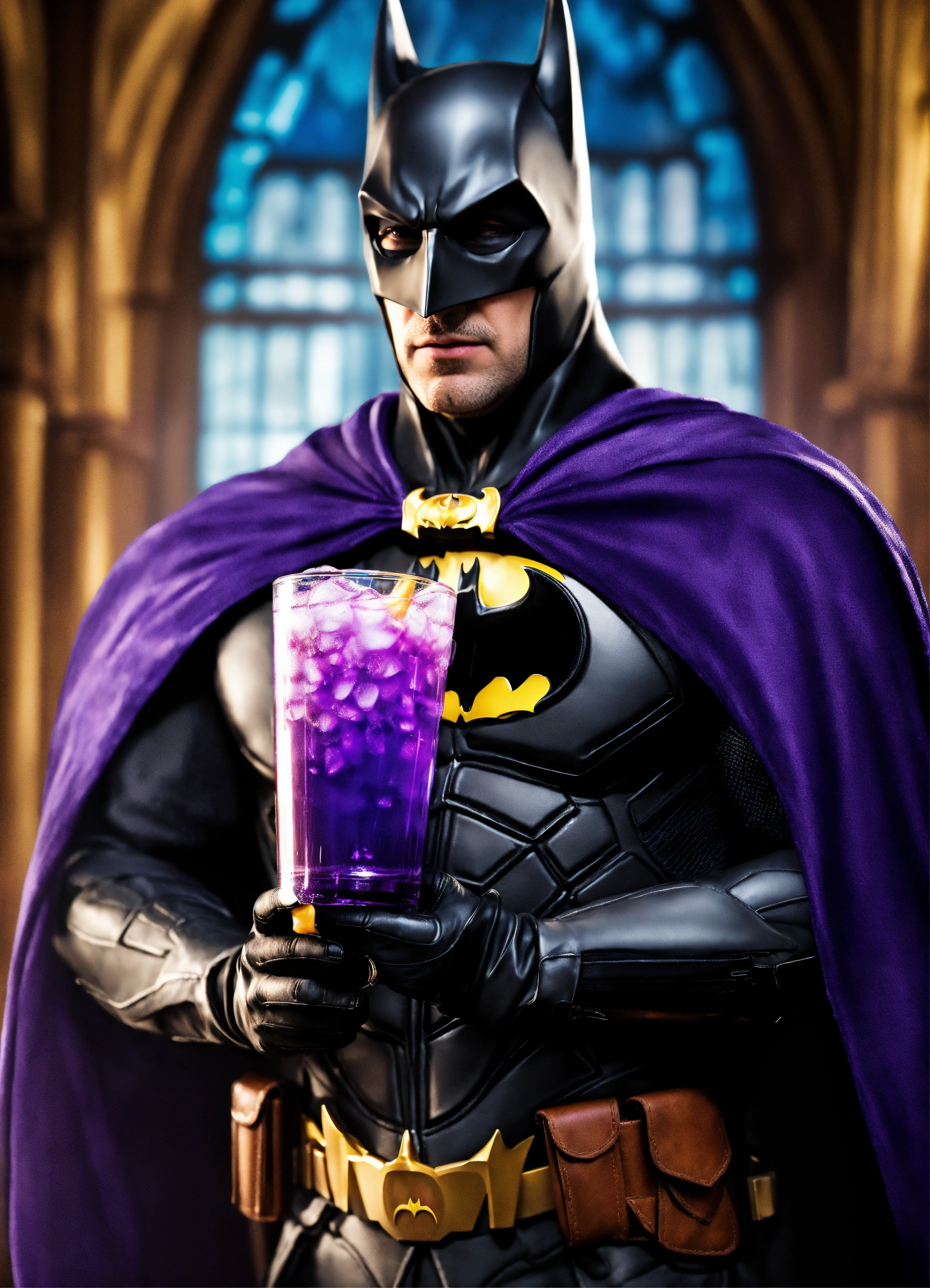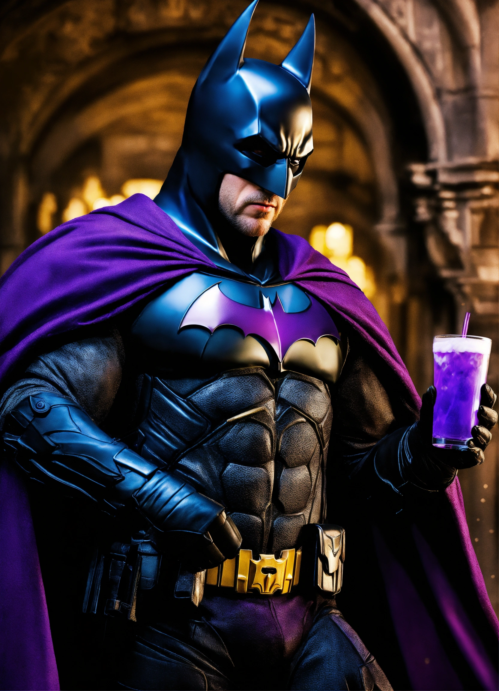 Photorealistic picture of wizard batman holding a purple drink