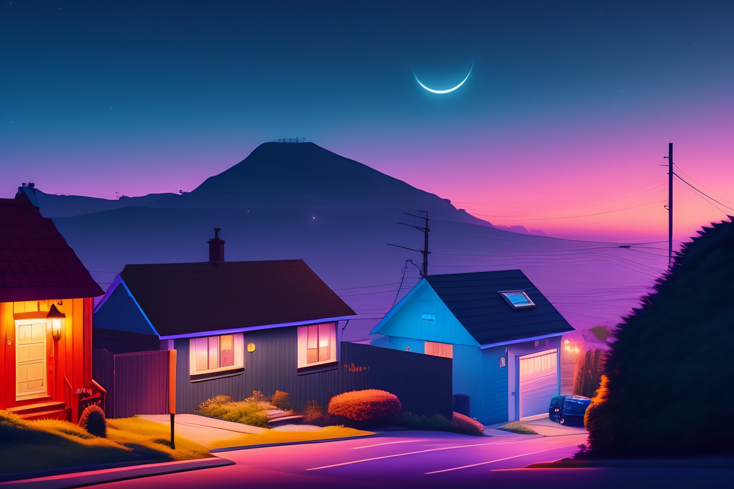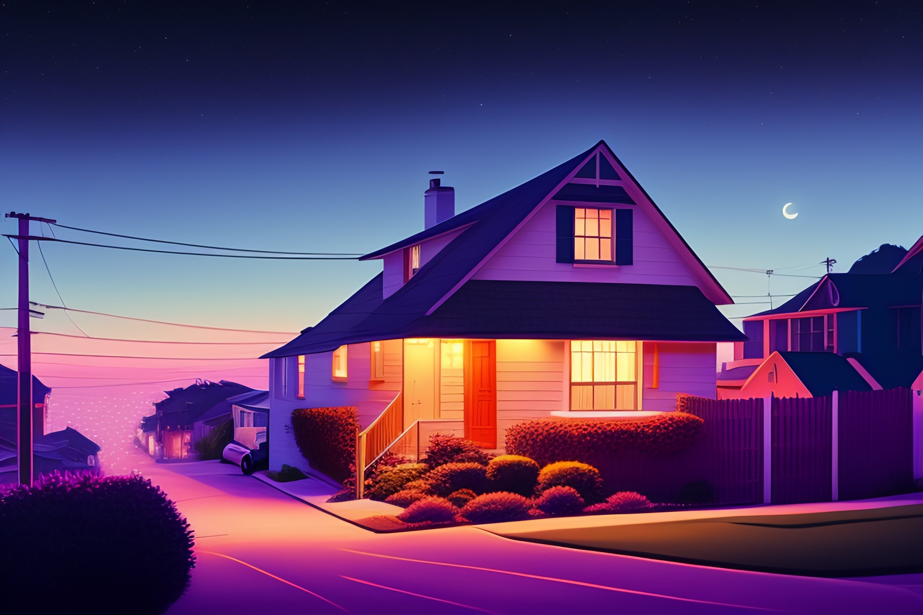 The small house on a street in san francisco, dark night, moon starry sky, gibli, james gilleard, atey ghailan, exquisite lighting, clear focus