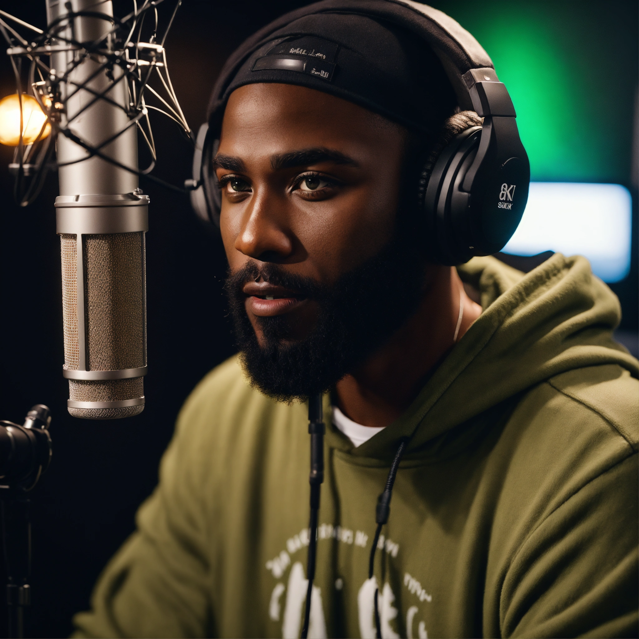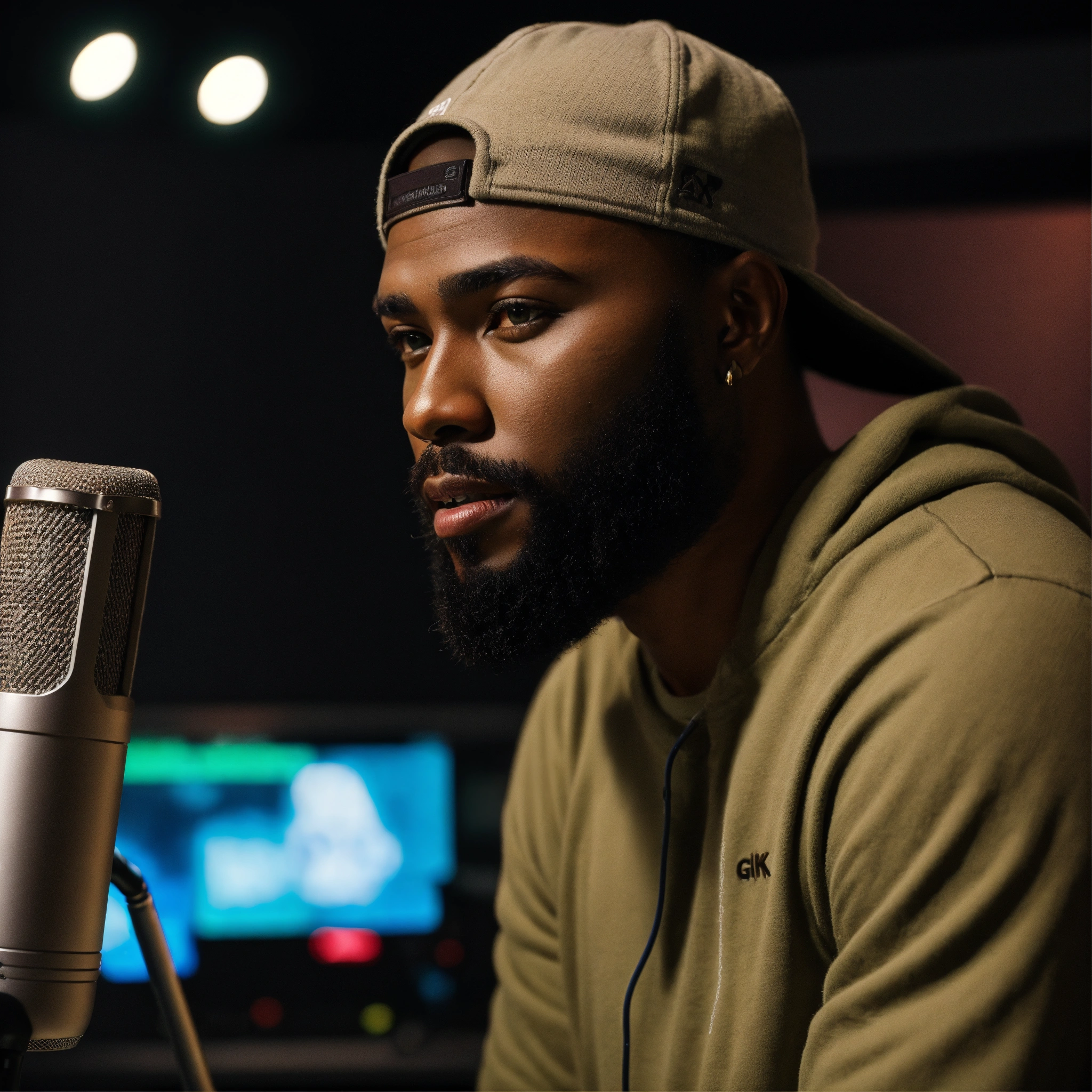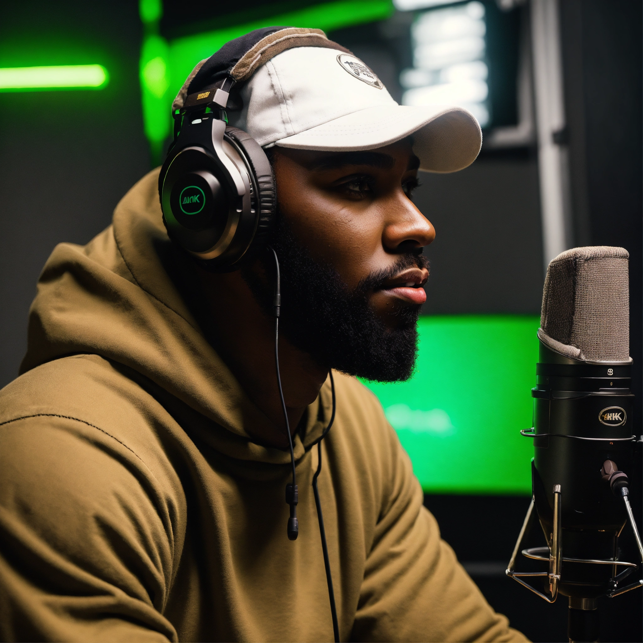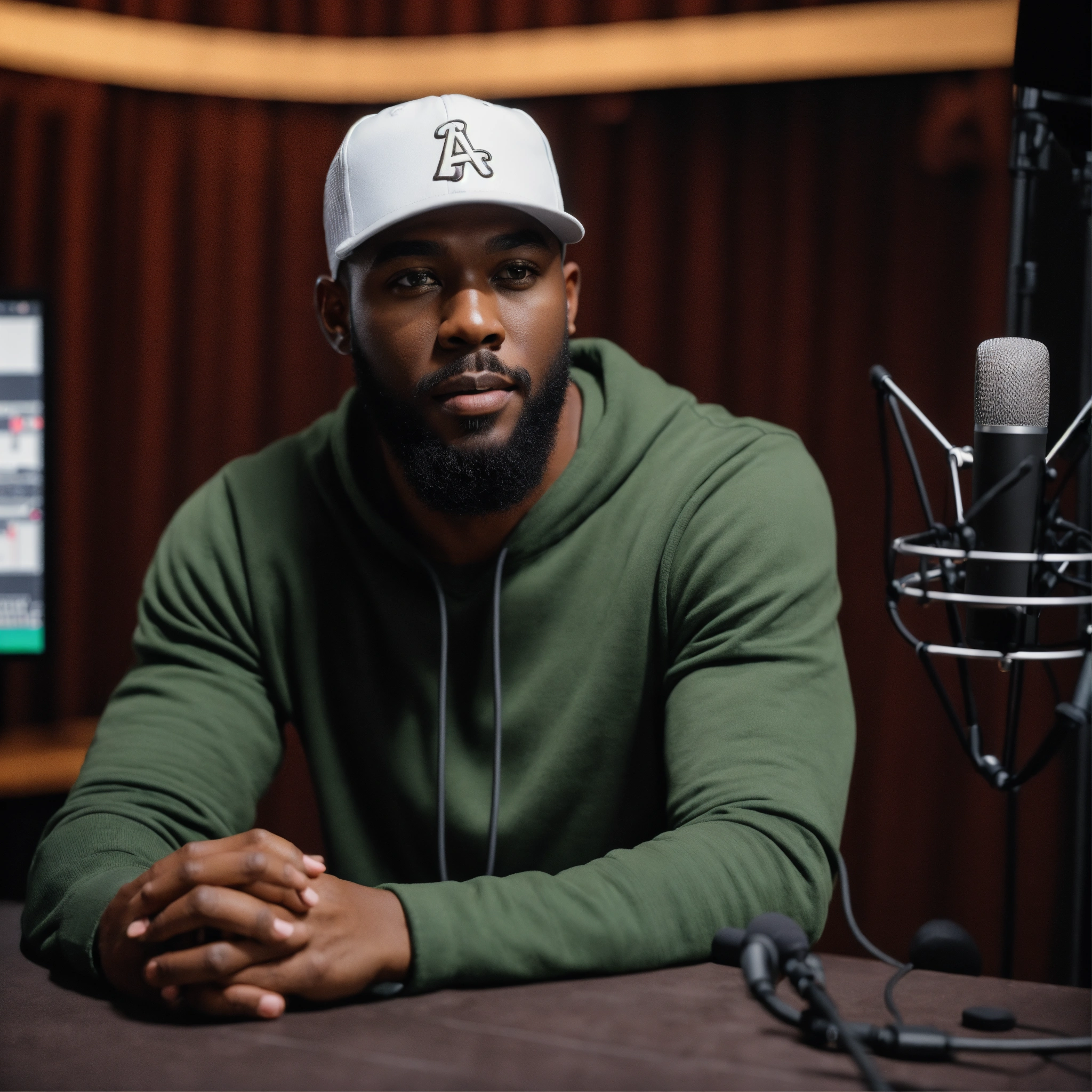 Real photo of a gugu e michaels chocolate dark skin tone handsome black man with beard, bald with white cap, talking into a mic with a short mic stand at a podcast studio, in a very large fancy studio, wearing long sleeve to the writst green sweat shirt and white atlanta sun visor, black jeans, very realistic, ultimate detail, 8k, face front looking straight into the camera, 8k, expensive recording studio with dark brown background, extreme detail, cinematic lighting, face front, brown eyes looking at camera.