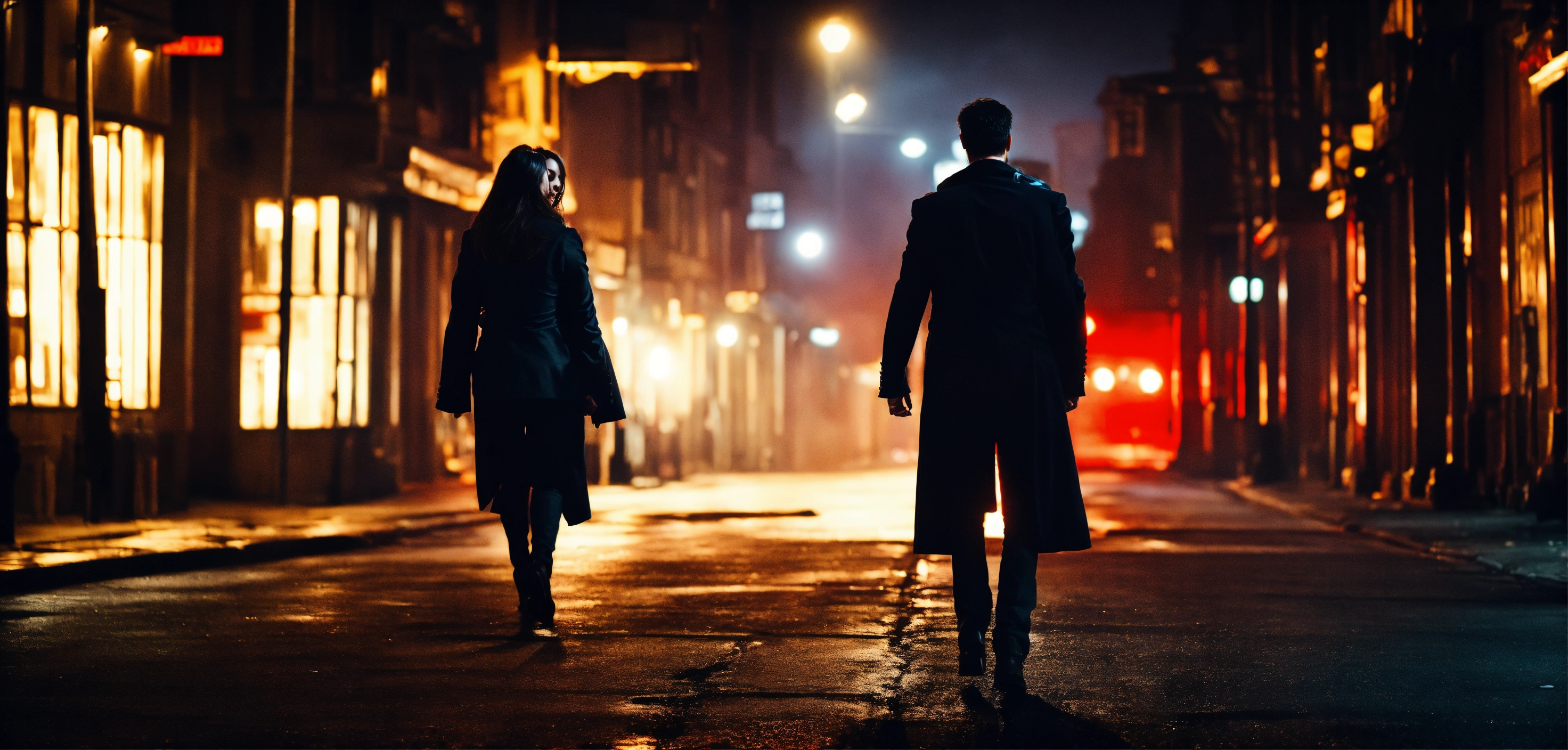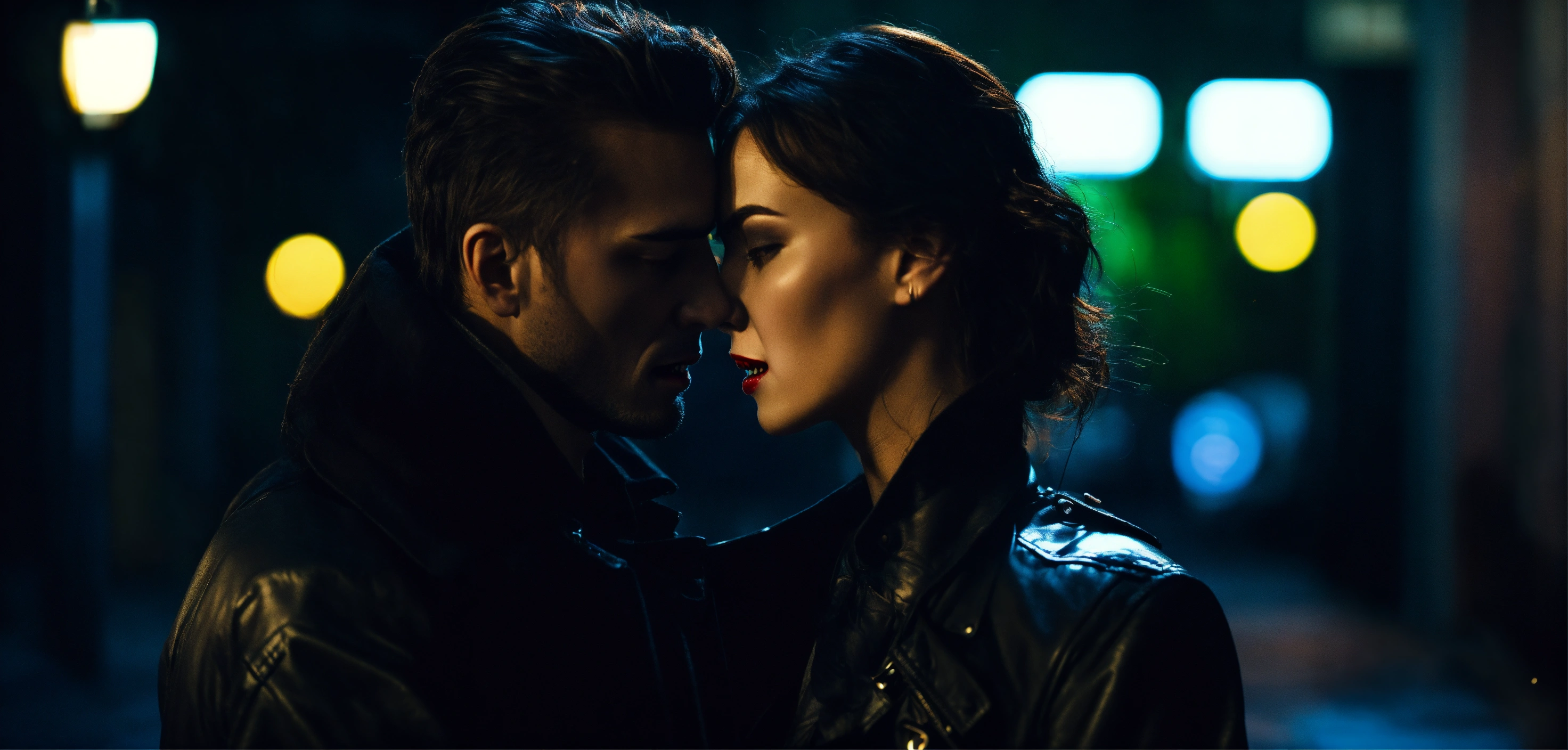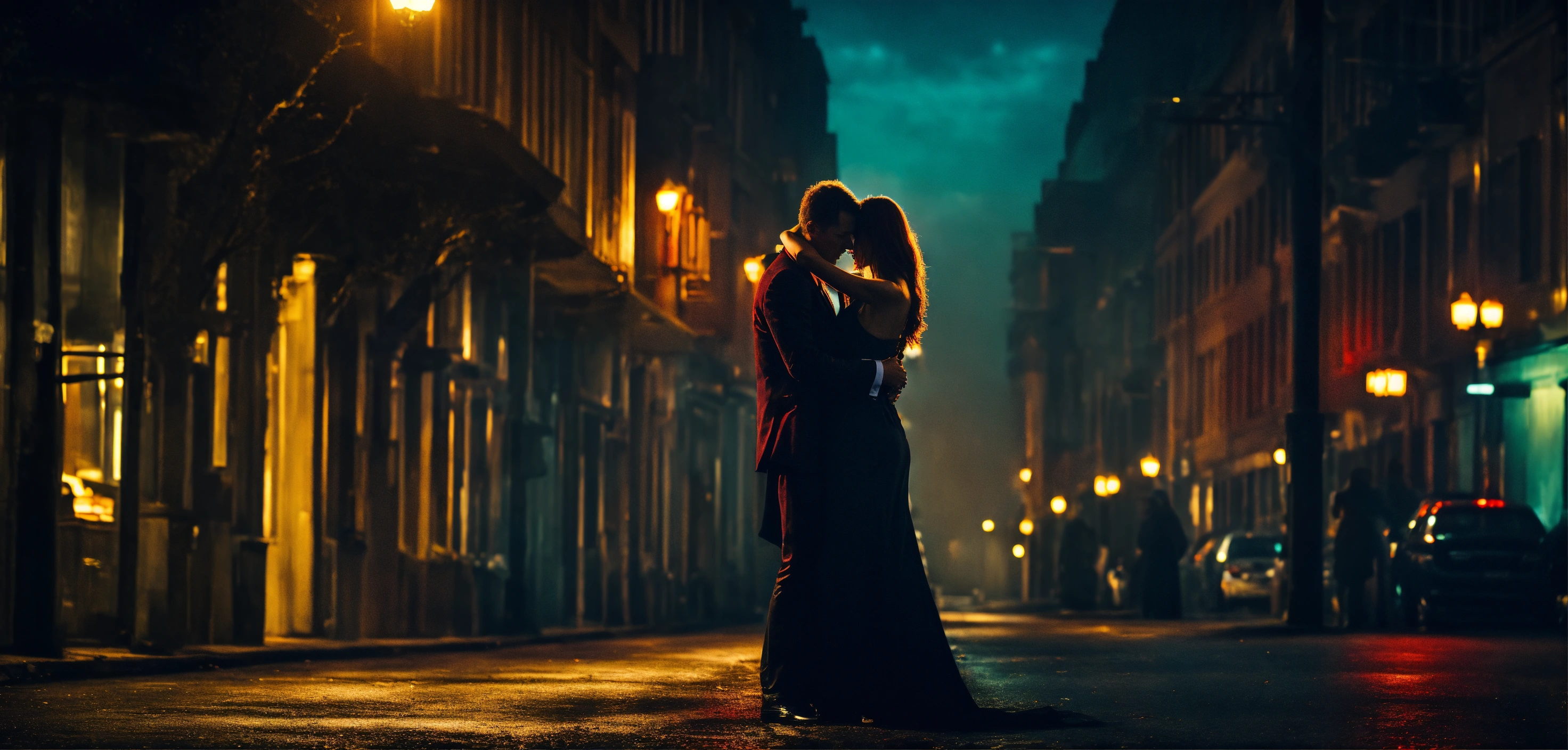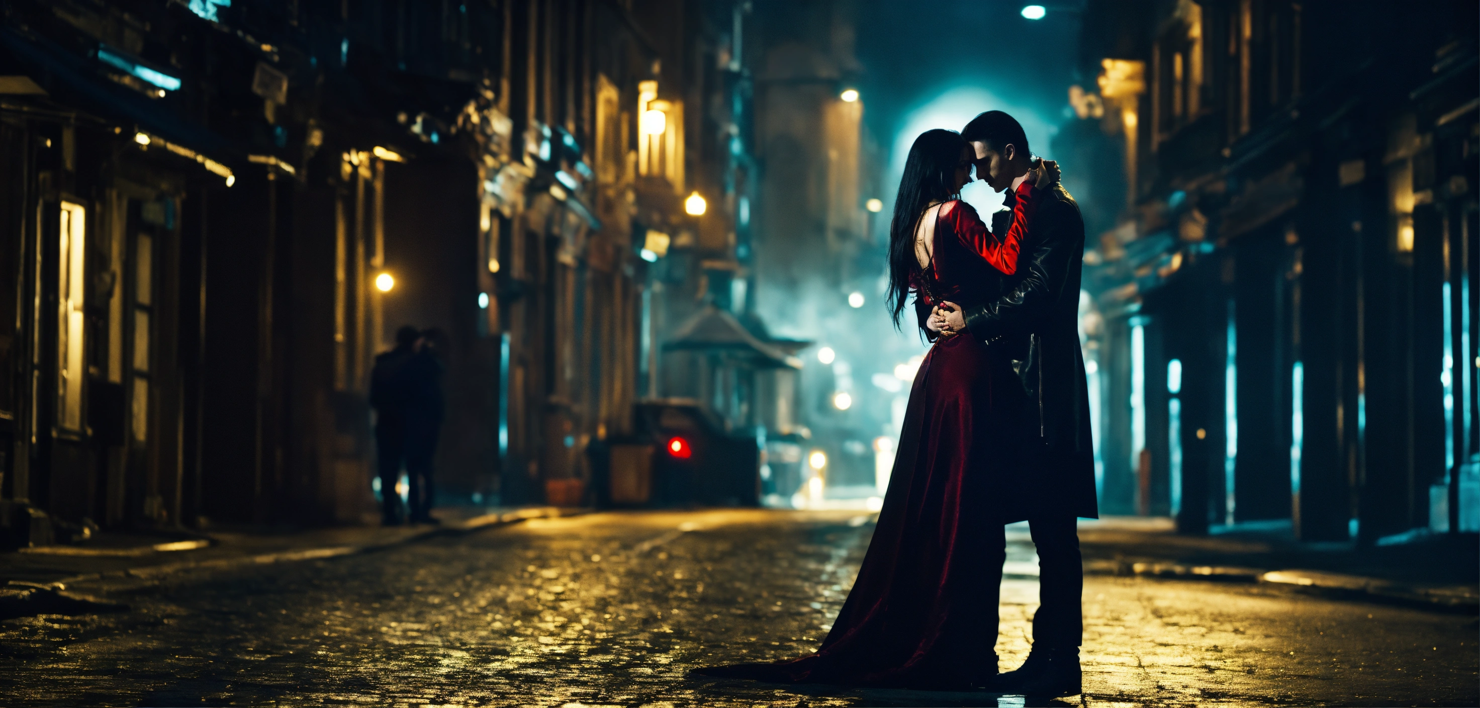 Cinematic look, dark urban city street by night, dim light, vampire passionate hug man and woman, underworld vampire movie style