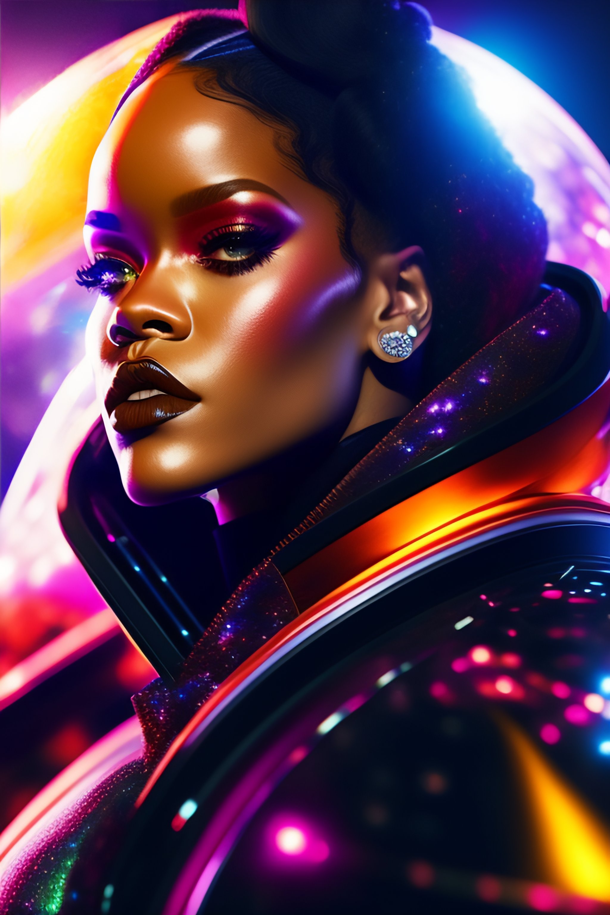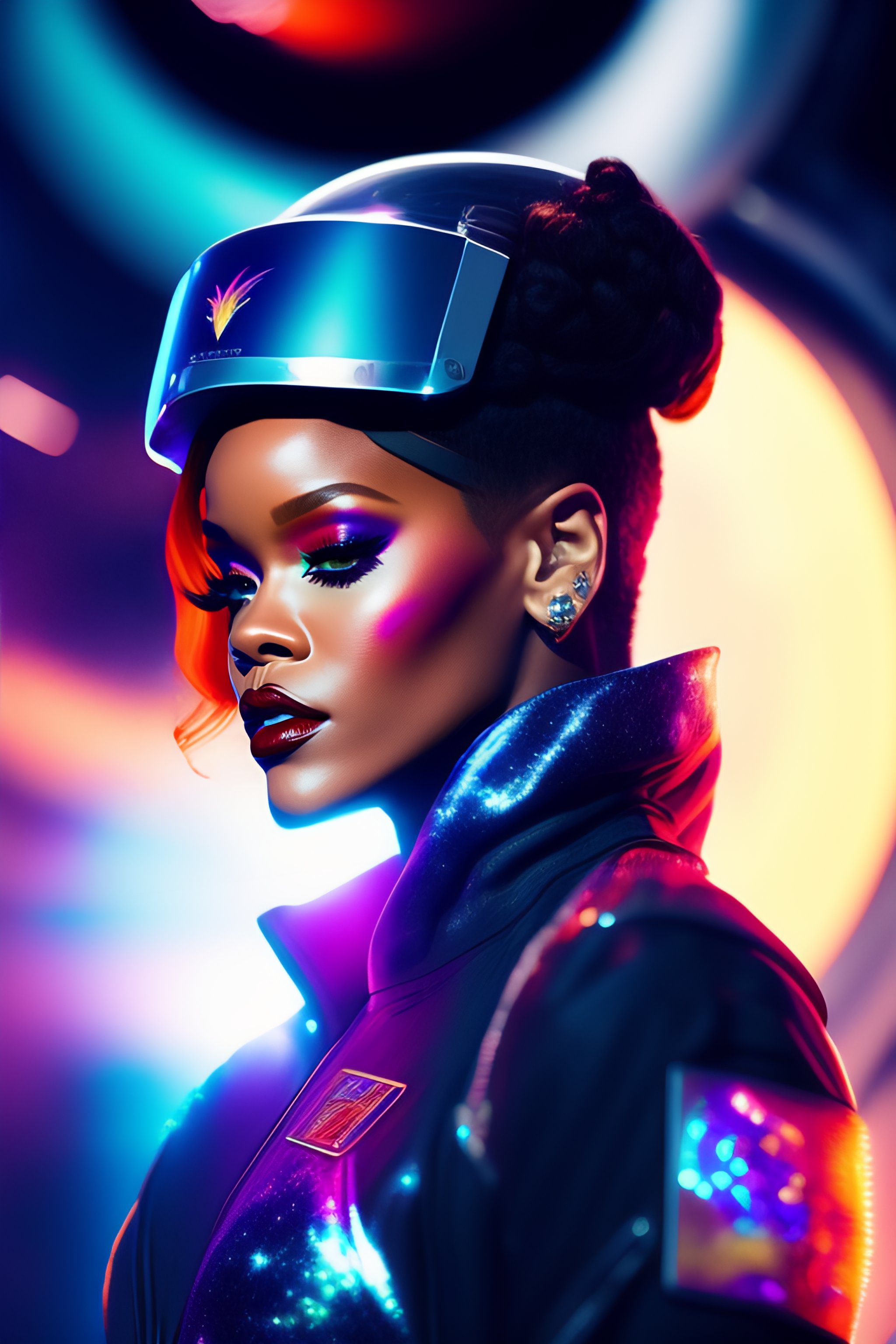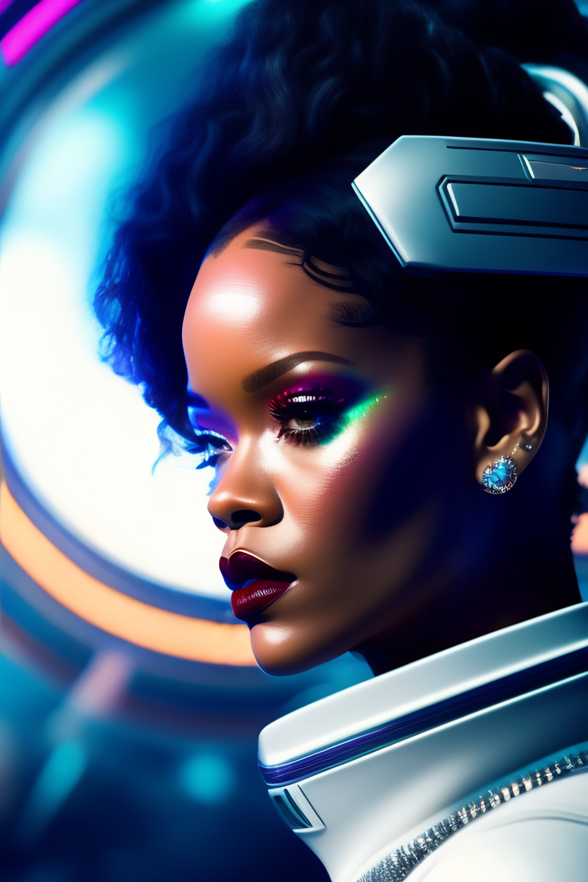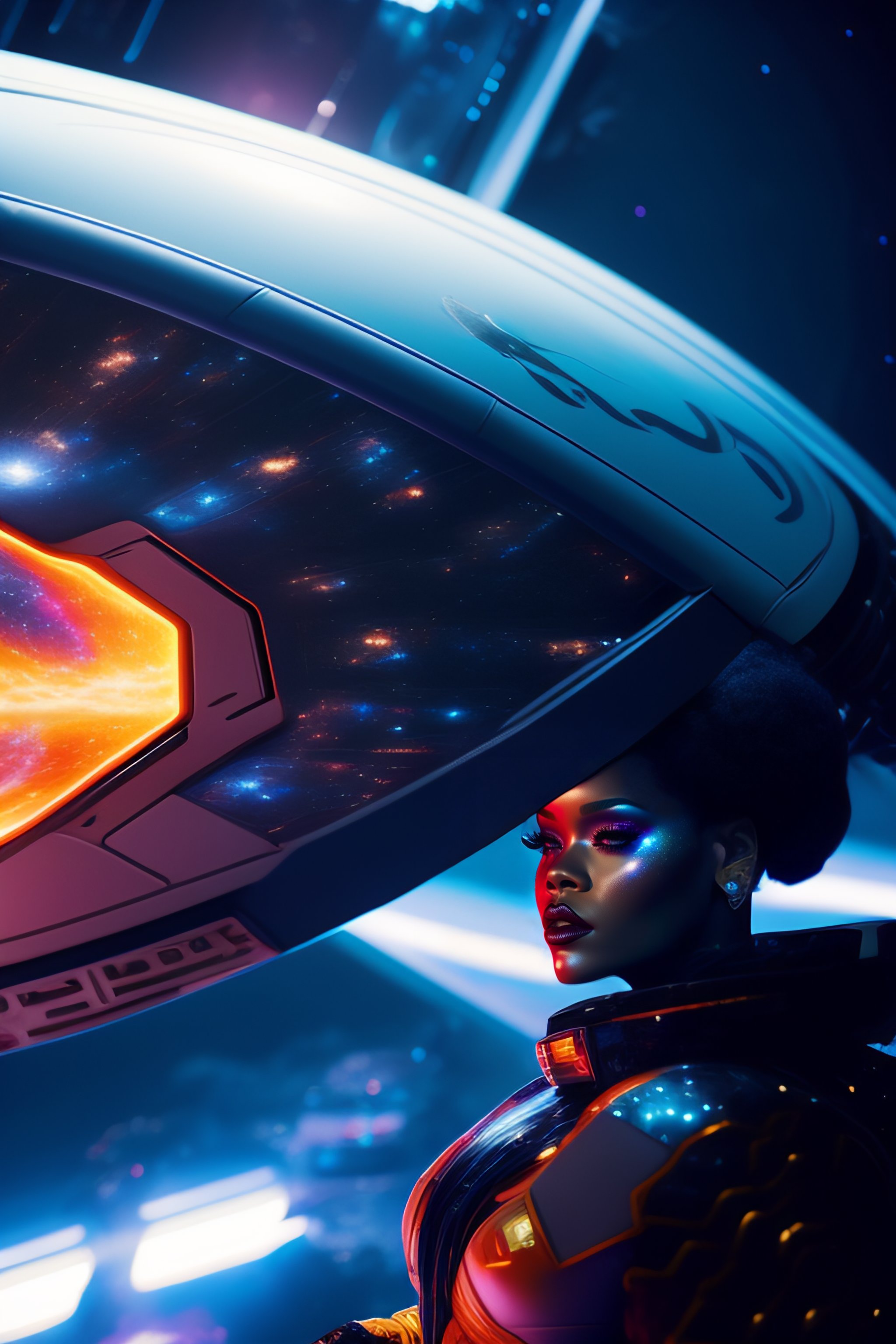 Rihanna fenty, the singer, rapper, is in space flying a high-tech futuristic fighter craft in the style of halo, the background is of space glamorous swirling galaxies and stars and nebulous she's in a high-tech cockpit with holographic or displays that she punches in coordinates