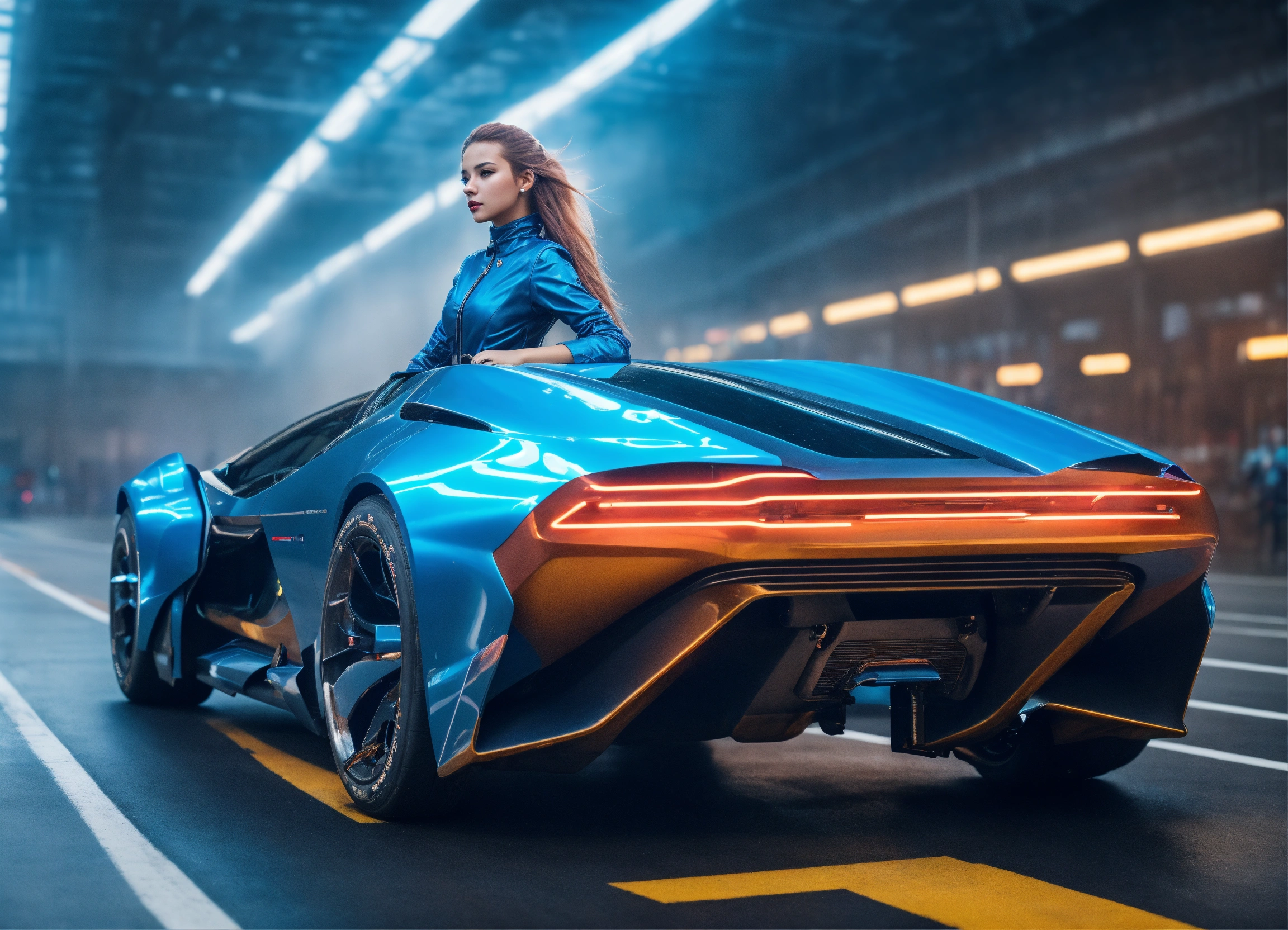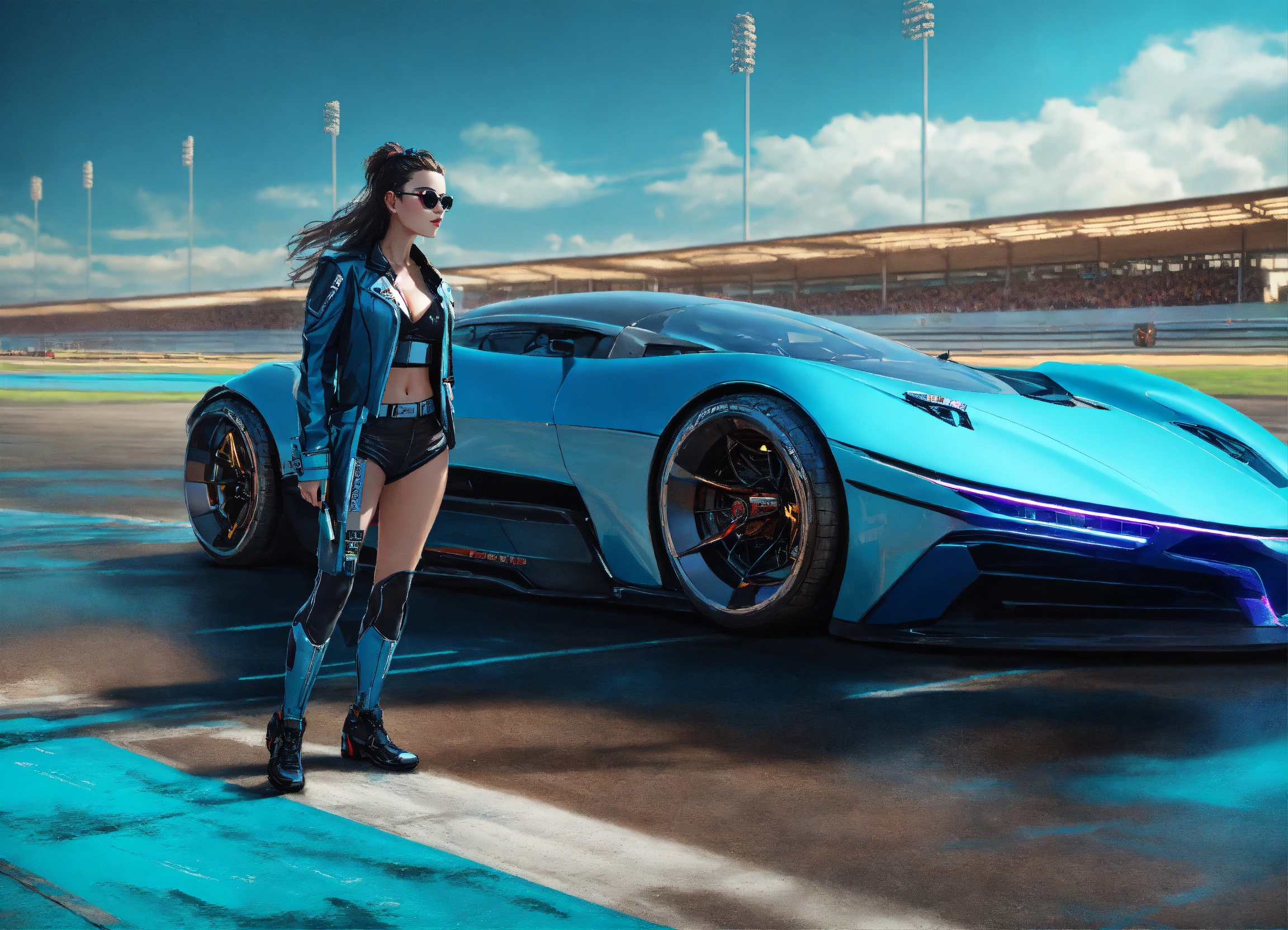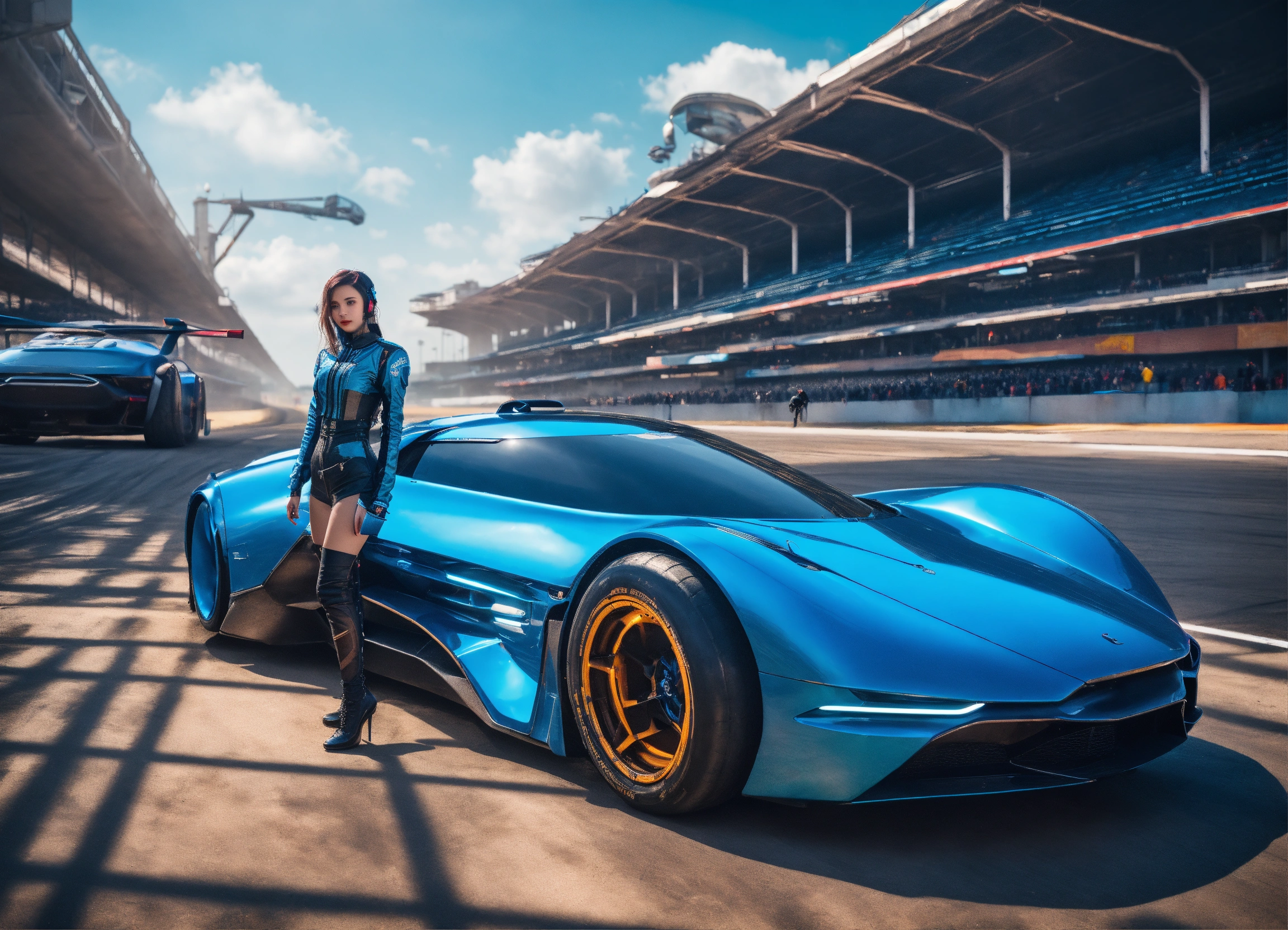 High detailed photo realistic natural photo cyberpunk dream girl, futuristic flying car in the background, at the racetrack, metalic blue