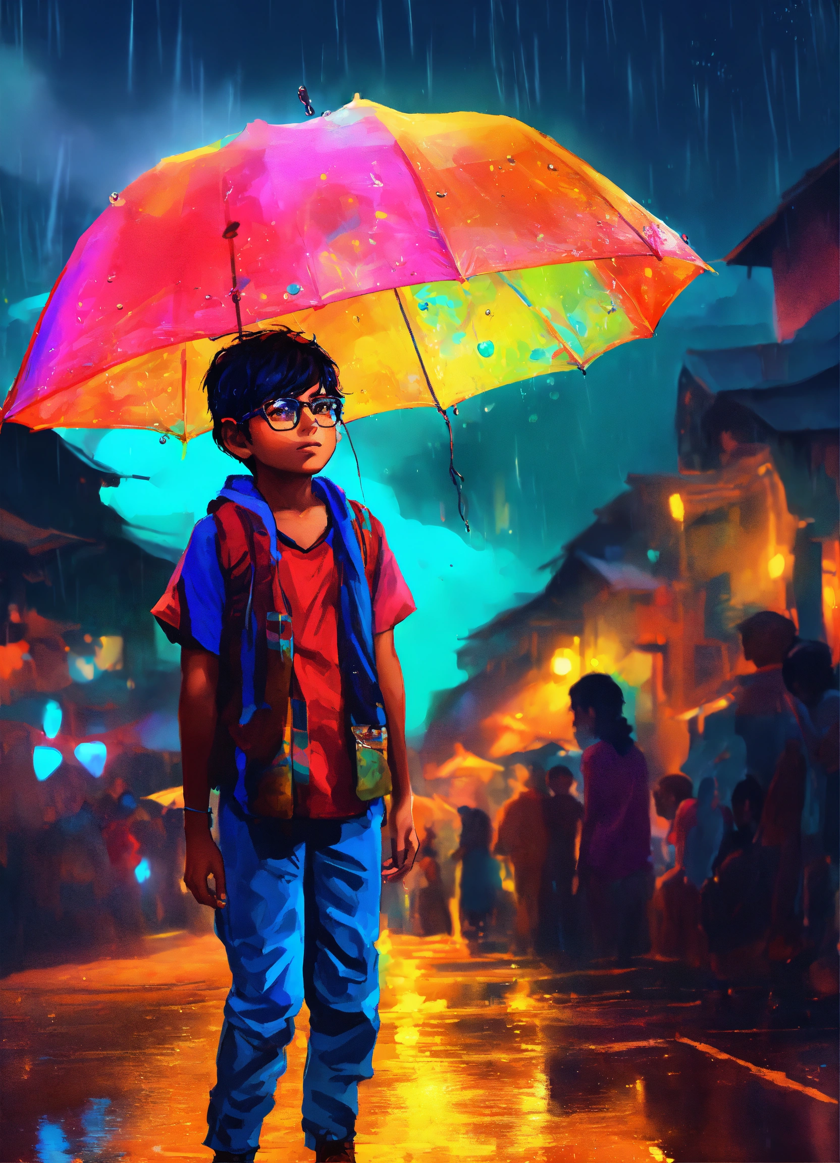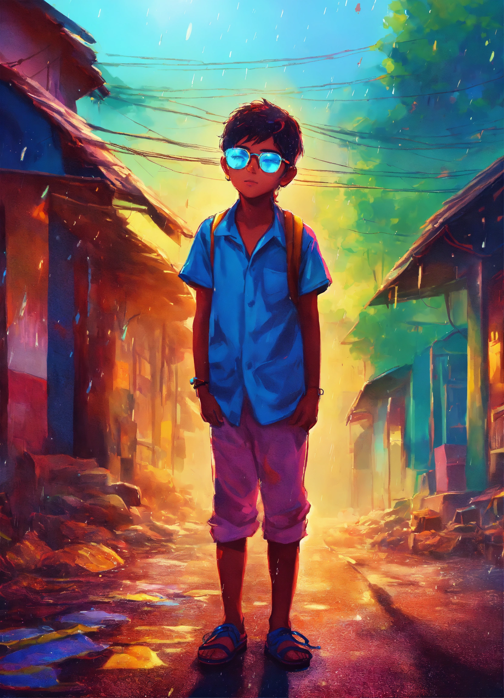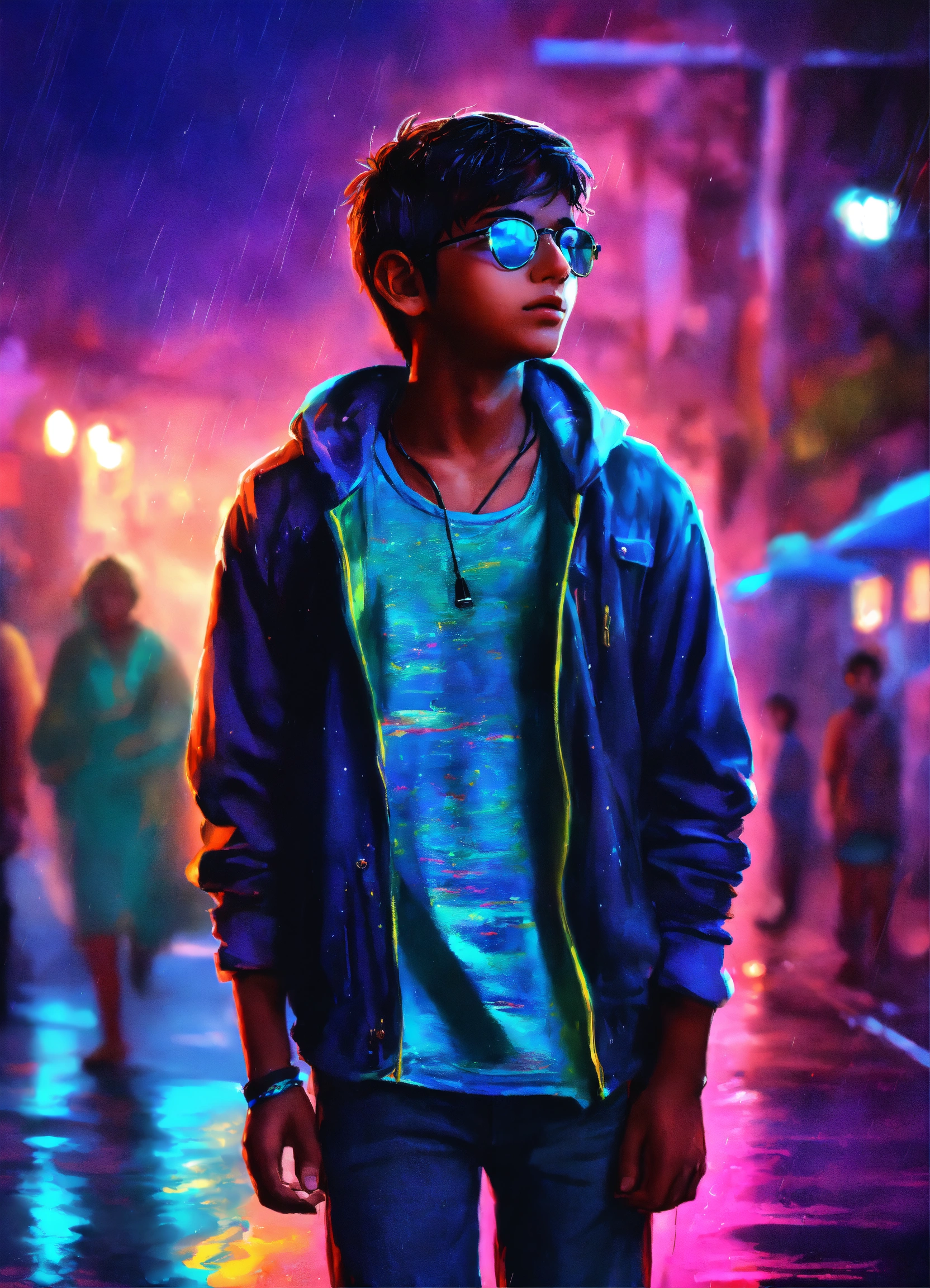 An indian boy standing on a busy village road, he is in love with a girl, he imagines his girl as a drop of rain falling on his glasses, fantasy, digital painting with neon shades, he imagines the girl as a drop of rain falling on his glasses, he is feeling loved, village setup, crowd behind the boy, girls expression, boys expression