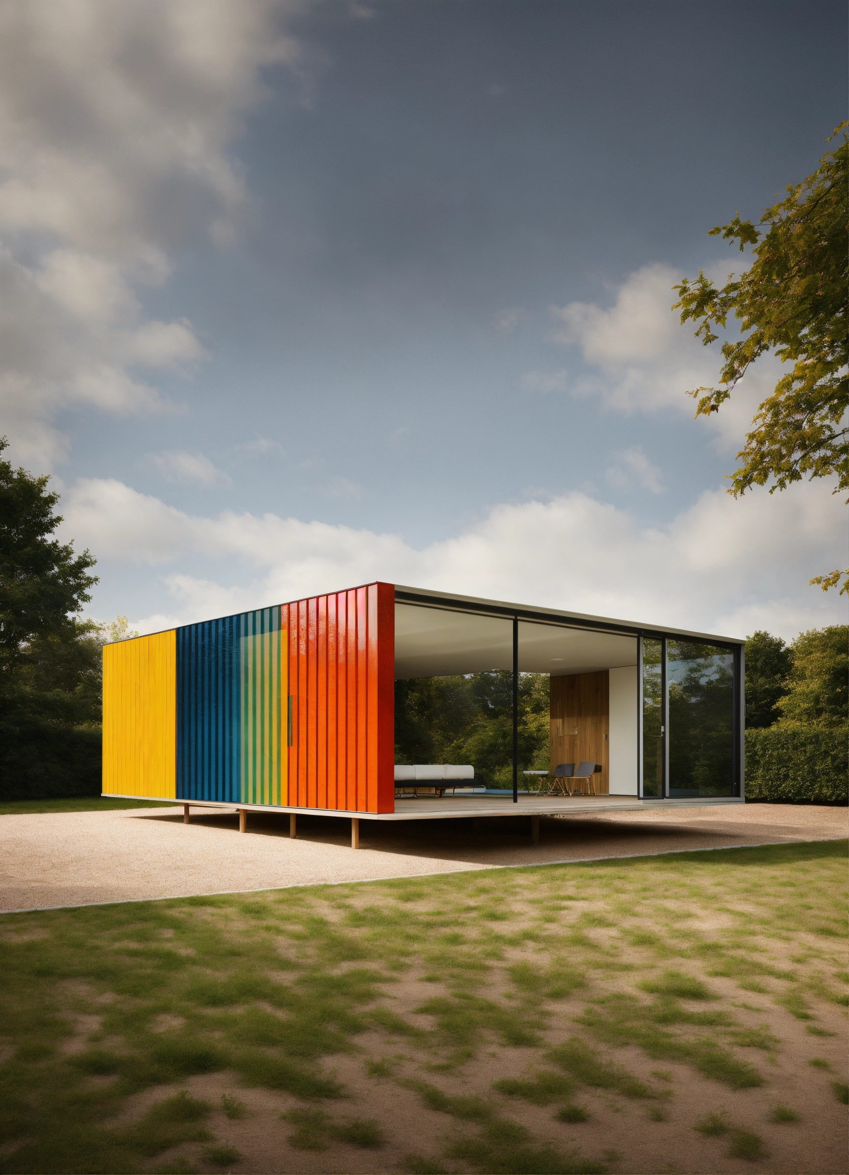 Mies van der rohe minimalist colorful plastic and wood house photorealistic from the front