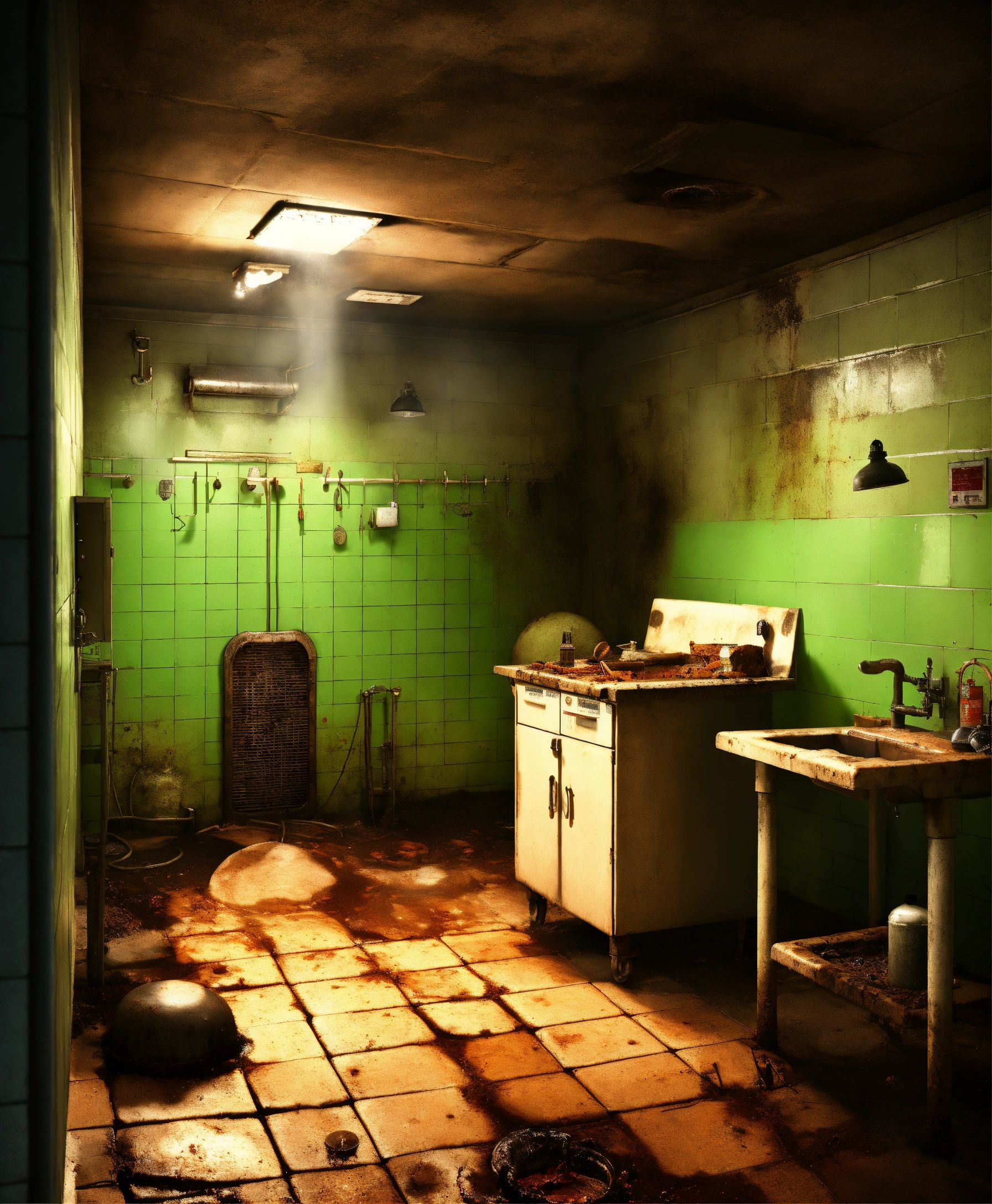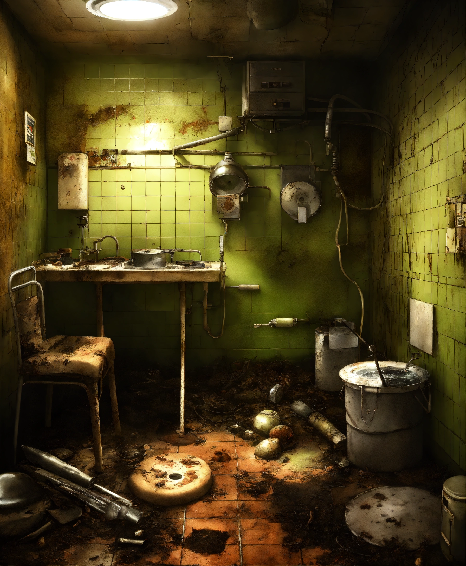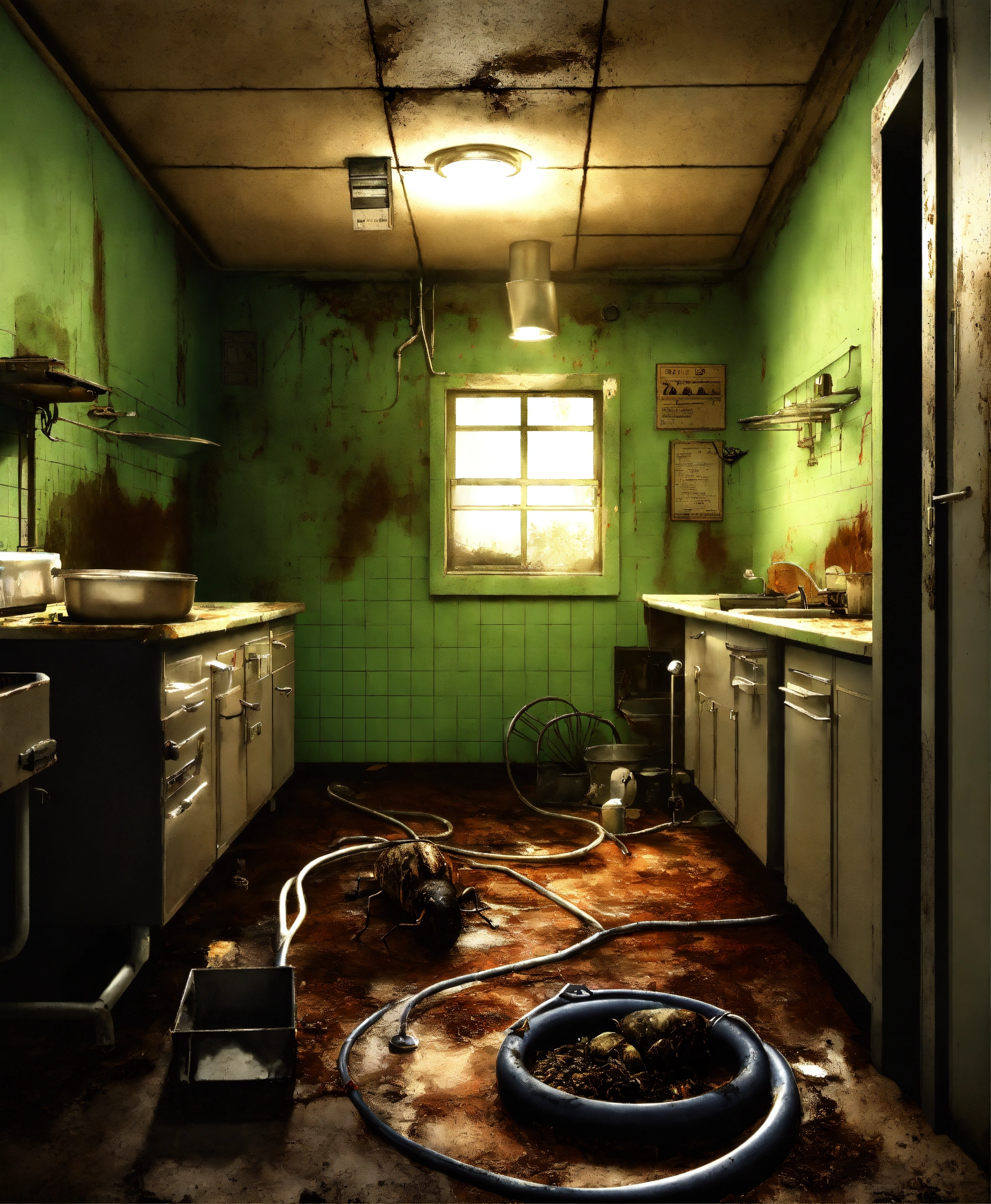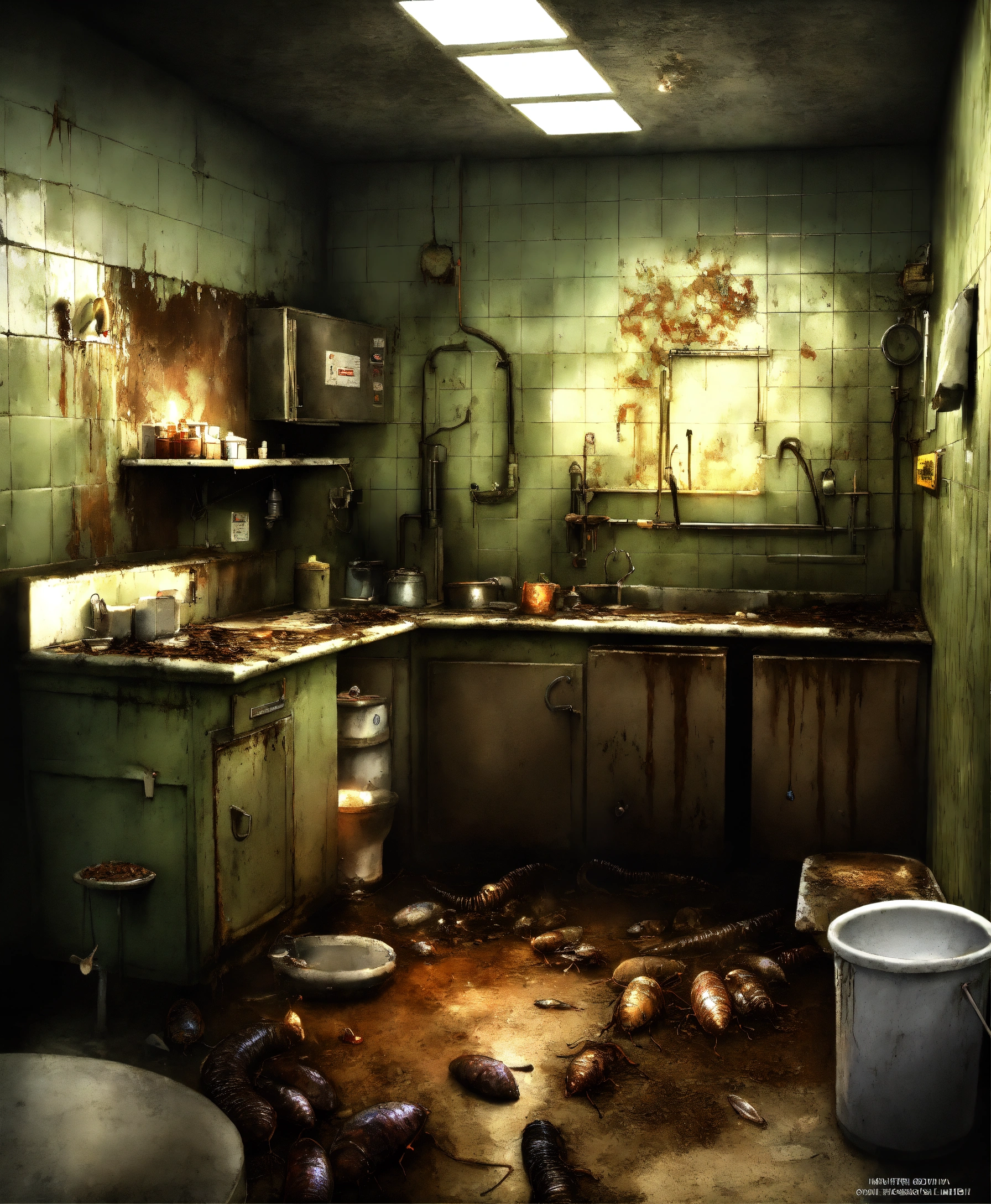 Photo realistic, eery, dark, moldy, criminal nurse ghost, steel kitchen, swampy, skin disease, fungus, broken tiles shiny, insects, rust, dust, public hospital sergeant room operations er, drain, manhole, bacteria, sewer, moths, surgical instruments, cockroaches, light bulbs, dungeon, worms