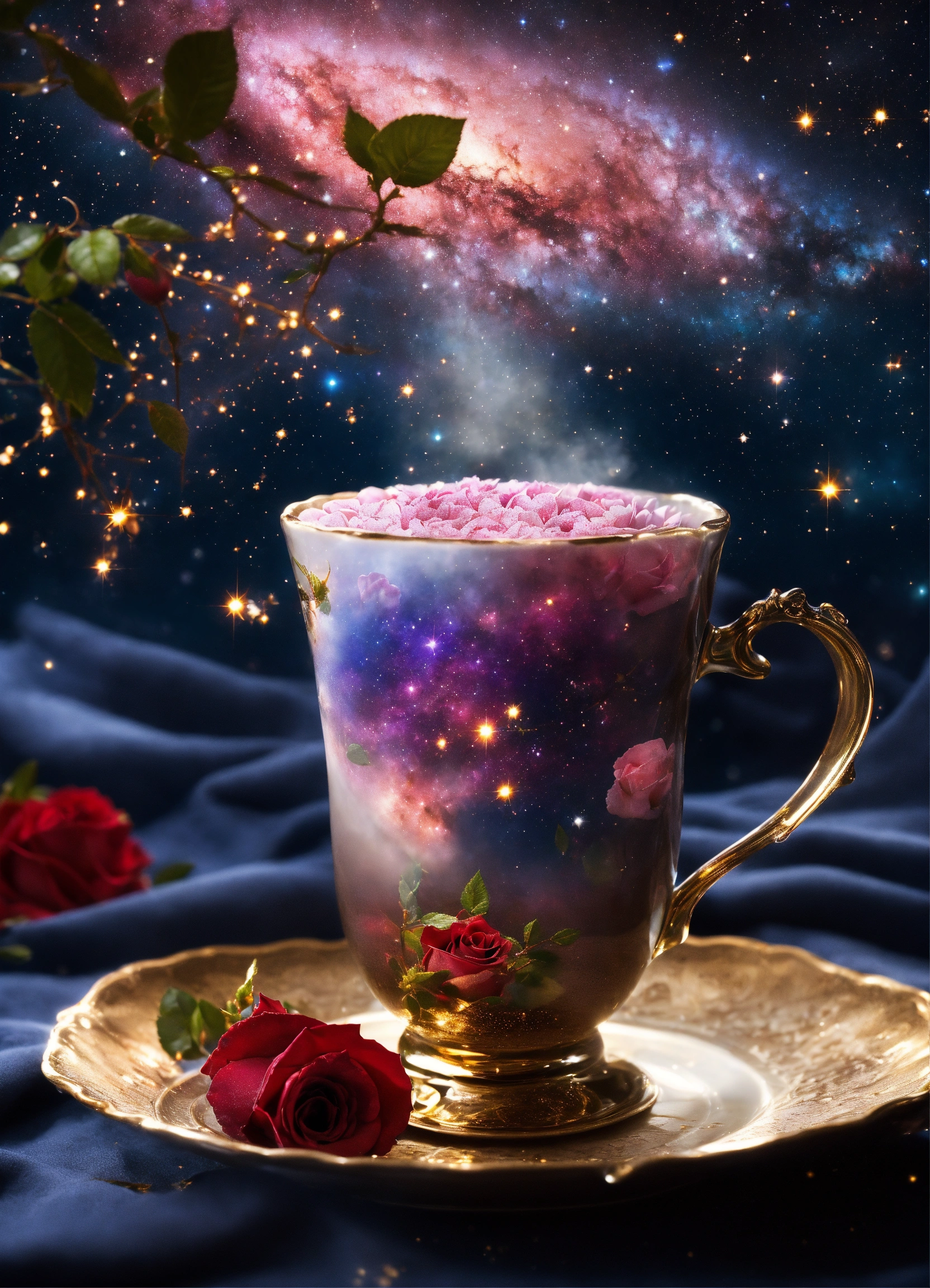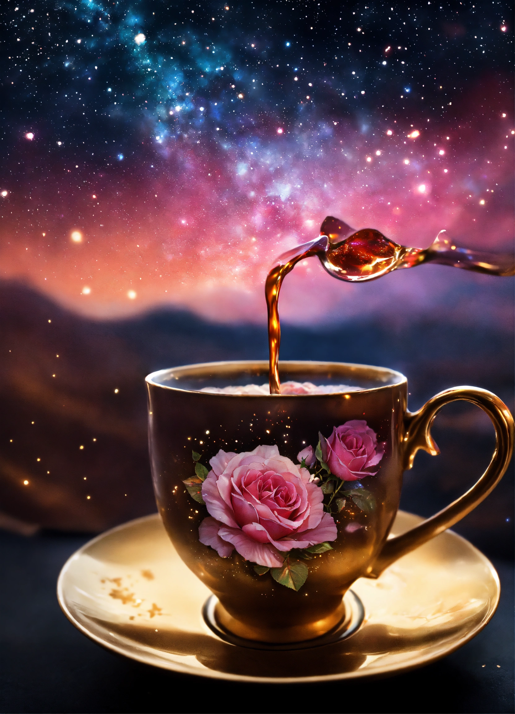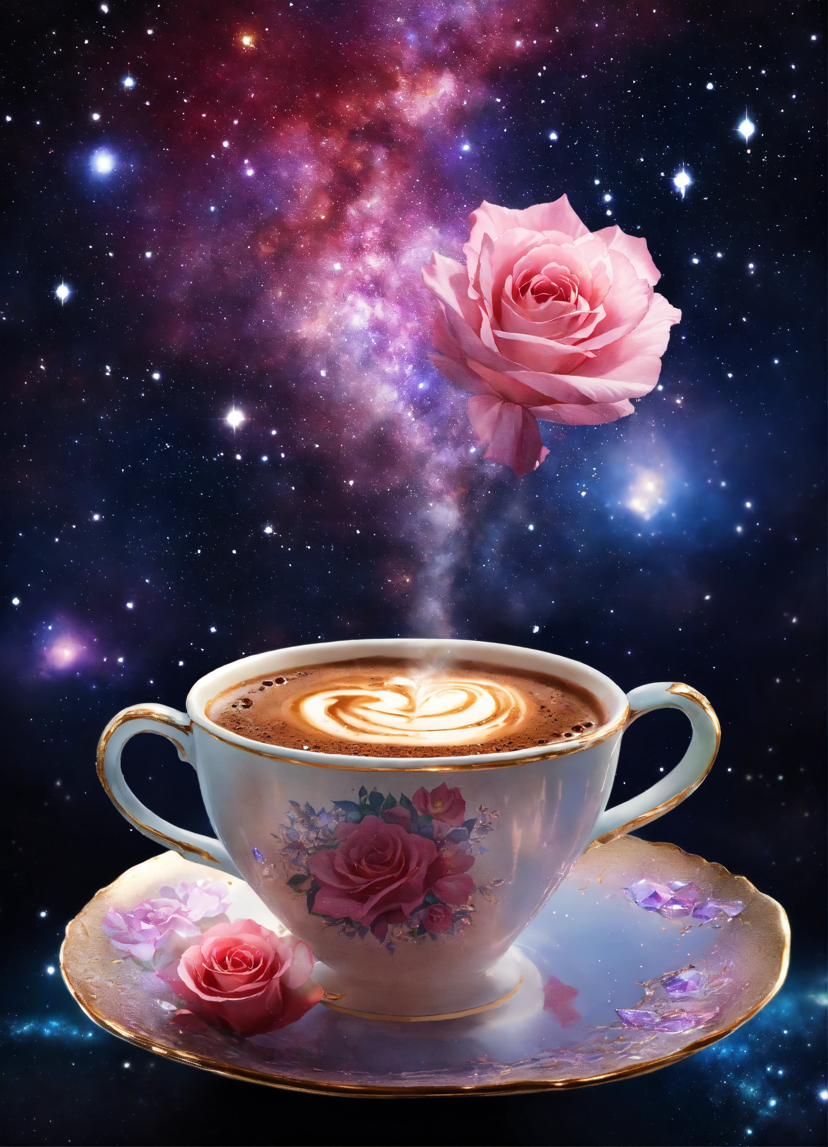 Flora, a beautiful crystal cup of coffee, coffee is pouring out of the cup onto a saucer and steam is coming, around there are delicate, very beautiful and elegant flowers in delicate tones - roses, all this against the backdrop of the night sky with glowing stars, the galaxy and the andromeda nebula
