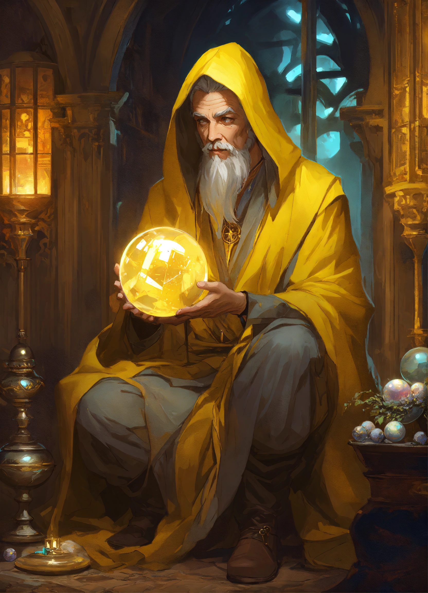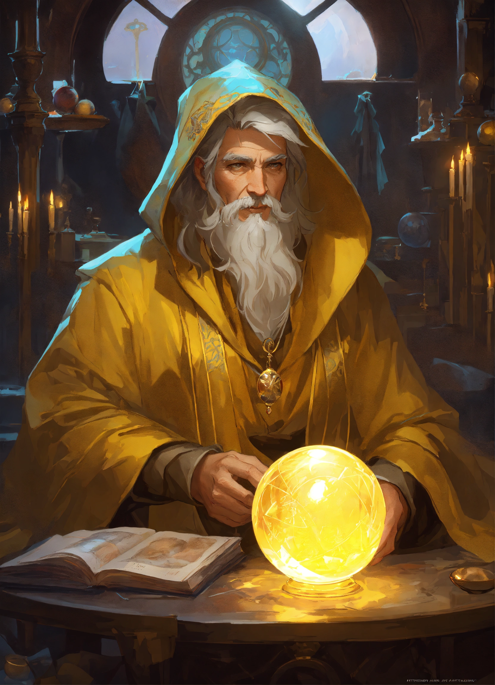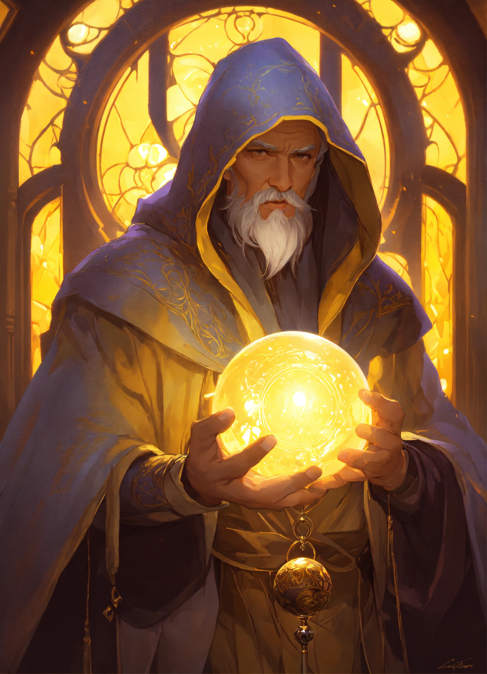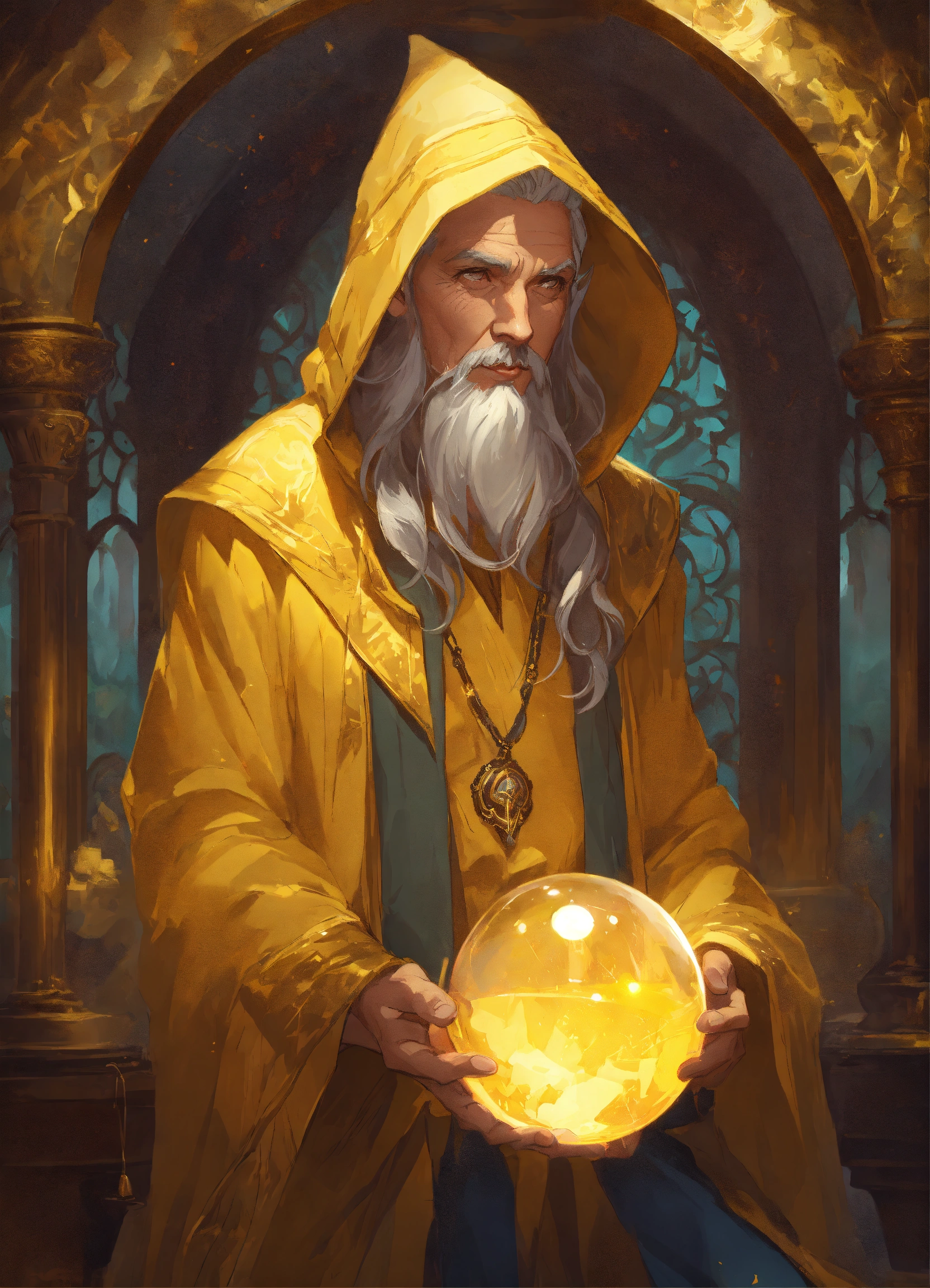 Hooded old aged male mage future seer witch adivination room crystal ball, dark yellow clothes, gray hair, old aged, art by artgerm and greg rutkowski and alphonse mucha and loish and wlop, artstation, illustration