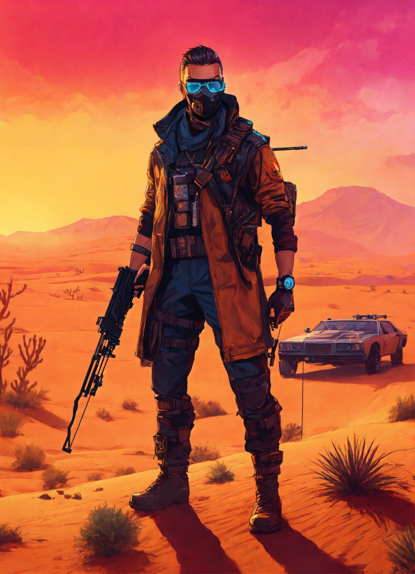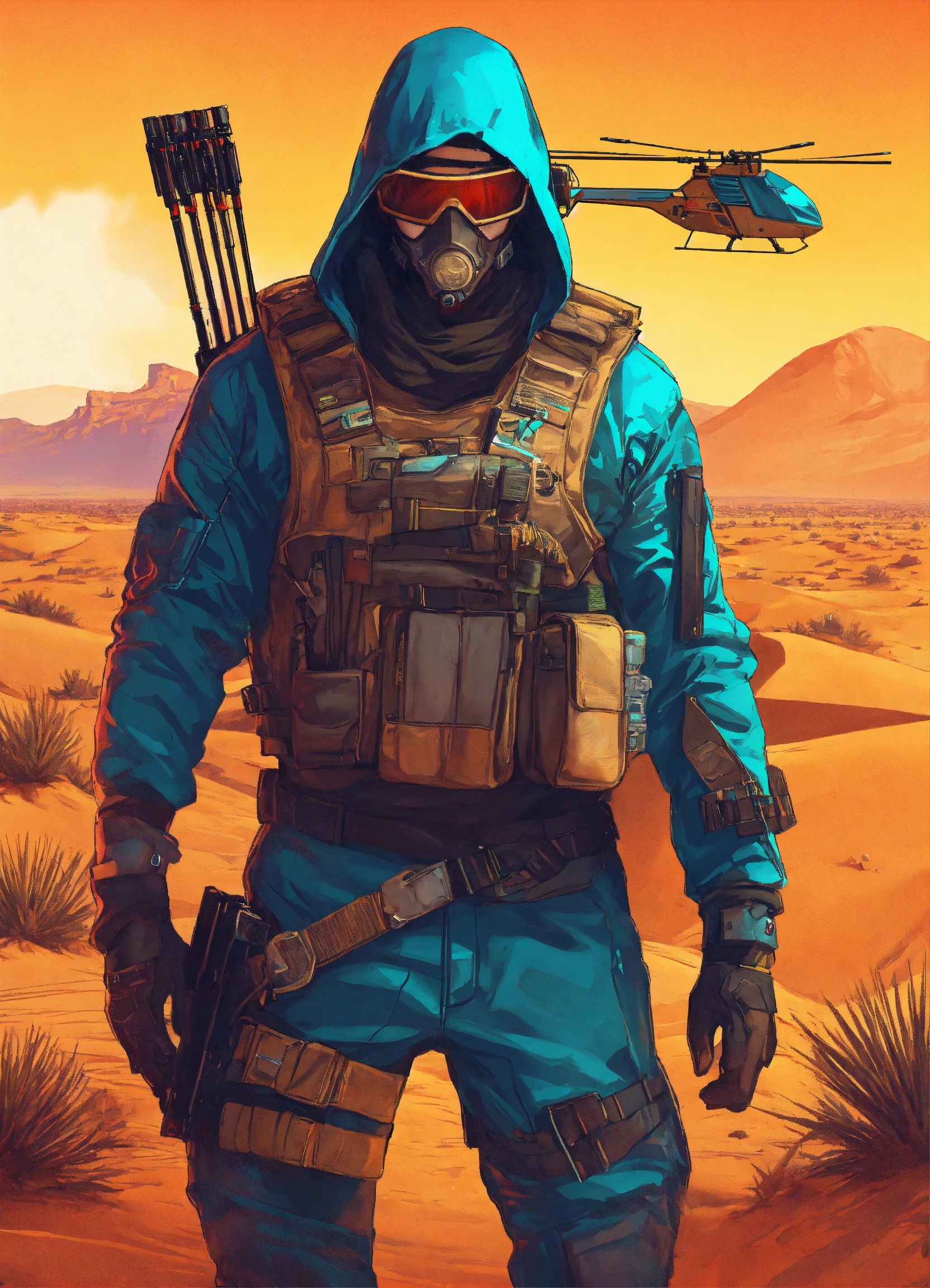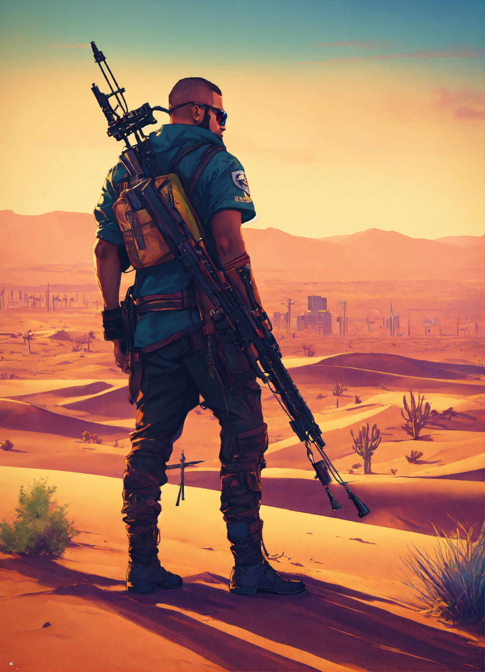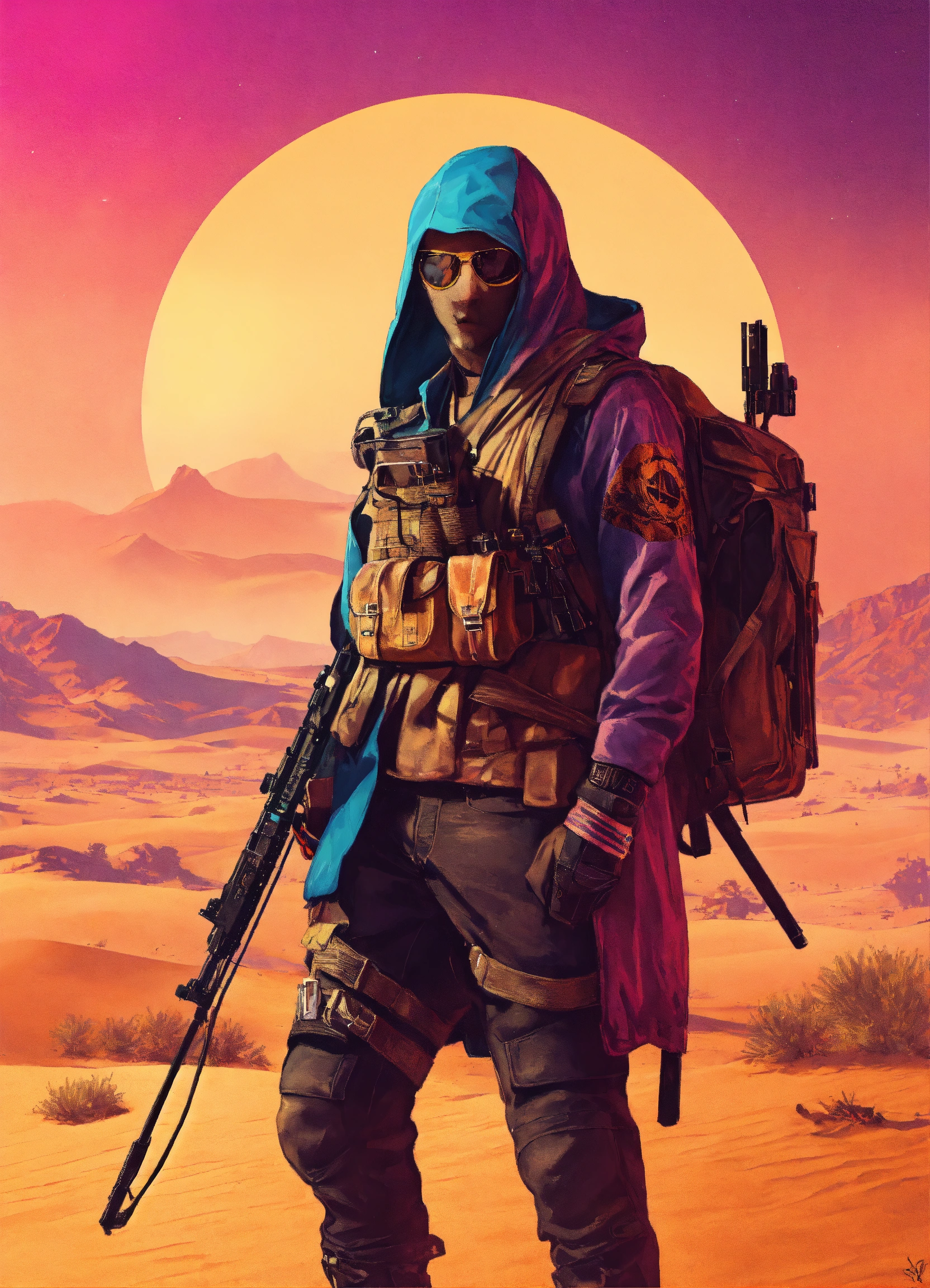 Dangerous cyberpunk nomad with cross bow in desert gta poster style art