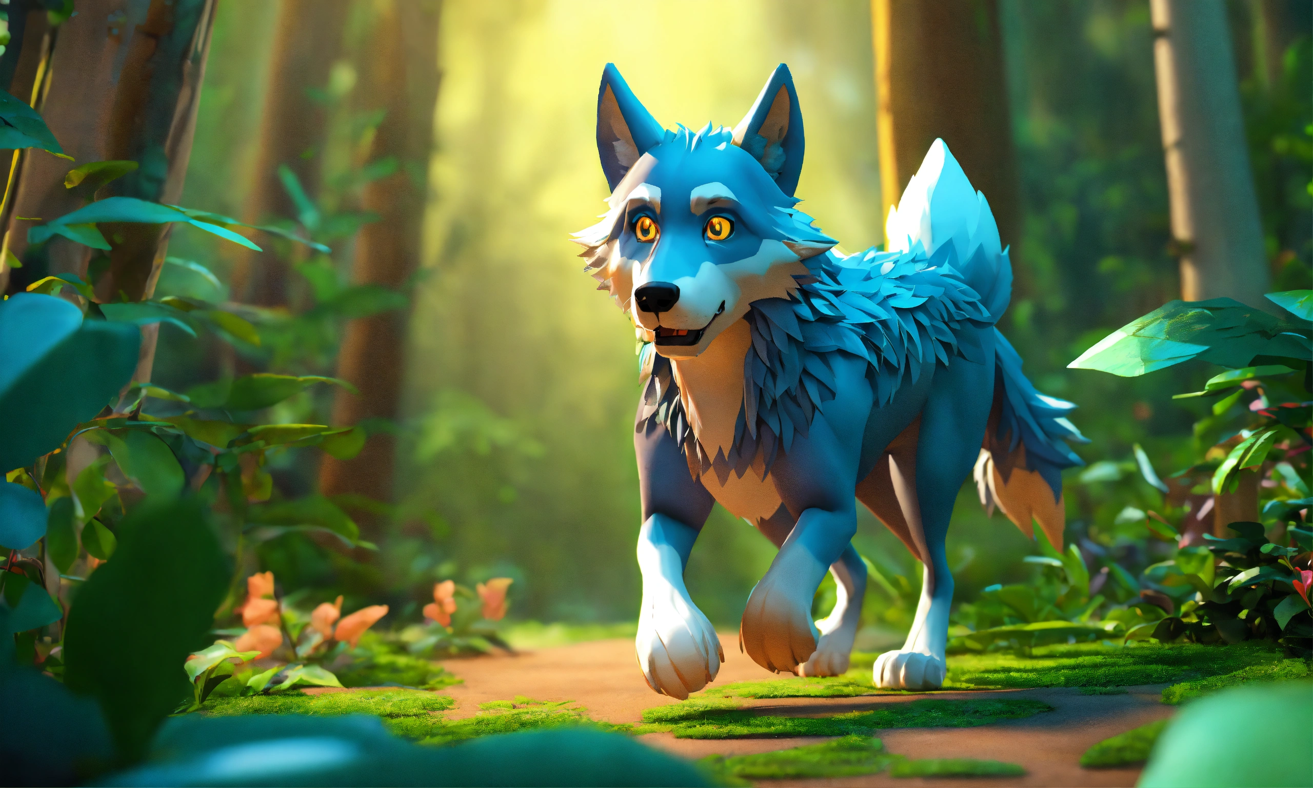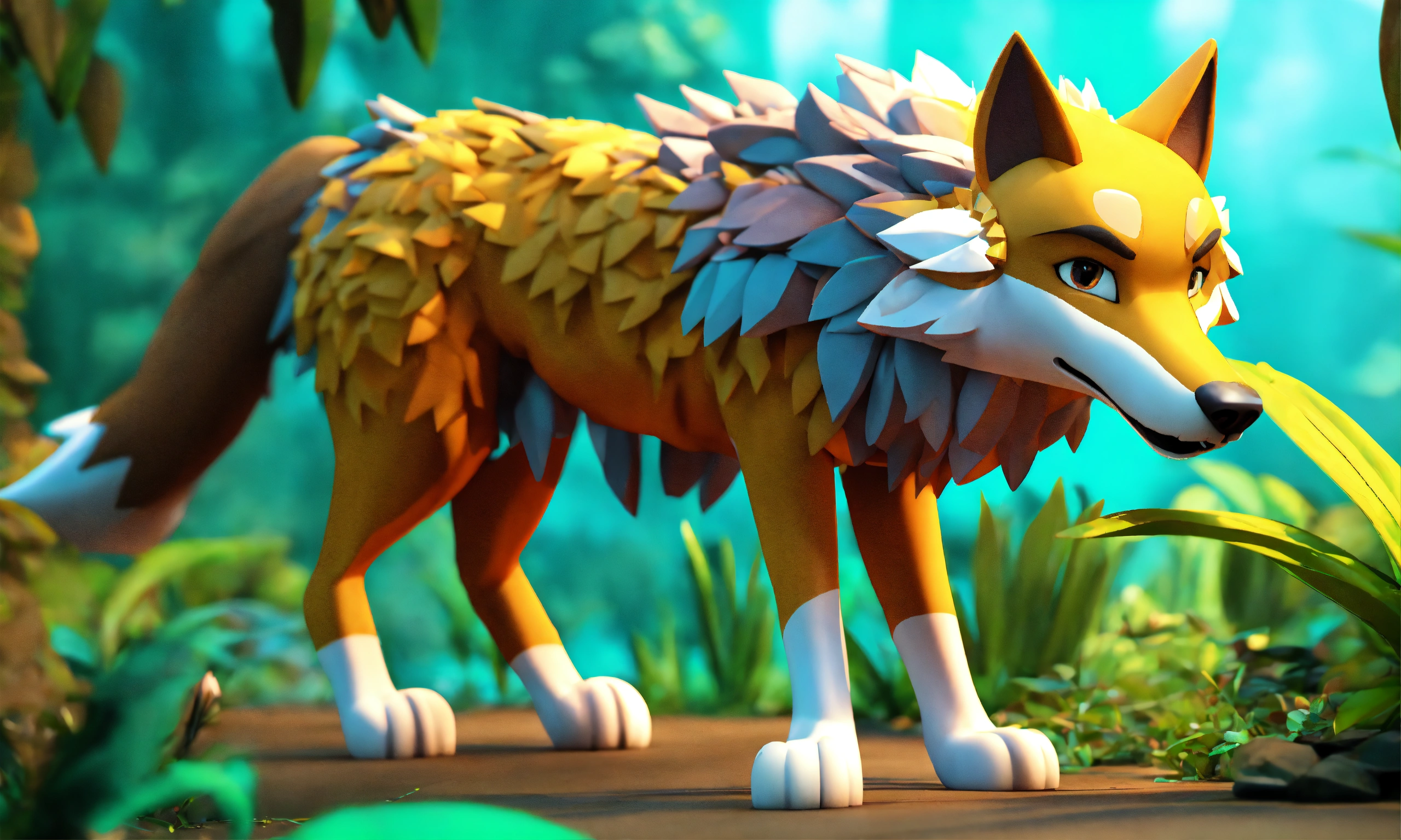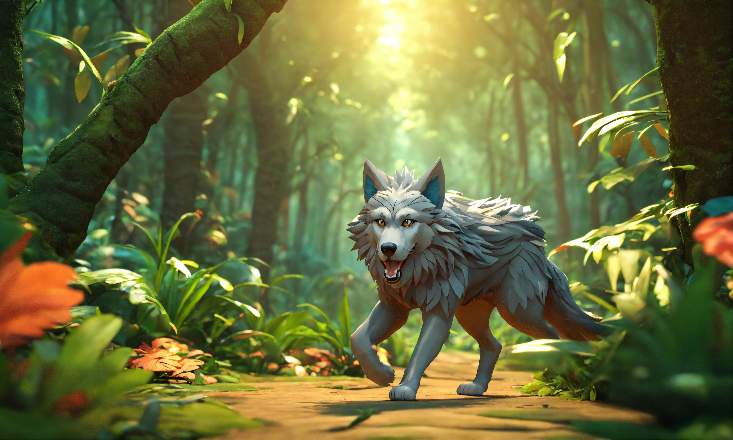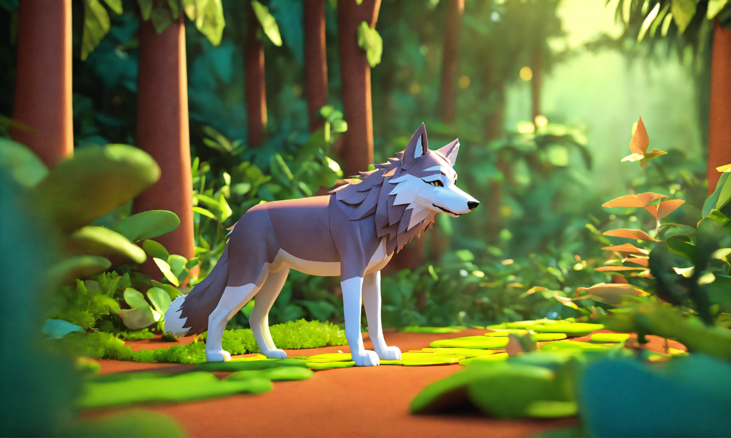 Cartoon 3d style wolf walking in jungle
