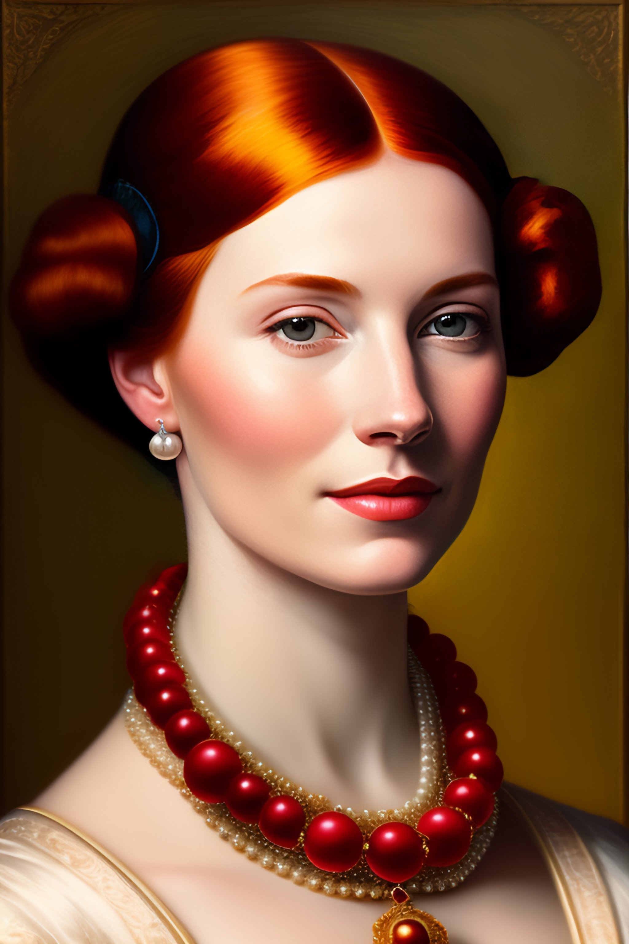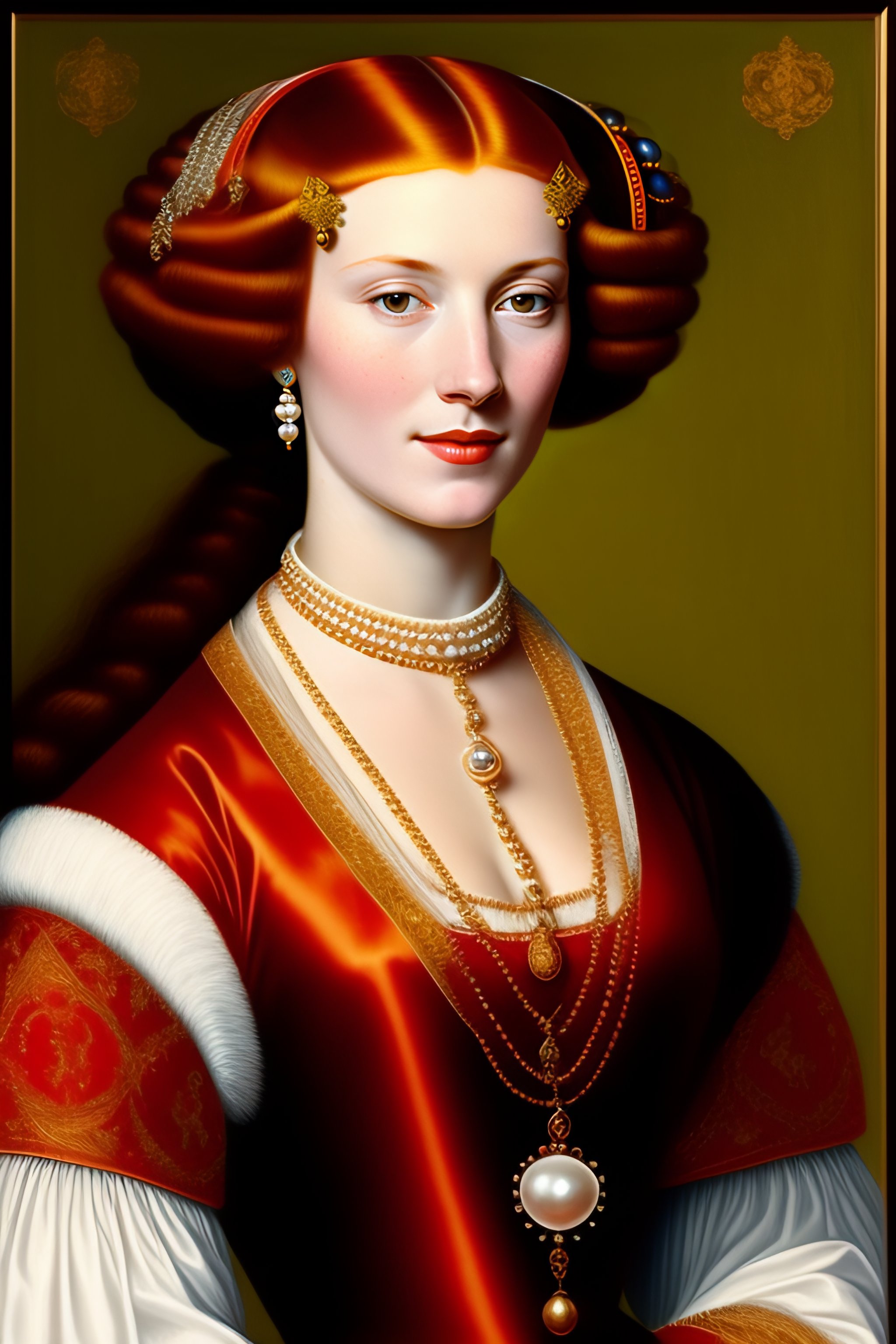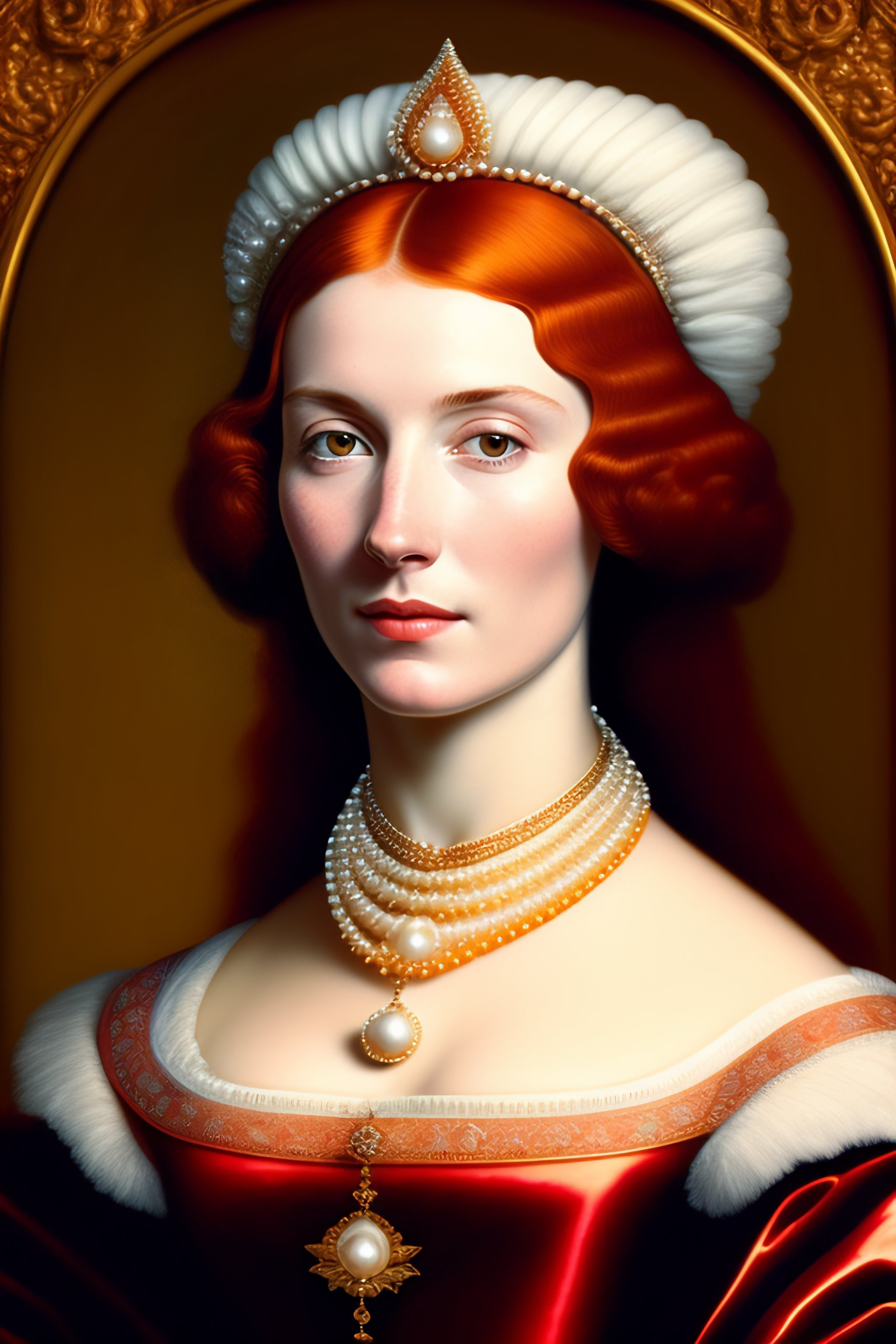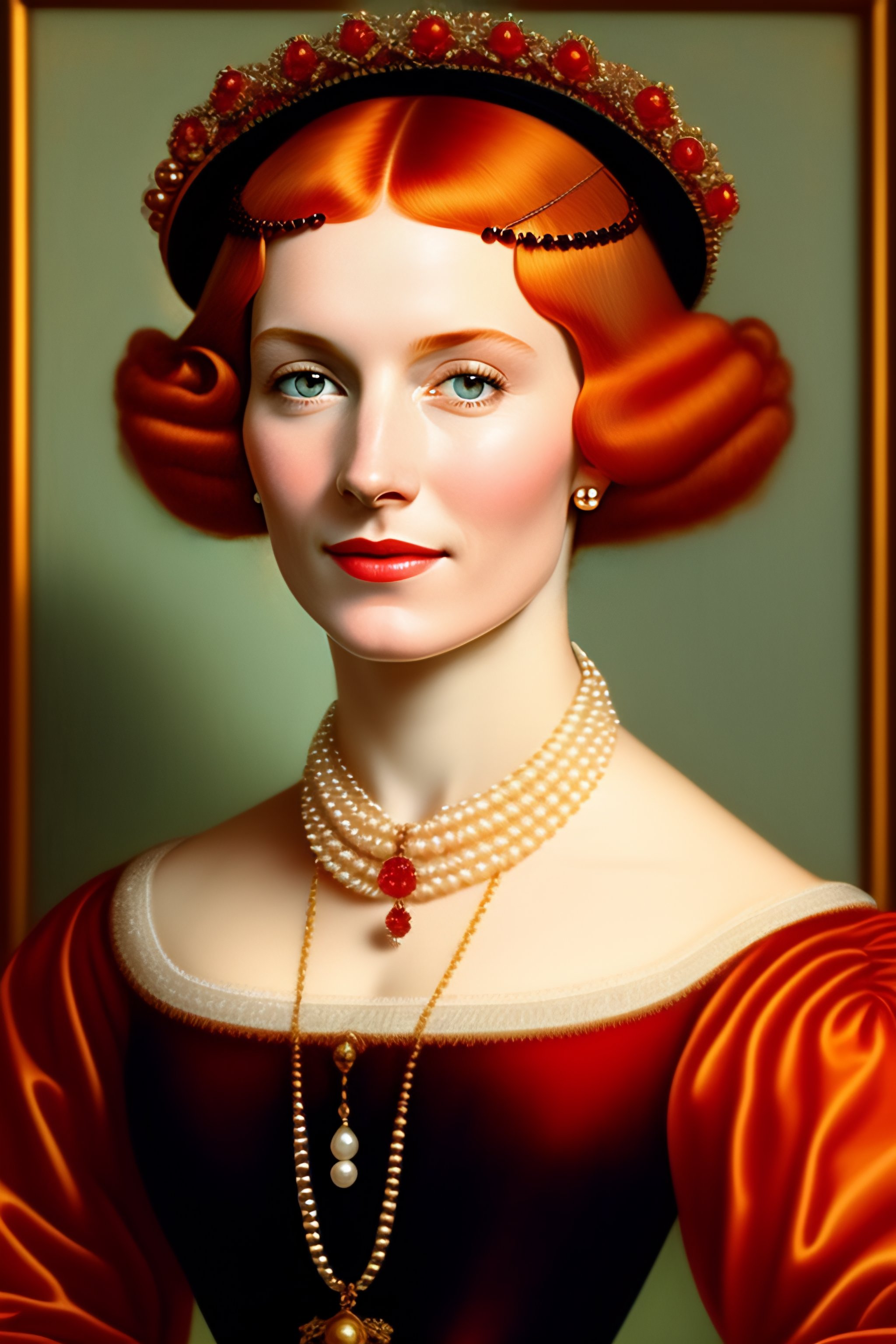 16th century portrait of a red haired woman wearing a pearl necklace