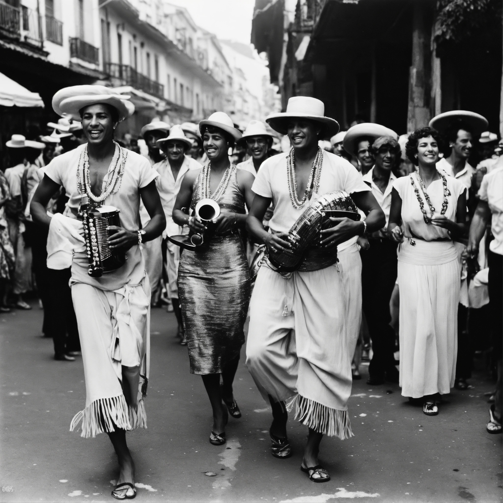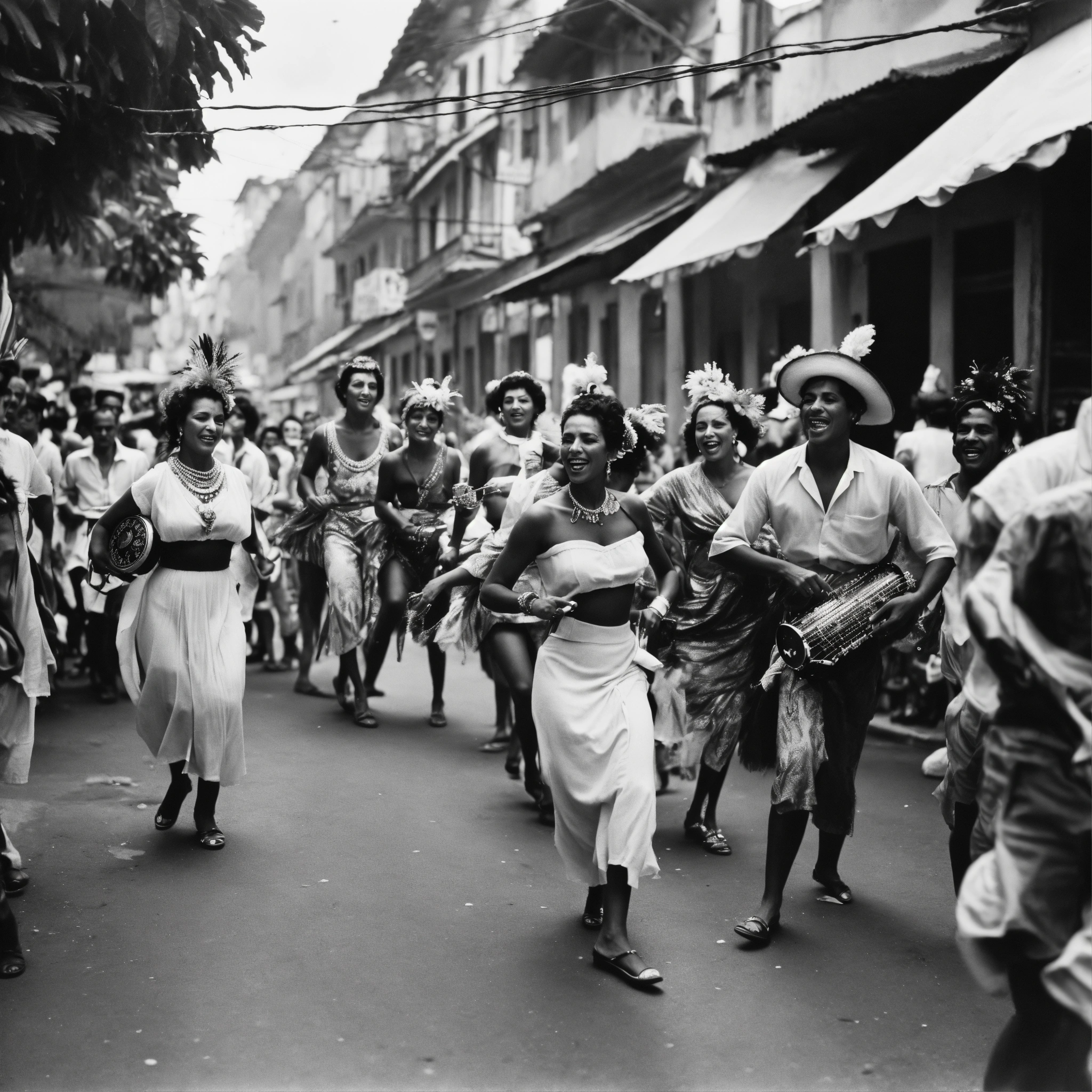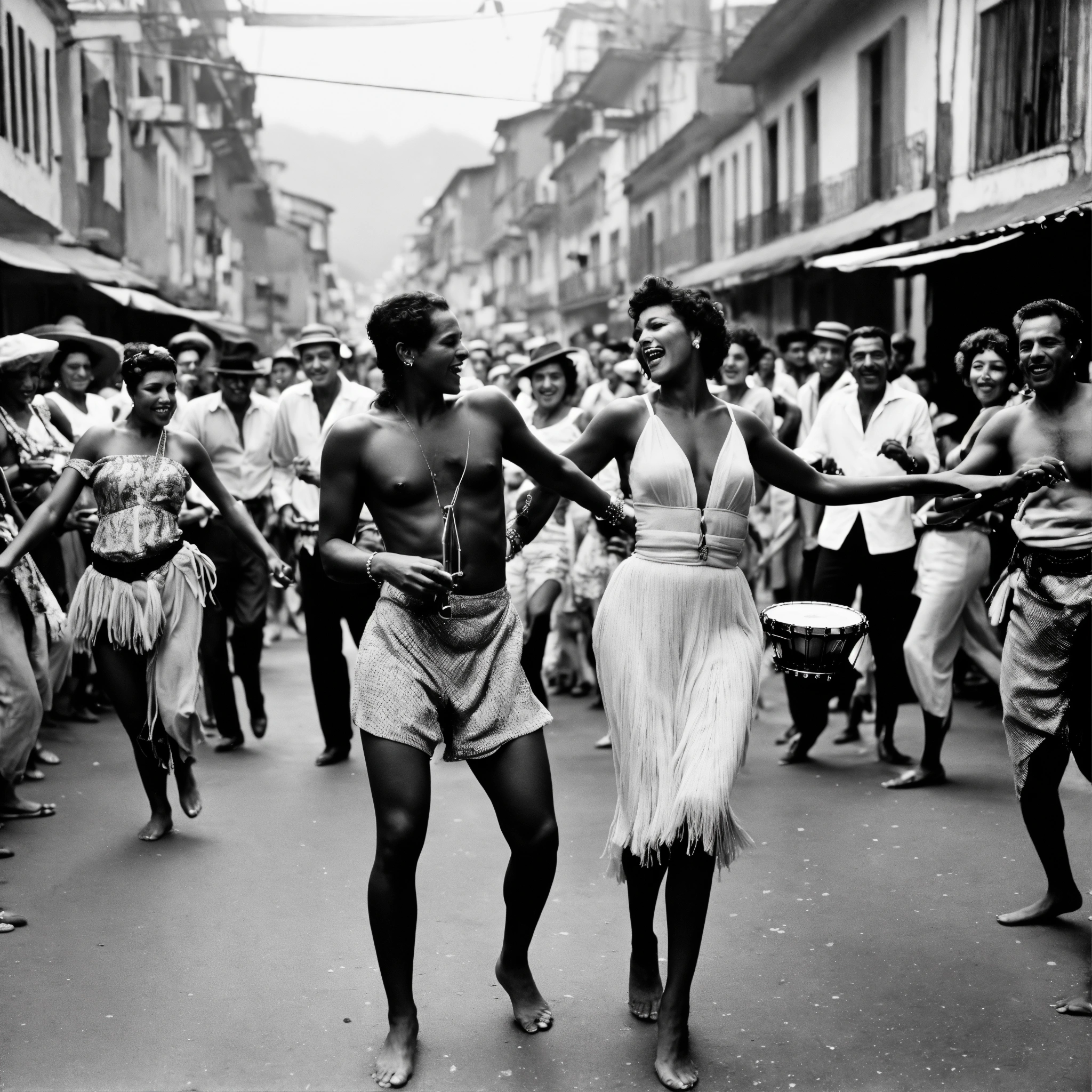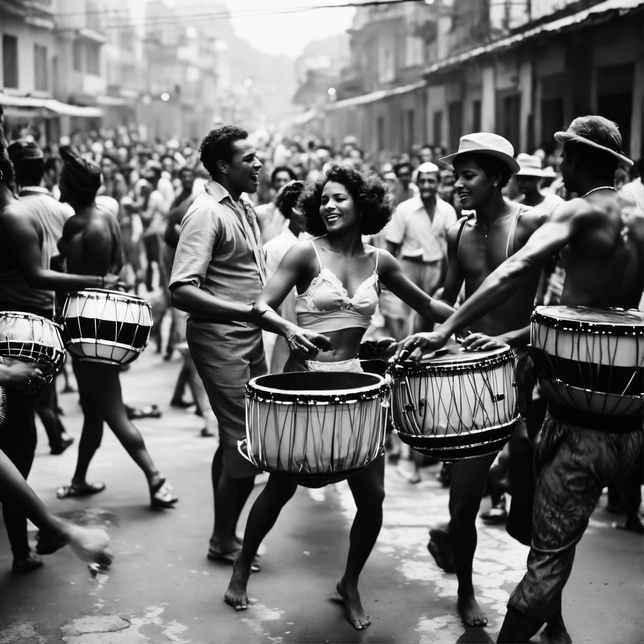 Photograph of rio de janeiro in ancient brazil, high quality black and white photography, 50s, samba players play samba instruments, women and men dancing, party atmosphere, bohemian neighborhood