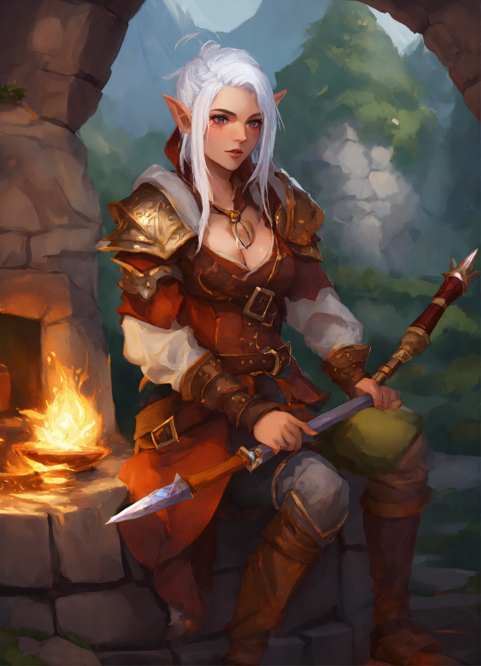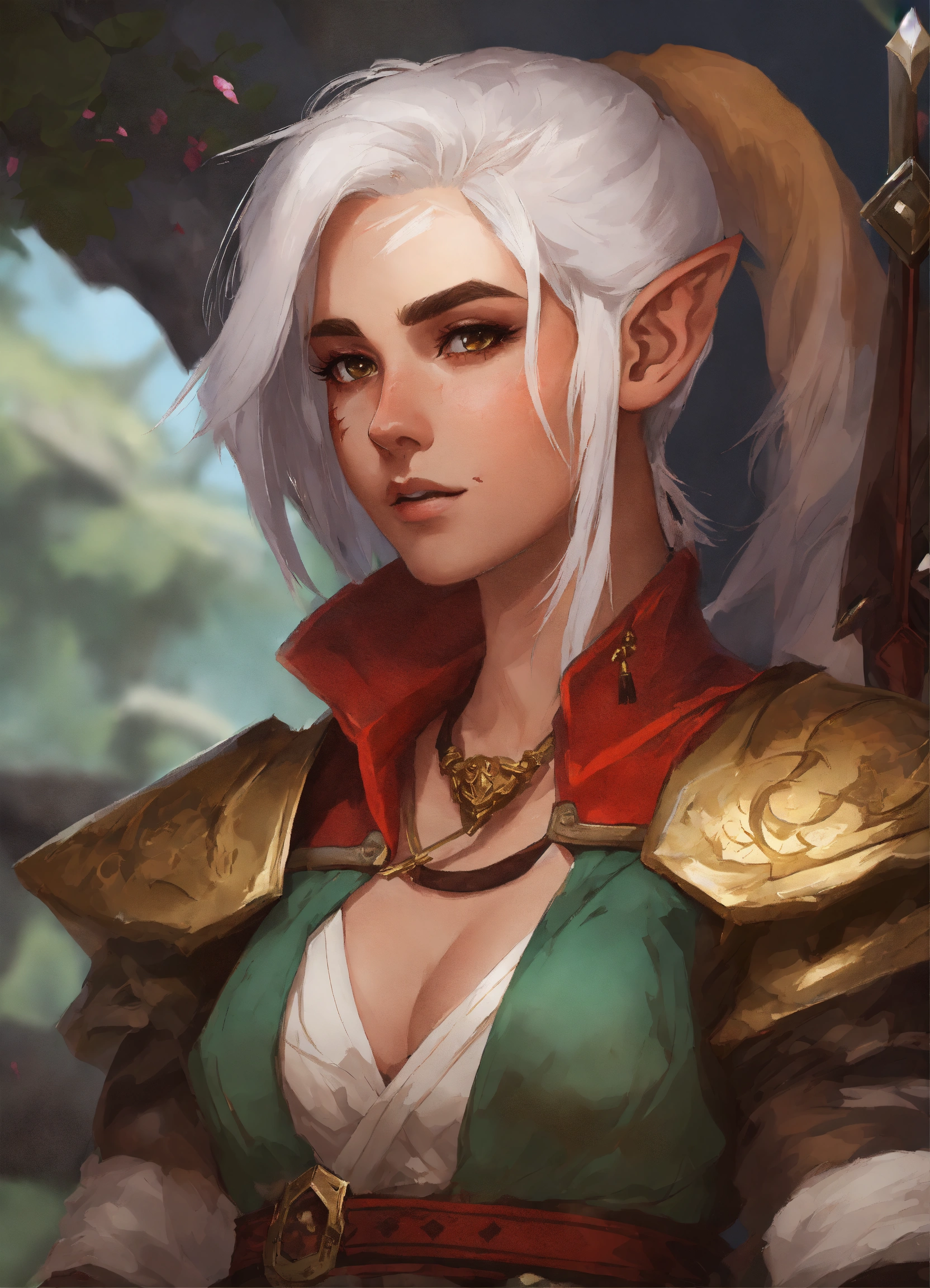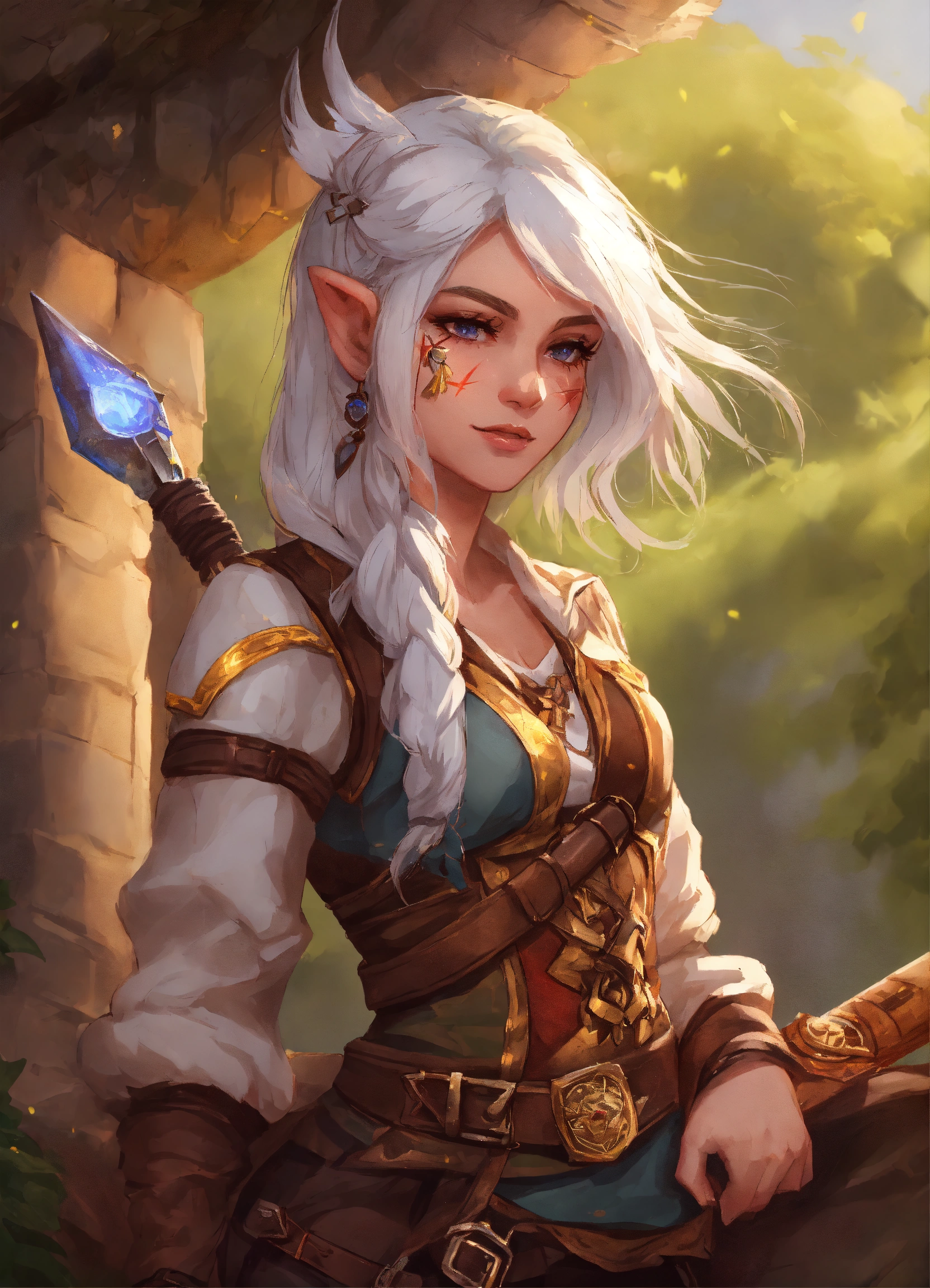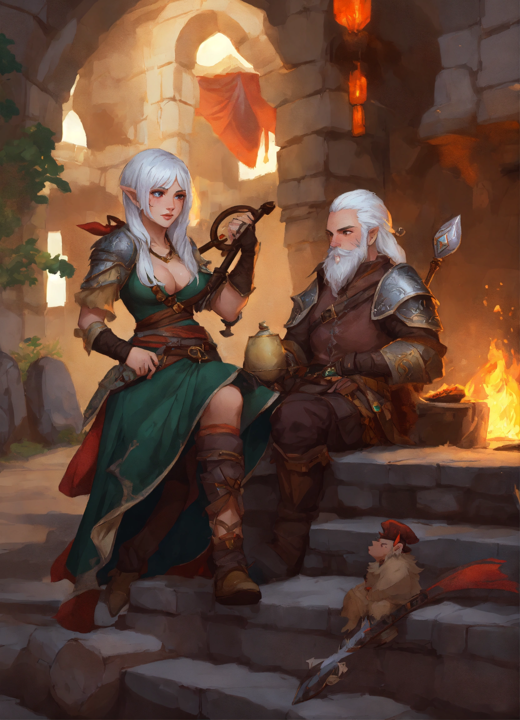 Donjon and dragon female gnome bard with white hair and a luth and a scar on his face