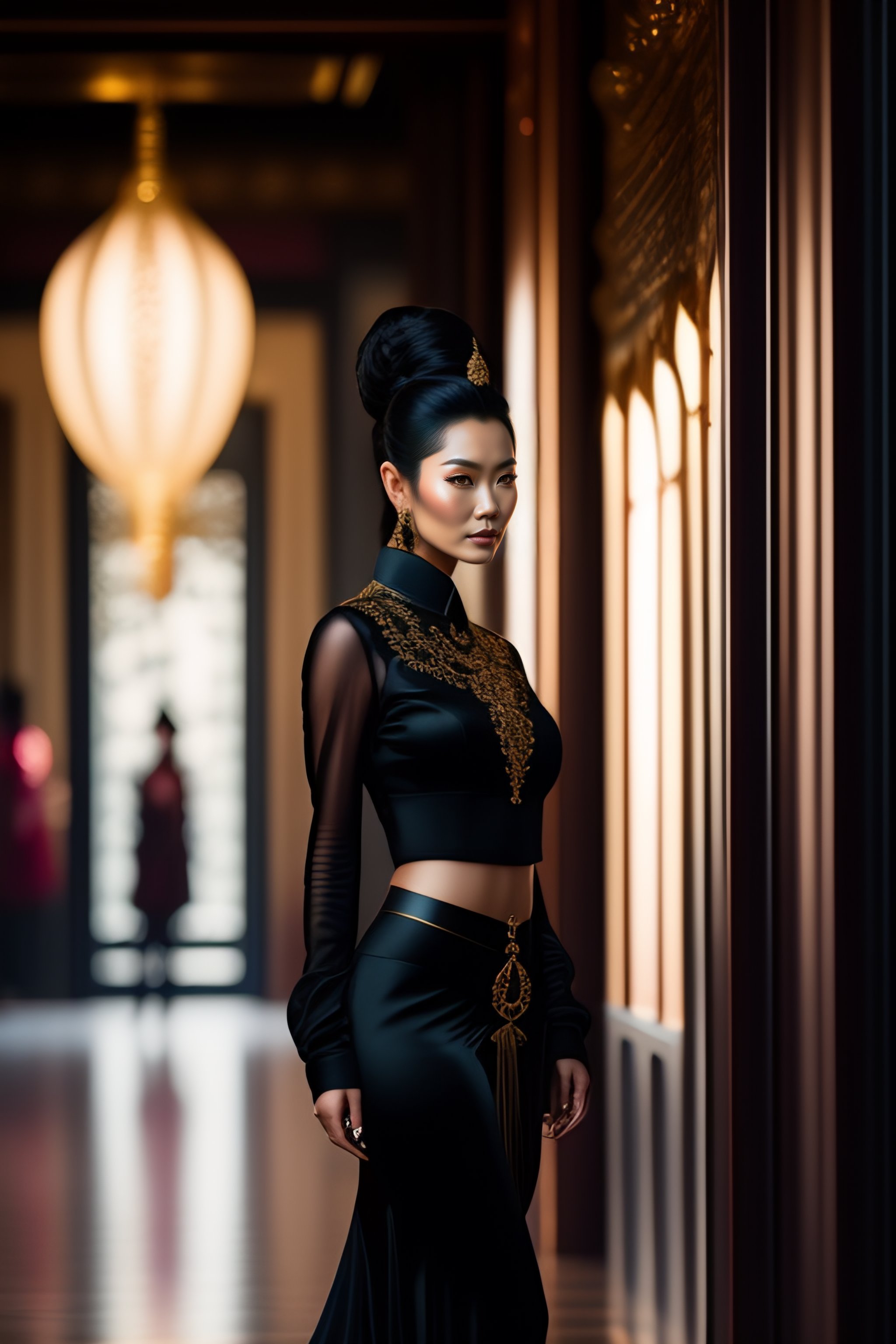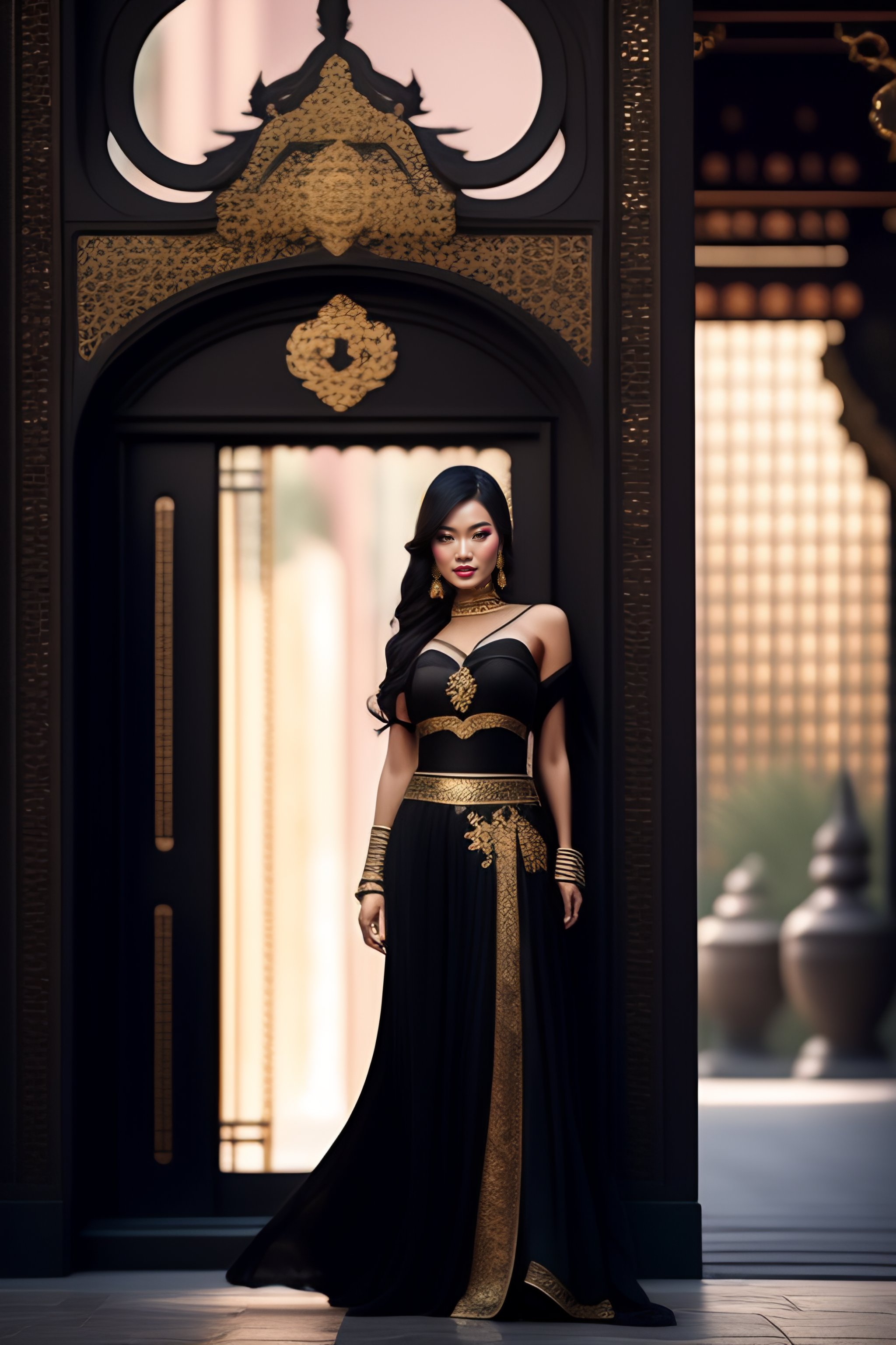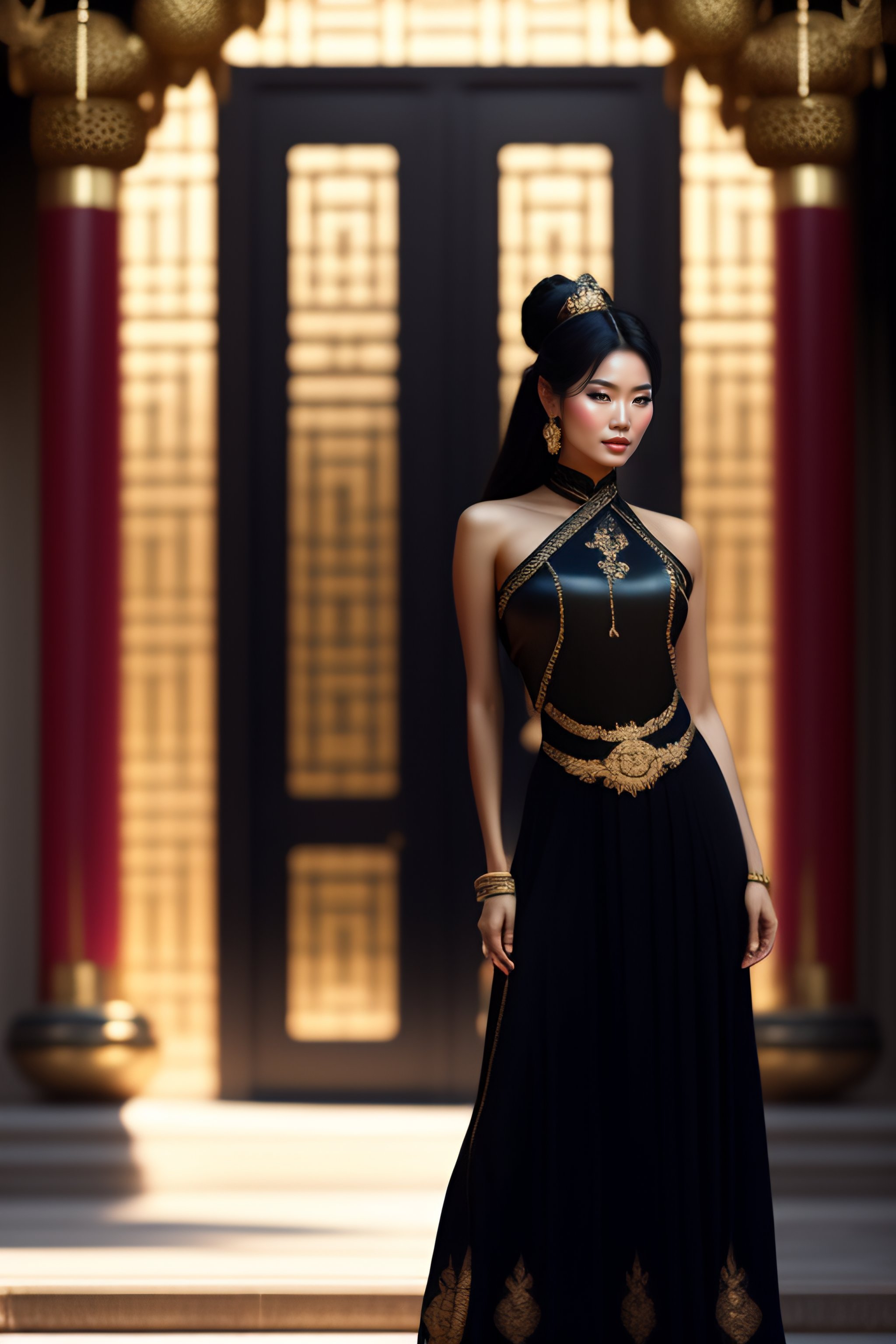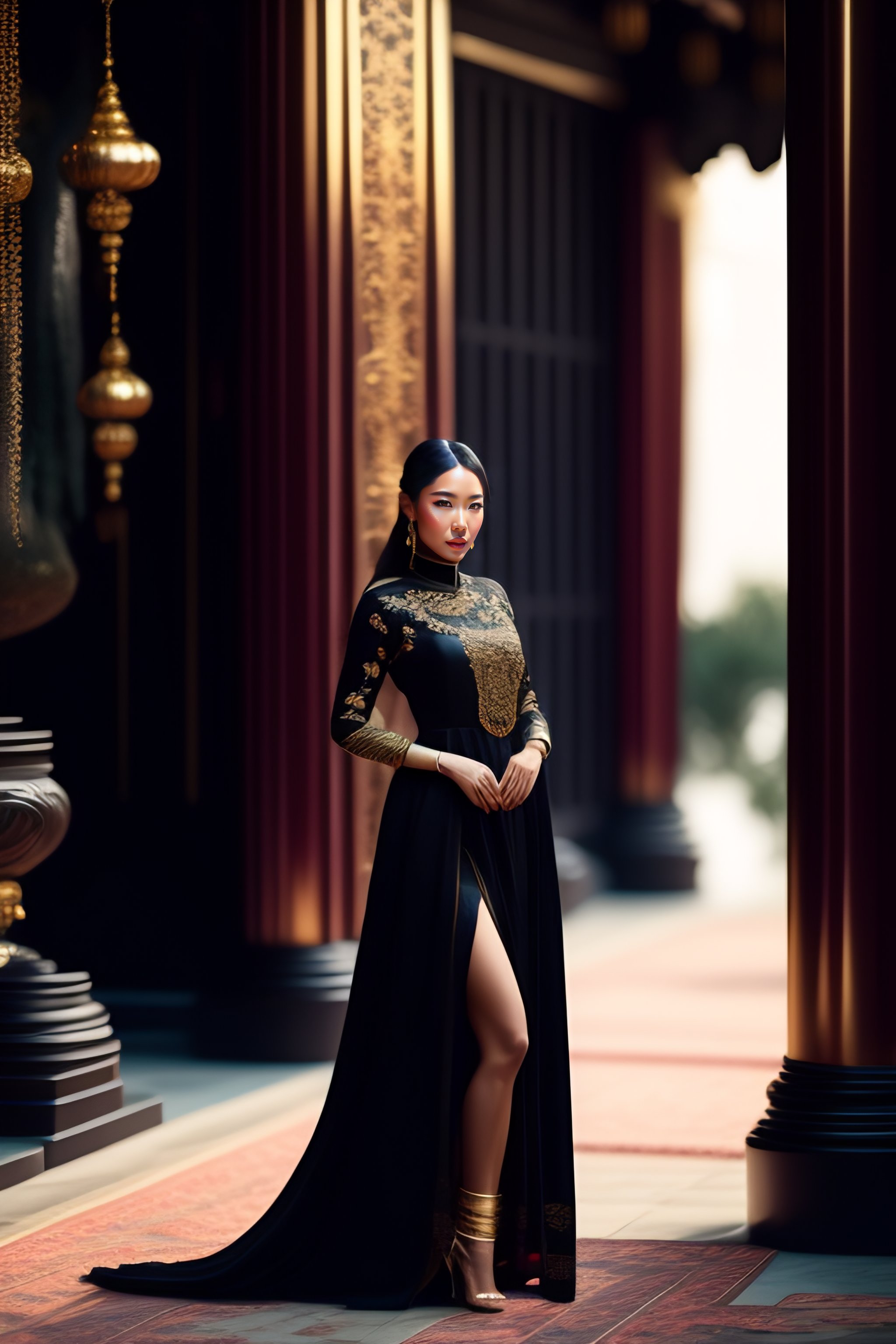 Beautiful asian princess woman wearing sexy black clothes, wearing jewels and posing near the door of a chinese temple, near golden dragon statue, full-body view, greg rutkowski, ultra detailed, volumetric lighting
