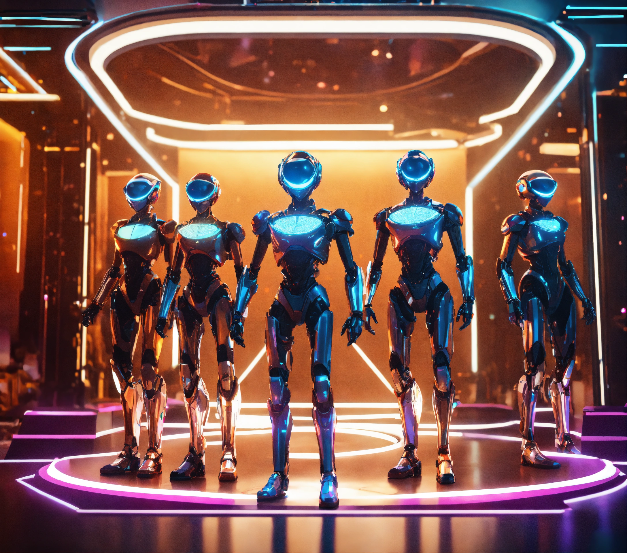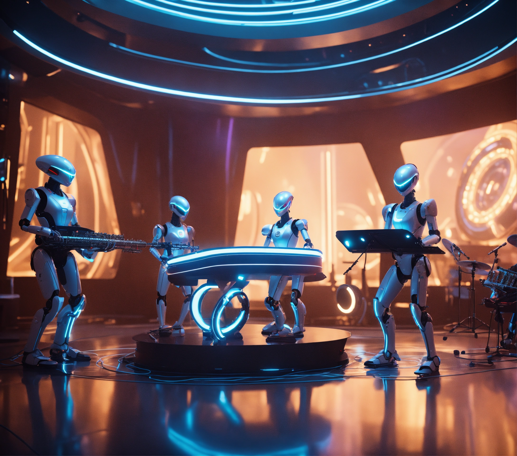 Band of 4 robot musicians with alien electric instruments playing hypnotic music on stage in a luxurious space port reception area, realistic, futuristic, sci-fi, 8k, unreal engine, pixar, disney, zaha hadid