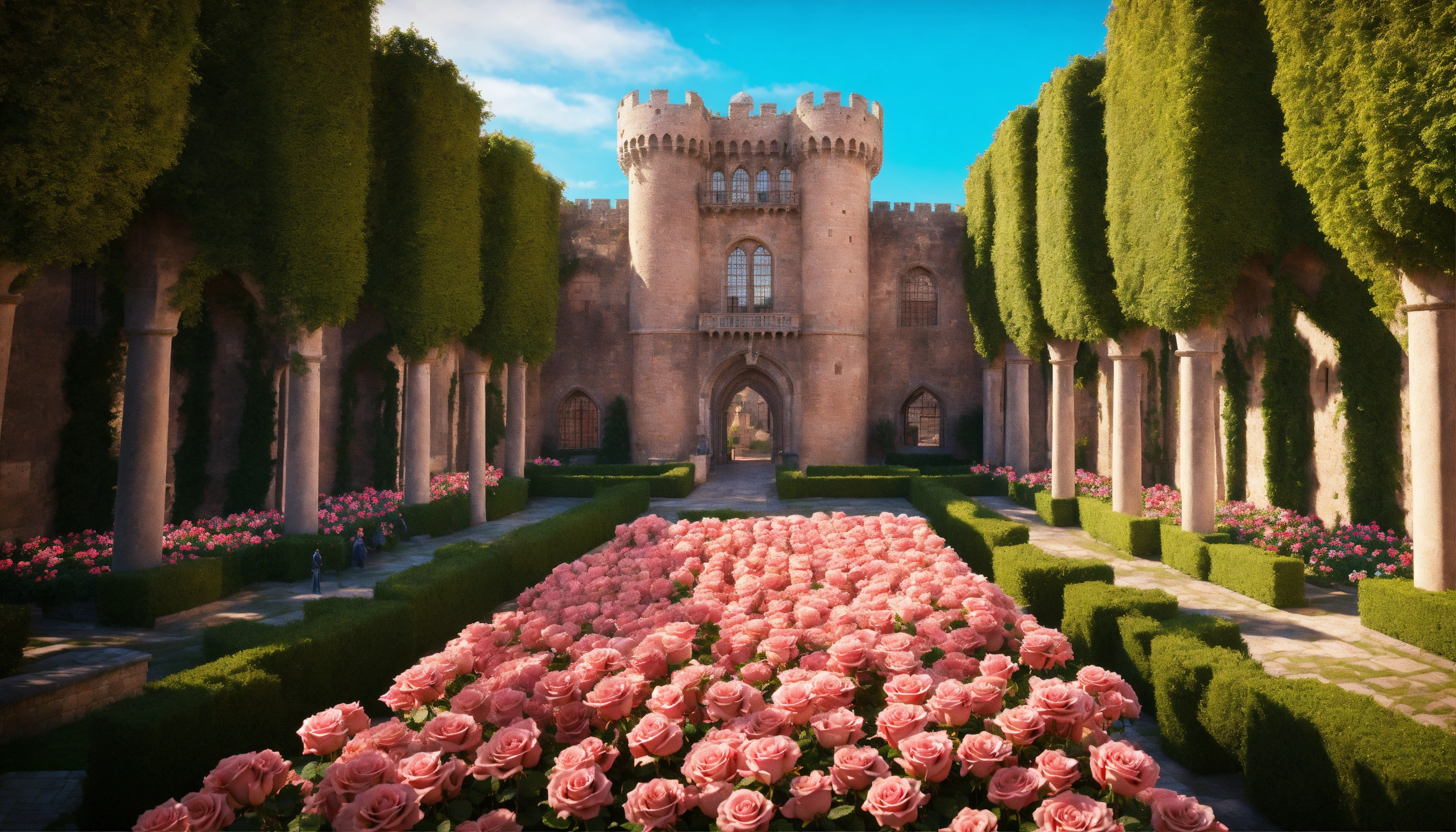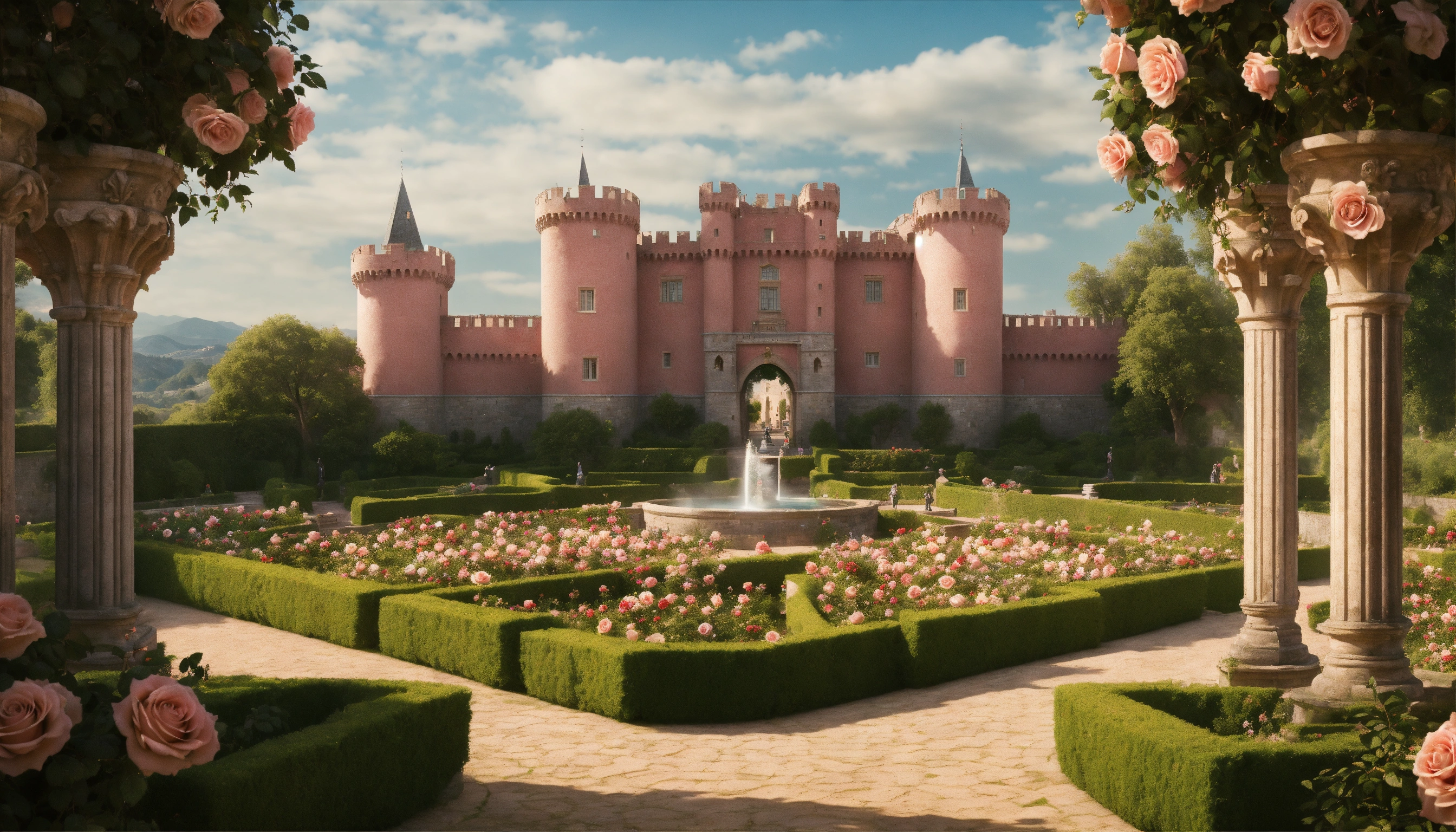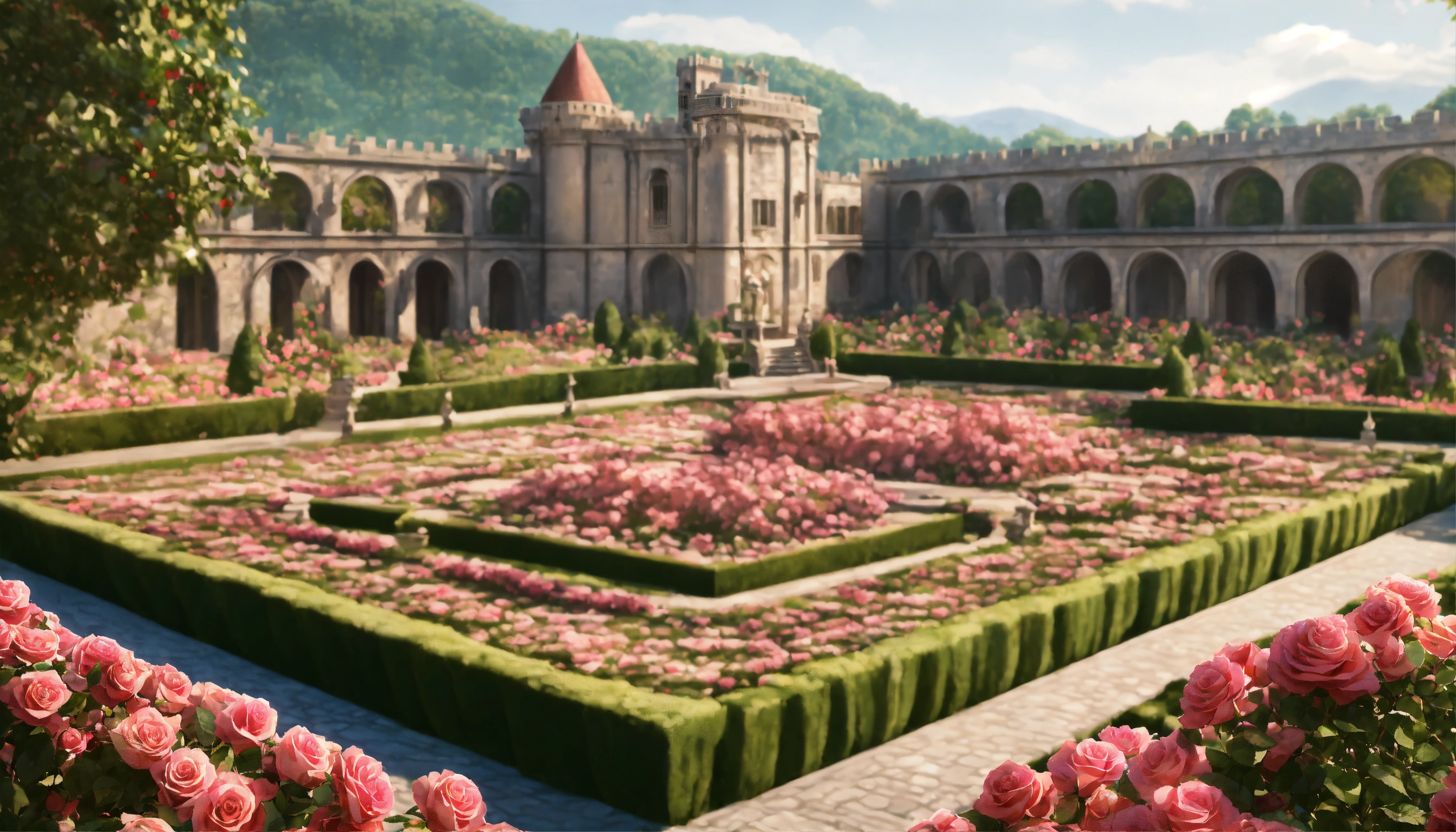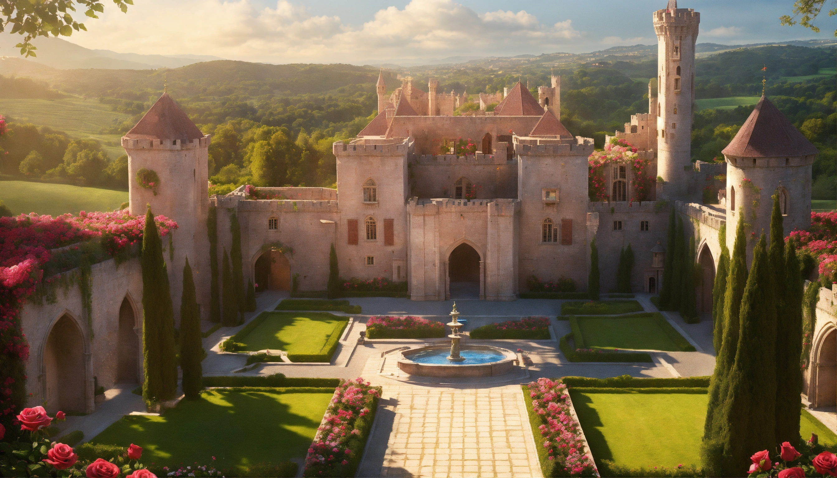 Ultra realistic, photorealistic, palace of roses, medieval castle from a bird's eye view, rose bowers, magnificent rose garden and arcades, magnificent fountain, marble figures, massive crenellated stone wall with wall gate and watchtowers, extensive rose fields on hilly landscapes in the area, very detailled, focus on castle, sharp focus, sharp, ambient lighting