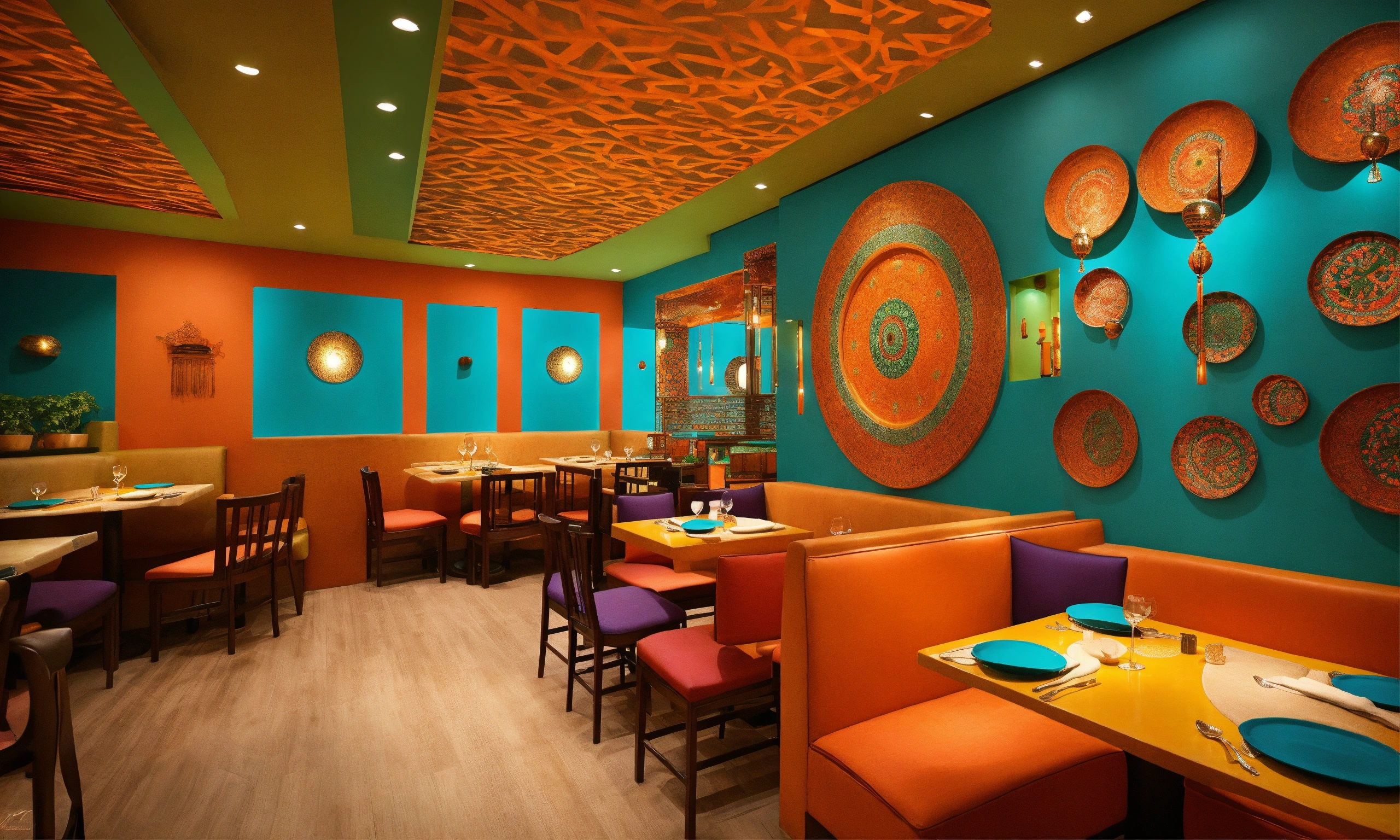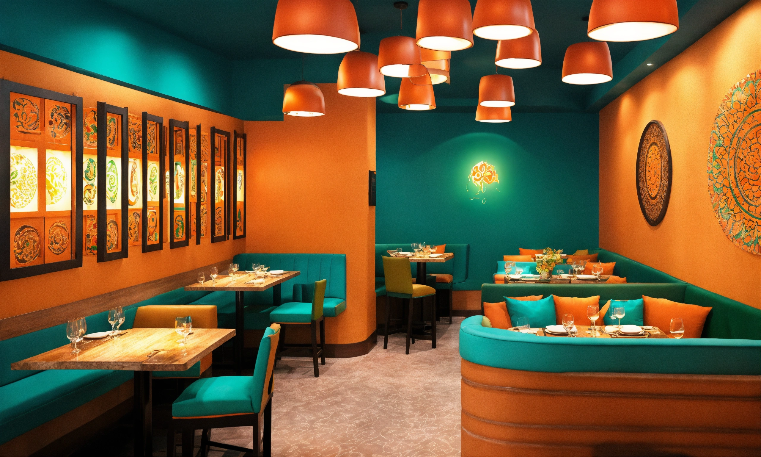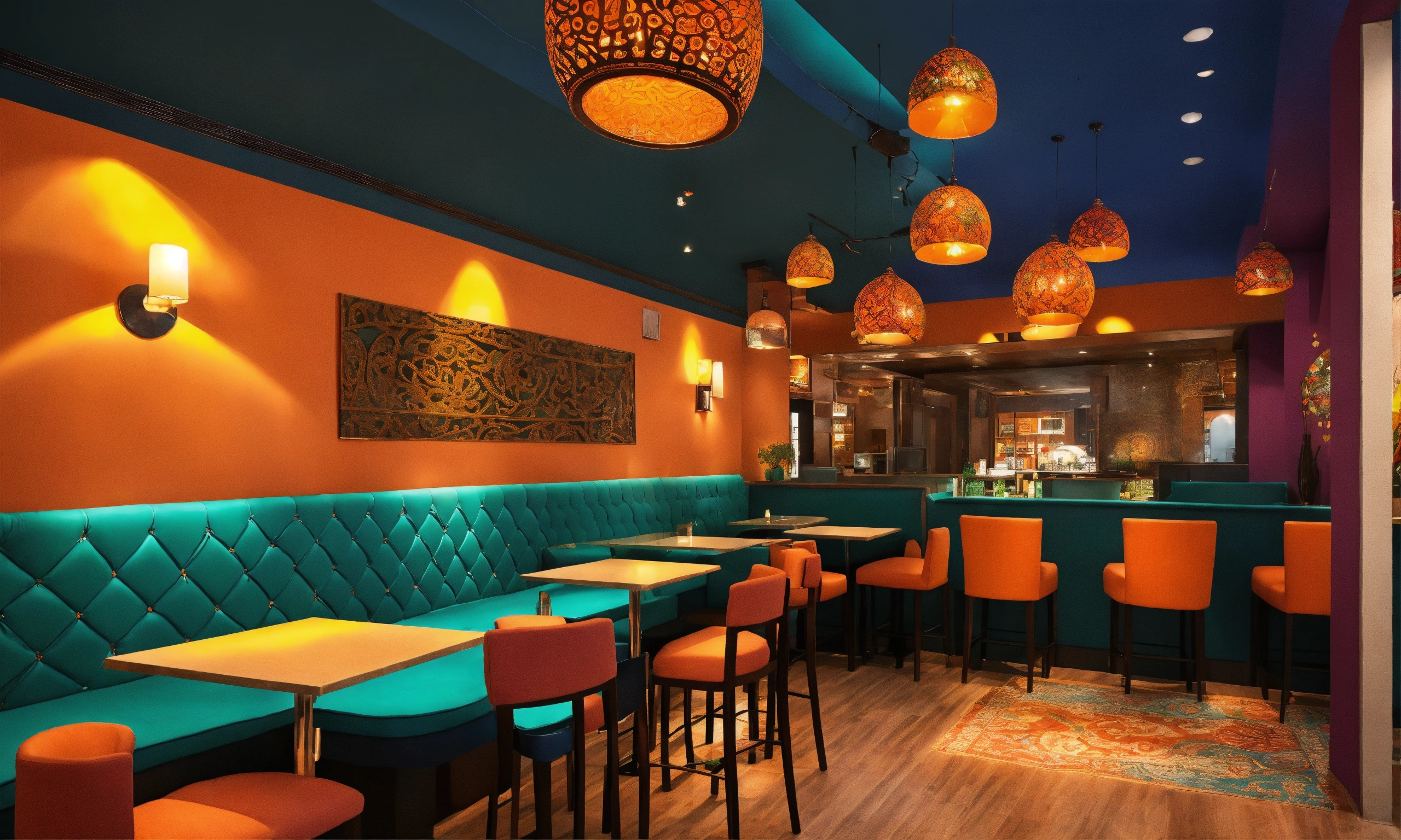 Design a front prospective of a vibrant indian restaurant interior with a modern and trendy ambiance. the restaurant features eye-catching decor inspired by mandela shapes, illuminated by soft backlights that add depth and warmth to the space. the color palette includes bold shades of orange, green, and blue, creating a lively and inviting atmosphere that complements the rich flavors of indian cuisine