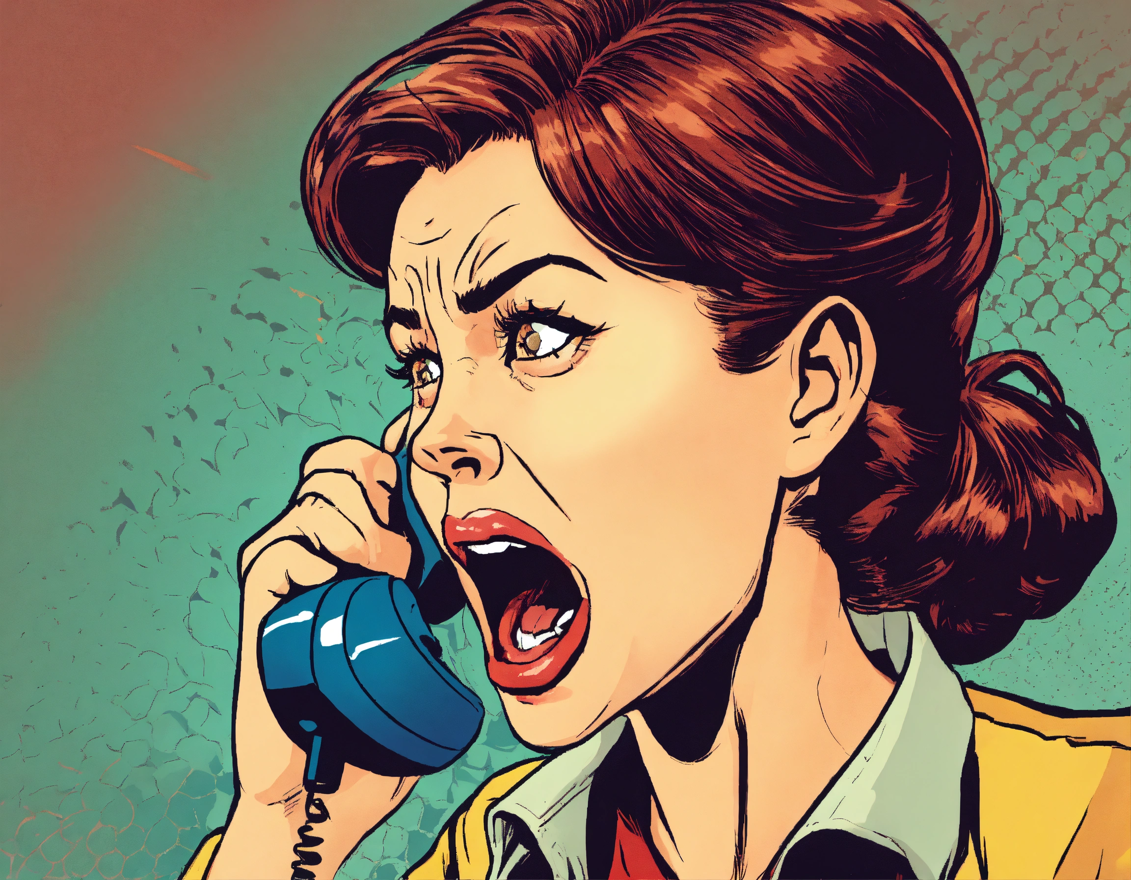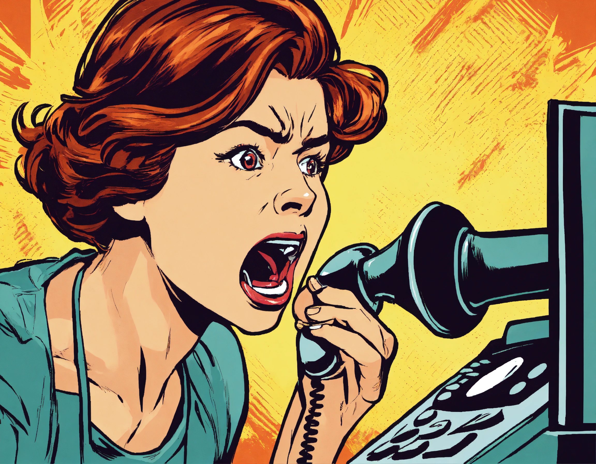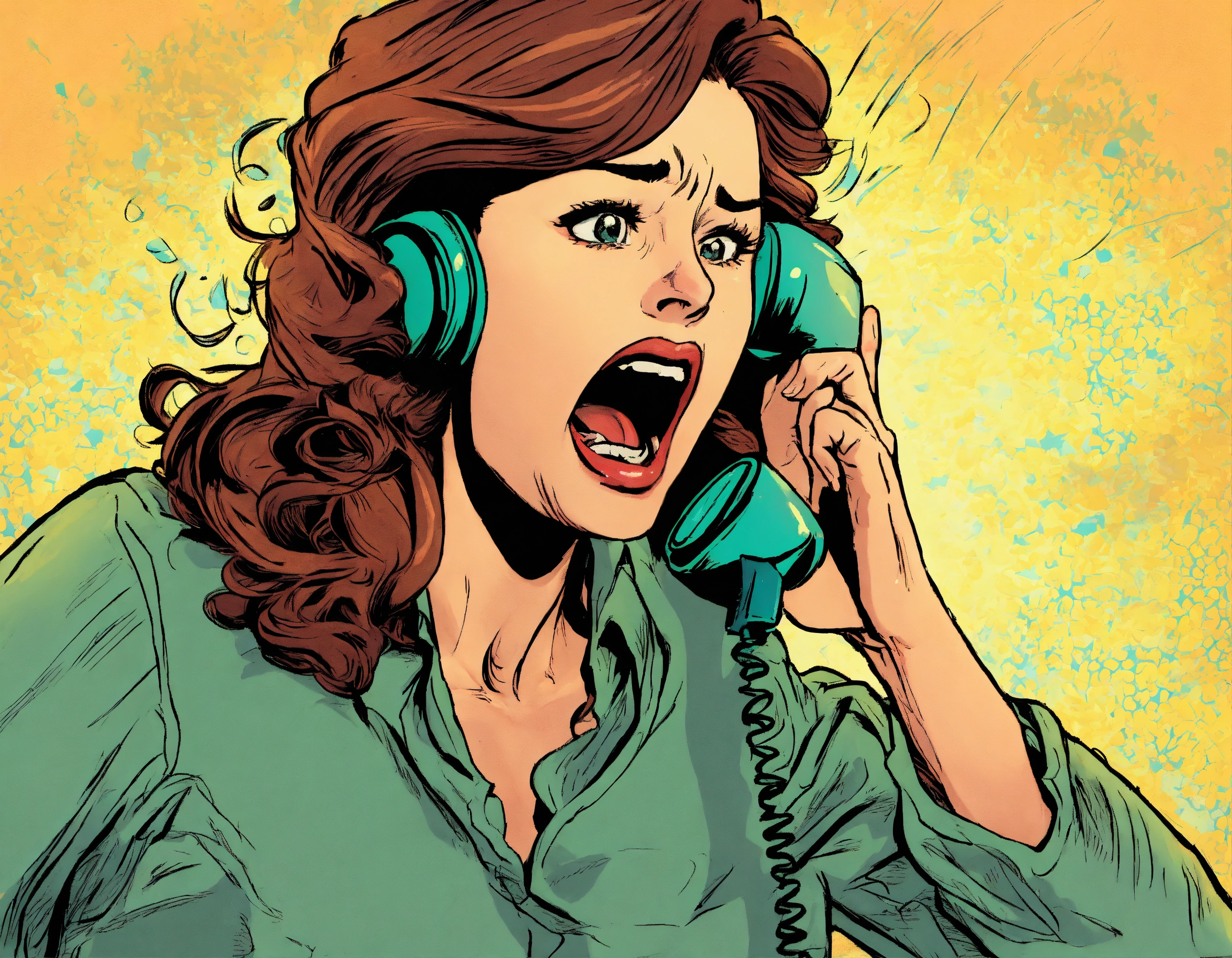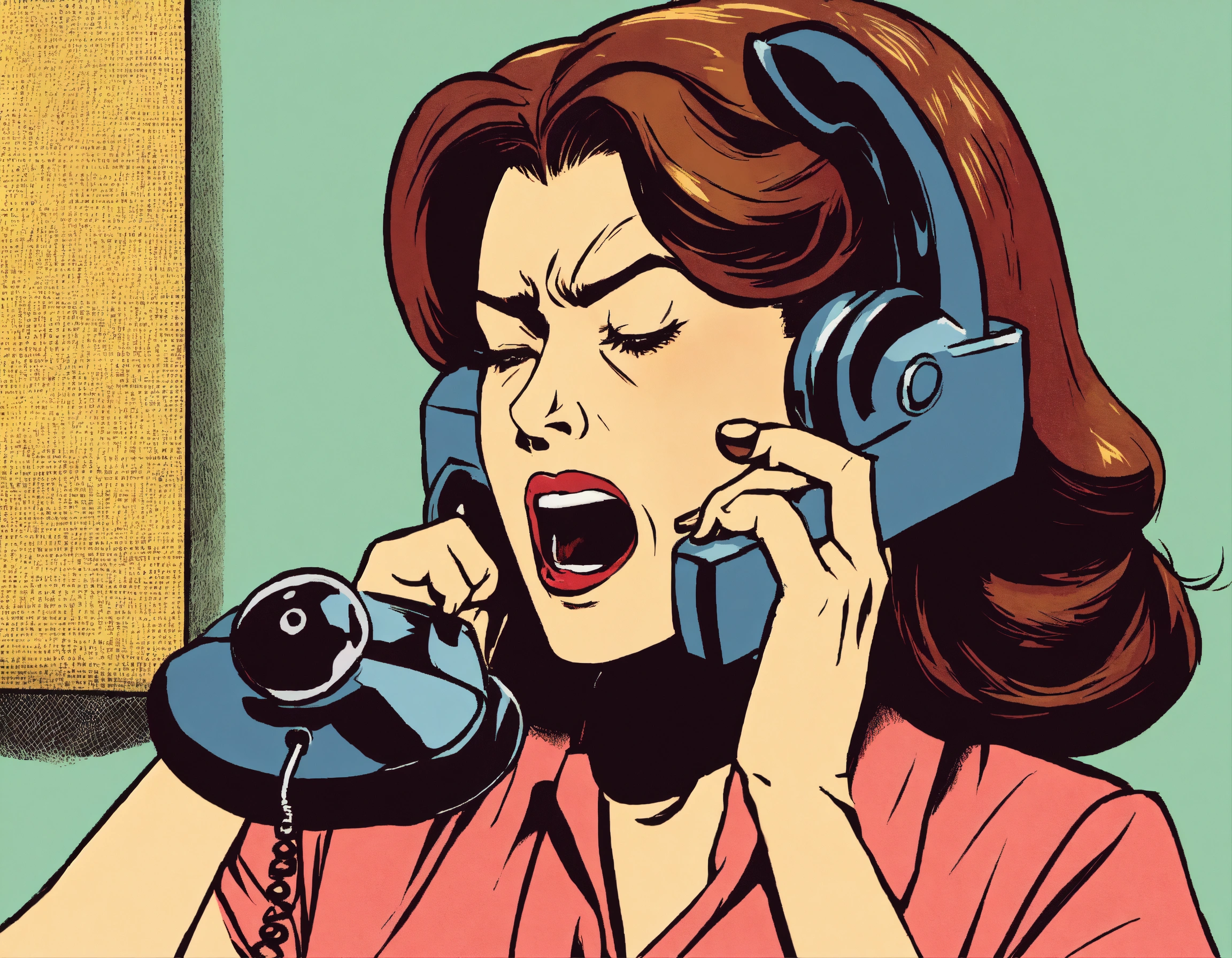 a woman is yelling into a telephone