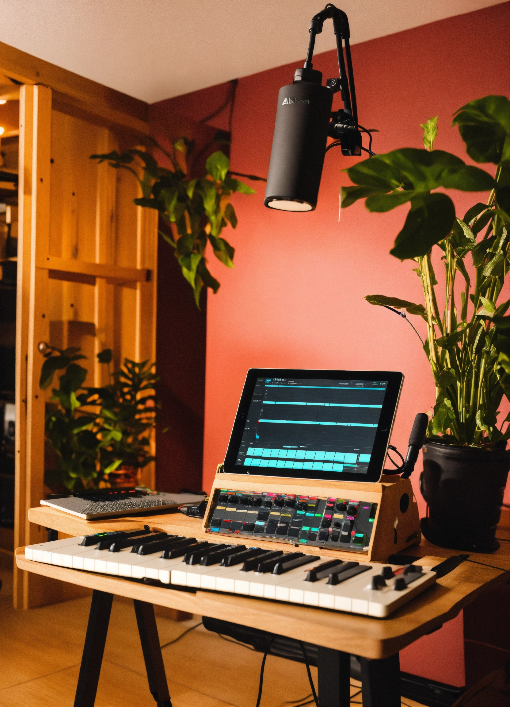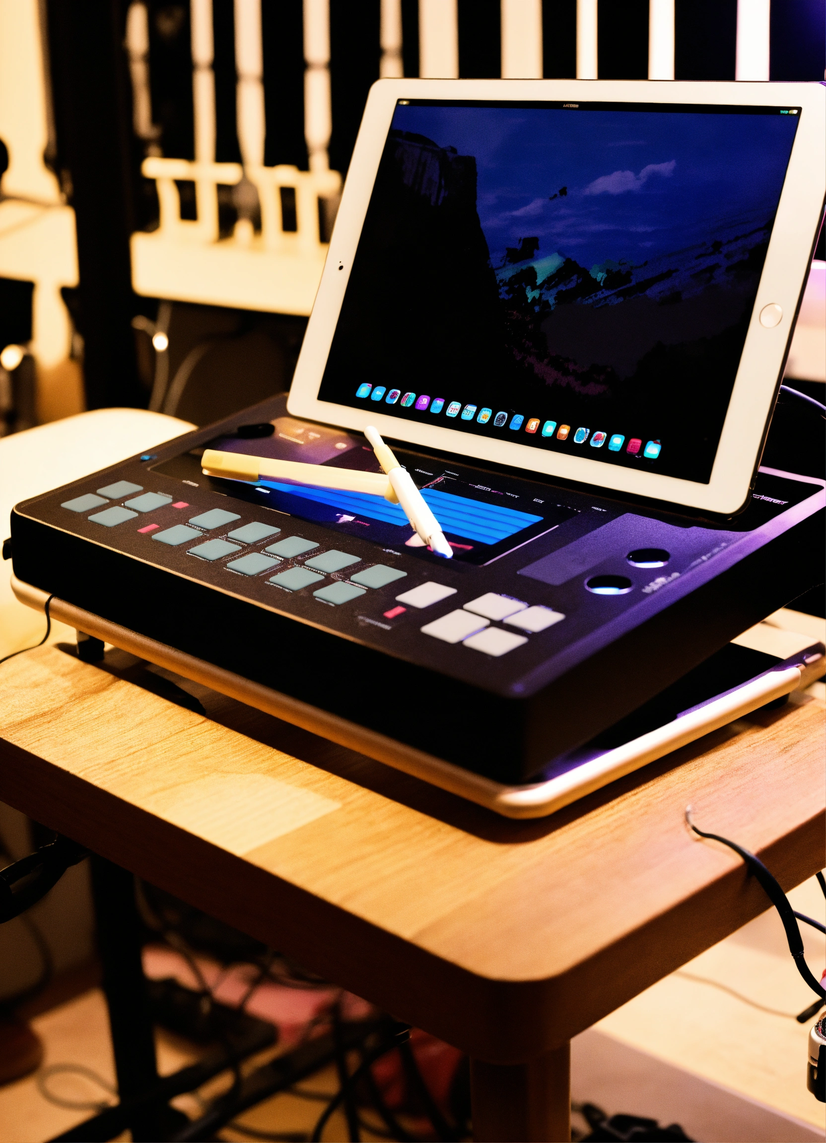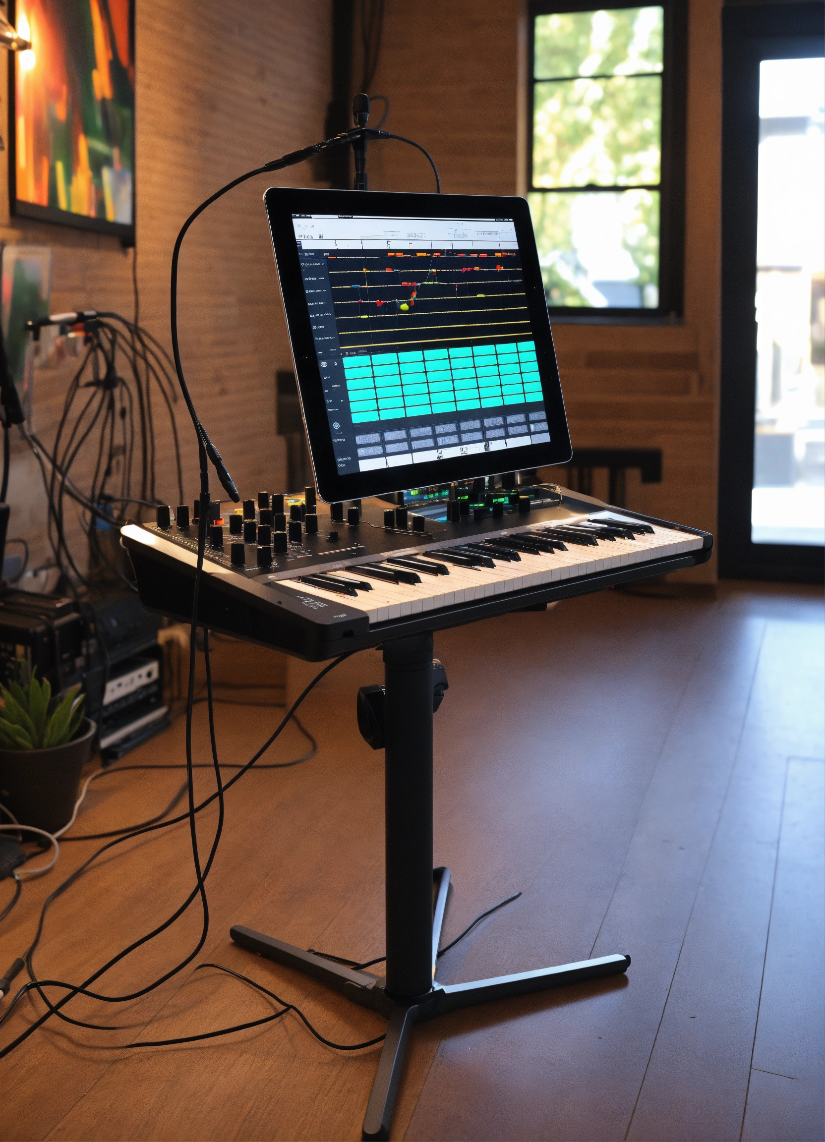 Generate me a music instrument stand that houses an ableton push 2 on the top, with a touchscreen monitor, and an ipad holder. must be suitable for playing standing up, and must be able to hold all cables and power supplies within itself. a self contained unit which is portable and easy to set up. must be sleek, stylish, mordern, and artistic, for use in a live environment, with the ableton push and the ipad within arms reach