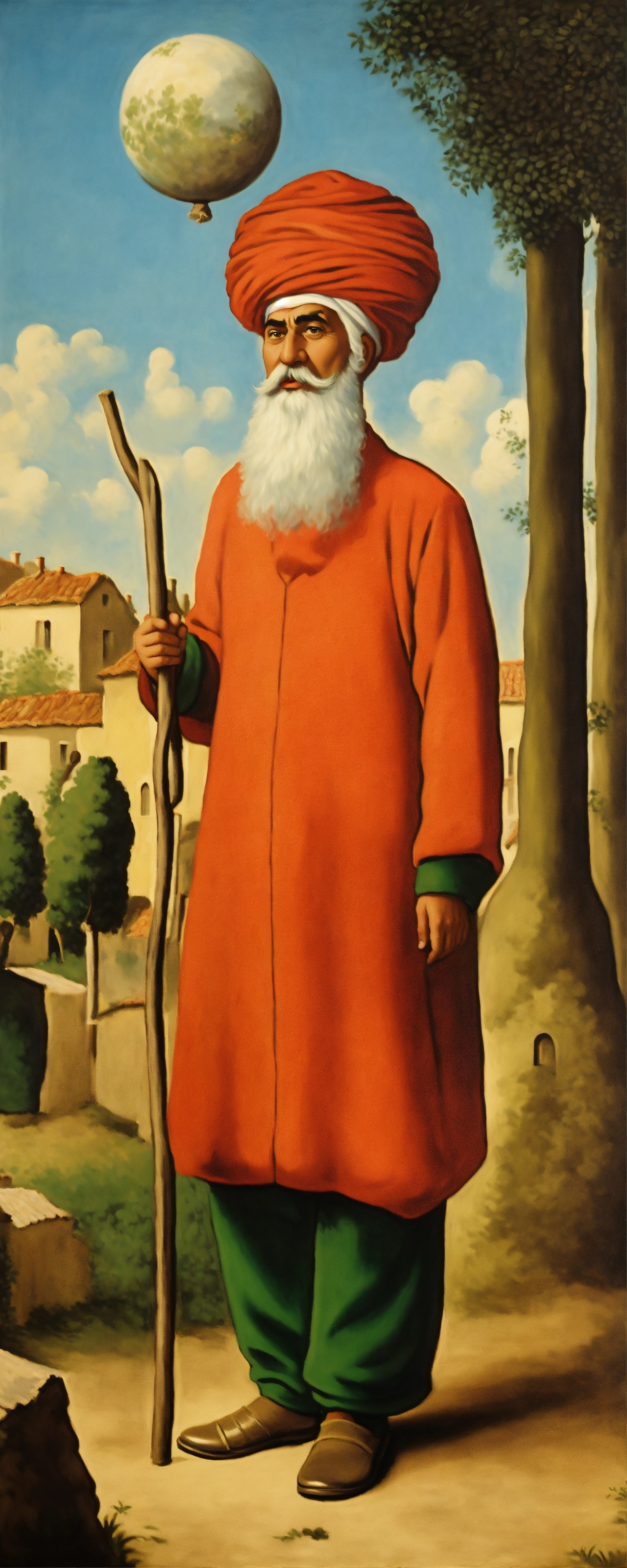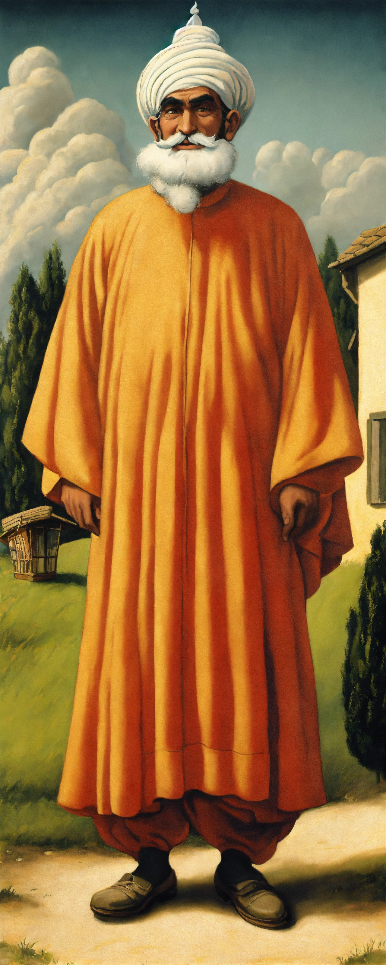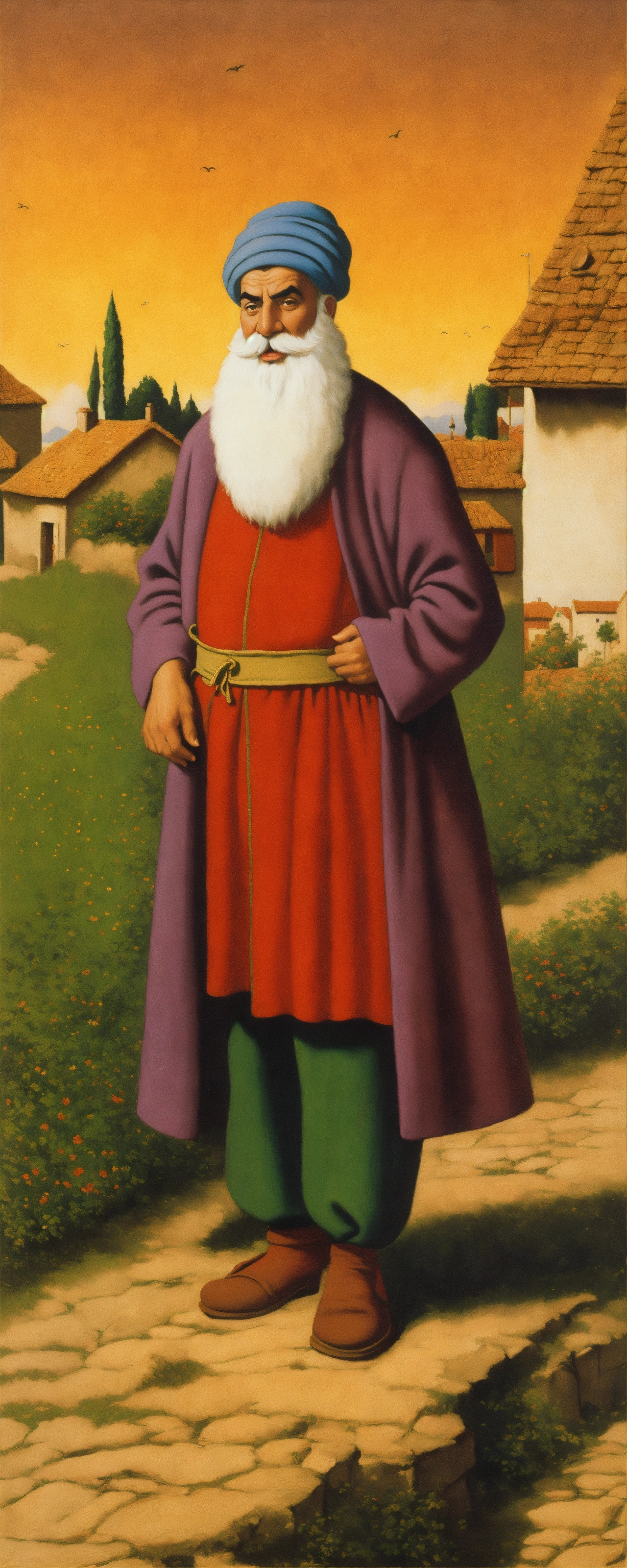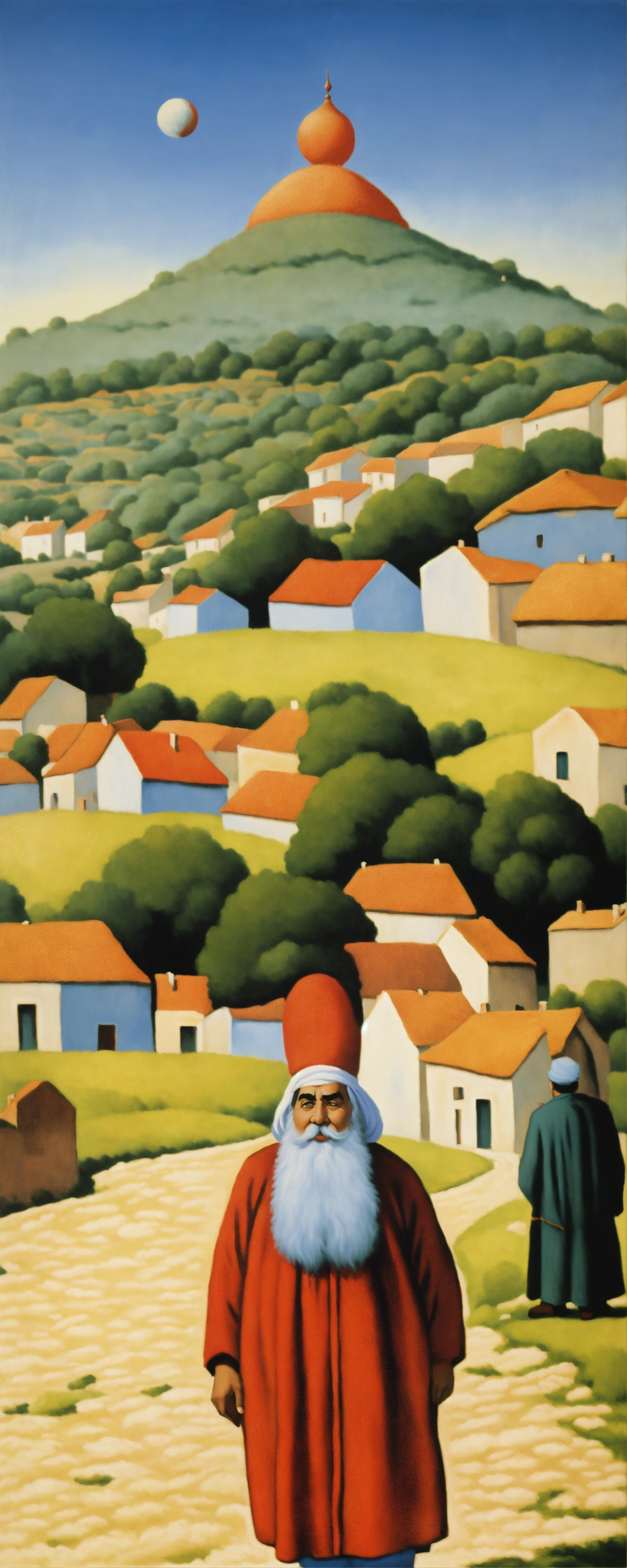 Fine illustration of the comedy cartoonish character "nasruddin" with his funny face in a village with people, in a painting by rene magritte