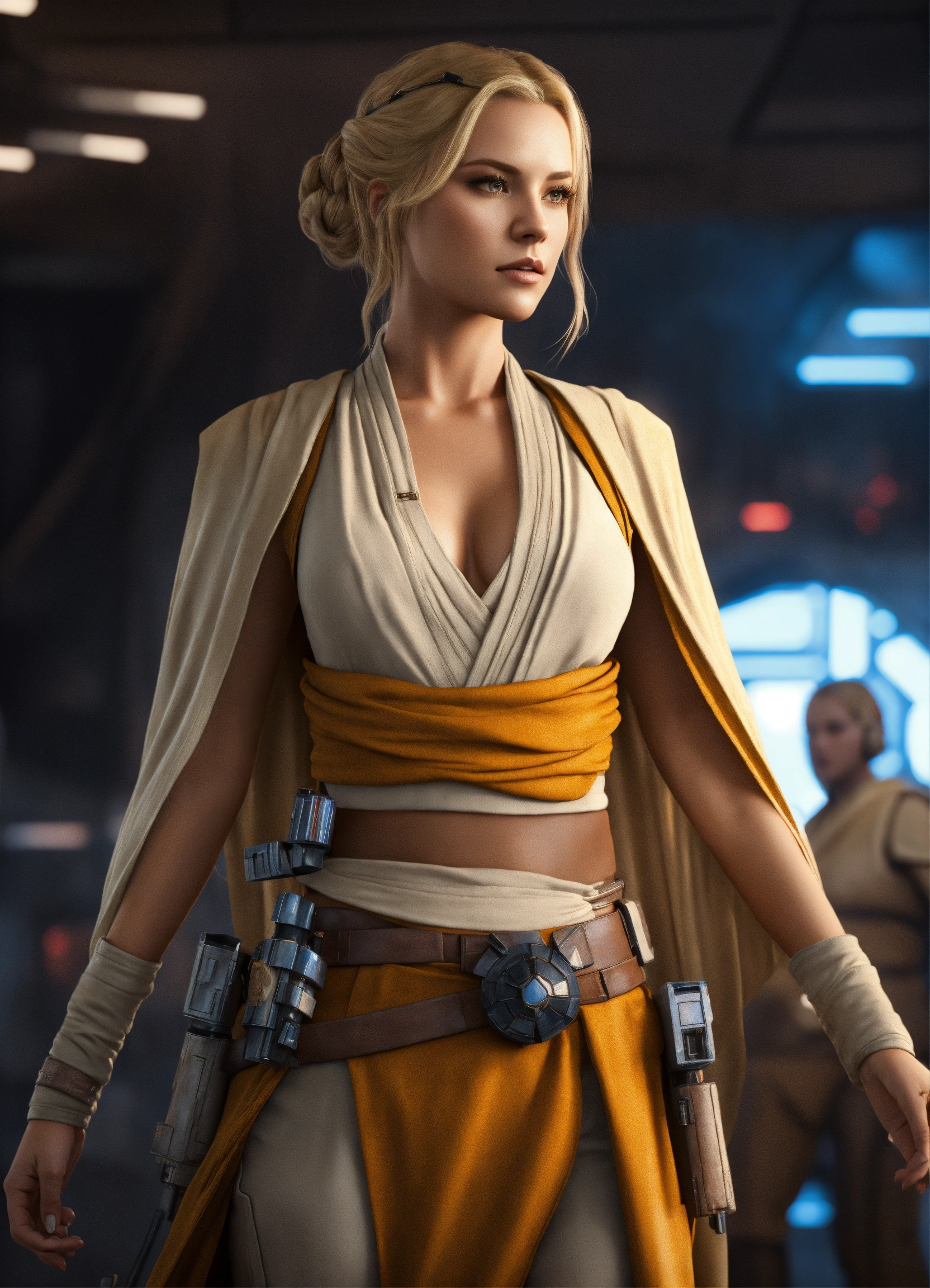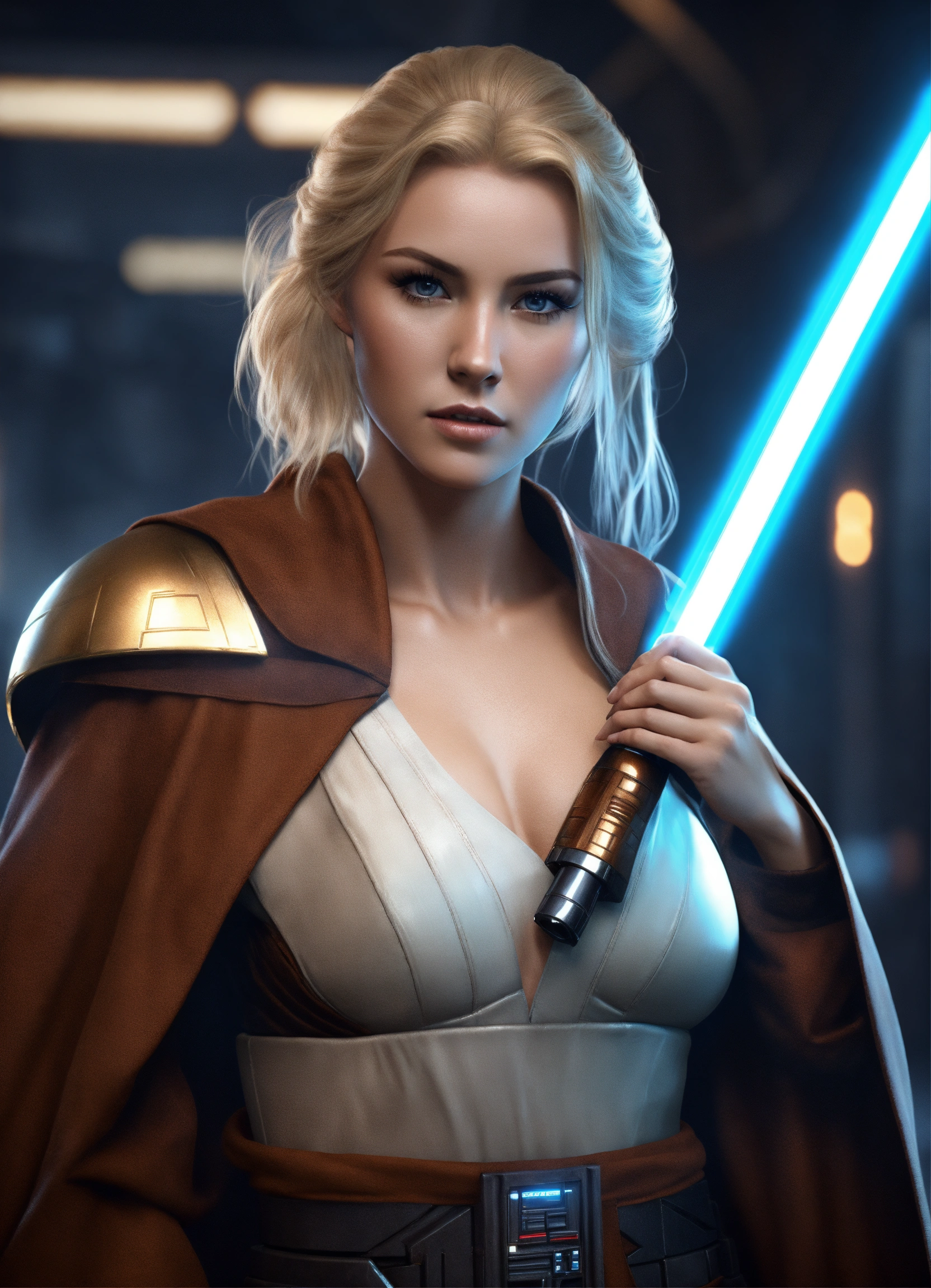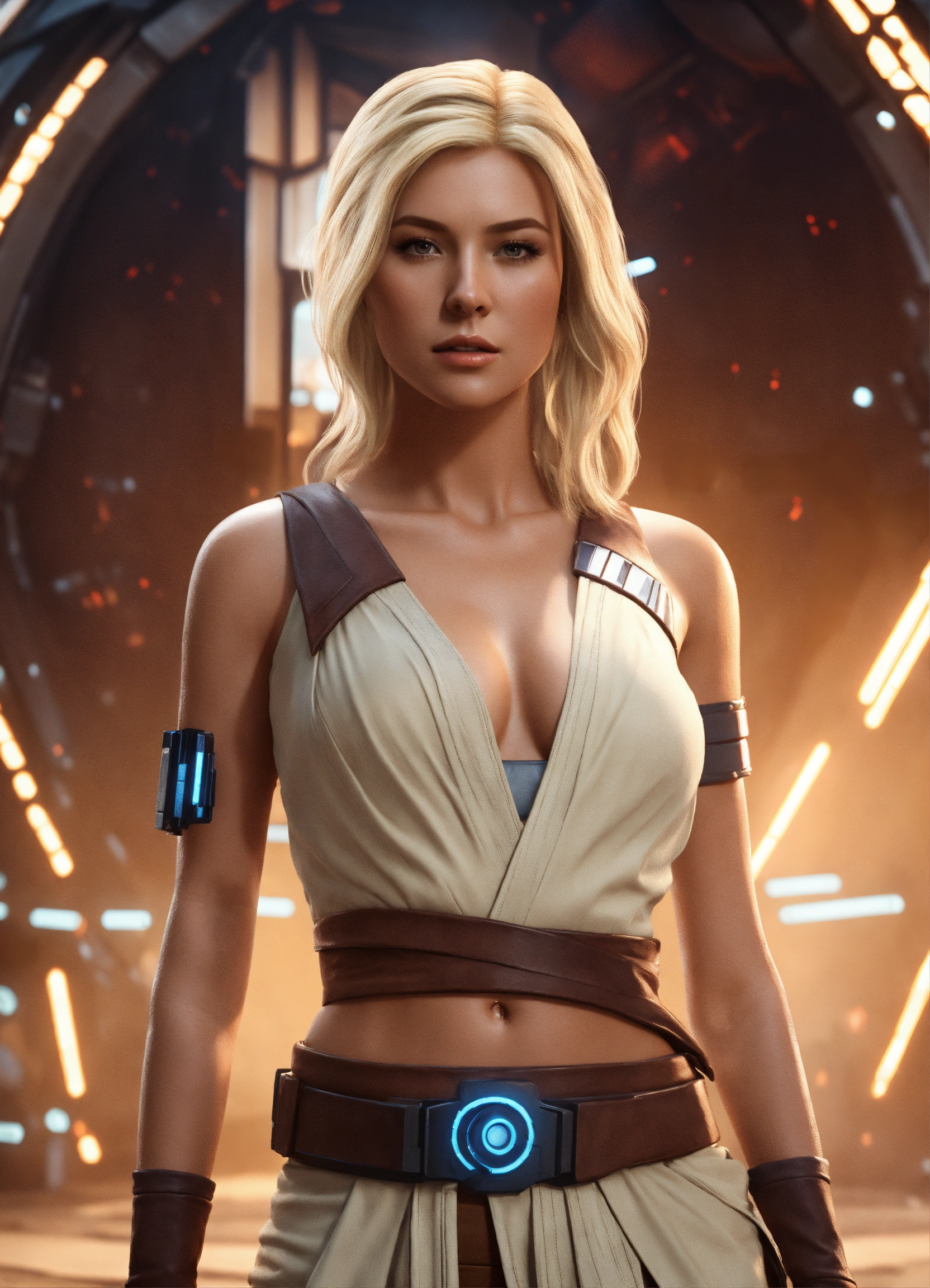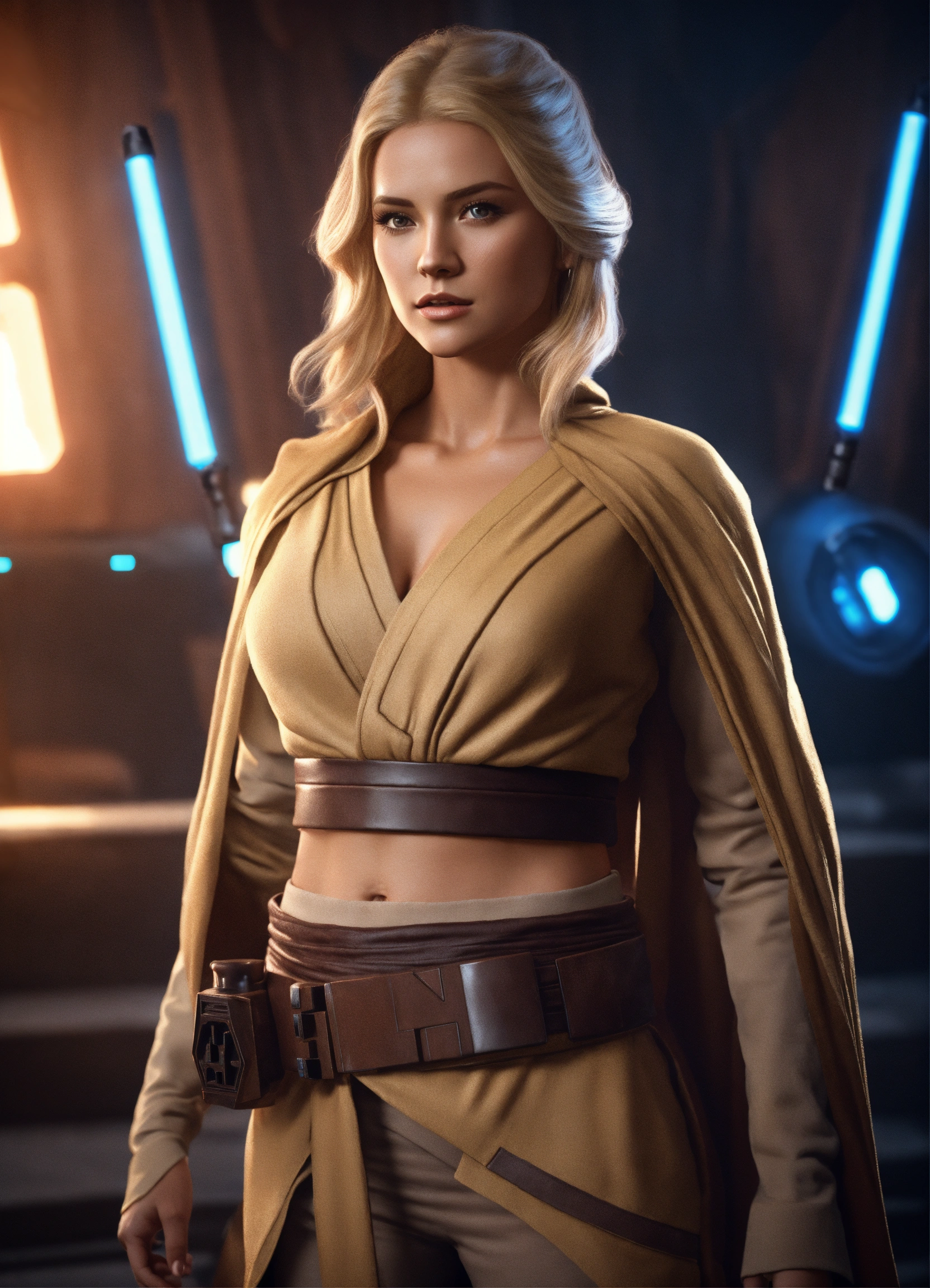 A gorgeous blonde jedi woman set in the star wars universe, midriff, huge jugs, unreal engine render, 8k