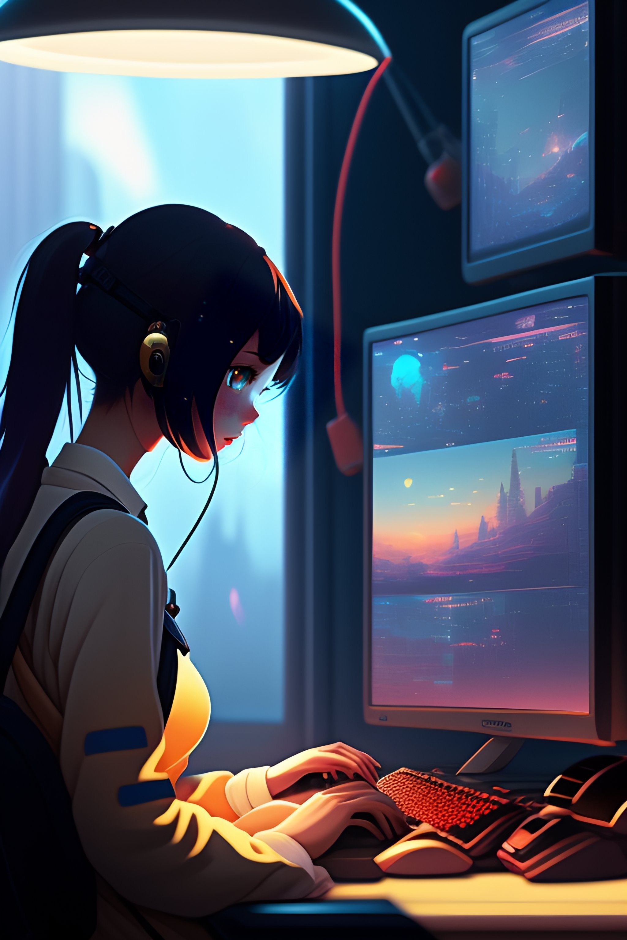 Create a high resolution artwork of lofi, anime girl is programming at a computer in a room full of gadgets, snown, web developer, by makoto shinkai and ghibli studio, outlined silhouettes, dramatic lighting, highly detailed, incredible quality, trending on artstation, masterpiece, 8k