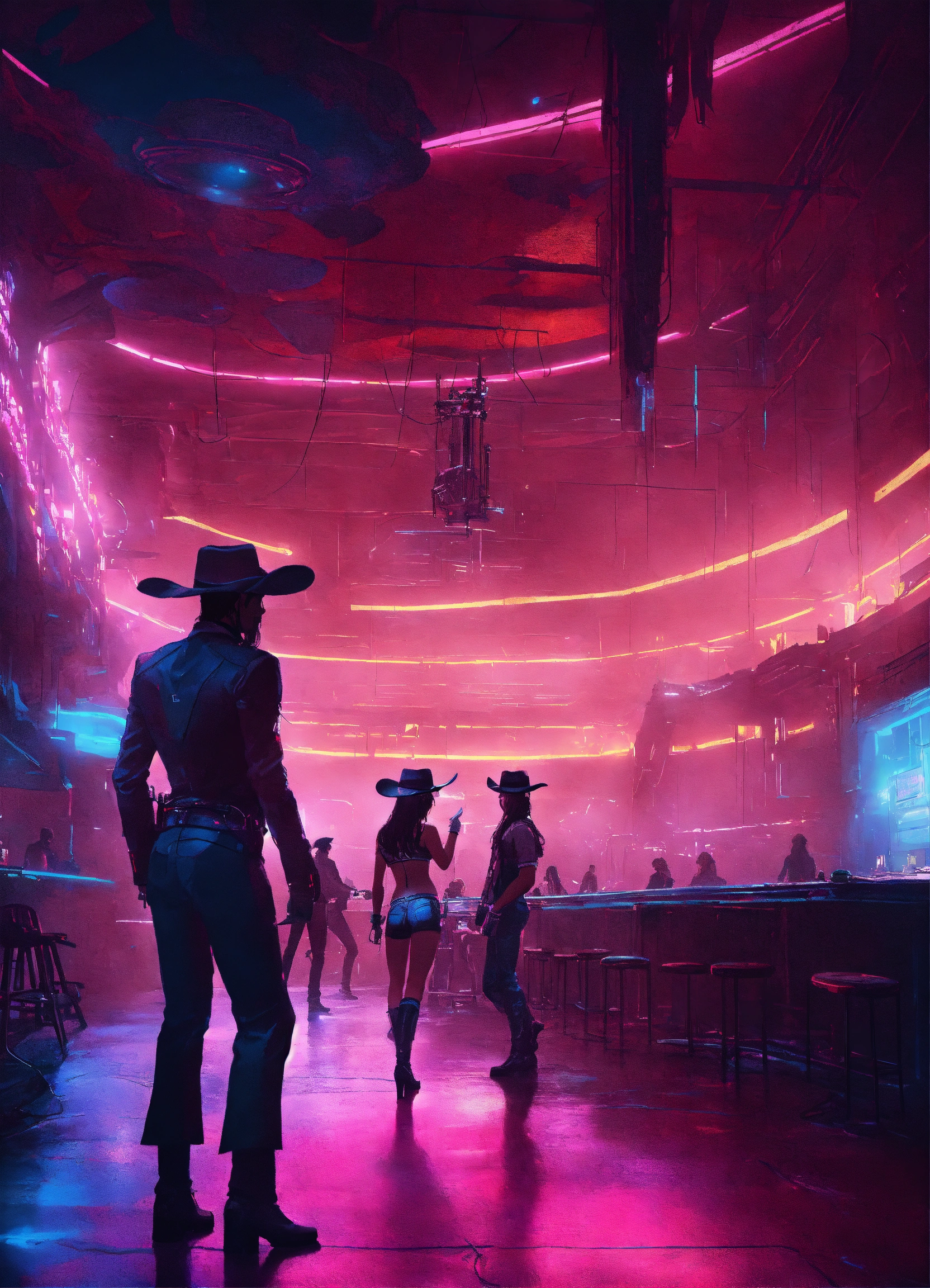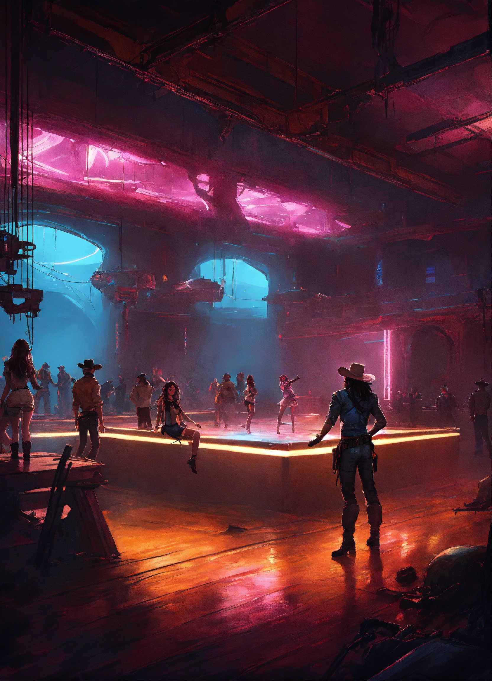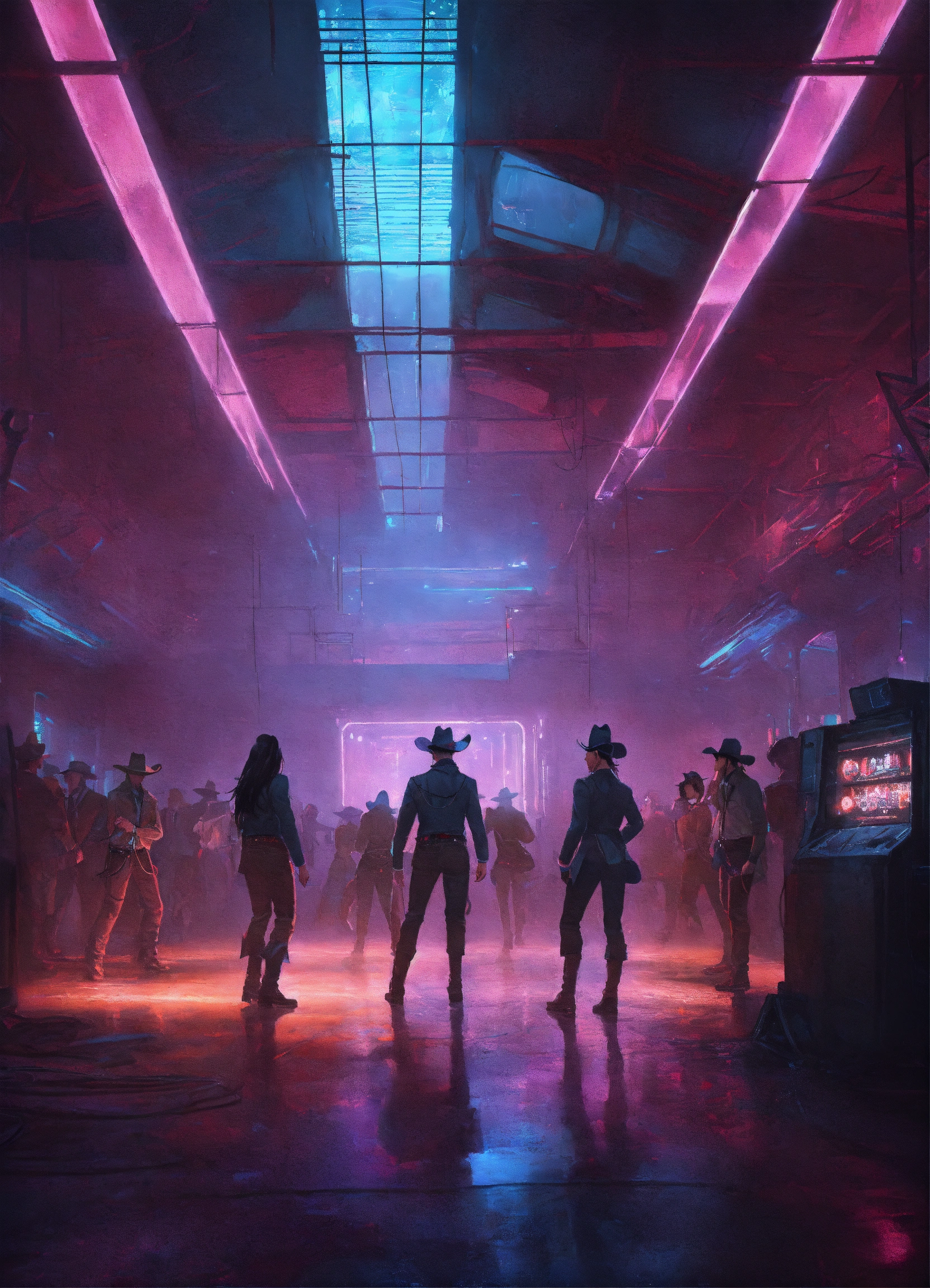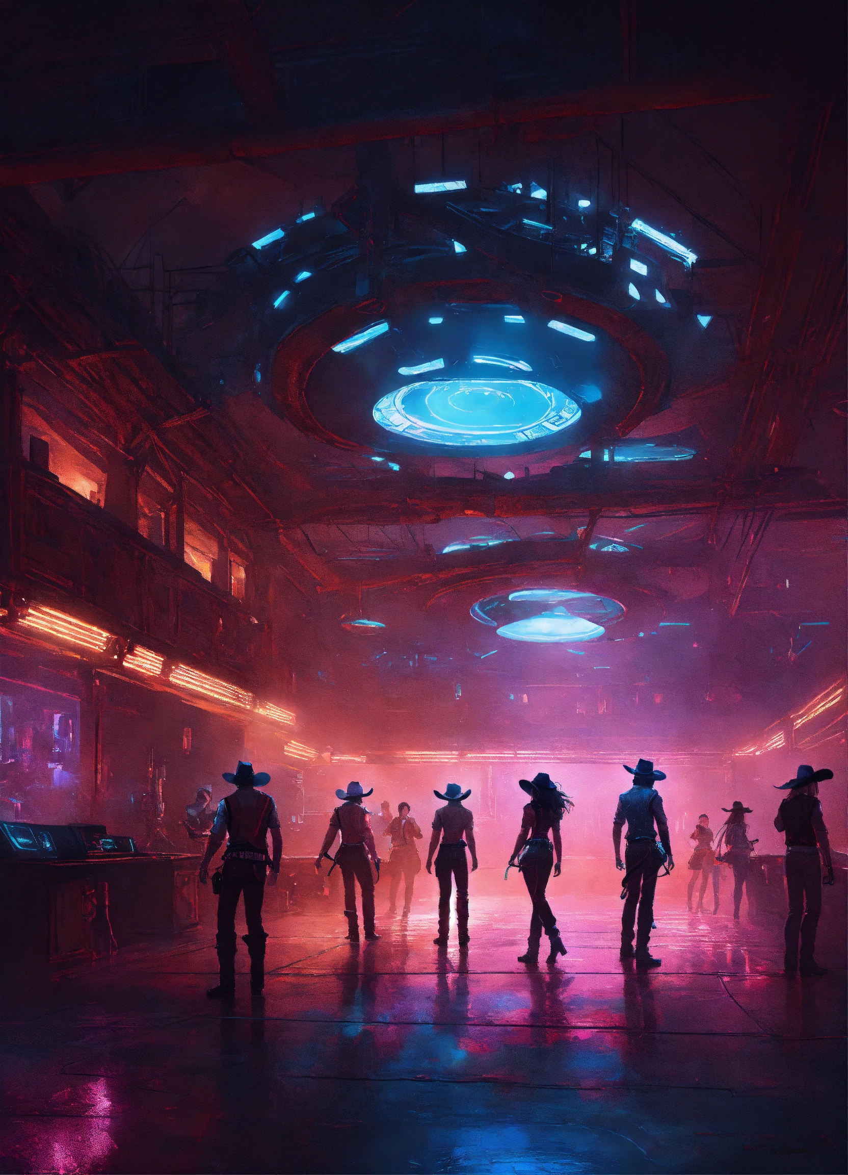 Futuristic cowboys and cyberpunk cowgirls line-dancing in a dark, dimly-lit, futuristic dance hall at night. the interior of the dance hall looks like the ruins of a spaceship. the interior lights glow blue, with hints of faded pink, and an eerie fog permeates the dance hall. the art style is oil on canvas. trending on artstation.