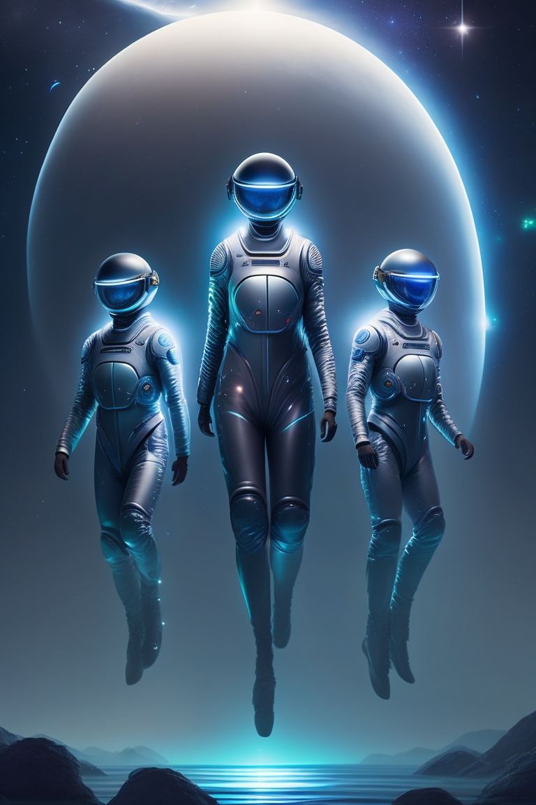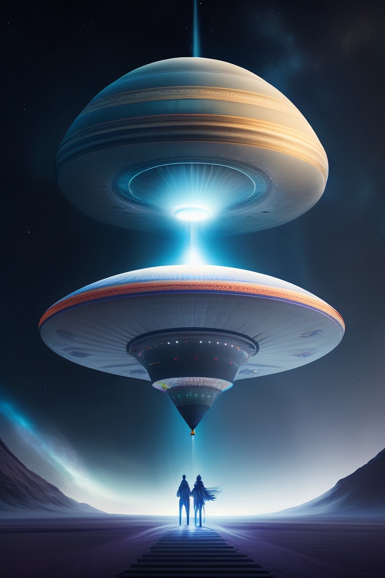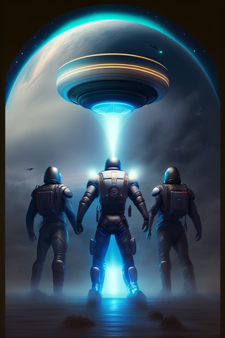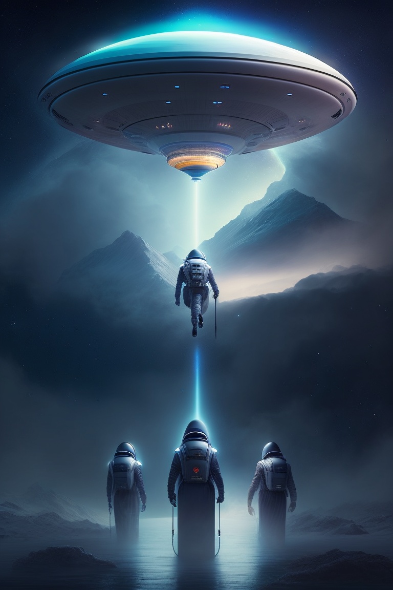Three gray aliens with silvery suits, holding a paralyzed man, floating up to a massive ufo in the night sky