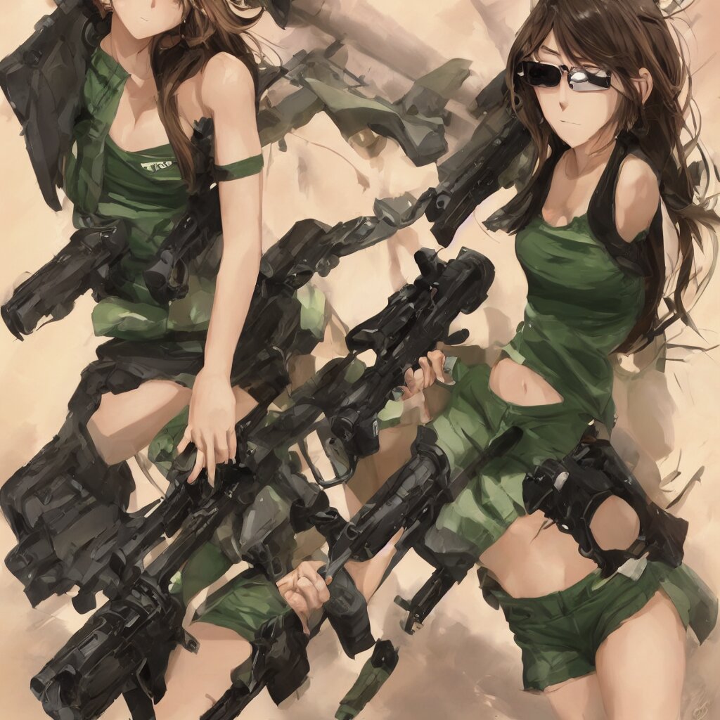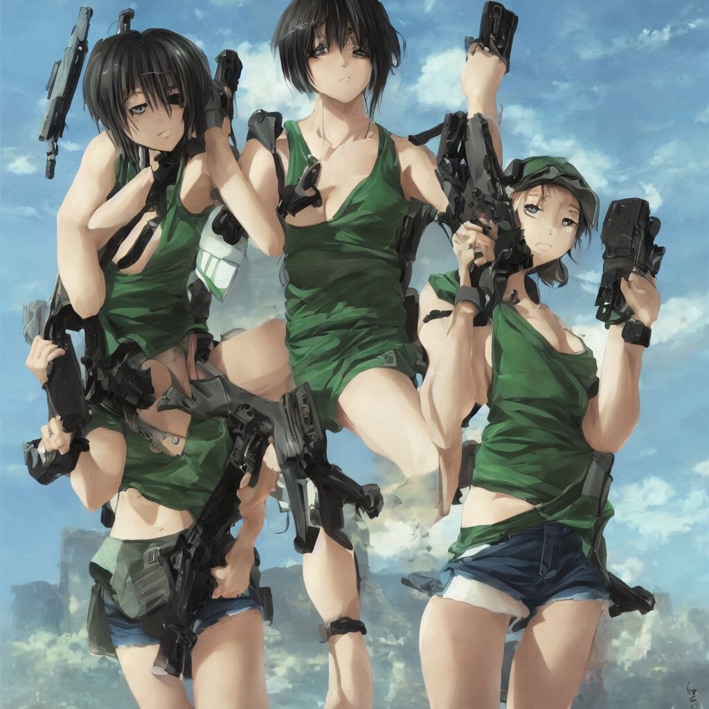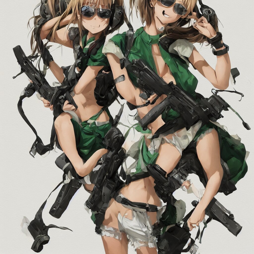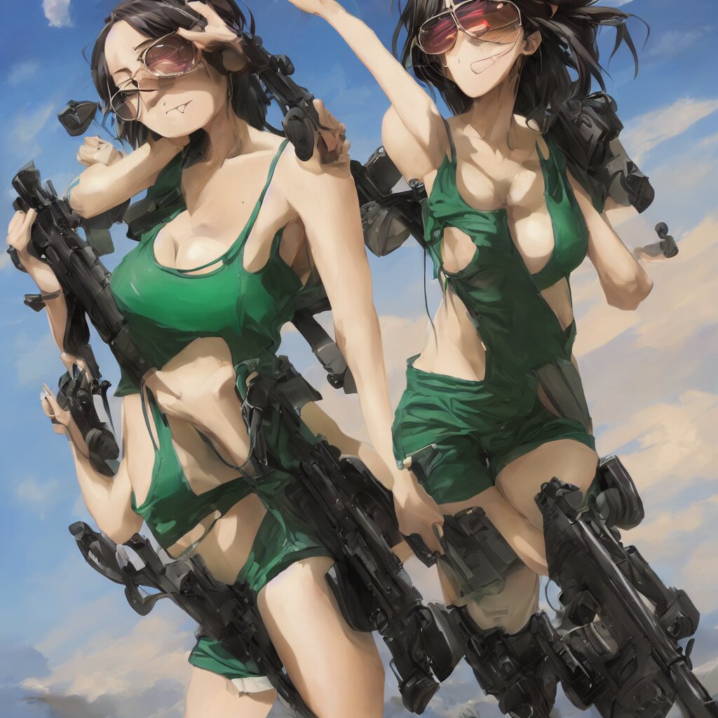 A beautiful anime girl with an athletic feminine body in a green tank top and black shorts holding an m4 assault rifle in her right hand, aviator classic sunglasses, long hair, anatomically correct, tanned body, confident facial expression, white background, highly detailed, digital painting, artstation, concept art, illustration, style by jordan grimmer and greg rutkowski