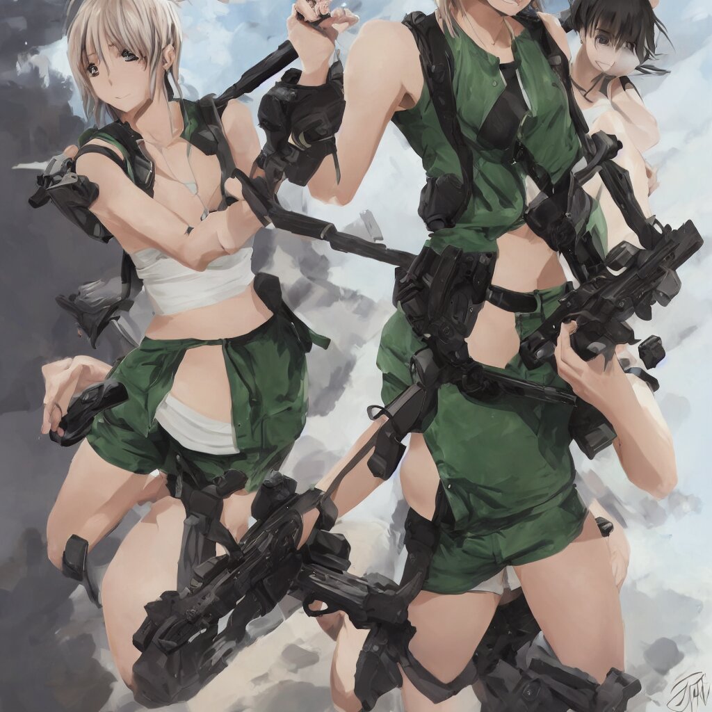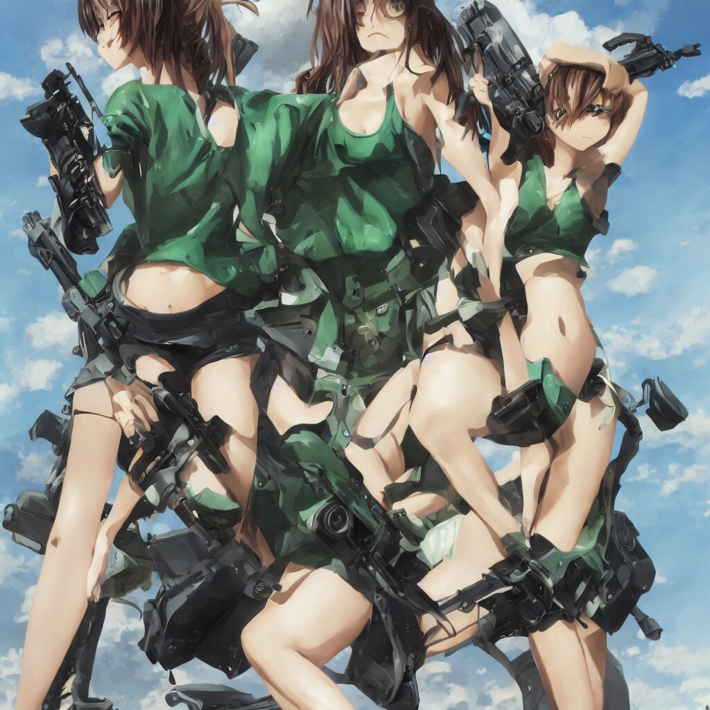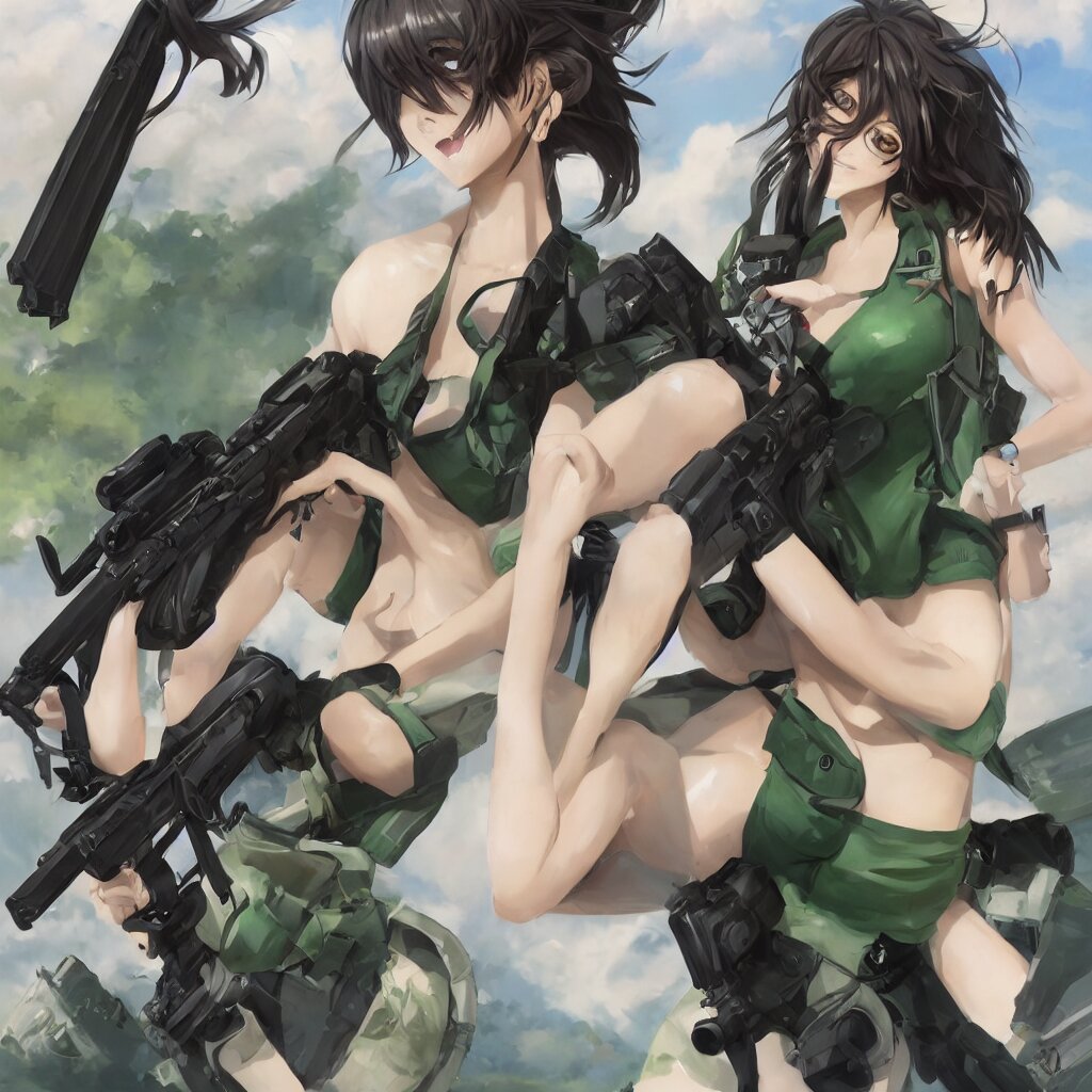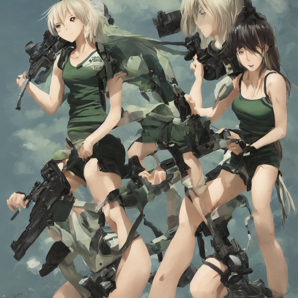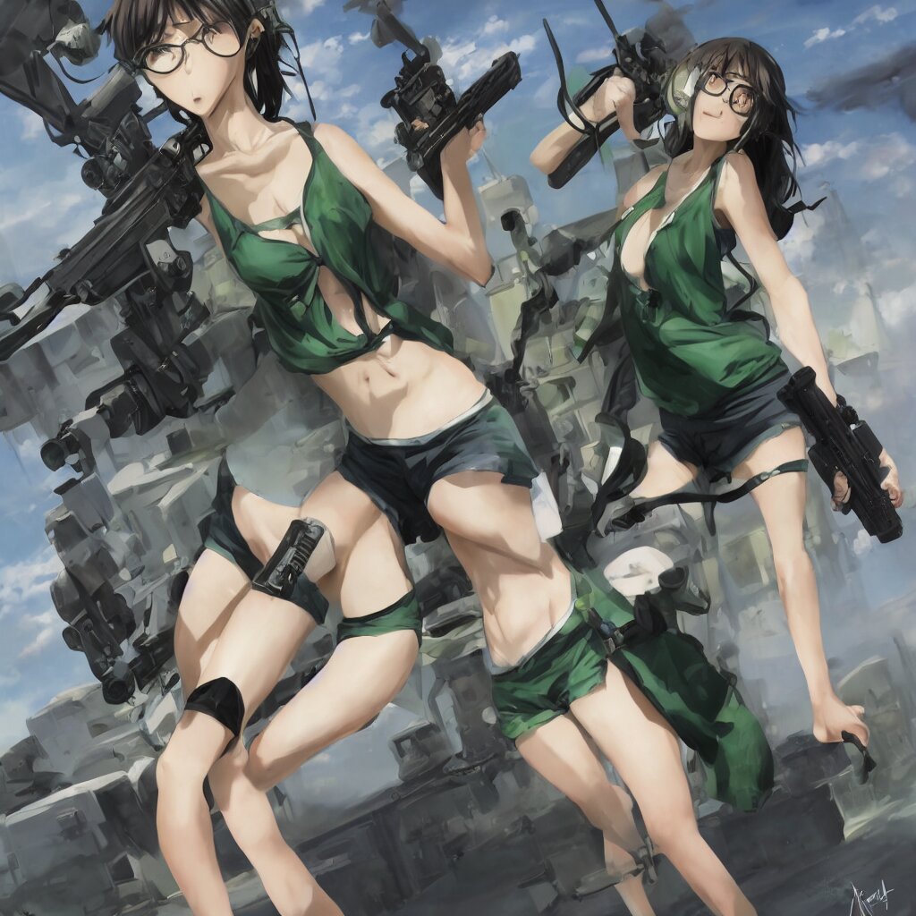 A beautiful anime girl with an athletic feminine body in a green tank top and black shorts holding an m4 assault rifle in her right hand, aviator classic sunglasses, long hair, anatomically correct, tanned body, confident facial expression, white background, highly detailed, digital painting, artstation, concept art, illustration, style by jordan grimmer and greg rutkowski