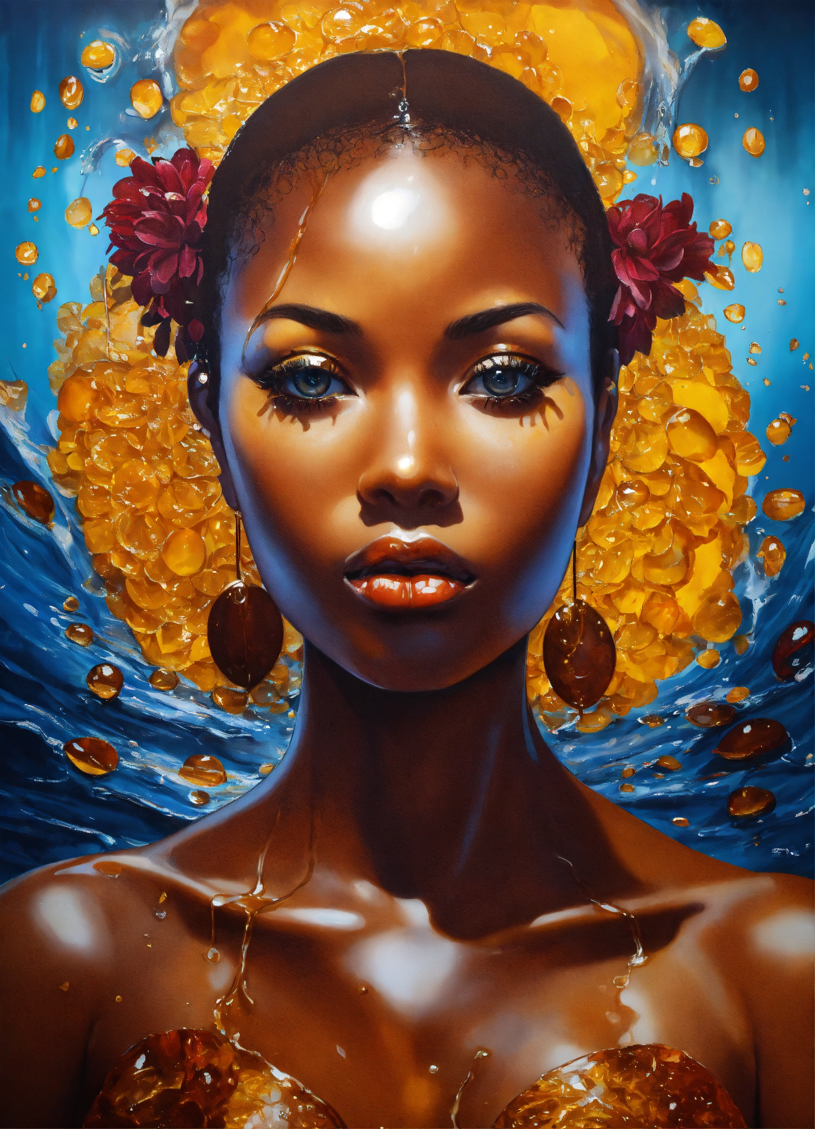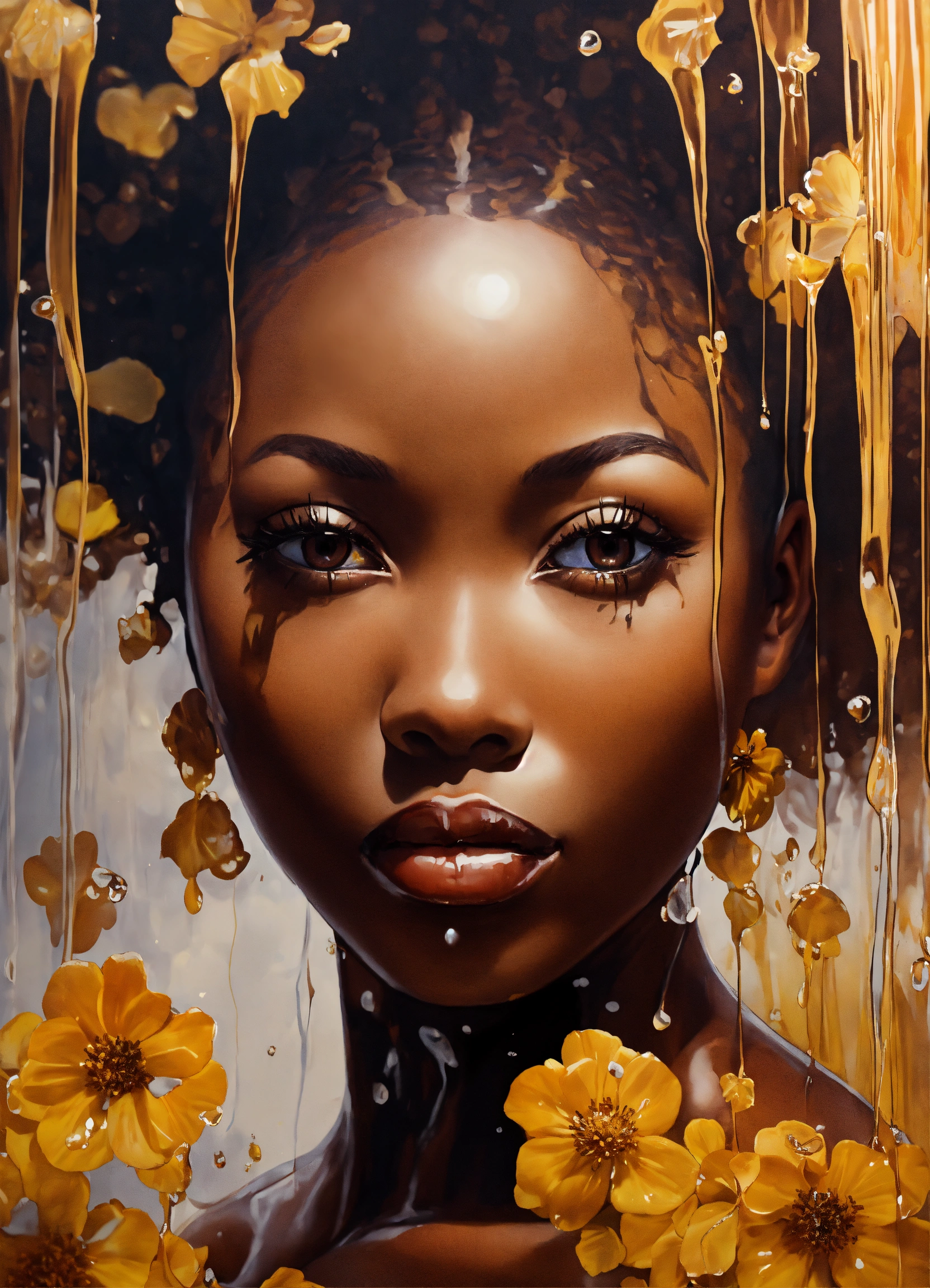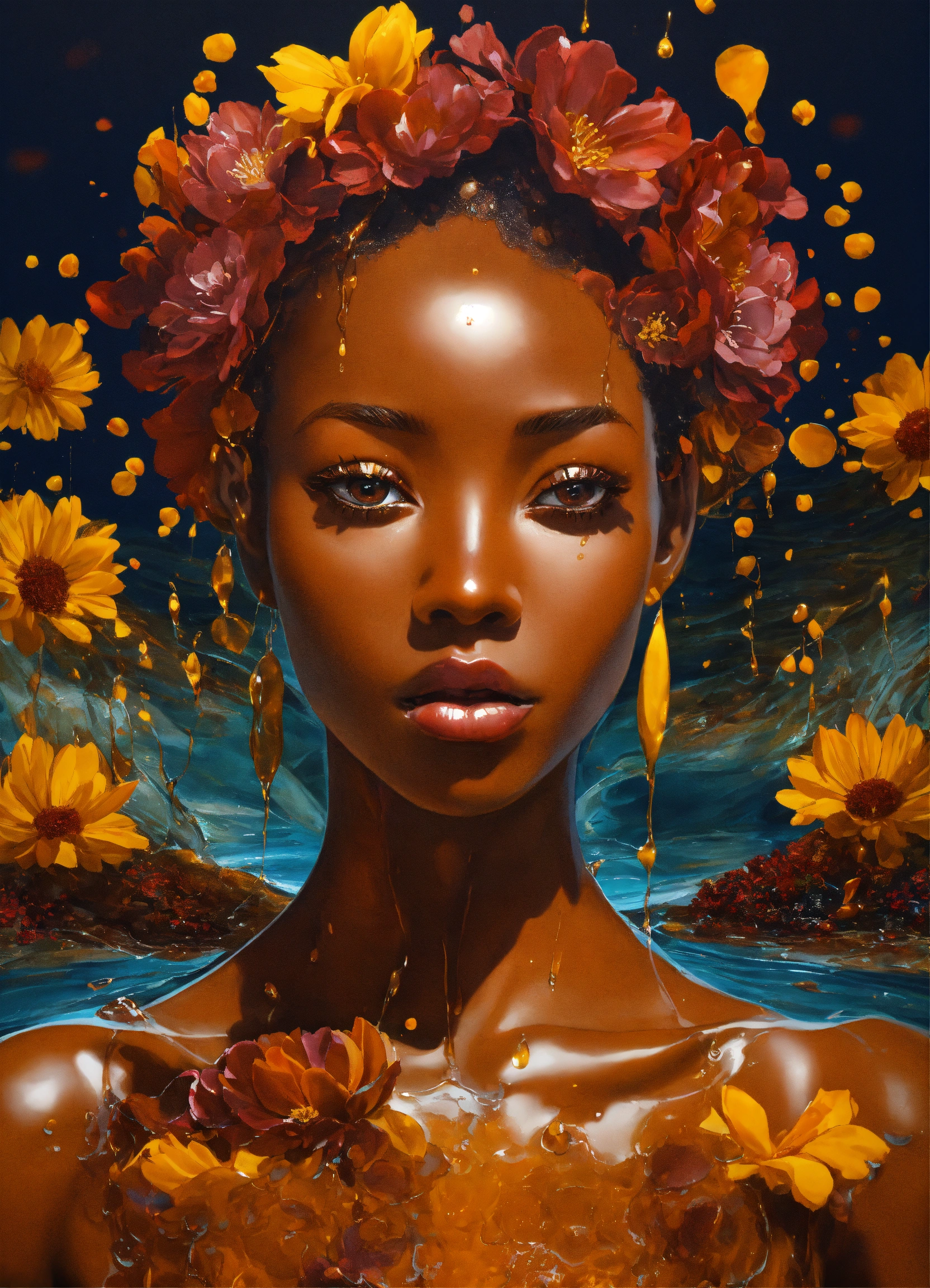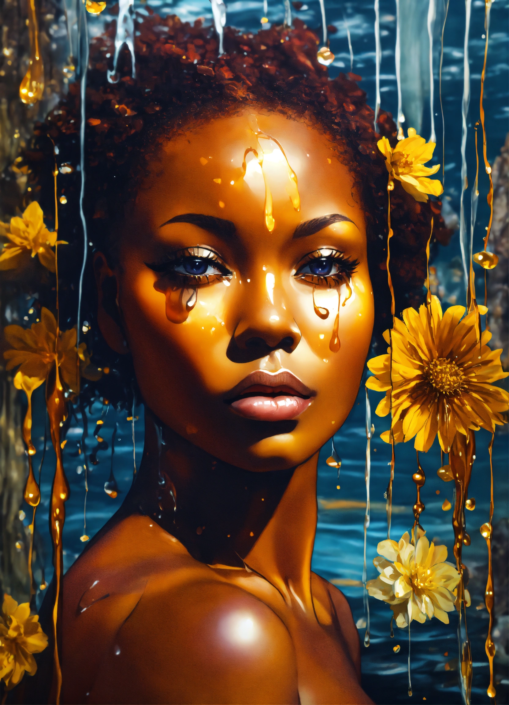 Deep mahogany dark complexion afrocentric woman, made of amber glass with honey flowing through her visible veins, surrounded by splashing waters and dripping motor oil like substance flowing over her with winter blooming flower petals sticking at various pulse points, 3d art, this art work tells a story of the beauty of women shining through and enduring strength. subject is facing towards the observer with slight smile and knowledgeable eyes. rule of thirds. front facing wide angle. kewpie kawaii
