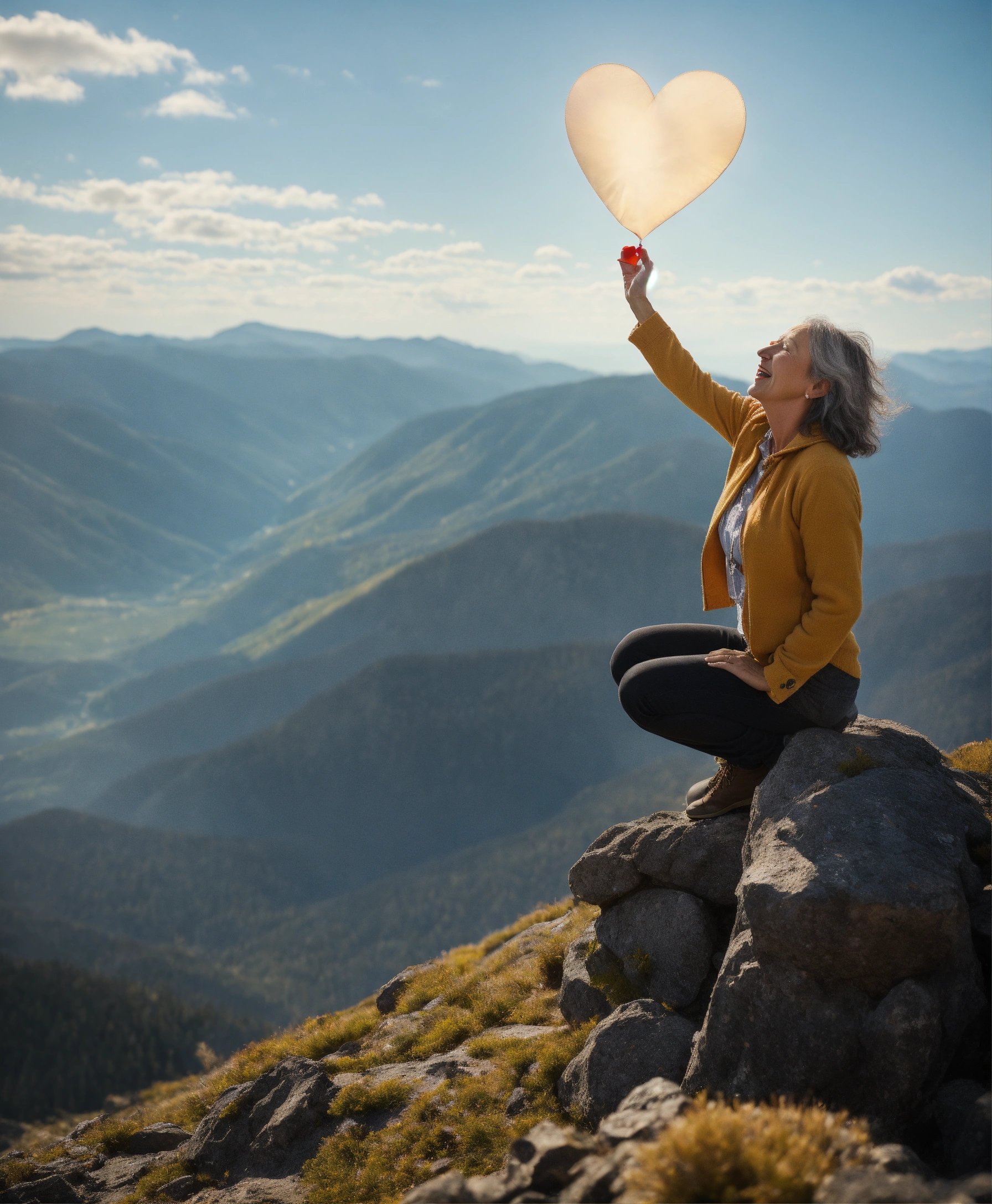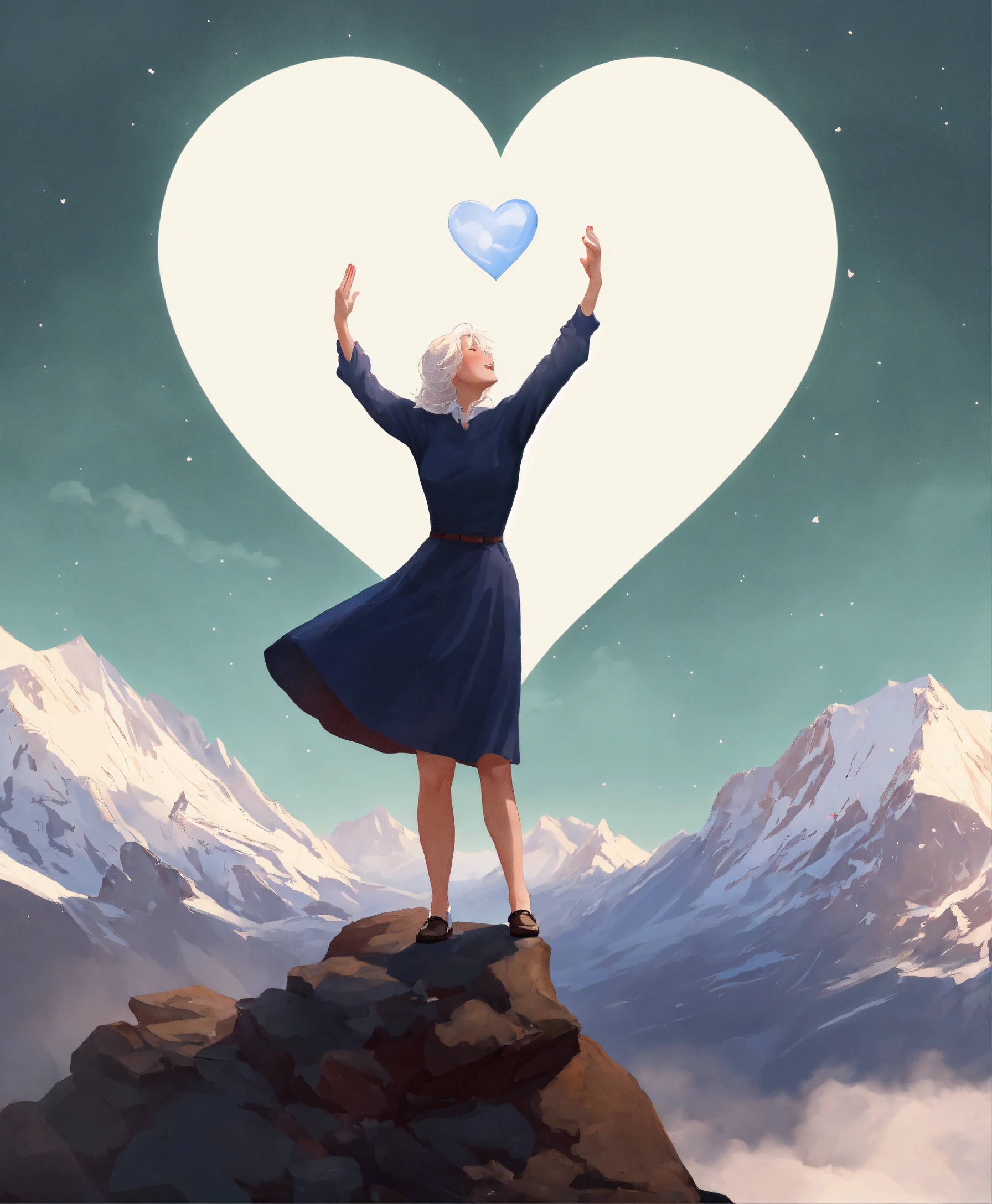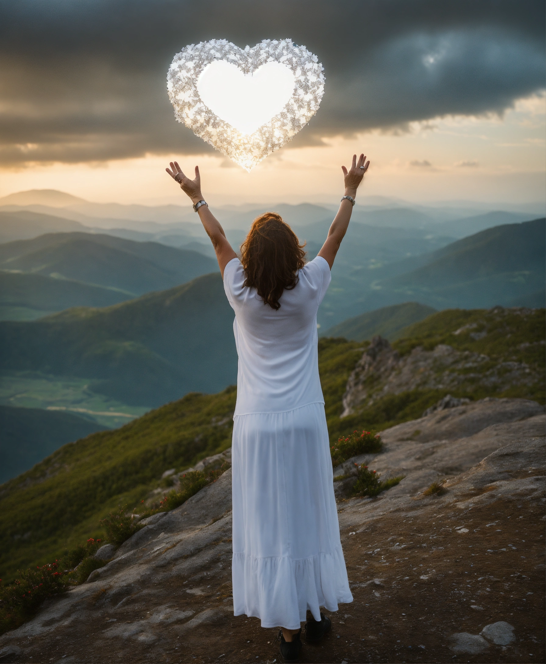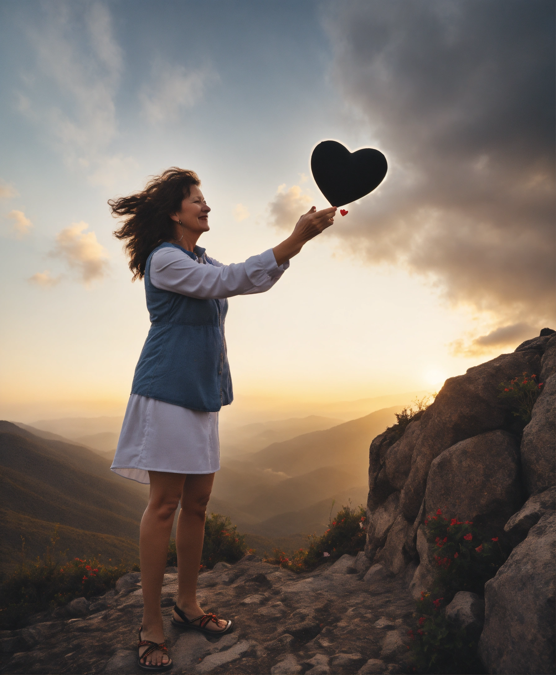 At the top of a mountain, a middle-aged woman throws the white heart in the air, saying, "our heart is not black, rather, it is white."