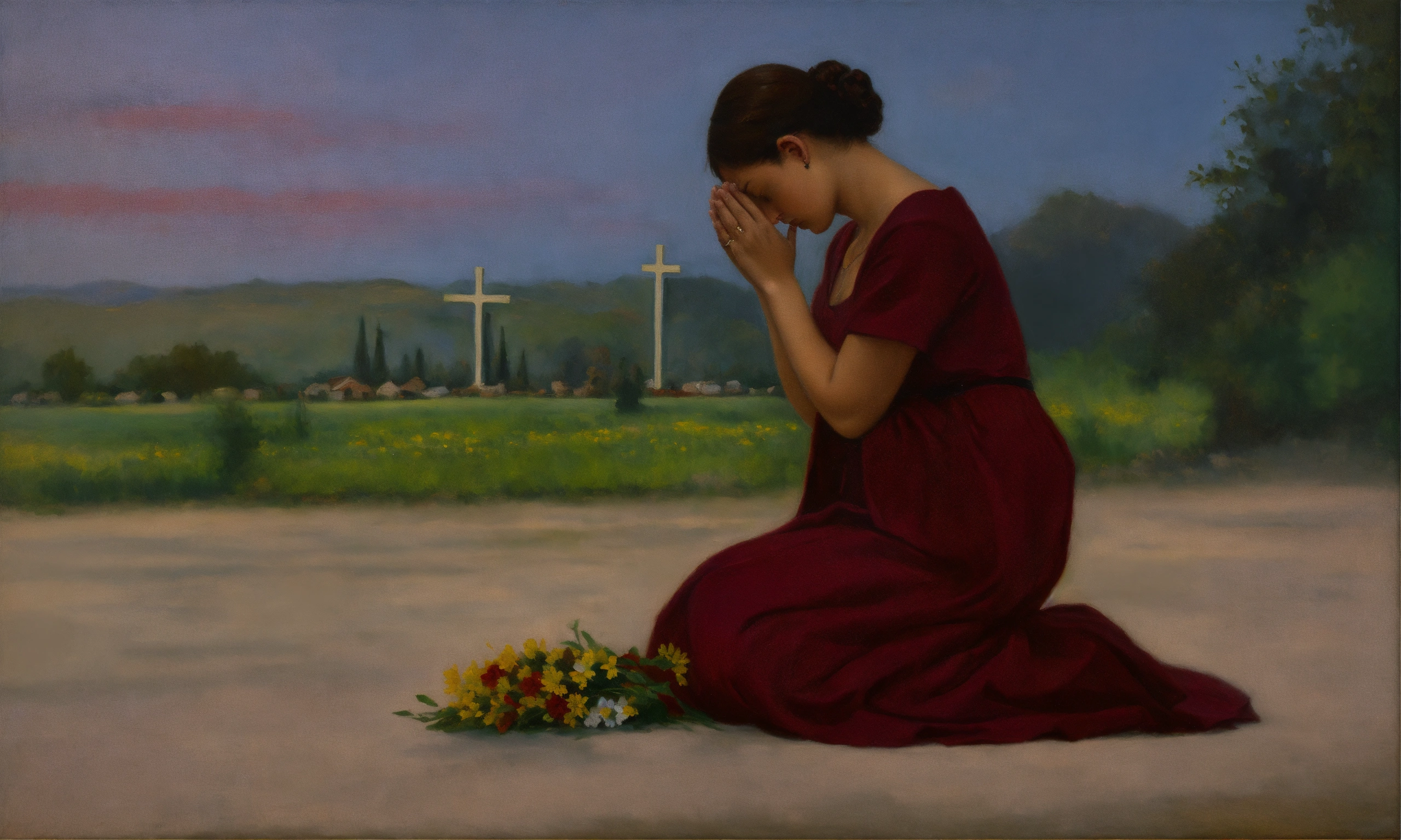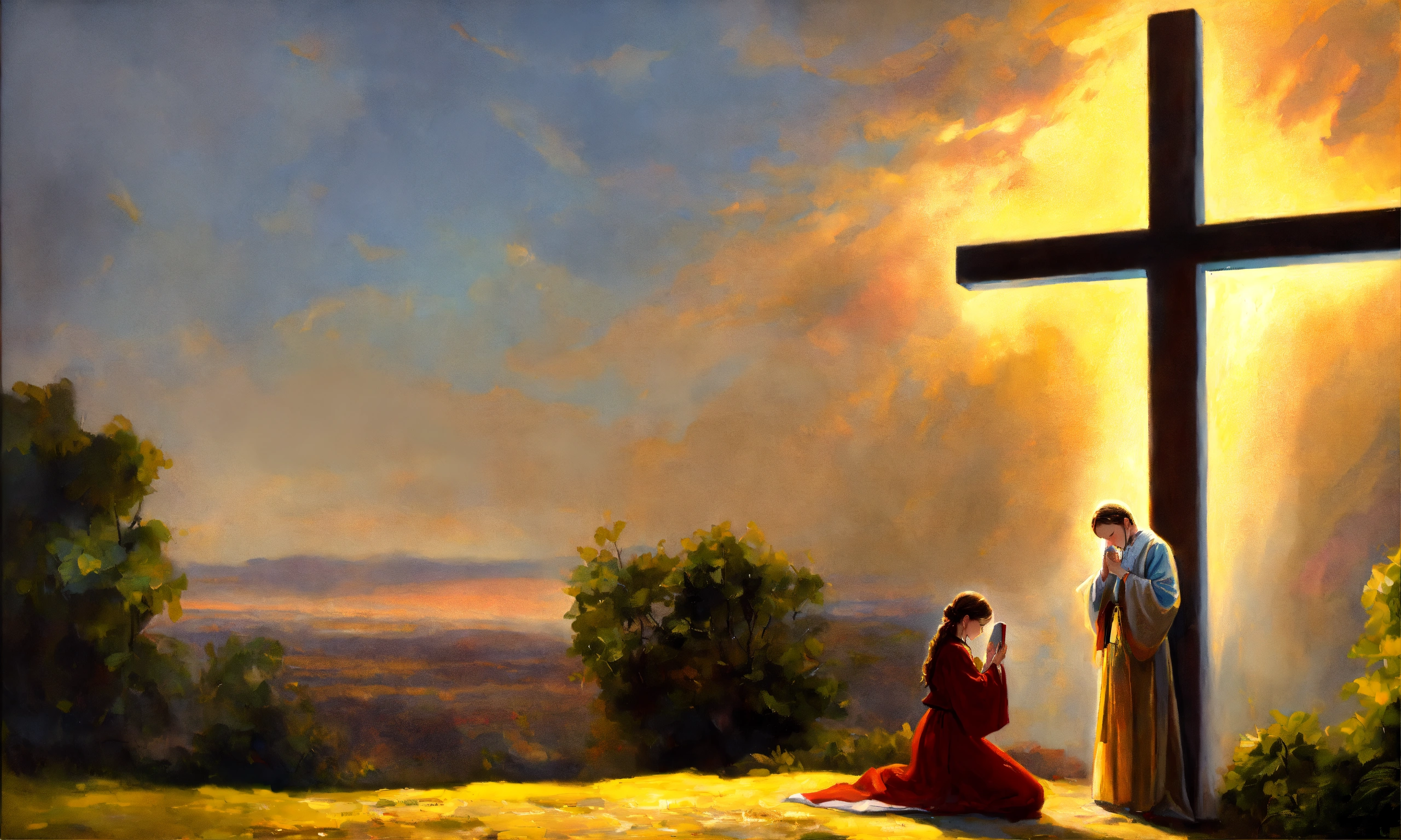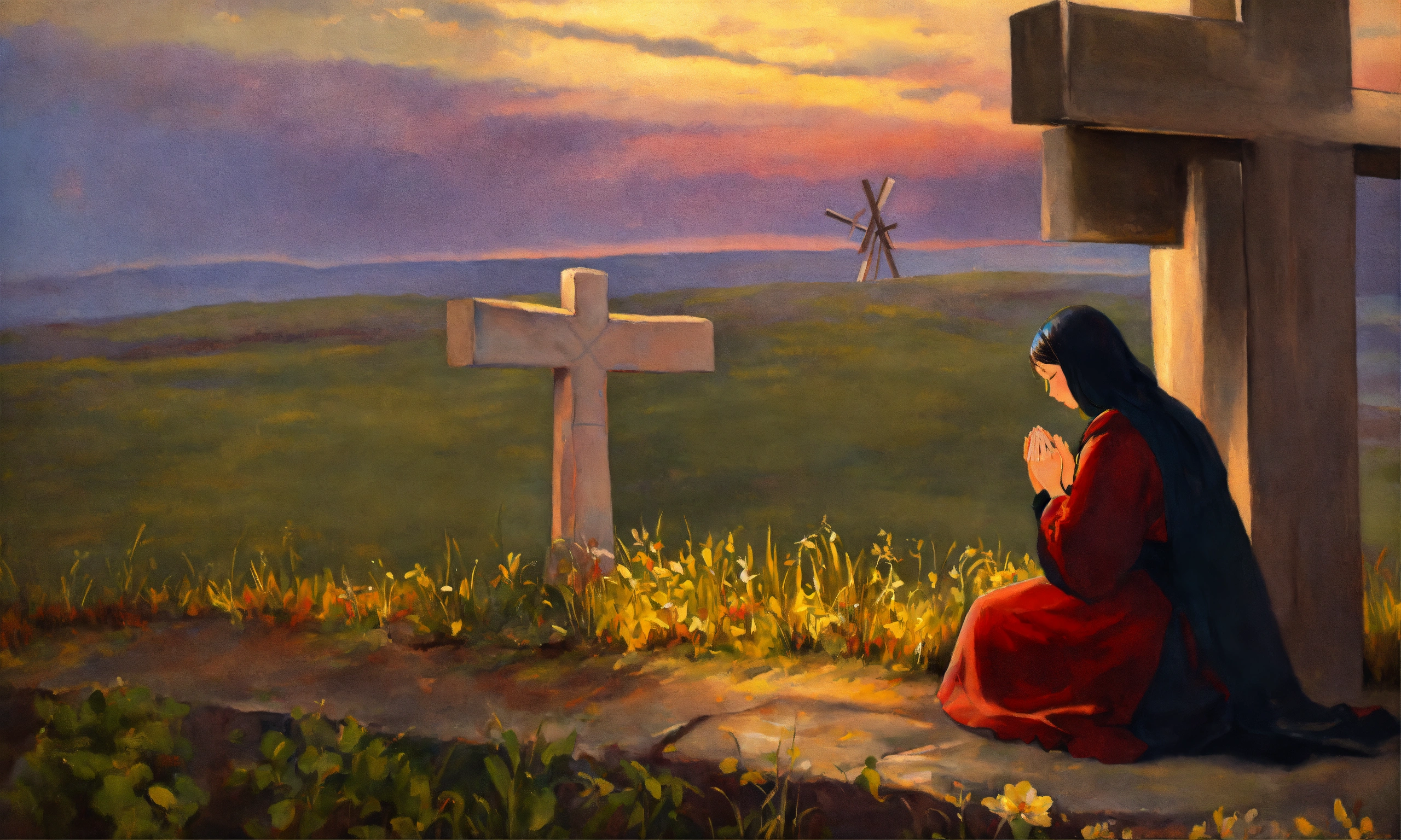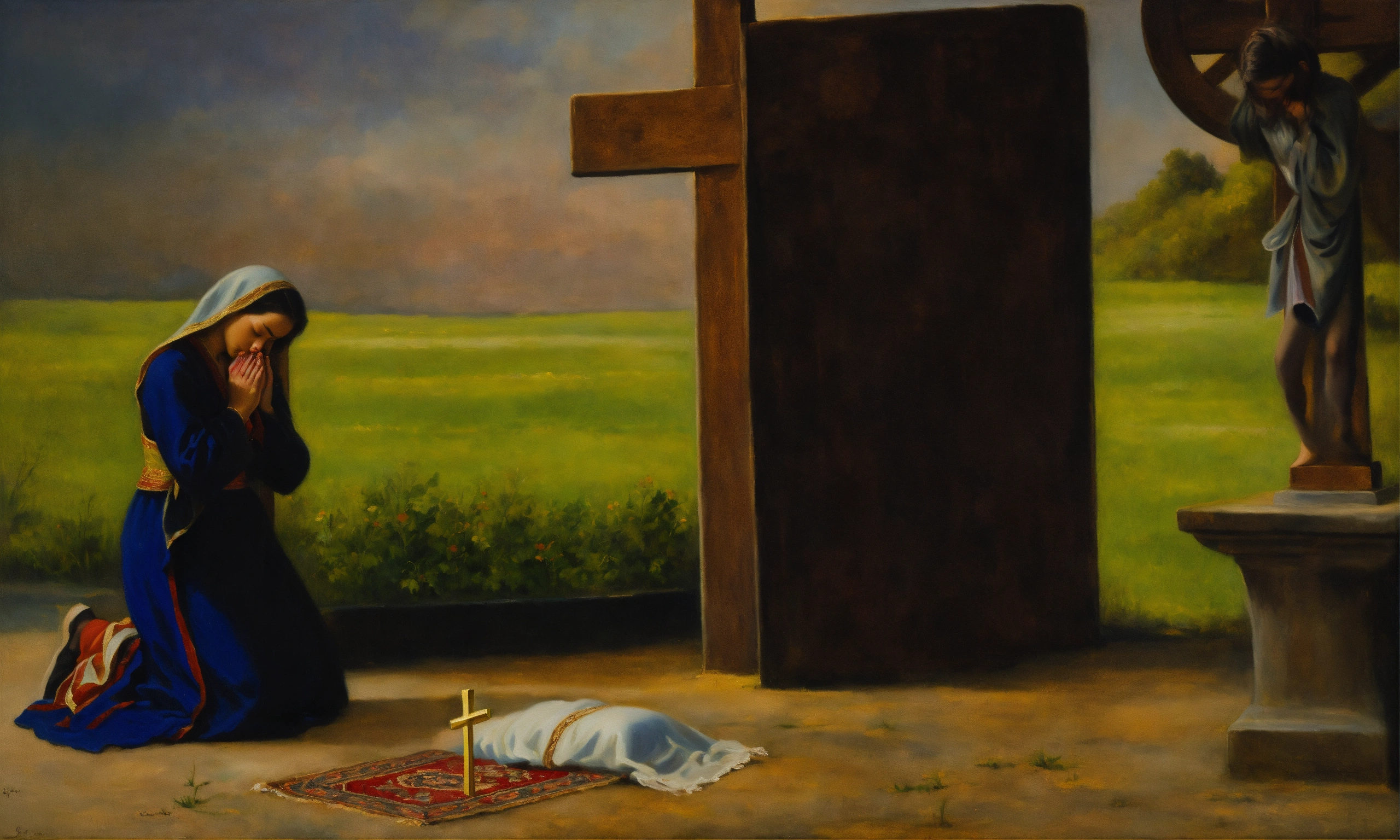 Oil painting of a woman praying in front of a cross