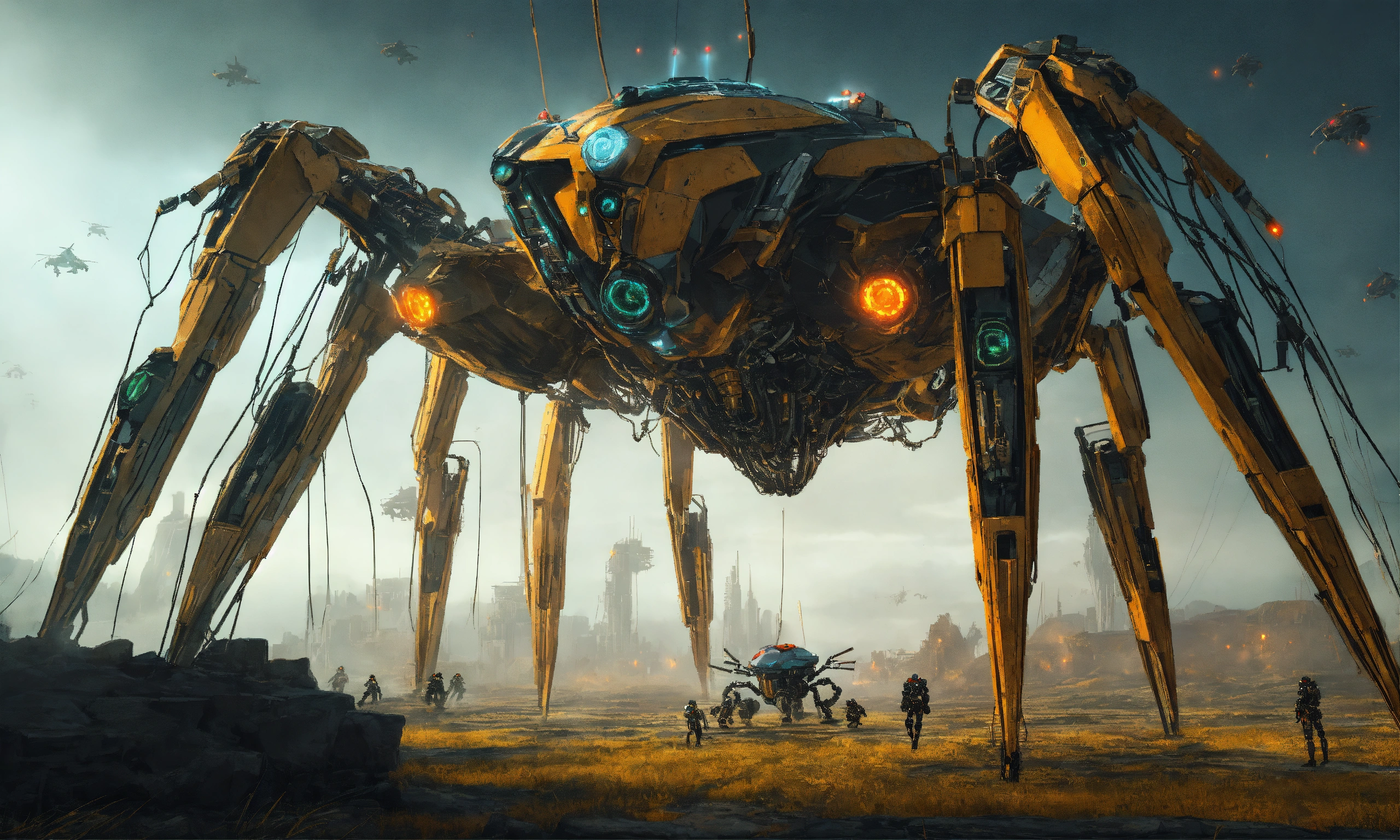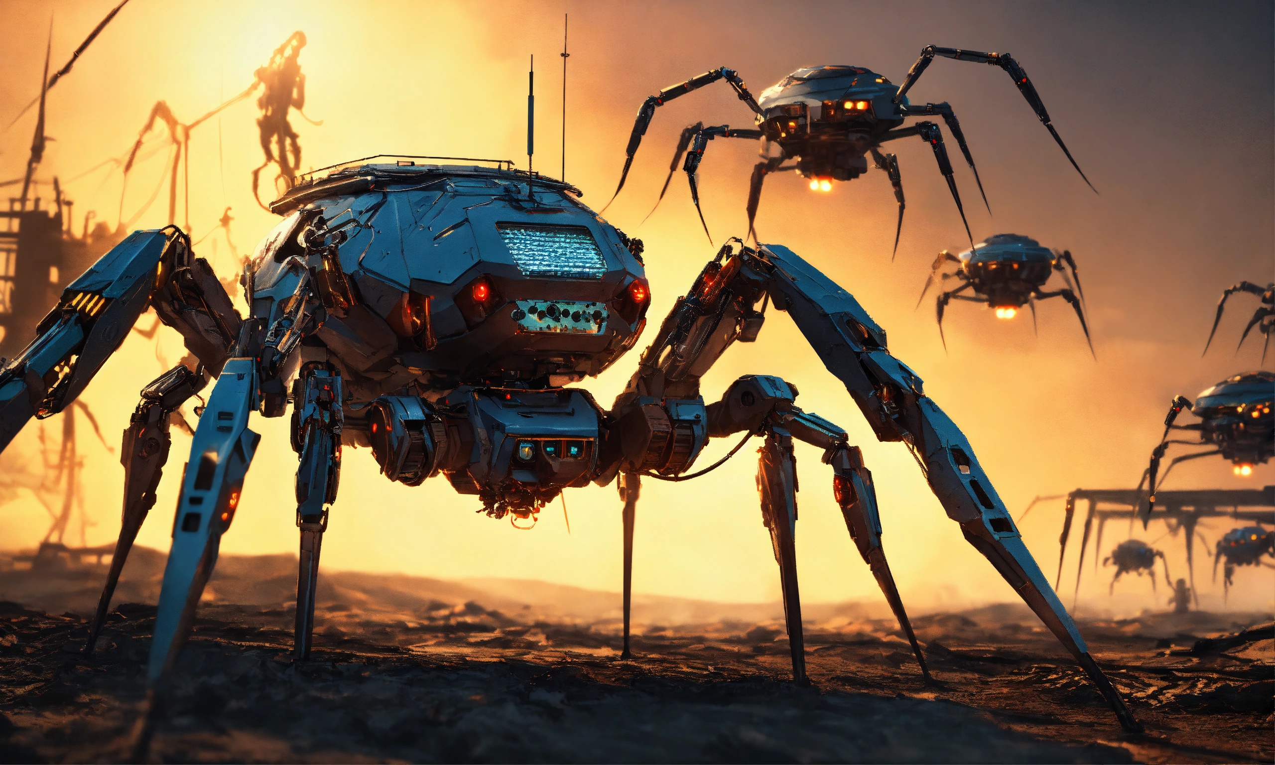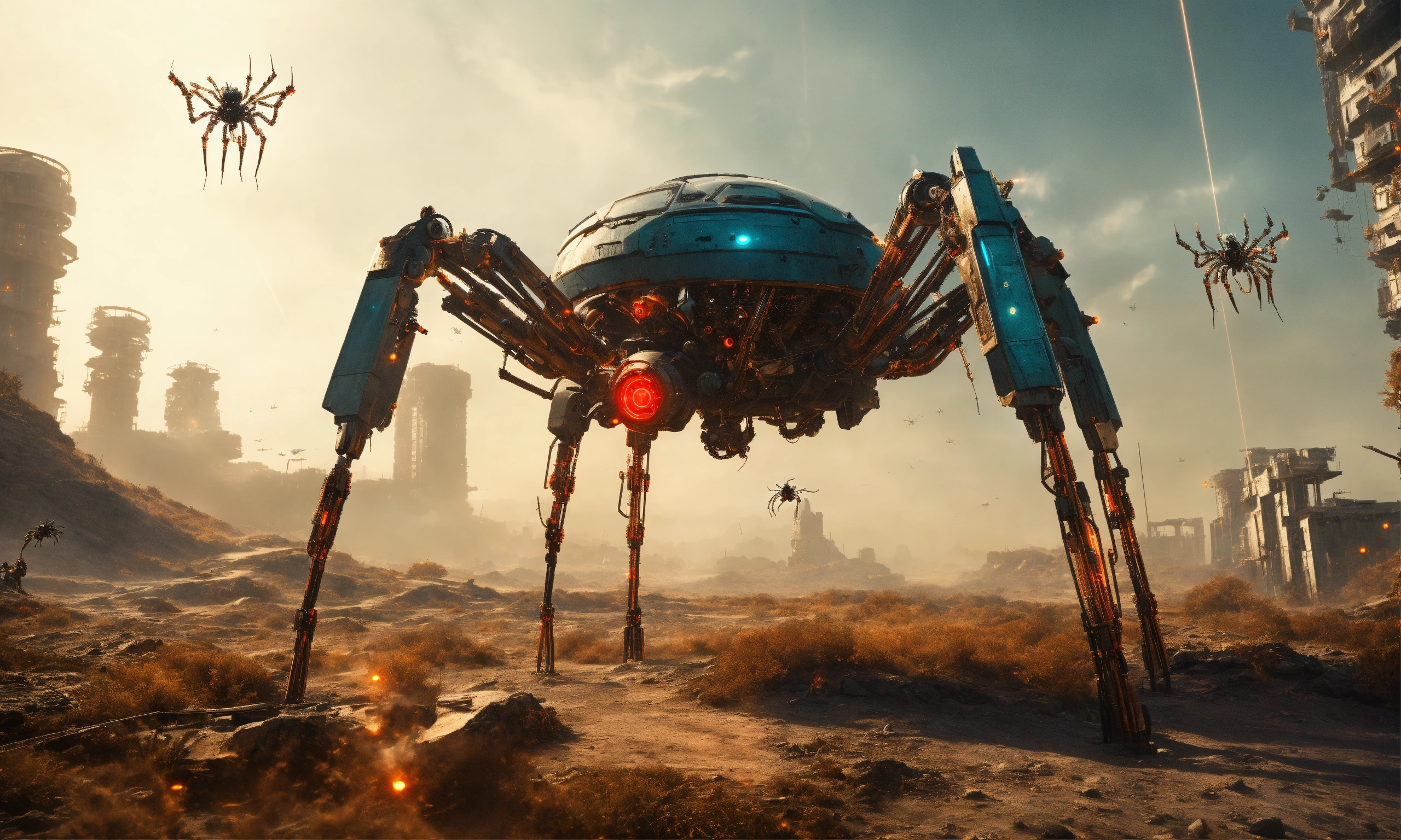 Swarms of robotic spider creatures with biomechanical enhancements, futuristic, shooting lasers, post-apocalyptic landscape