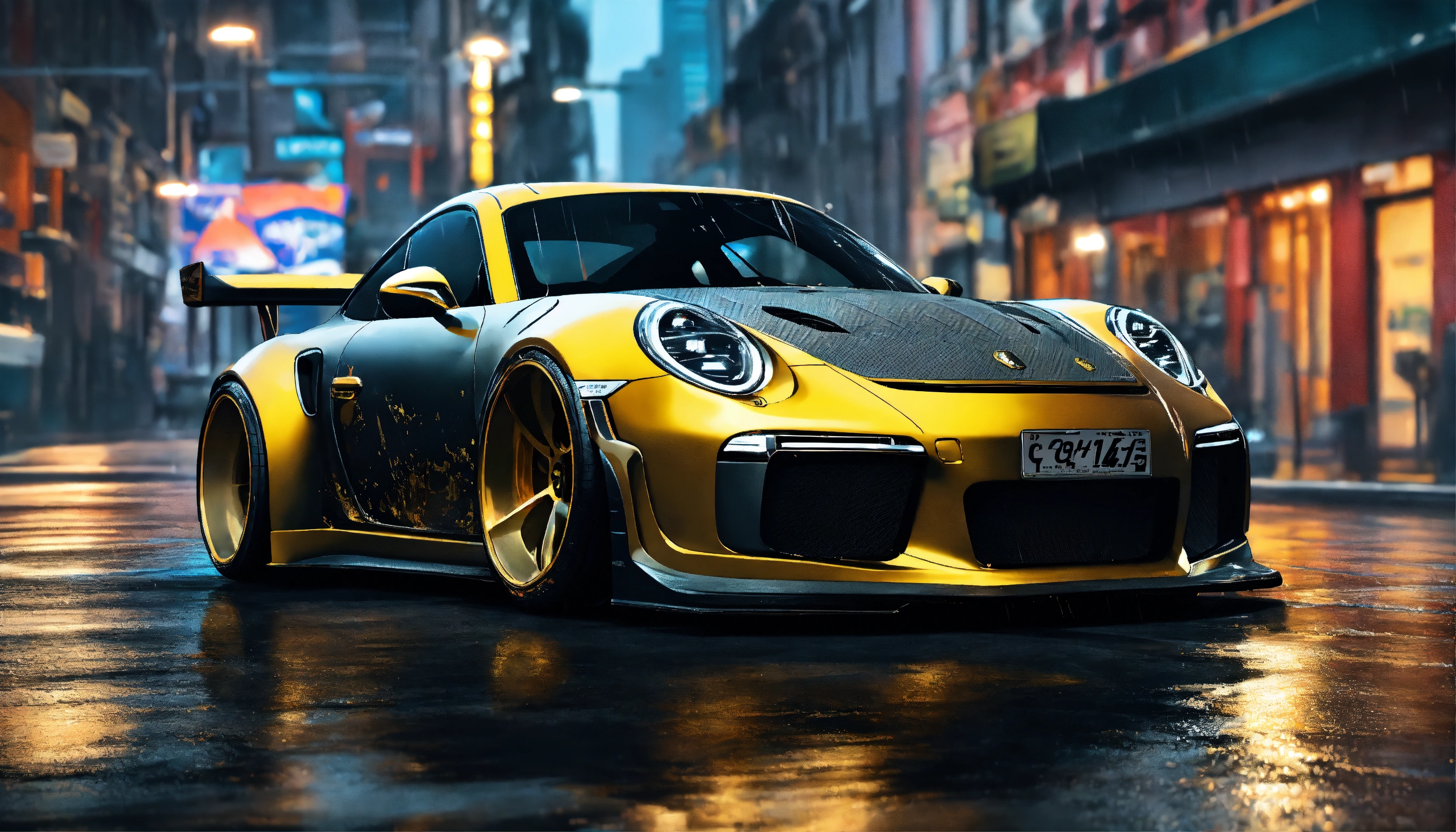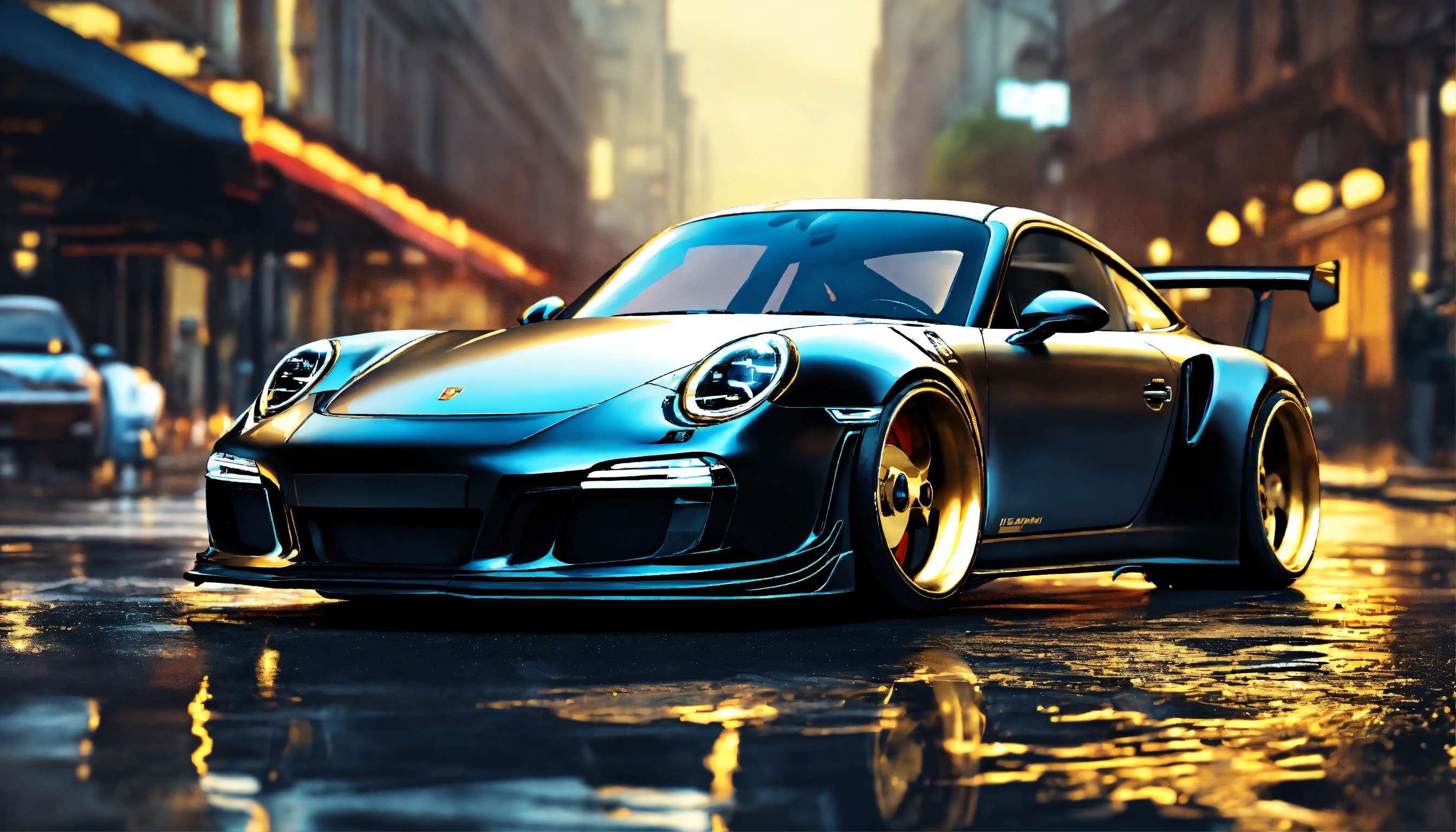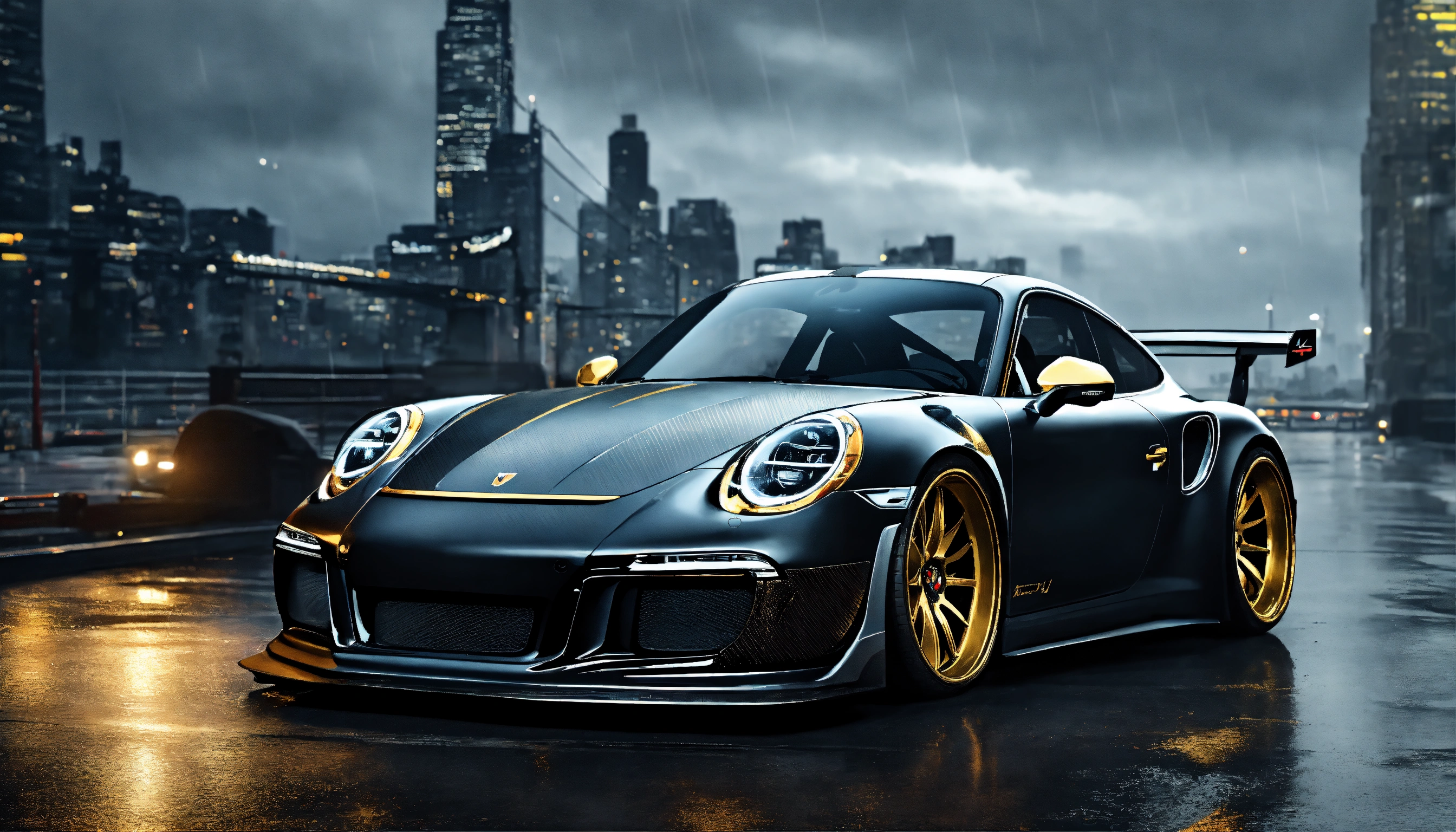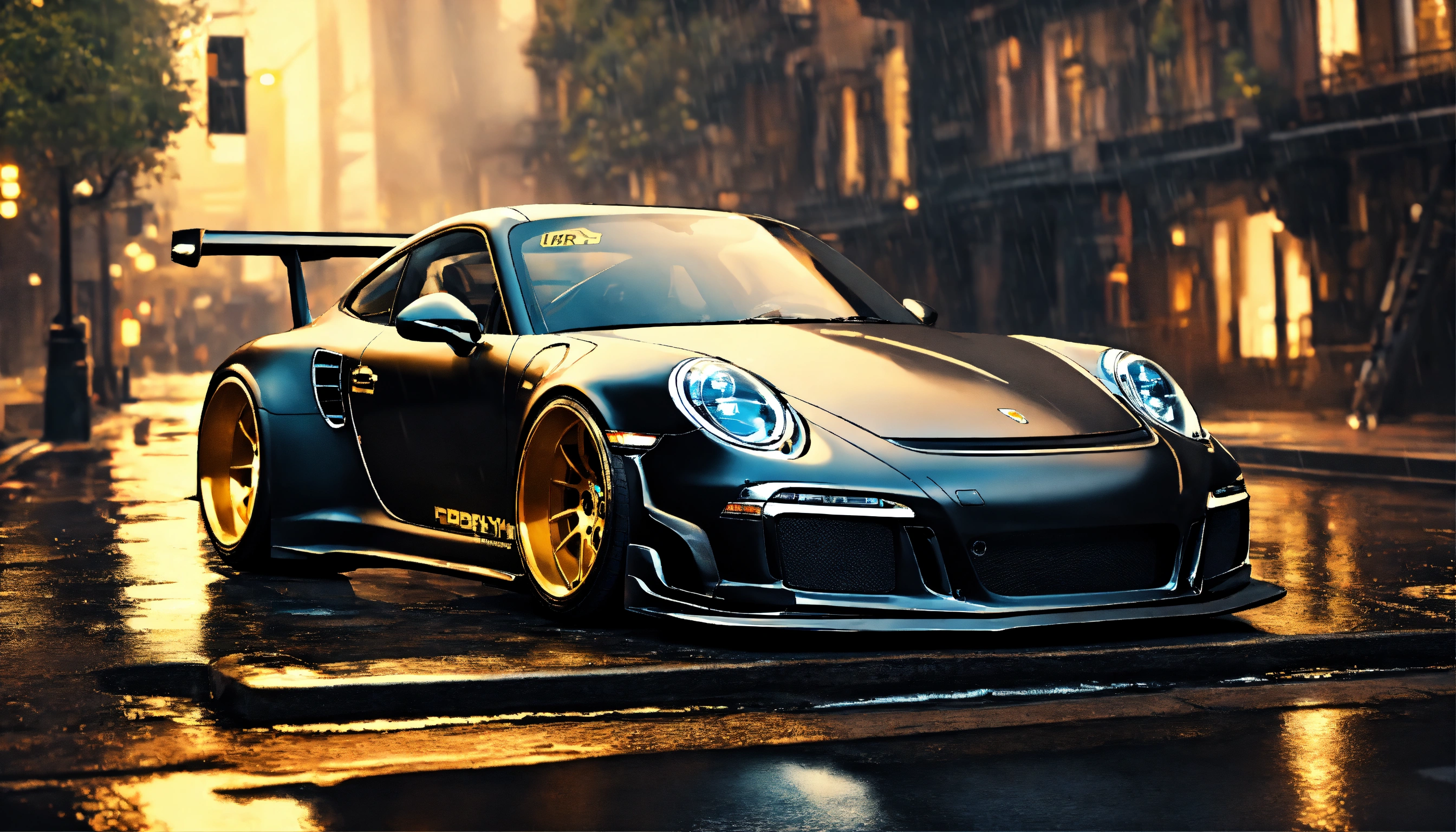 Motion art, matte black carbon fibre with gold details, highly realistic liberty walk tuning widebody porsche 911, very intricate details, elegant, sharp edges, heavy rain, dark medievil city background, low saturation colors, highly detailed