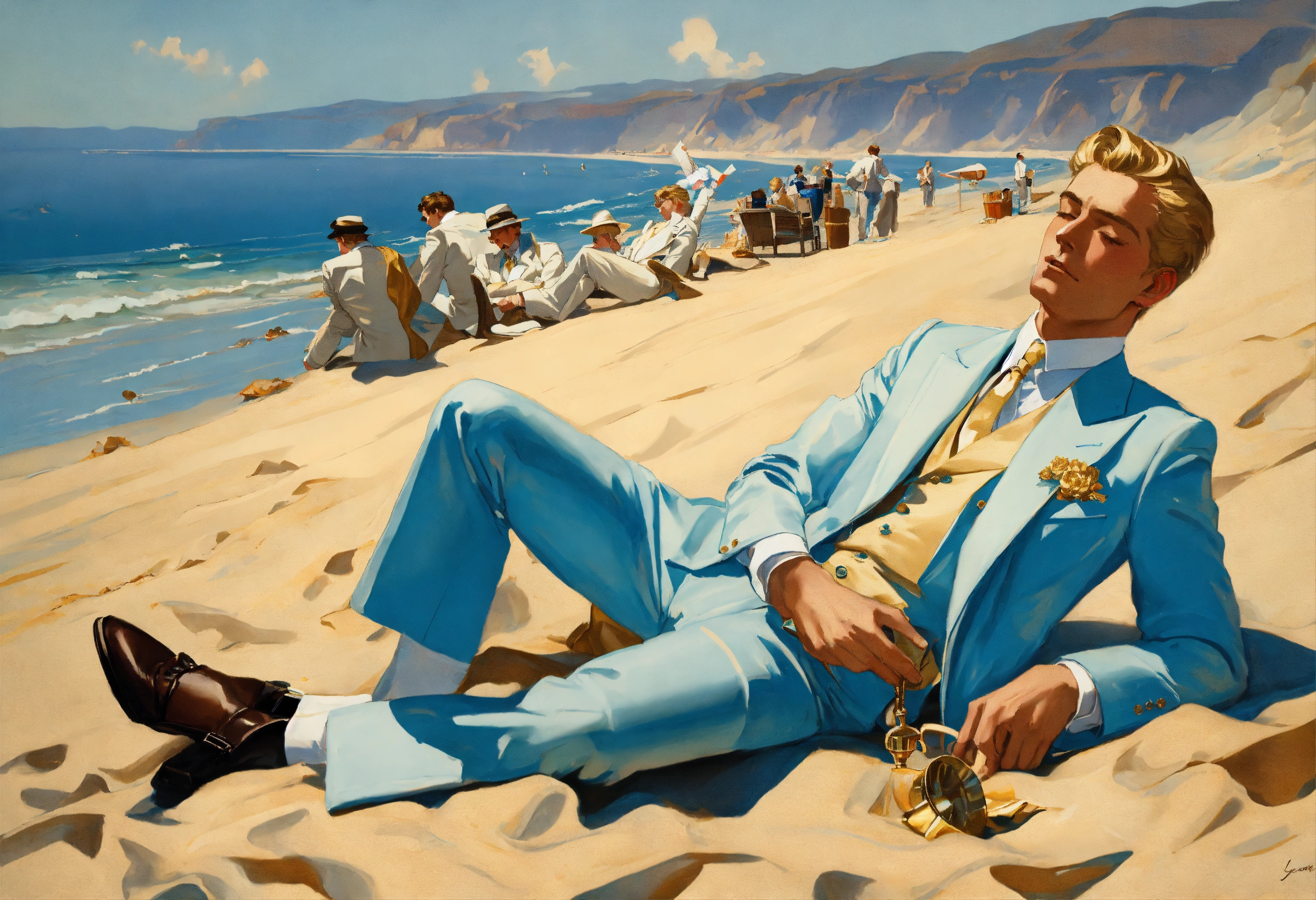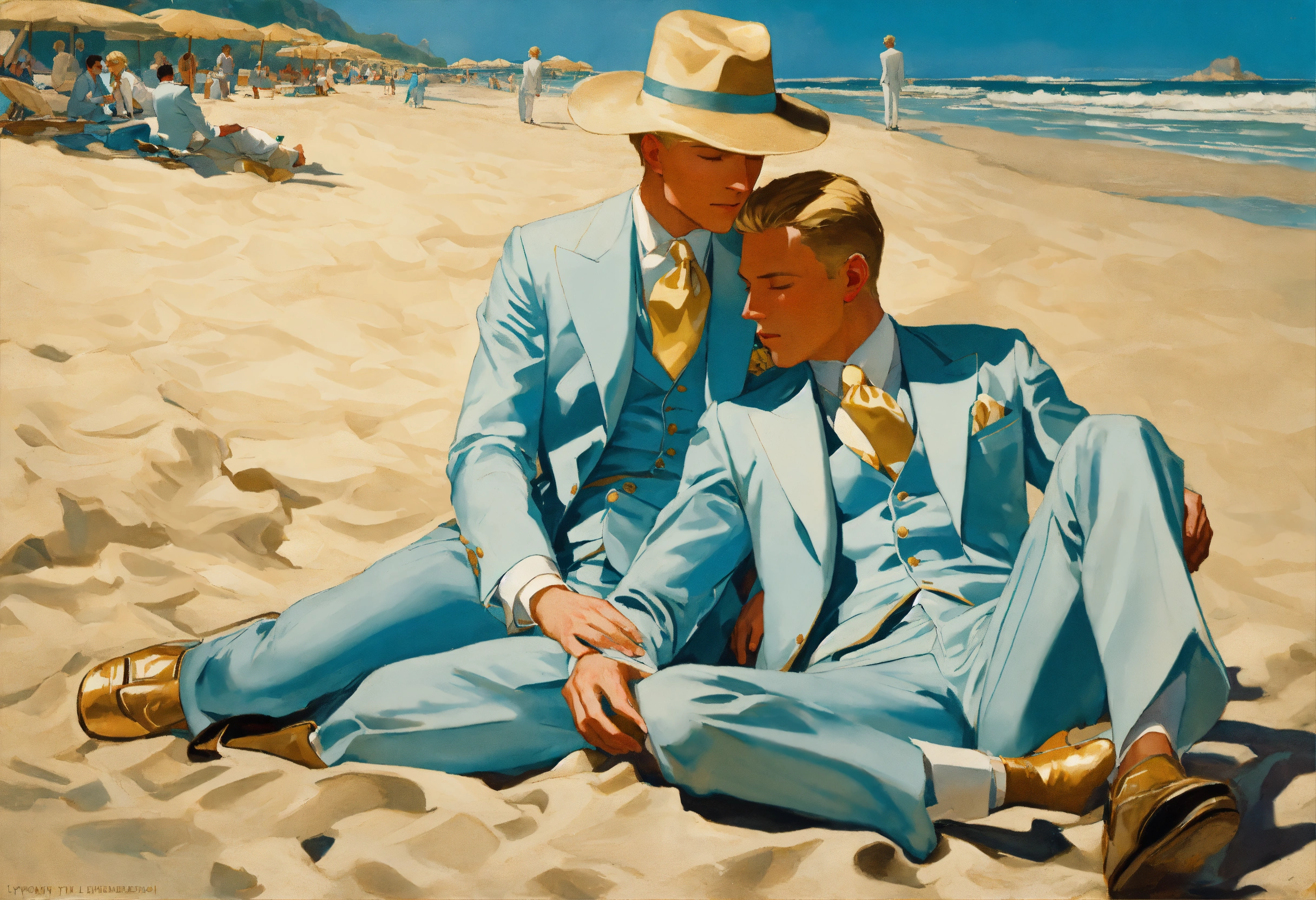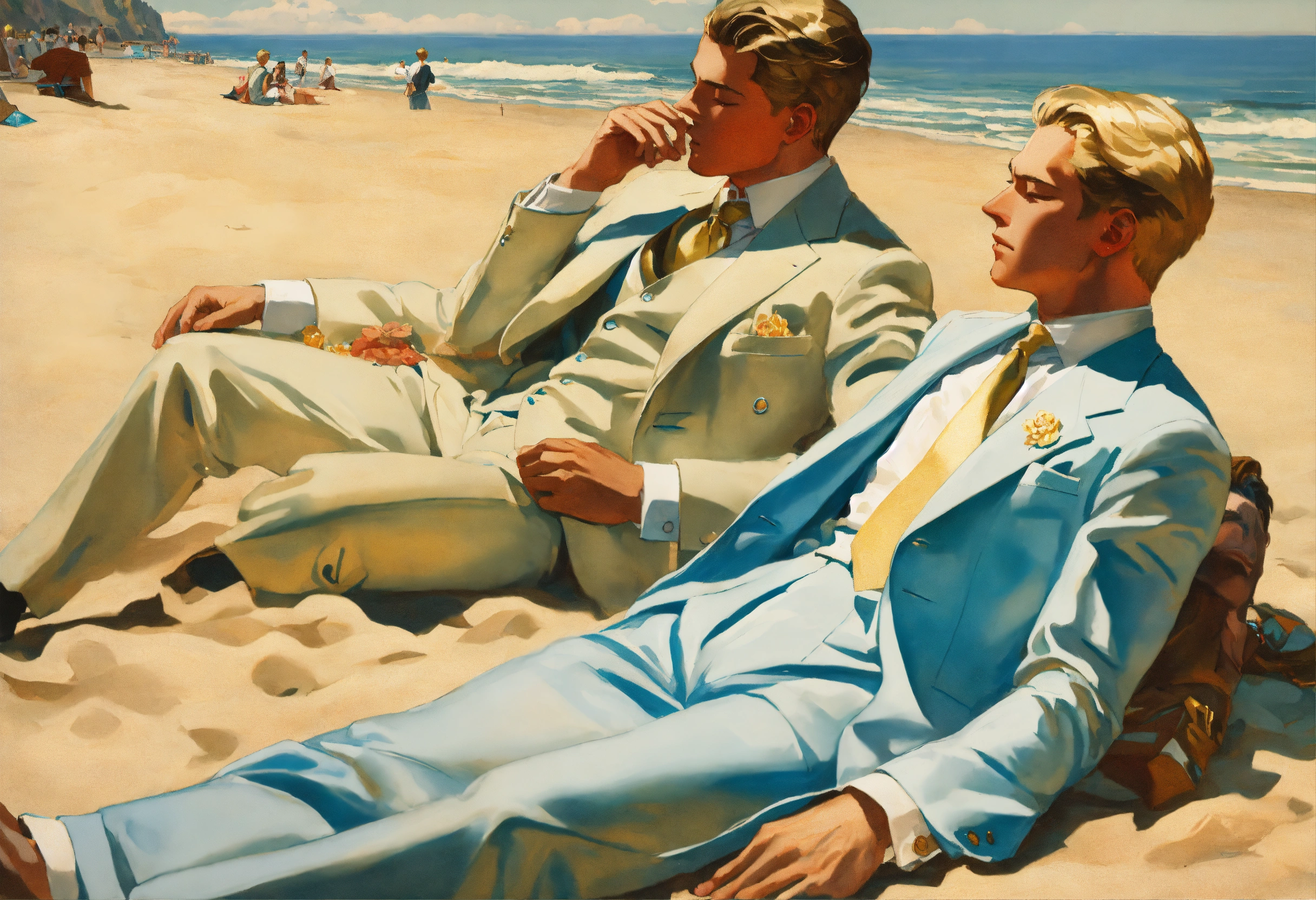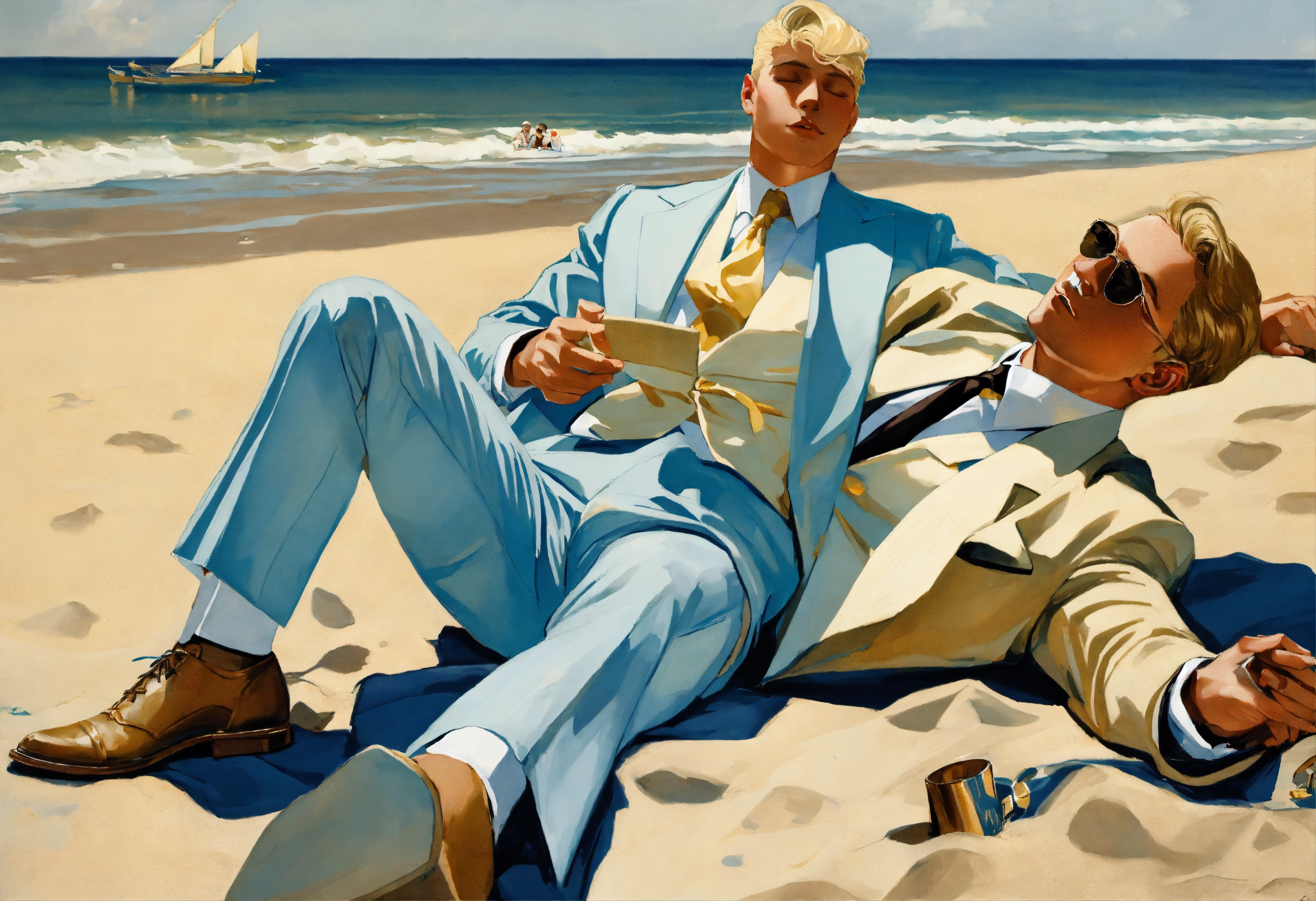 Two blonde gentlemen in pale blue and cream suit, golden tie, taking a nap on the sand of a beach, leyendecker style