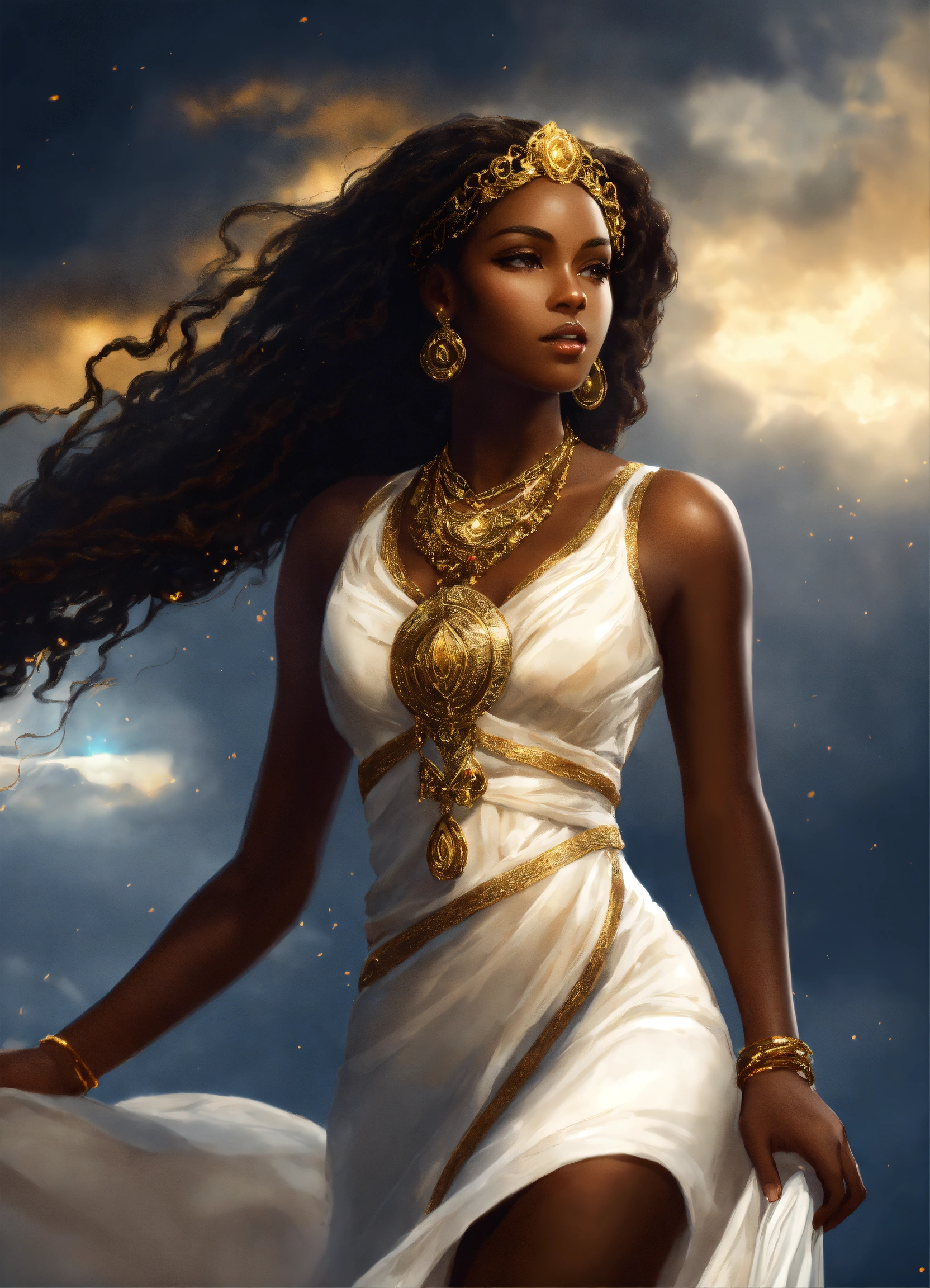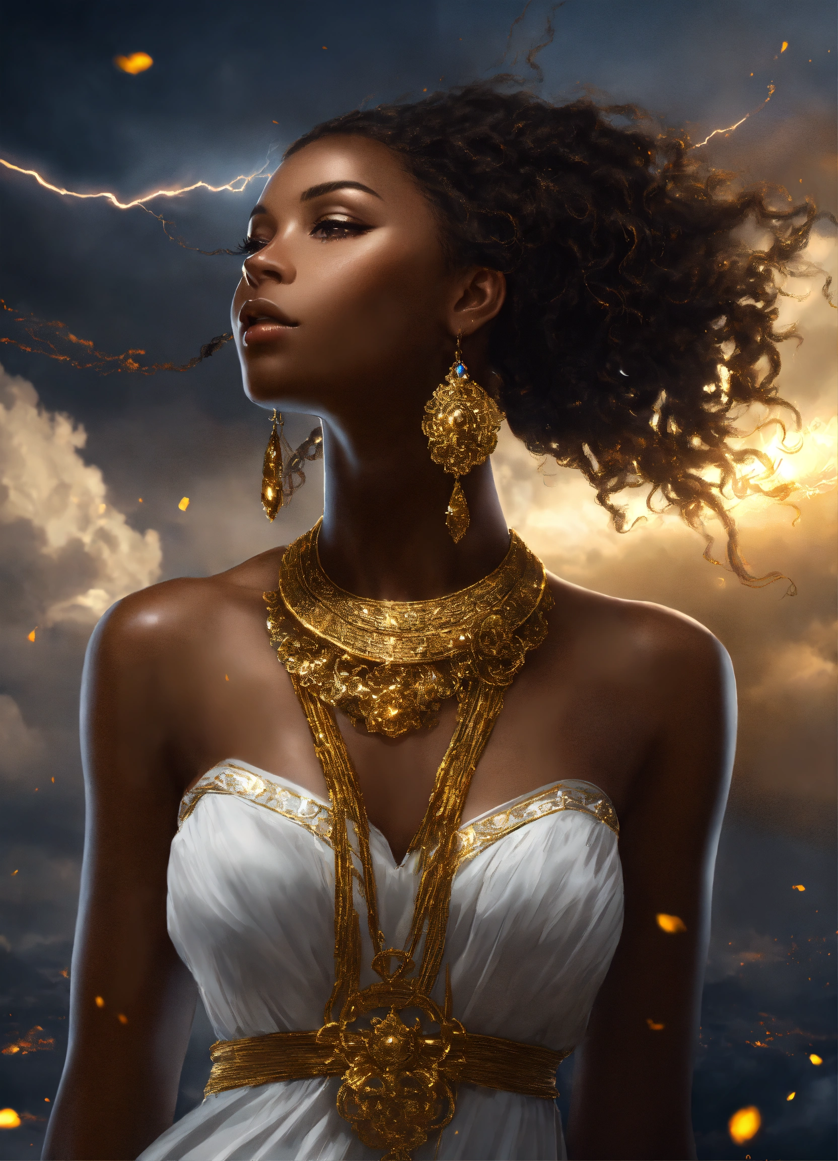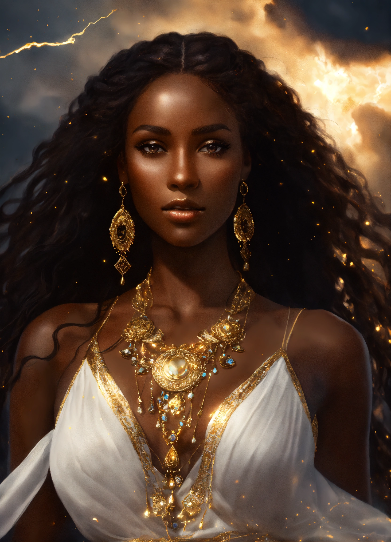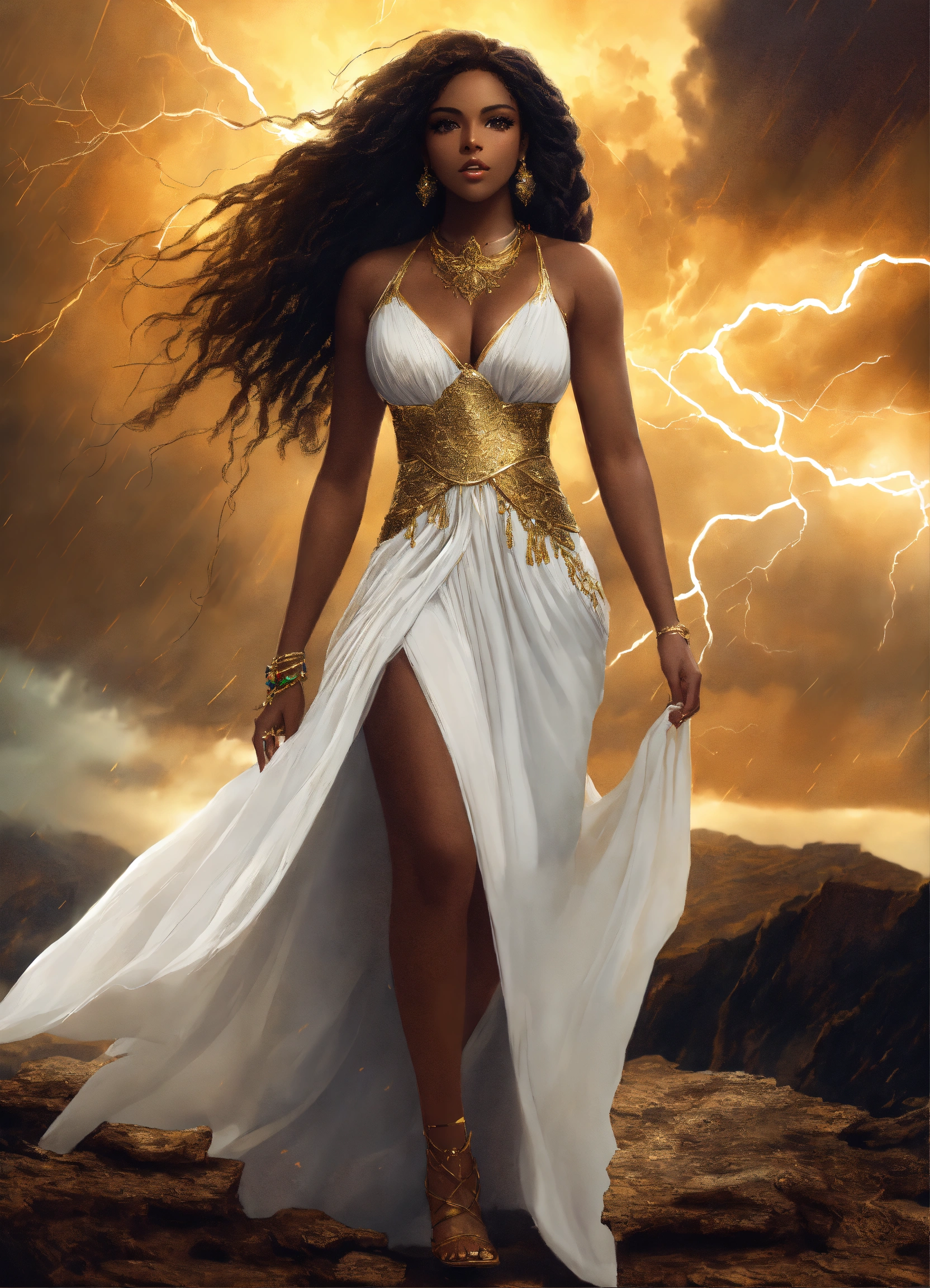 Full body gorgeous dark skin beautiful black goddess woman beautiful gorgeous goddess with gorgeous dark brown skin. beautiful perfect face, shapely hour-glass figure long flowing braided hair, fully clothed in a flowing white dress and gold accessories, she's floating in the sky with gold lightning and dark clouds behind him, high detail, realistic photo, high detail, digital painting, cinematic, stunning, hyper-realistic, sharp focus, high resolution 8k, insanely detailed